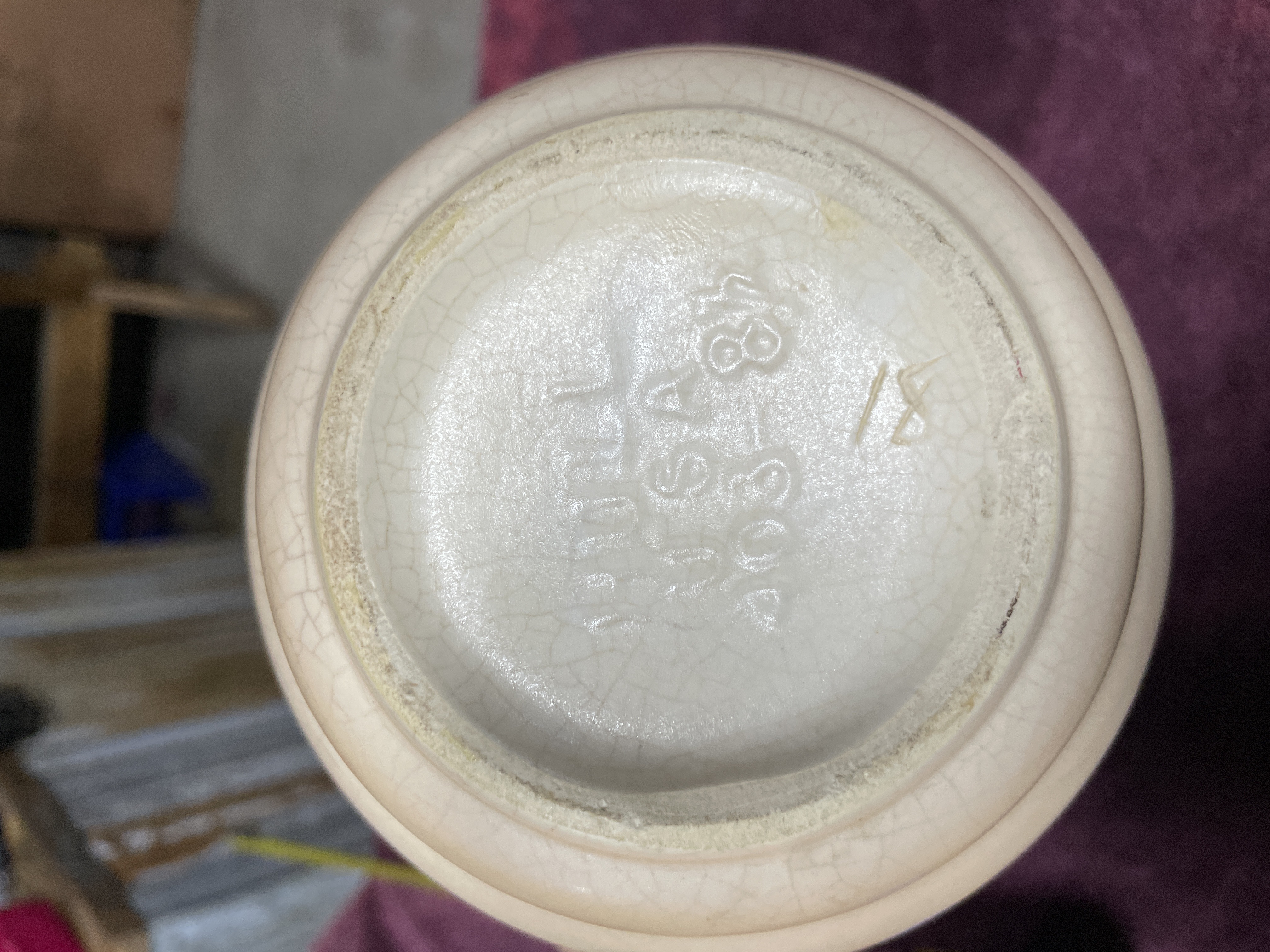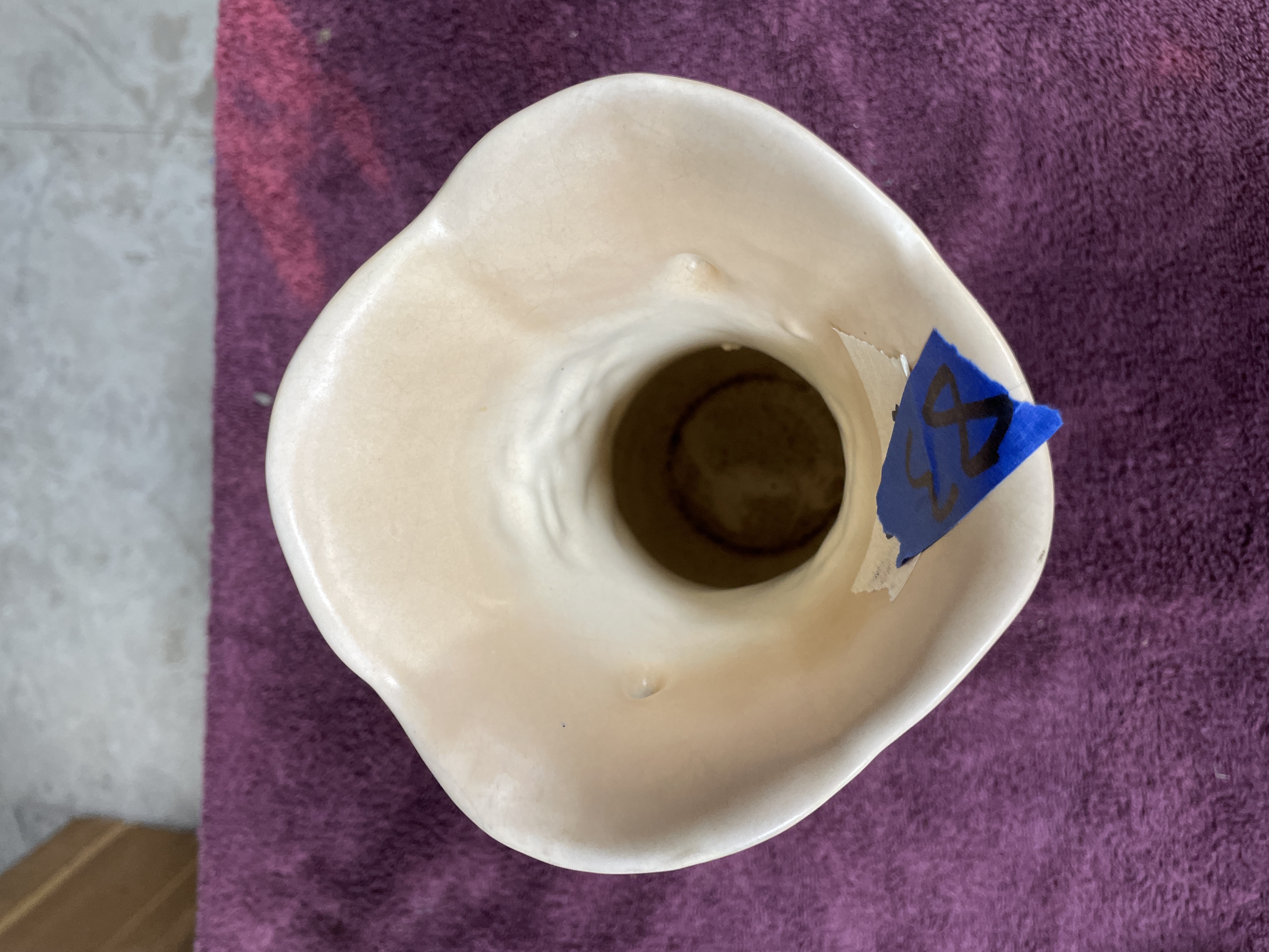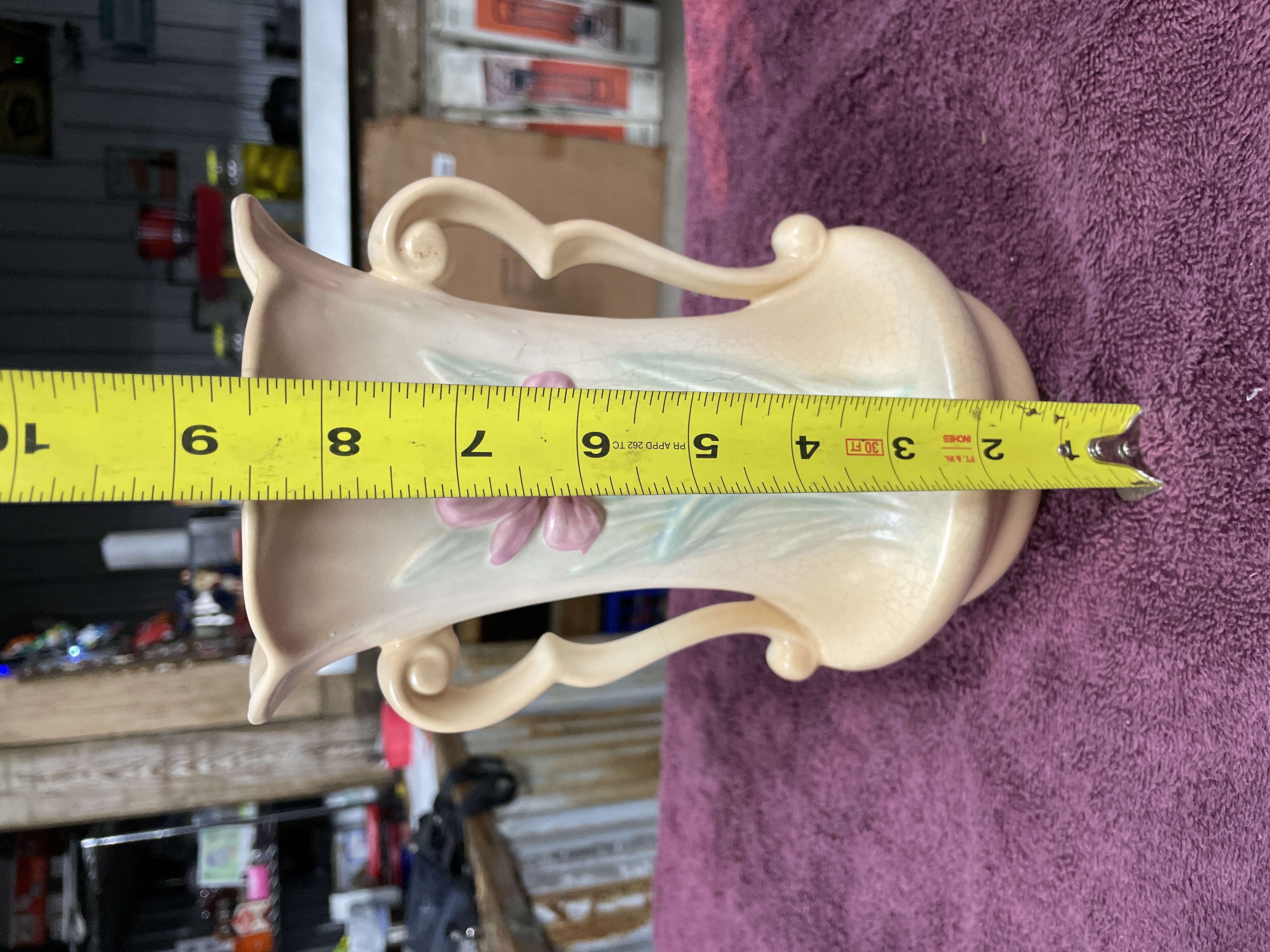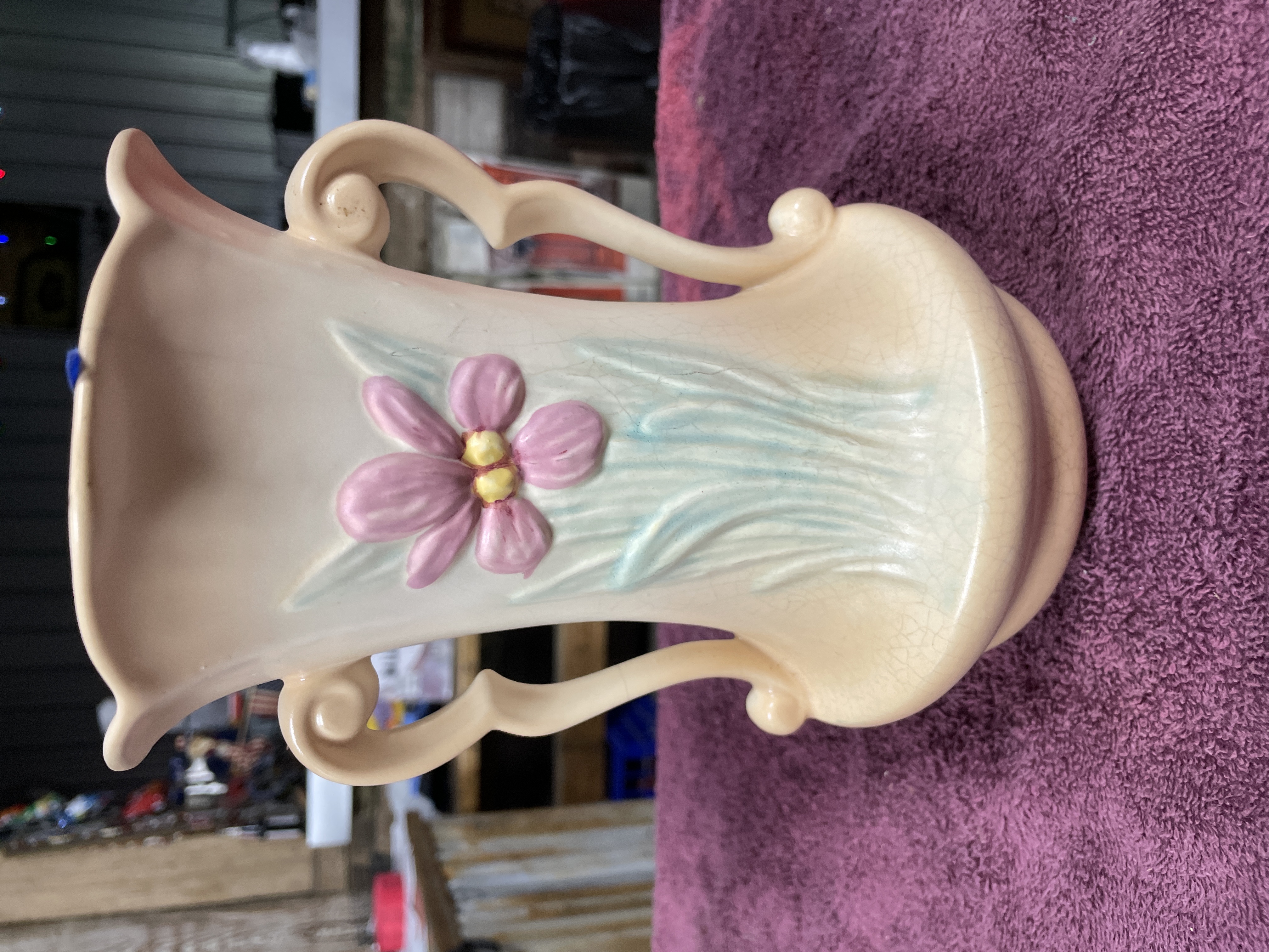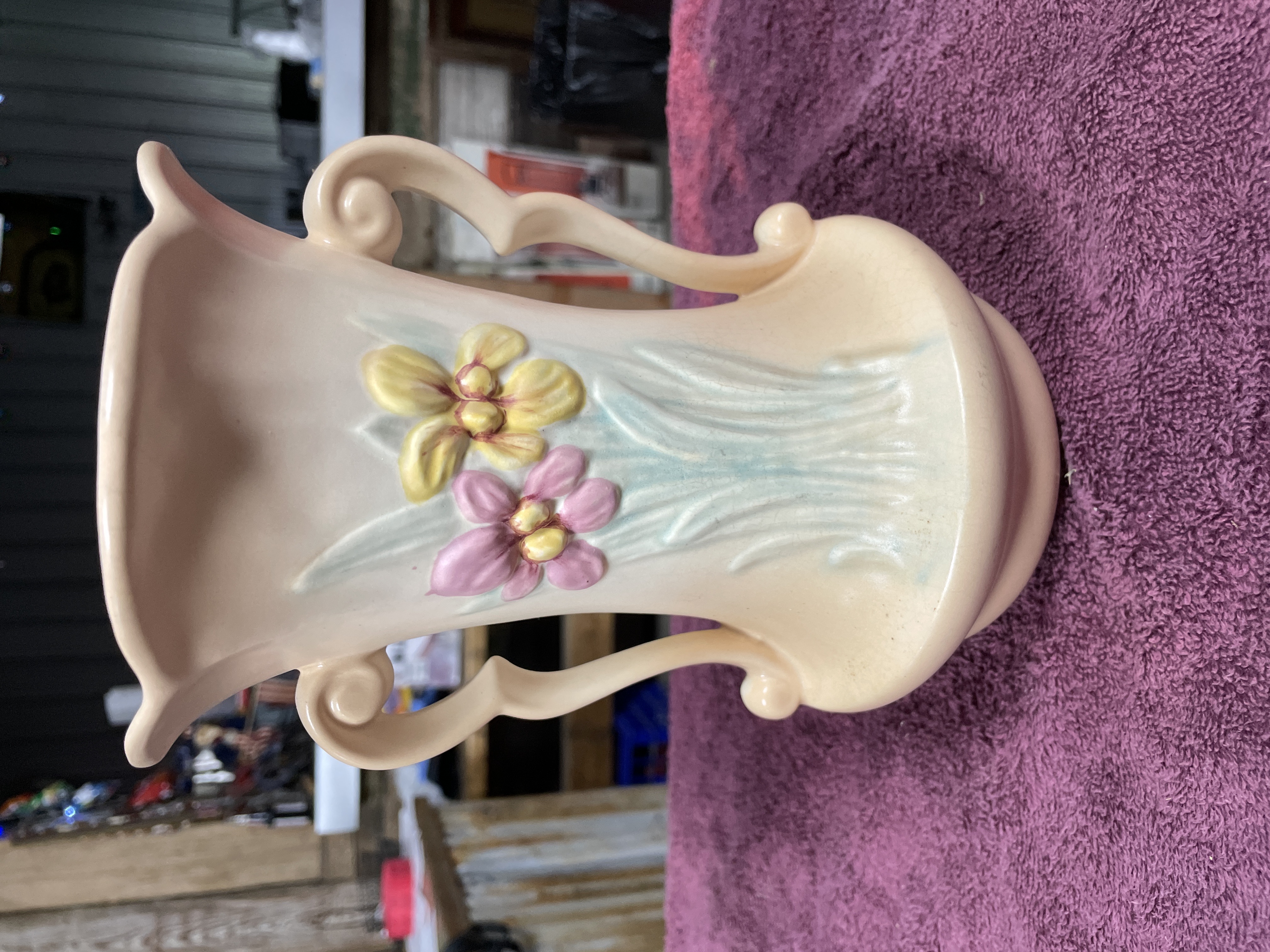 A single ceramic vase manufactured by Hull Pottery. The ovoid body features a pale peach-pink high-gloss glaze and rises to a flared, scalloped rim. The vase is flanked by two scrolled applied handles. The center of the body features a molded relief decoration of stylized florals and grasses, highlighted with applied glazes in shades of pink, yellow, and blue-green, consistent with the Hull Art Pottery aesthetic. The base is impressed with the manufacturer’s markings: HULL U S A 303-8½.