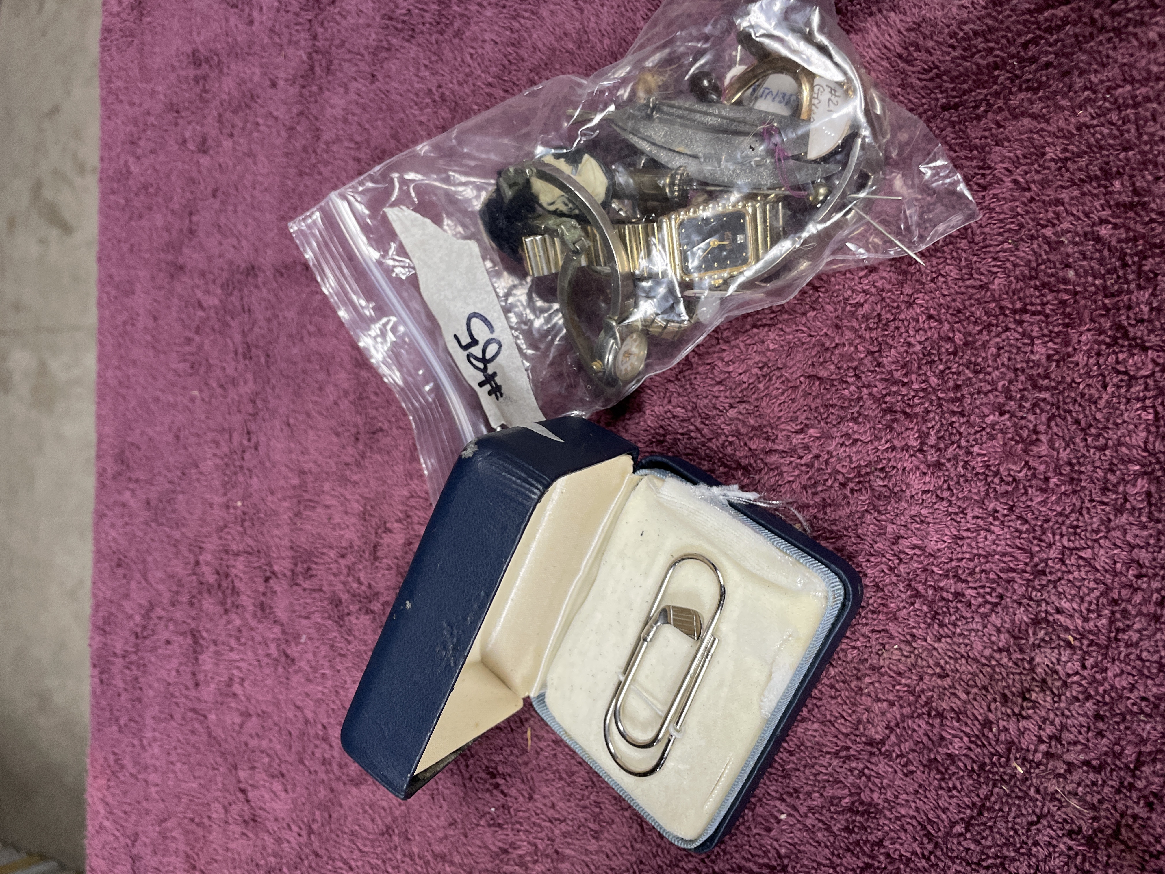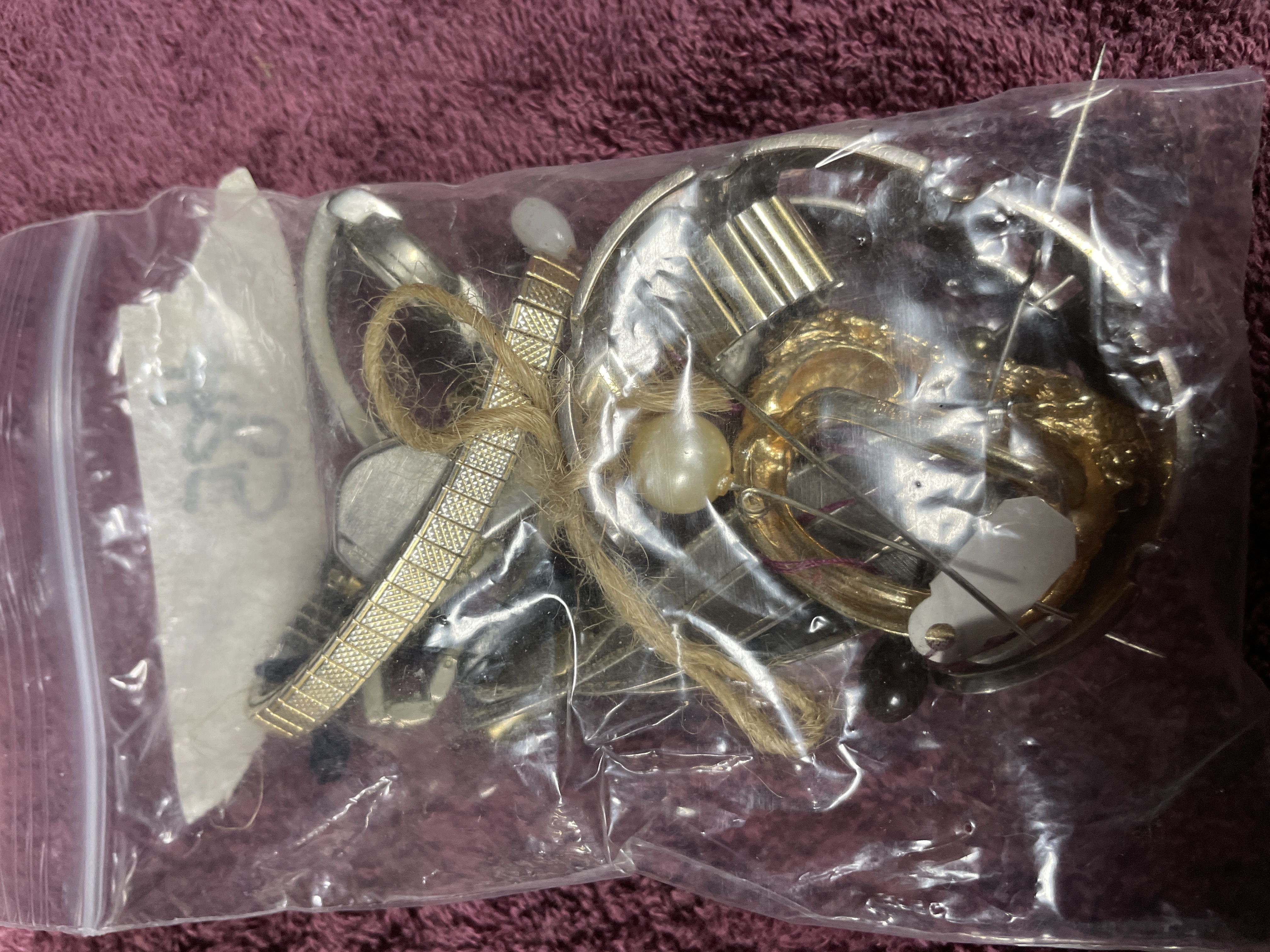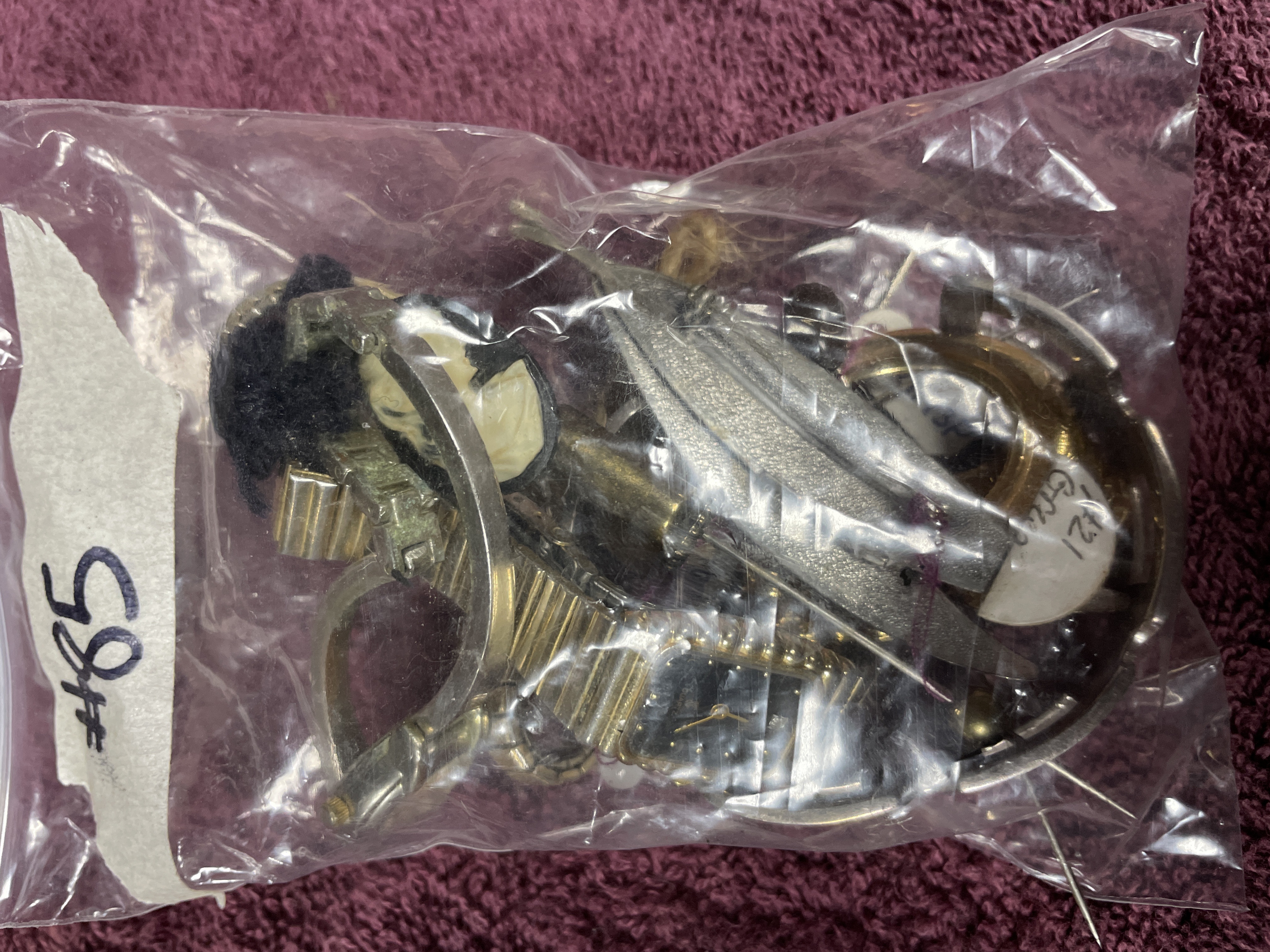 The second unit is a plastic zip-top bag, marked with the inventory number #85, containing a mixed group of assorted costume jewelry components and scrap parts. The contents include several gold-toned and silver-toned metal watch straps, one pair of which is tied together with twine, at least one watch head with a black dial, assorted stick pins, safety pins, various gold and silver-toned findings, a large faux pearl setting, and a small figural pin head. The materials in the bag are primarily base metal and plastic.
