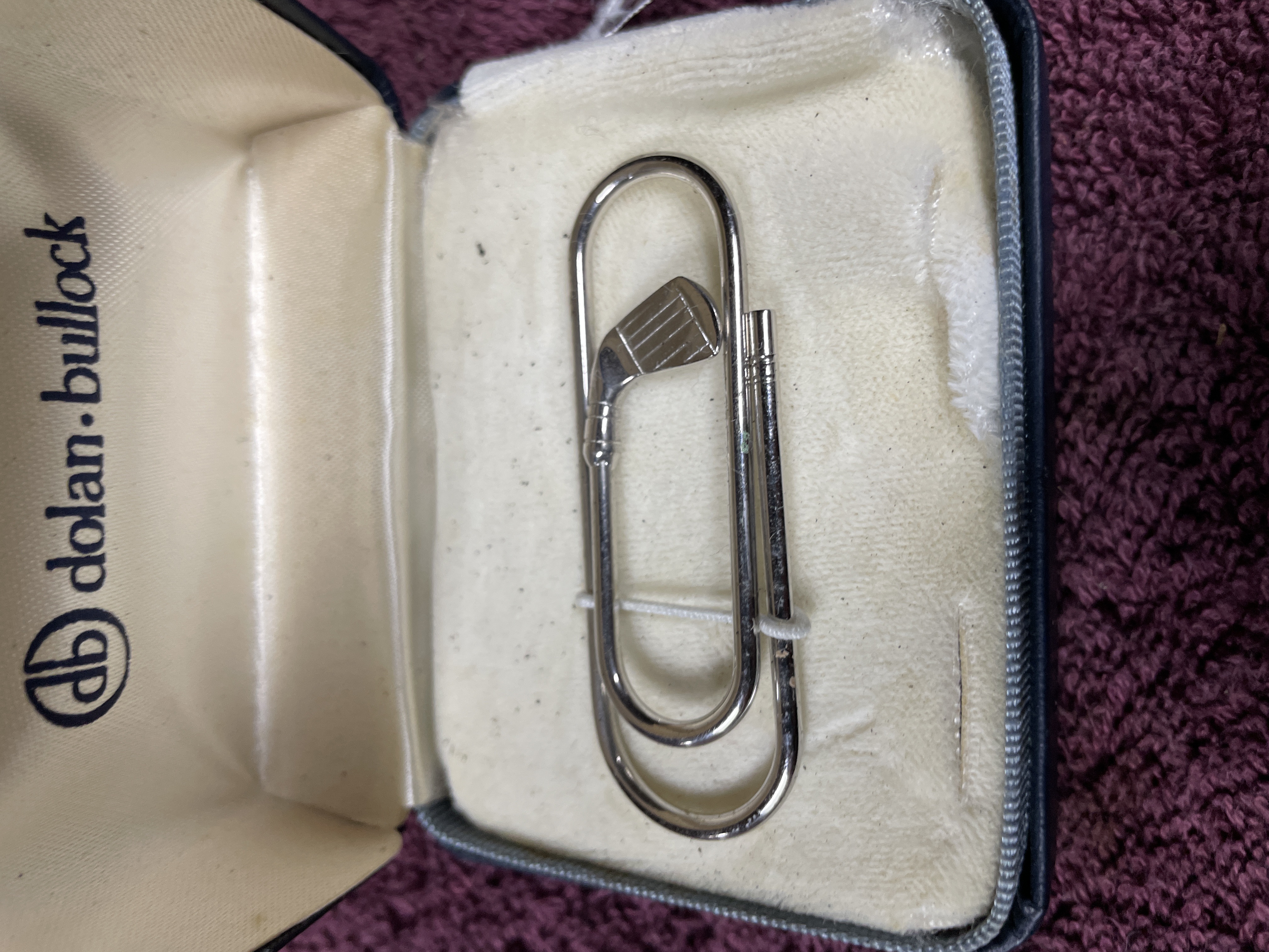 This lot consists of two distinct units. The first is a cased money clip manufactured by dolan.bullock. The clip is constructed of silver-toned base metal, designed in the form of an oversized paper clip detailed with a golf club head. It is presented in its original navy blue hinged box, which is lined with velvet and satin. The interior lid of the box is marked dB dolan.bullock.