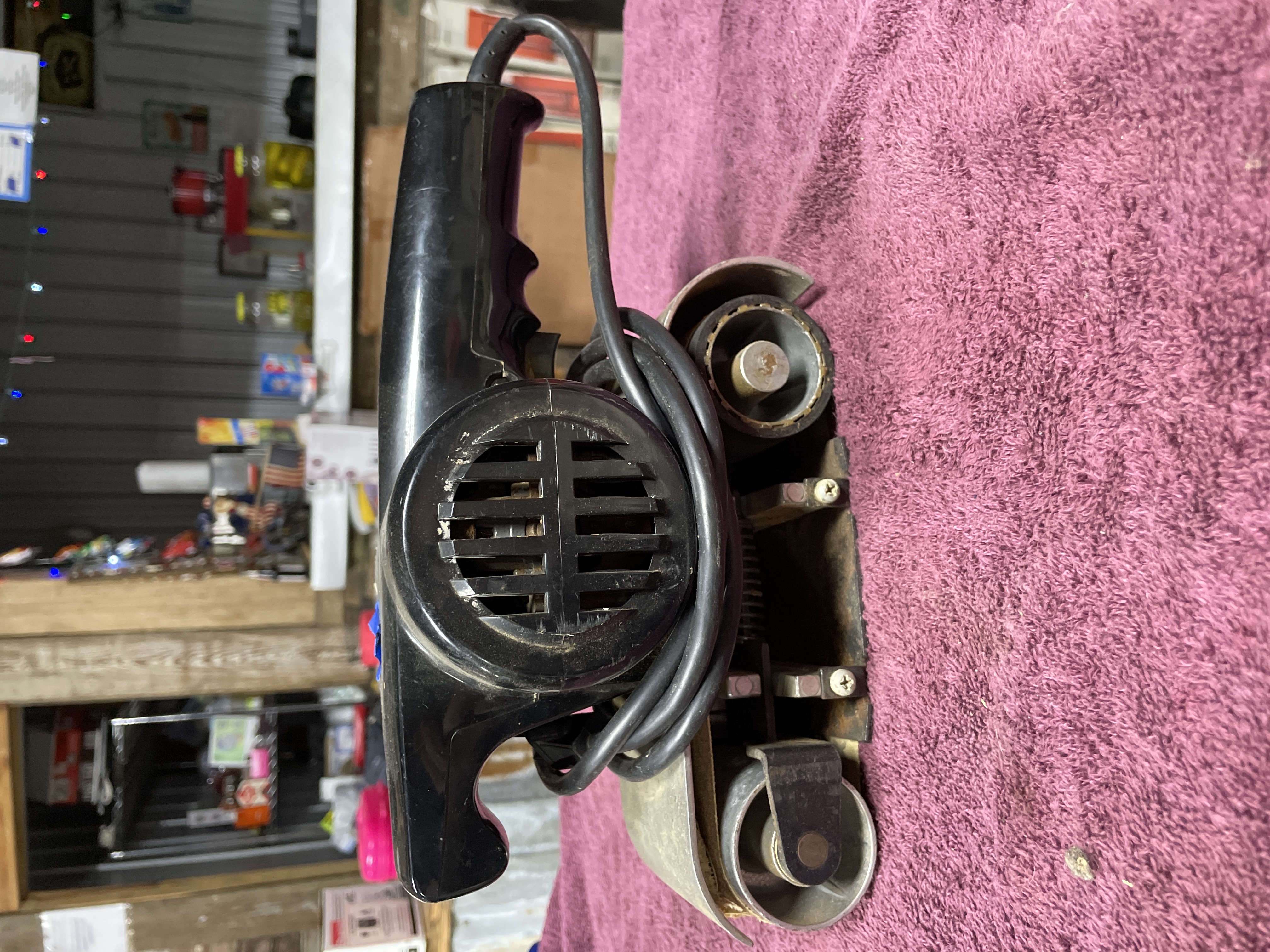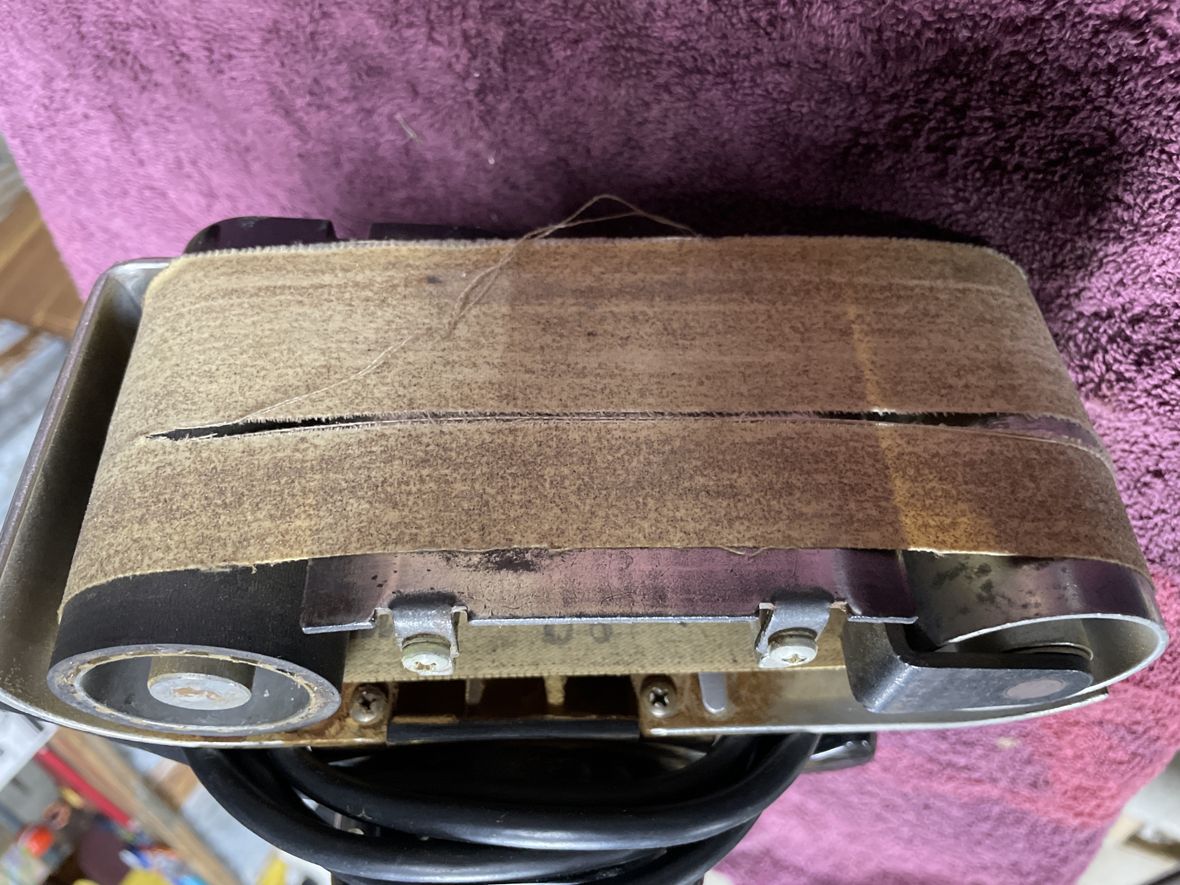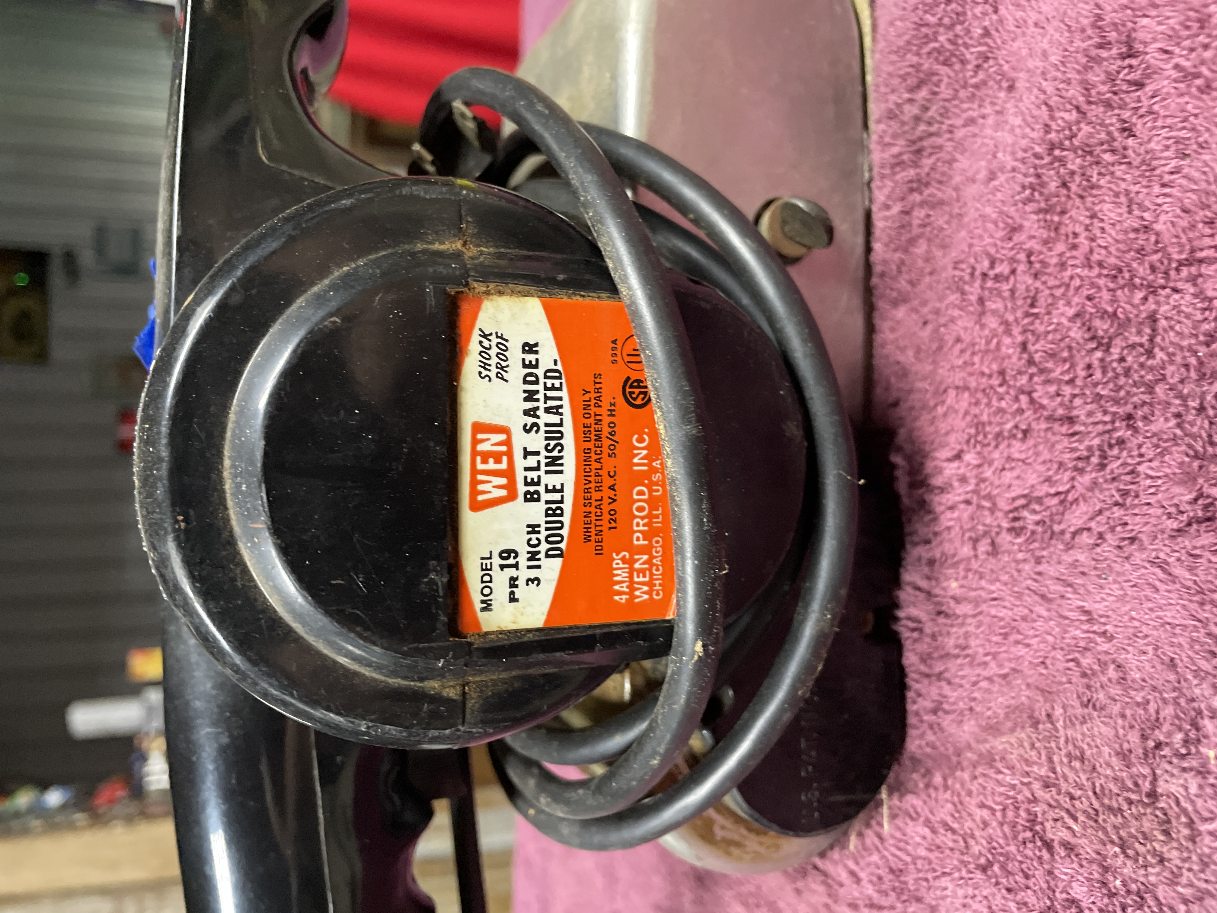 A single electric belt sander, identified by its label as a Wen Model PR 19. The tool features a black plastic motor housing and handle assembly paired with a metal sanding base. The label specifies it as a 3 Inch Belt Sander, Shock Proof, and Double Insulated. Operational specifications listed are 4 AMPS, 120 V.A.C. 50/60 HZ. The manufacturer is WEN PROD. INC. CHICAGO, ILL. U.S.A. The plastic housing is also visibly marked “DOUBLE INSULATED.” The sander includes an attached electrical cord.