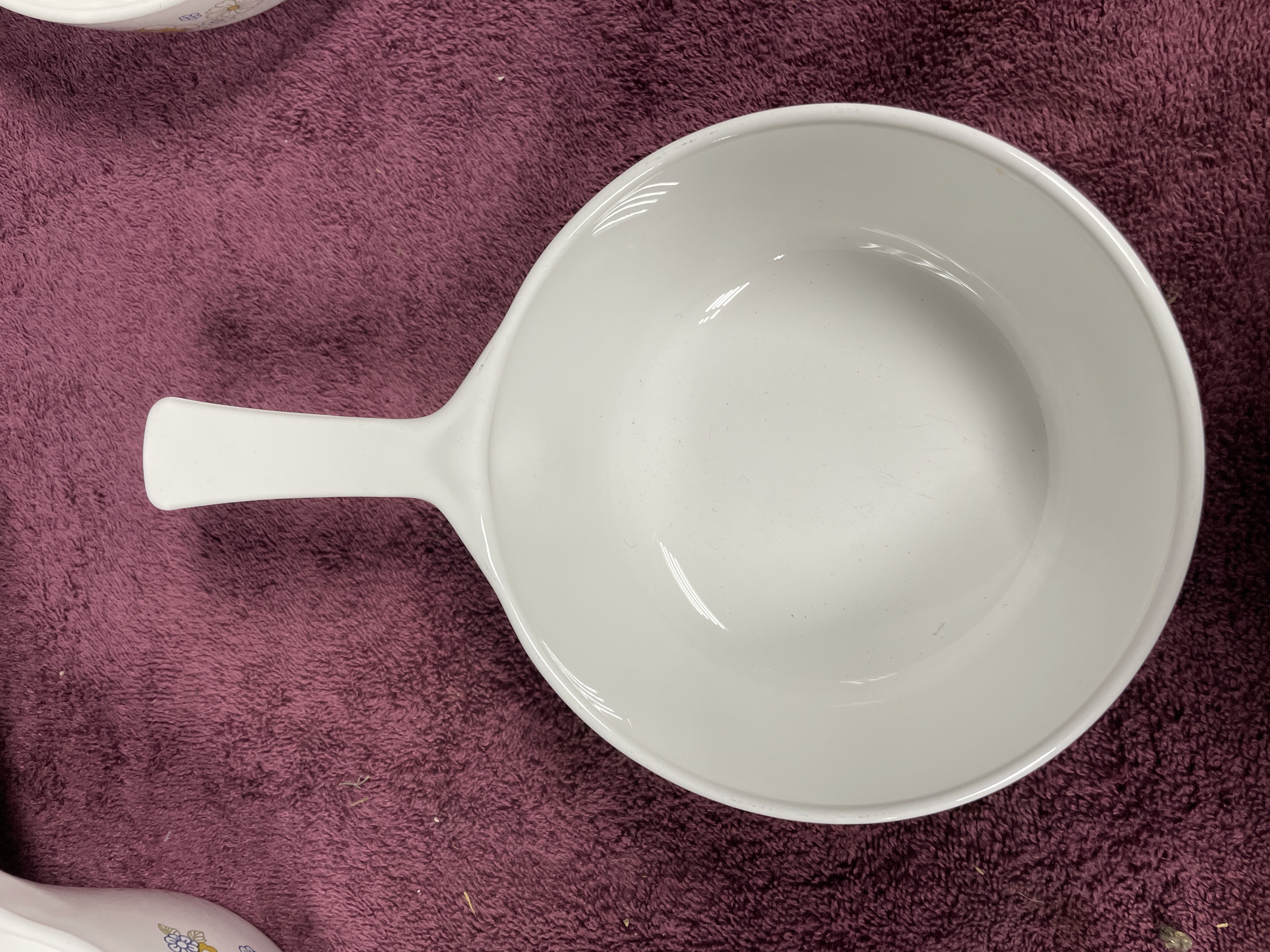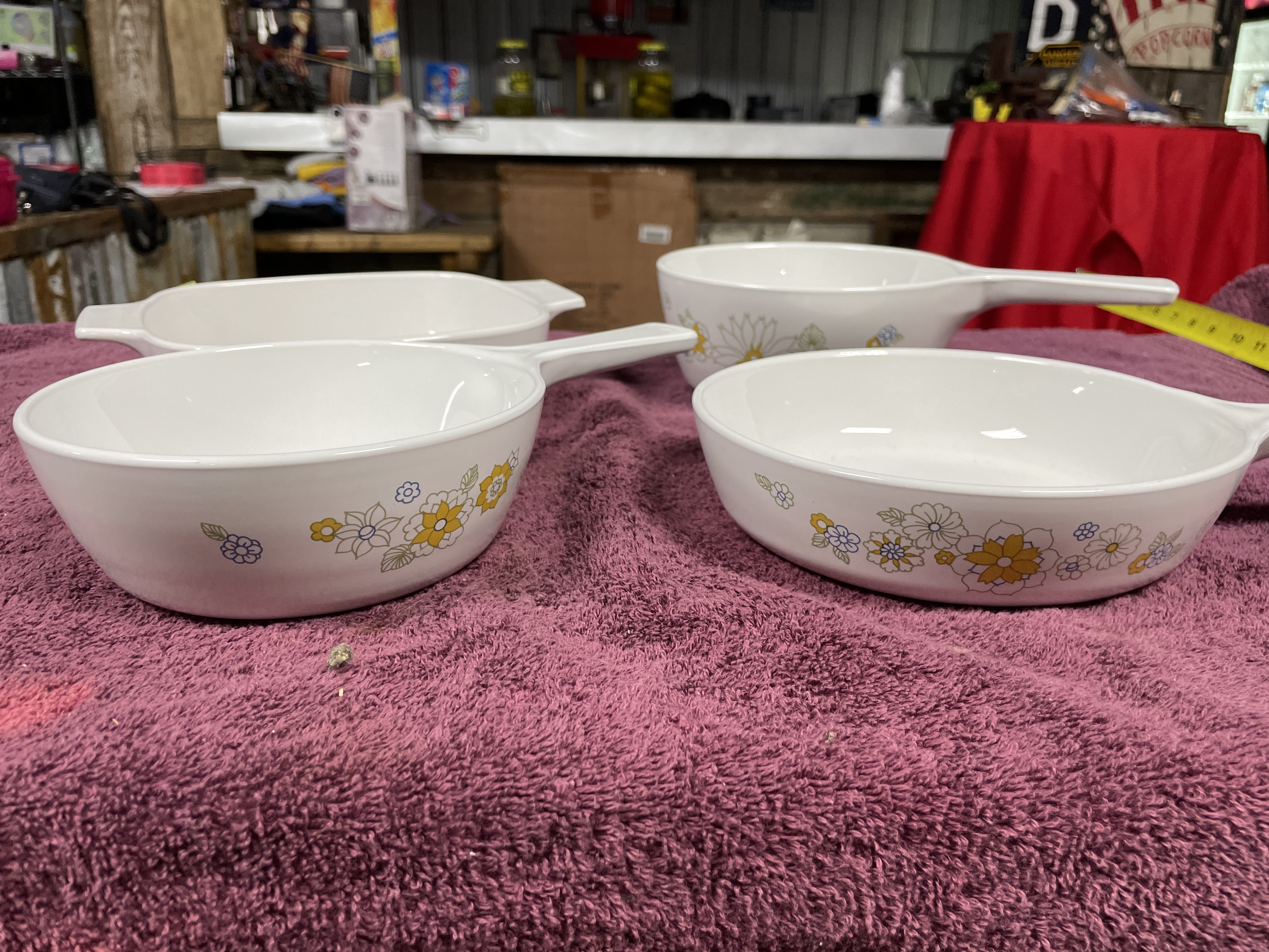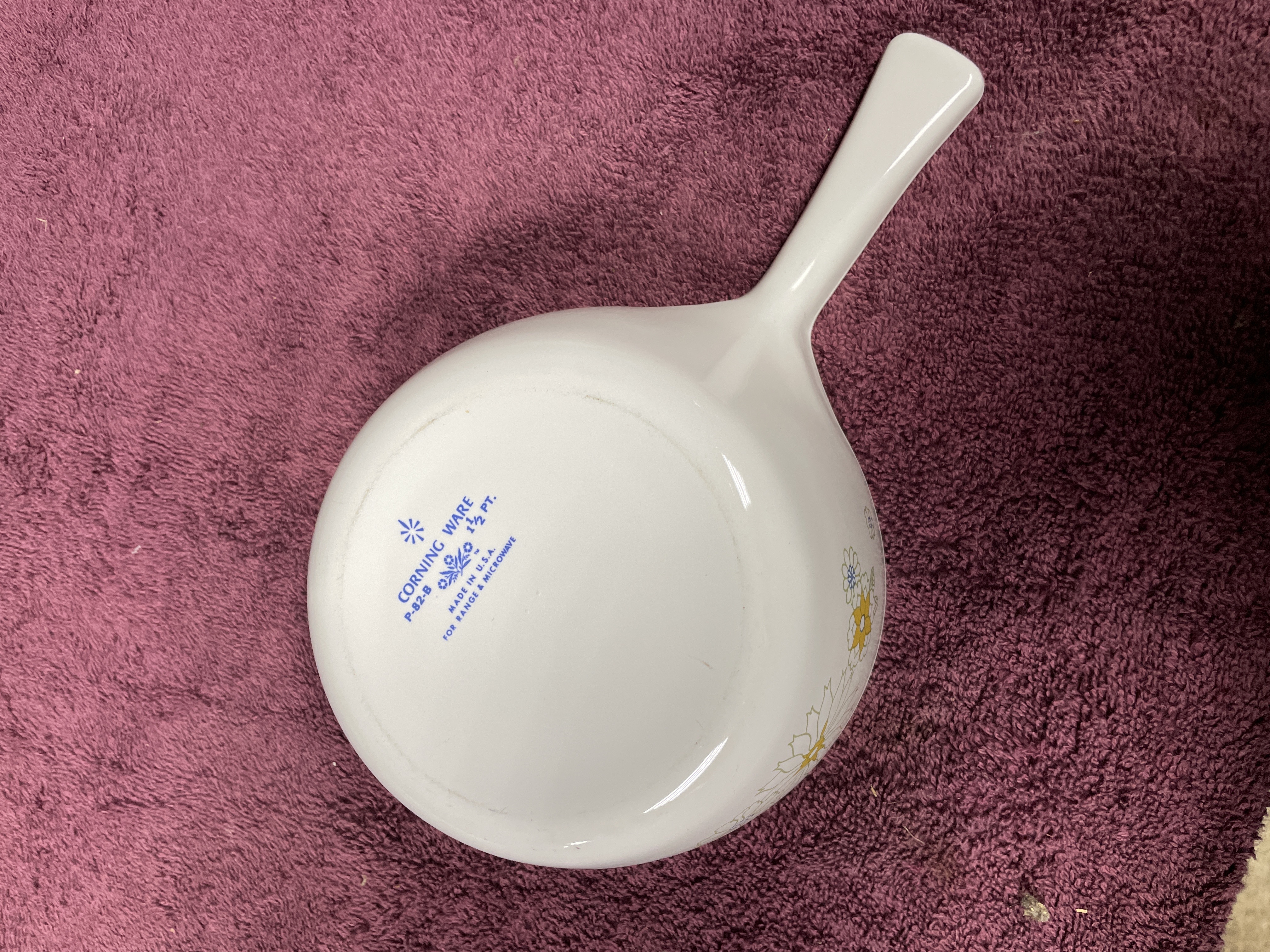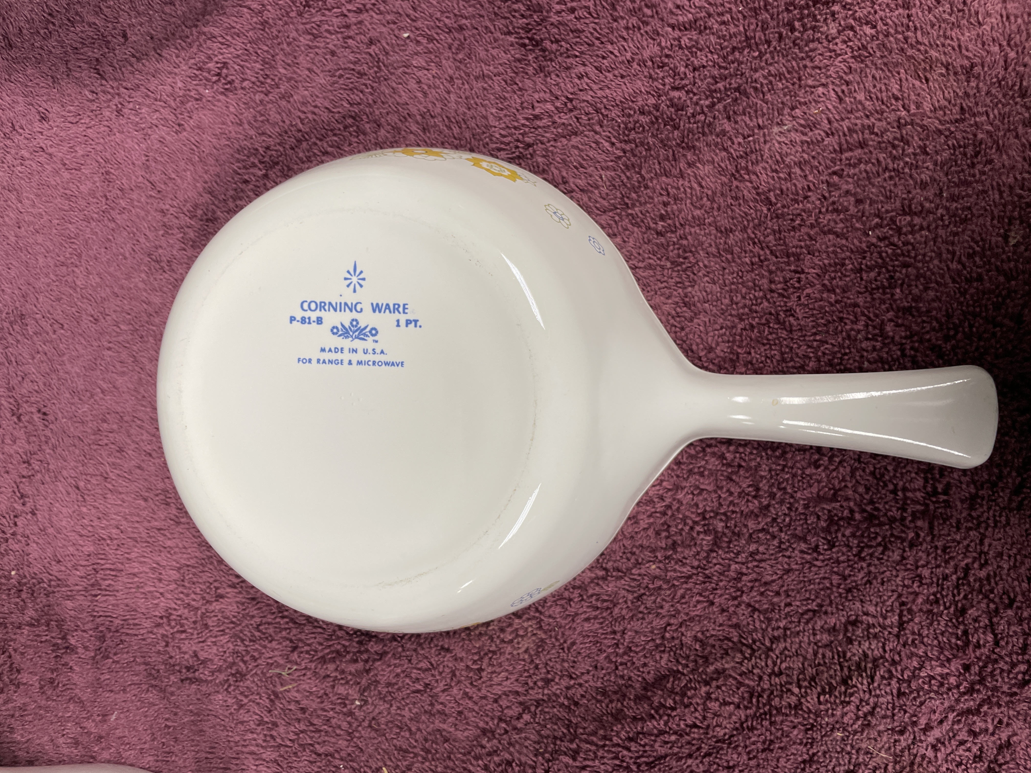 A collection of four vintage Corning Ware Pyroceram cooking vessels. The lot comprises three saucepans/skillets featuring the Floral Bouquet pattern (stylized yellow, blue, and green flowers) and one rectangular casserole dish featuring a different floral pattern (orange, red, blue, and green flowers). The vessels are constructed of white glass-ceramic suitable for range and microwave use. The three handled saucepans are marked on the base “CORNING WARE, ” “MADE IN U.S.A., ” and “FOR RANGE & MICROWAVE, ” with specific model numbers and capacities: P-81-B (1 Pint), P-82-B (1 1/2 Pint), and P-83-B (6 1/2 Inch skillet). The rectangular casserole dish is marked A-1-B, 1 QUART, CORNING, NY, USA, and is rated for range, oven, and microwave use.