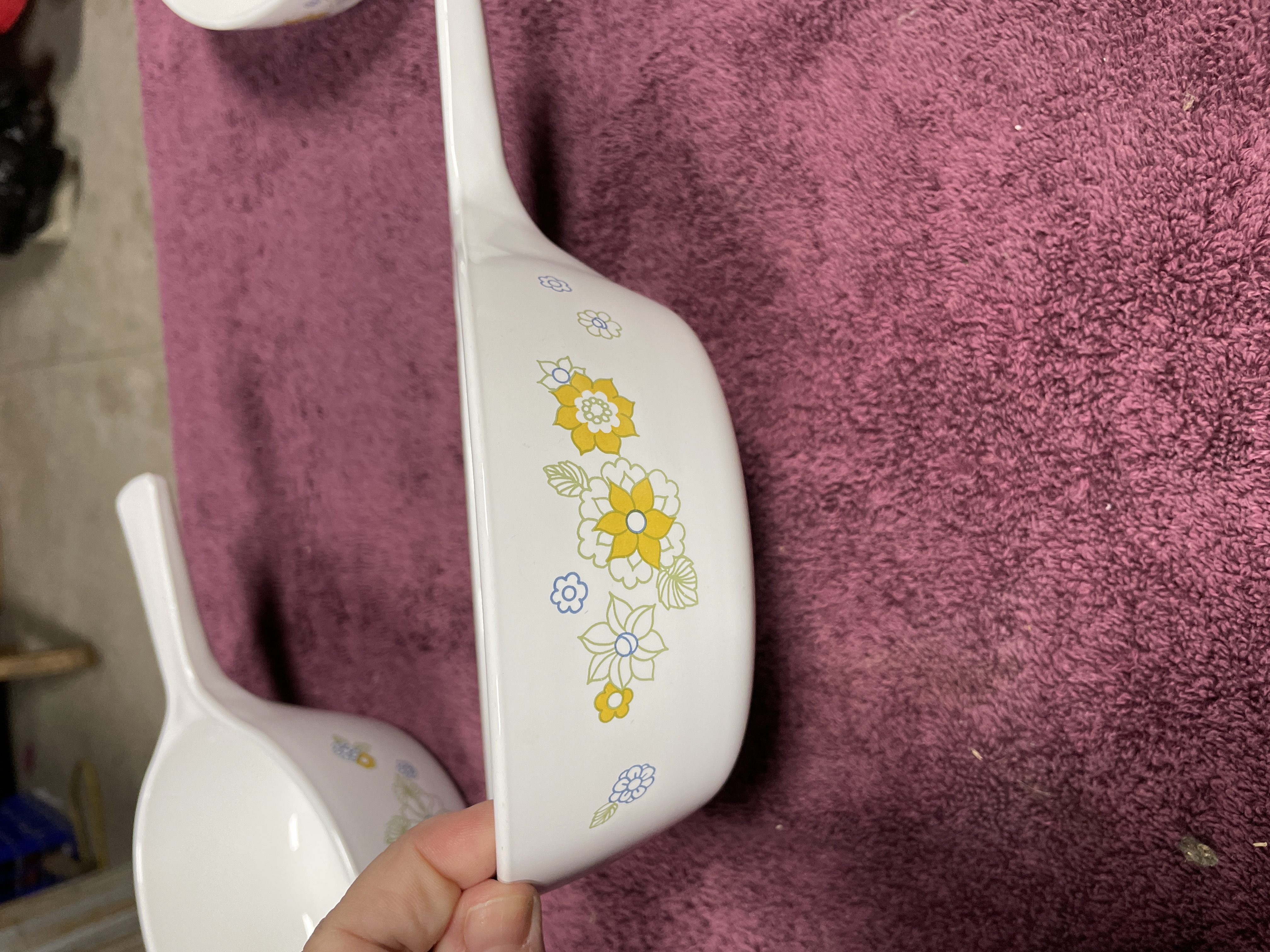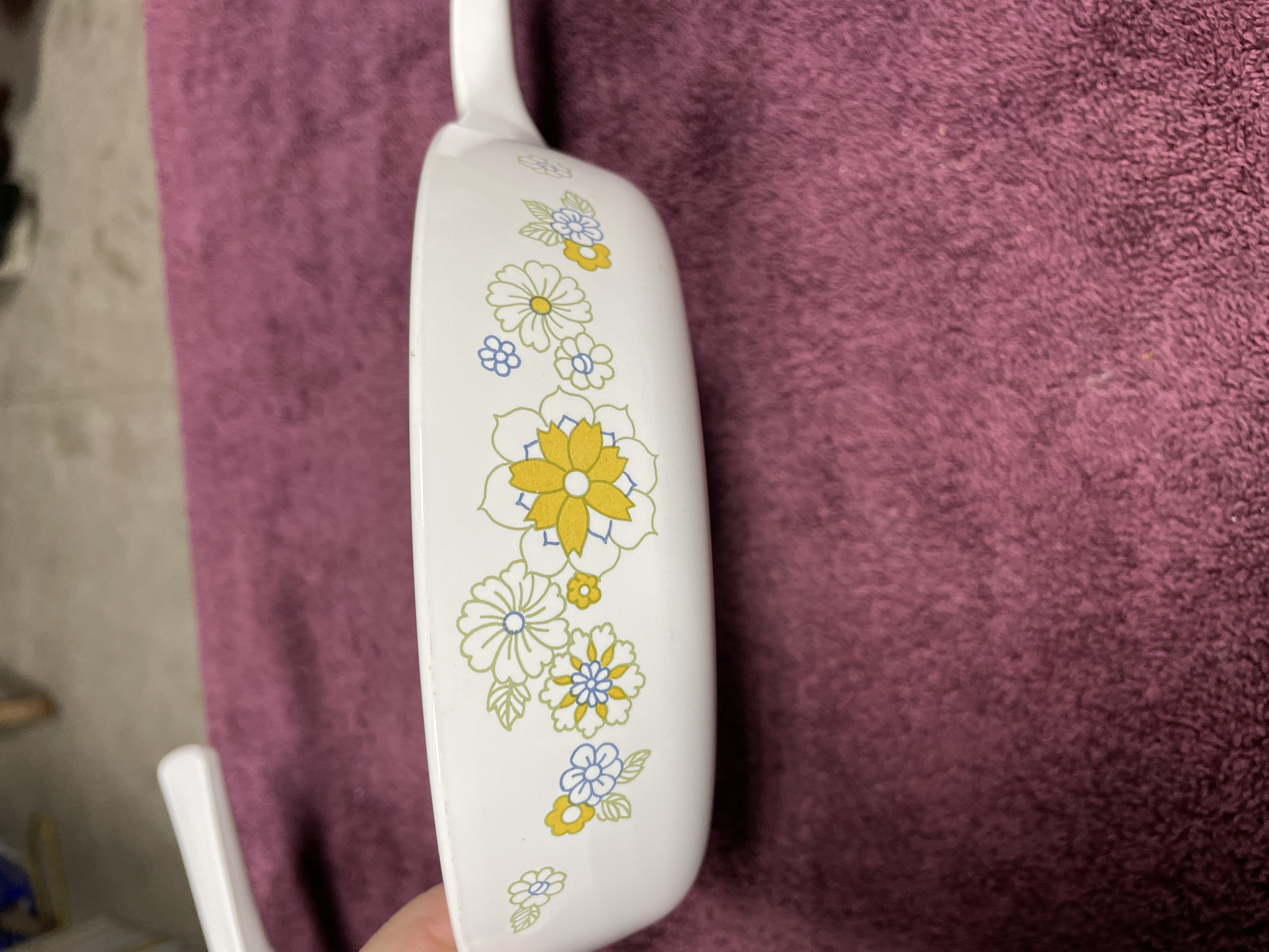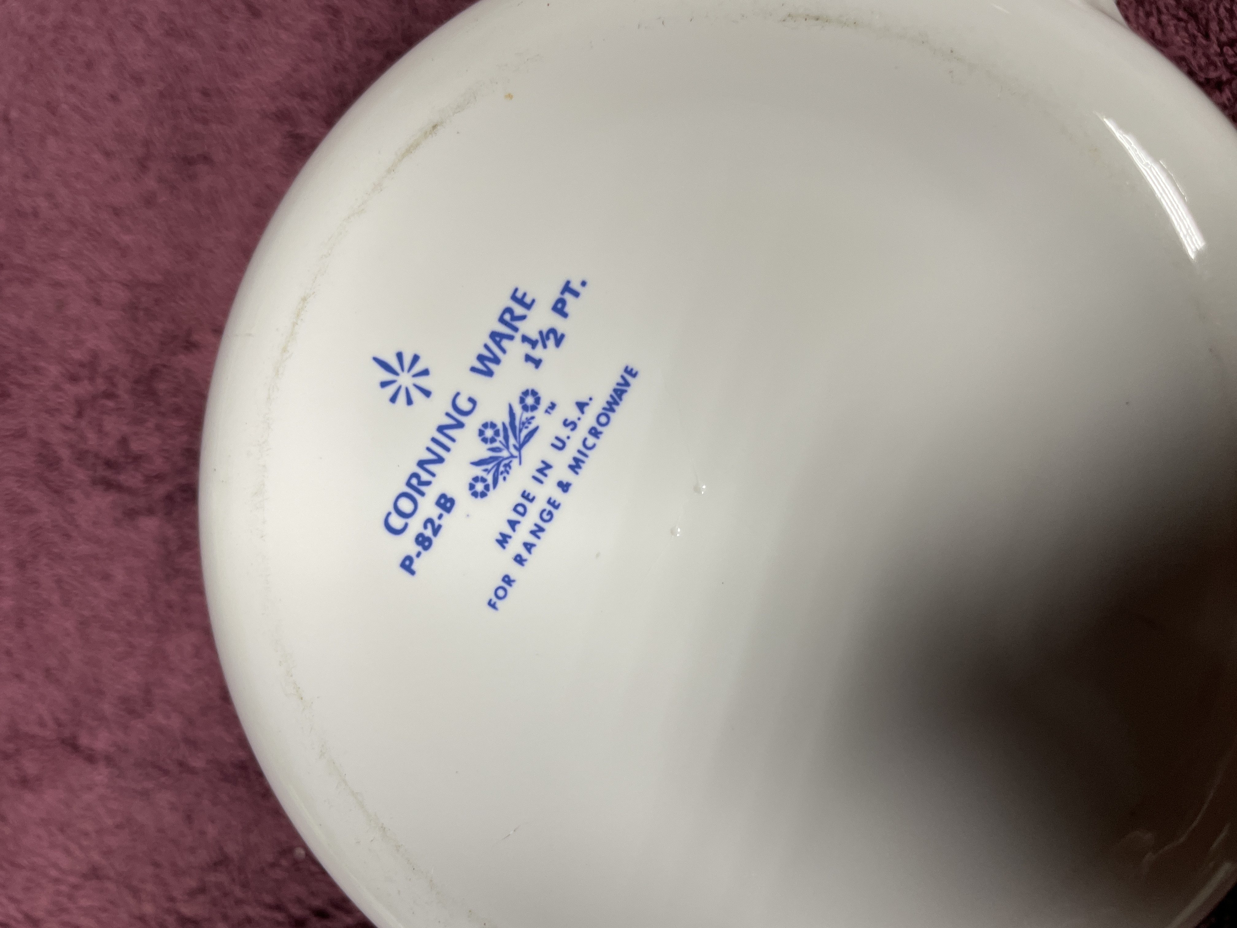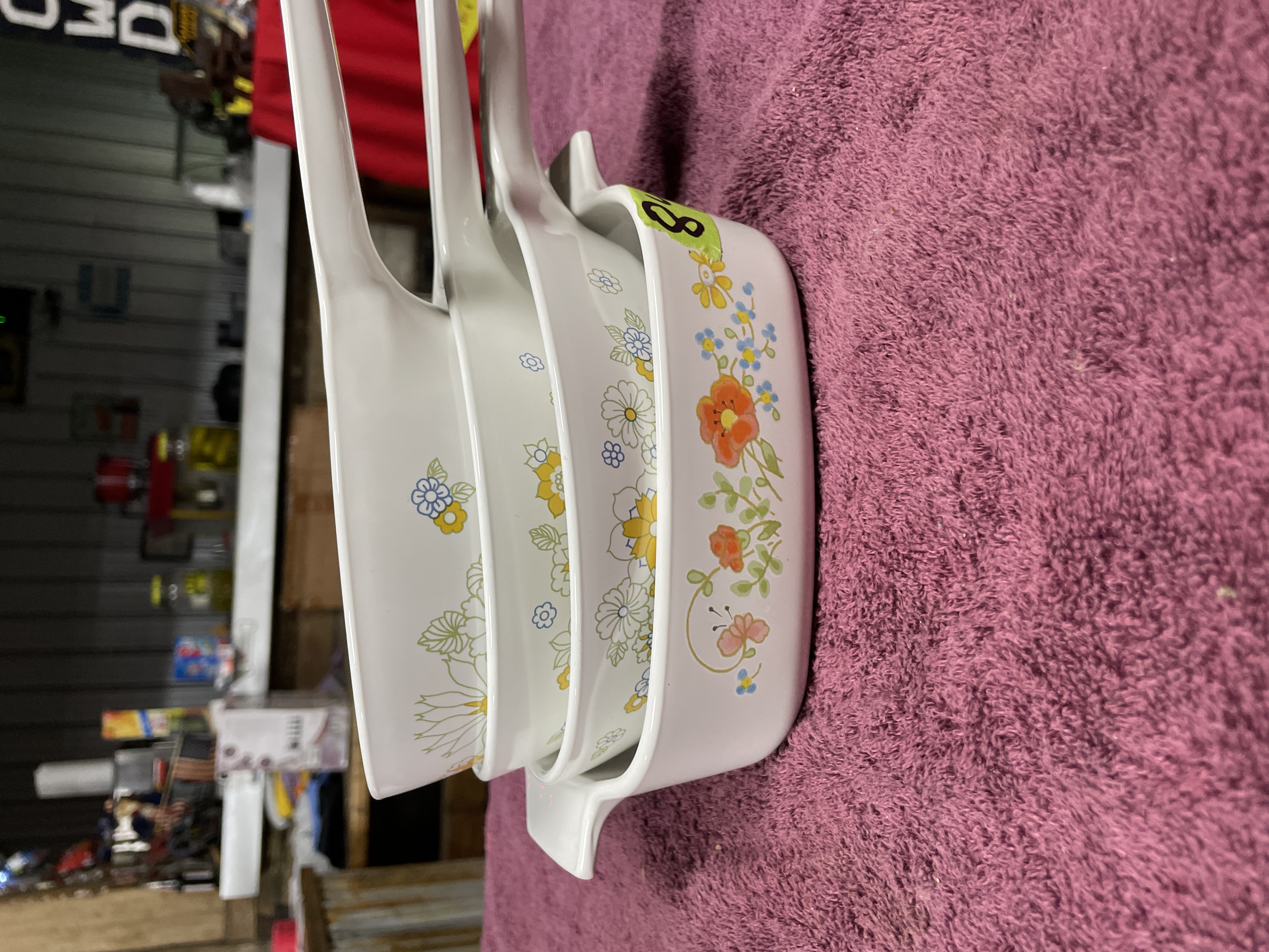 A collection of four vintage Corning Ware Pyroceram cooking vessels. The lot comprises three saucepans/skillets featuring the Floral Bouquet pattern (stylized yellow, blue, and green flowers) and one rectangular casserole dish featuring a different floral pattern (orange, red, blue, and green flowers). The vessels are constructed of white glass-ceramic suitable for range and microwave use. The three handled saucepans are marked on the base “CORNING WARE, ” “MADE IN U.S.A., ” and “FOR RANGE & MICROWAVE, ” with specific model numbers and capacities: P-81-B (1 Pint), P-82-B (1 1/2 Pint), and P-83-B (6 1/2 Inch skillet). The rectangular casserole dish is marked A-1-B, 1 QUART, CORNING, NY, USA, and is rated for range, oven, and microwave use.