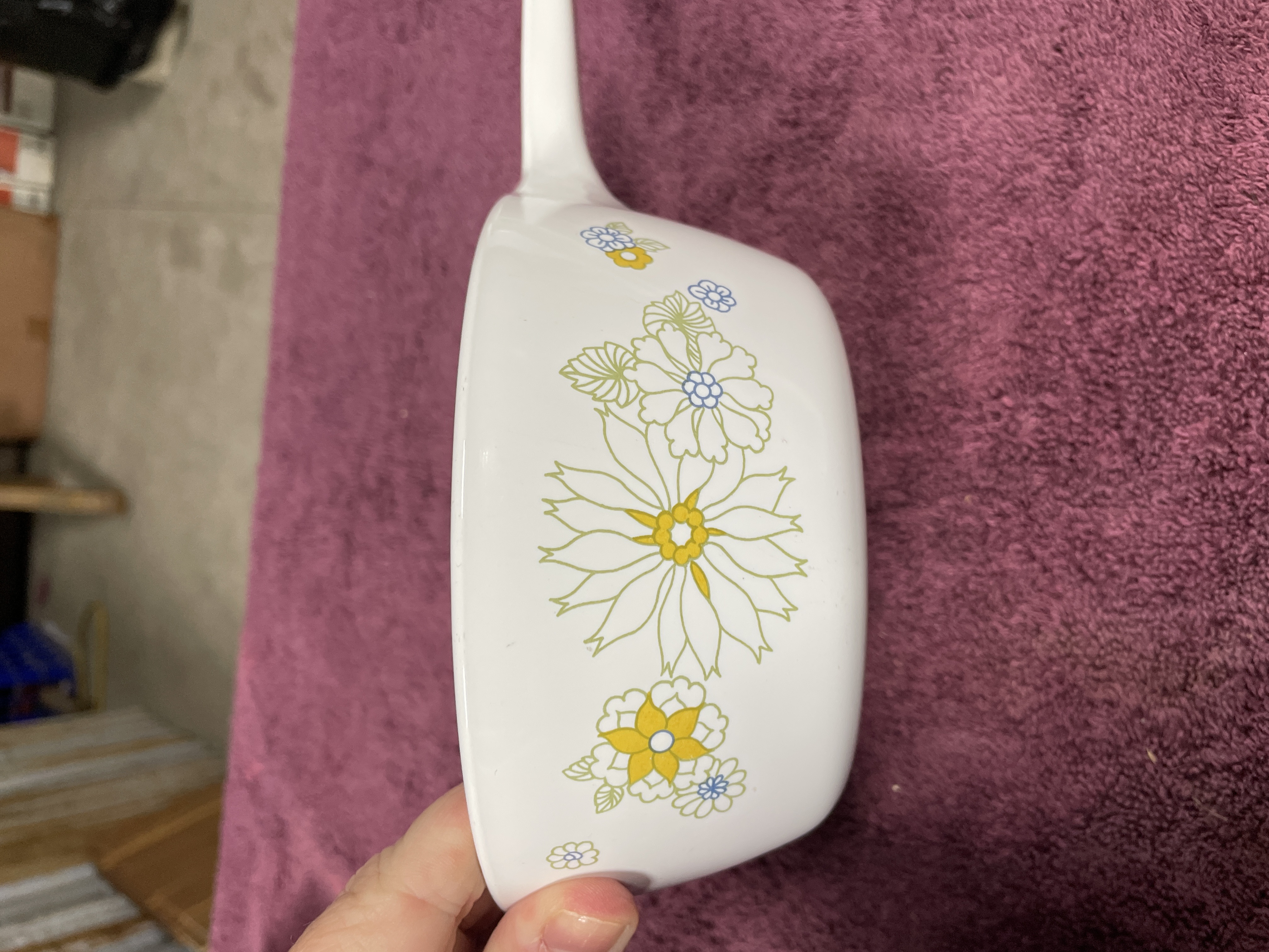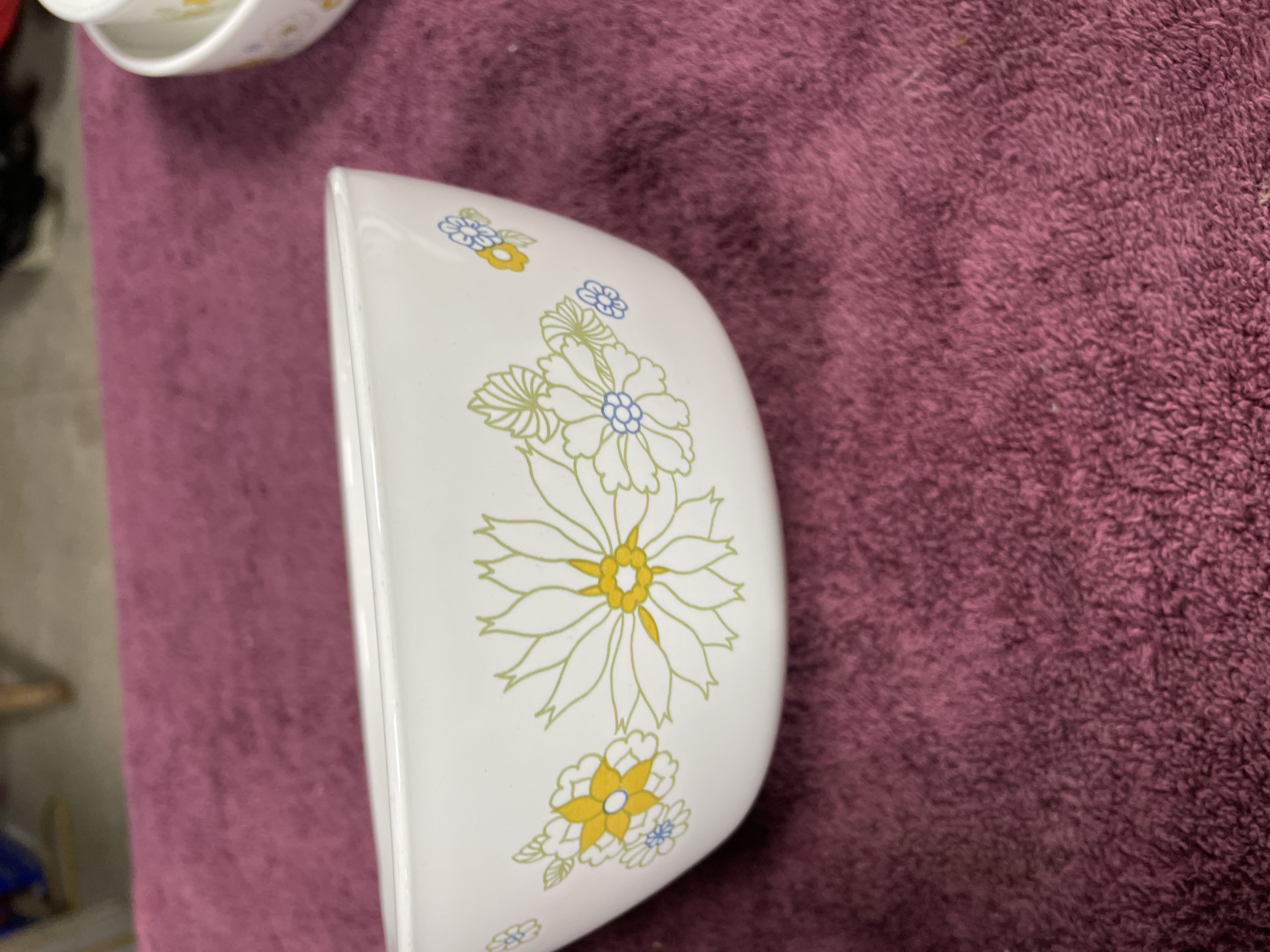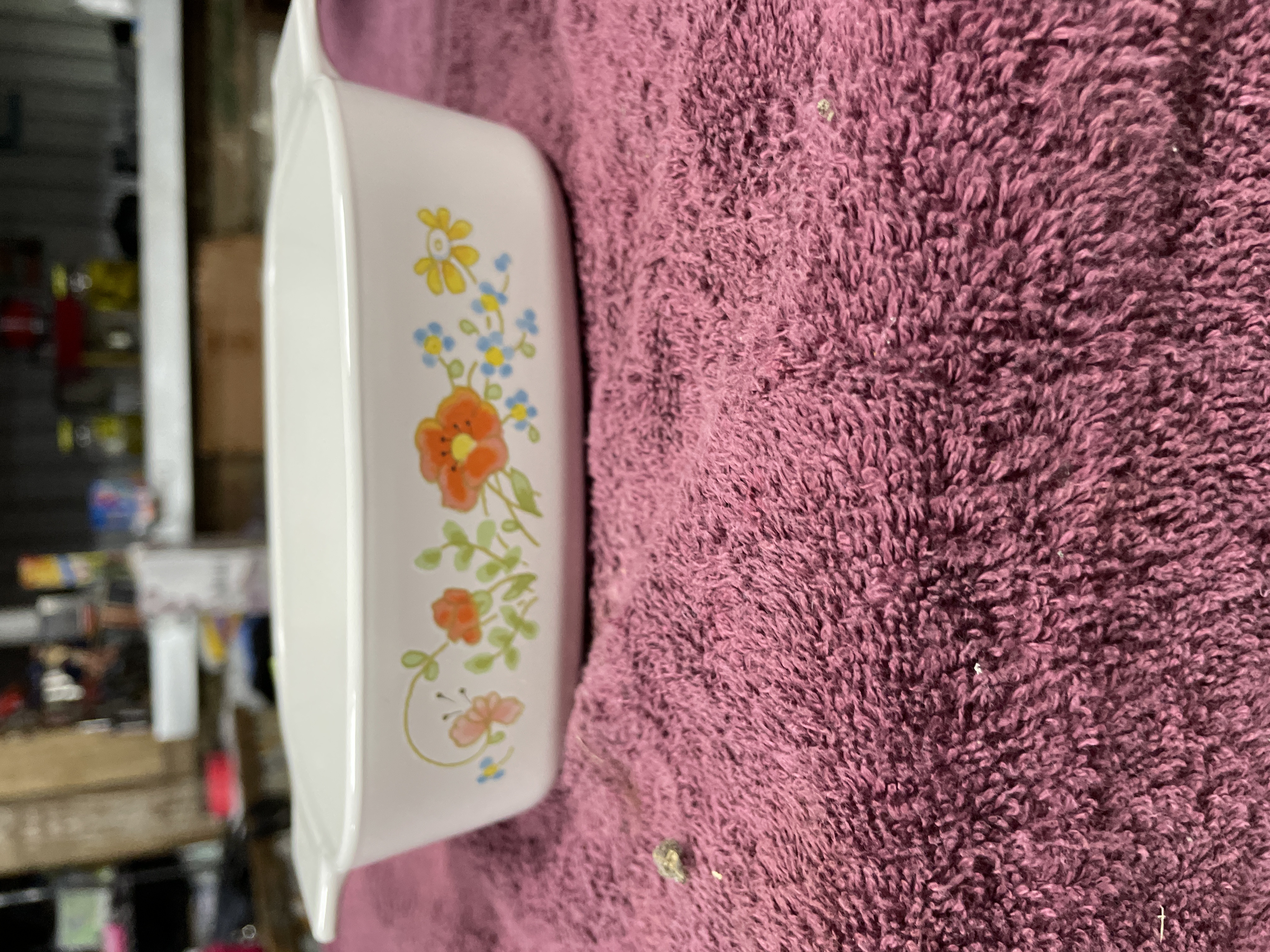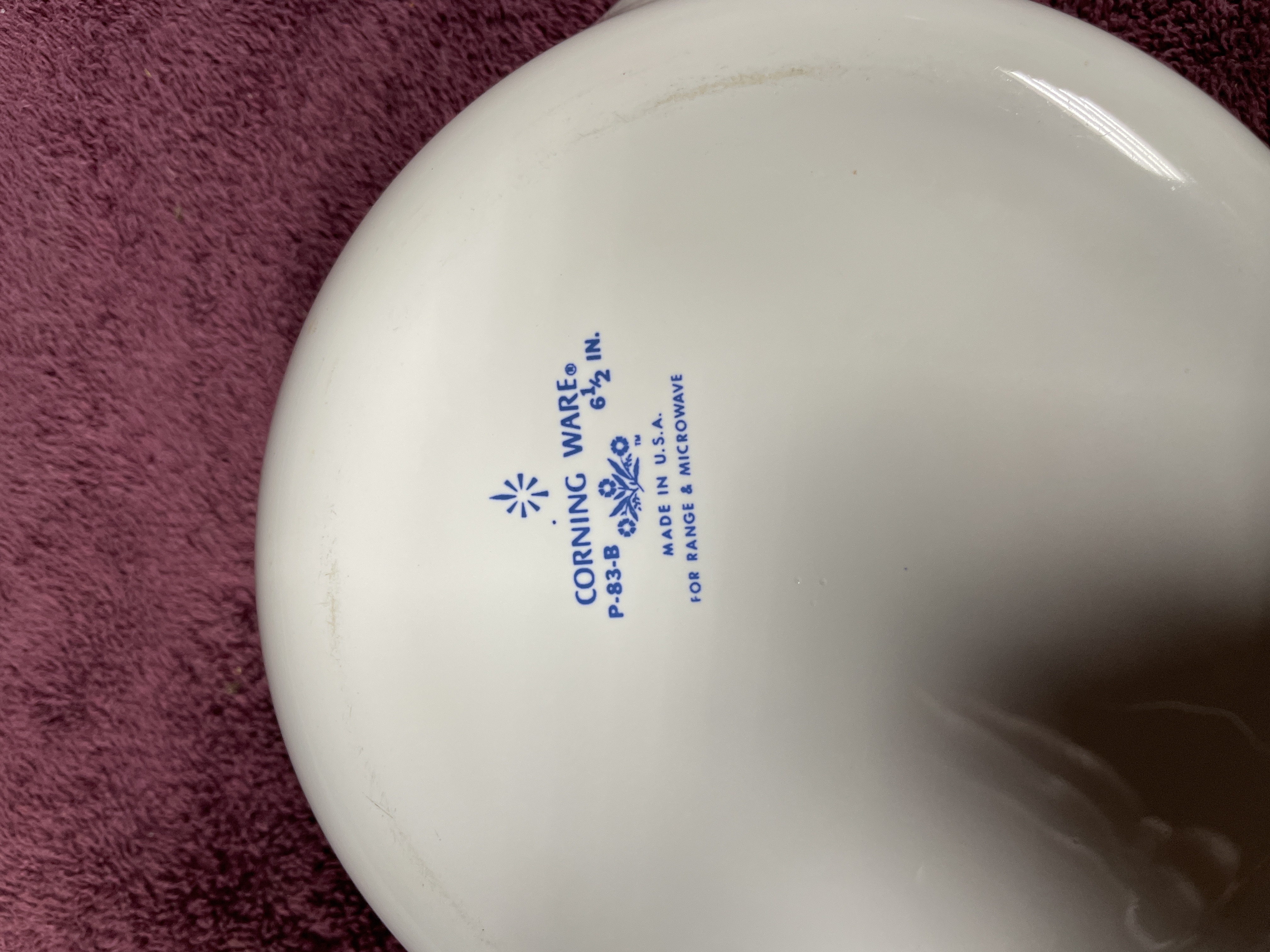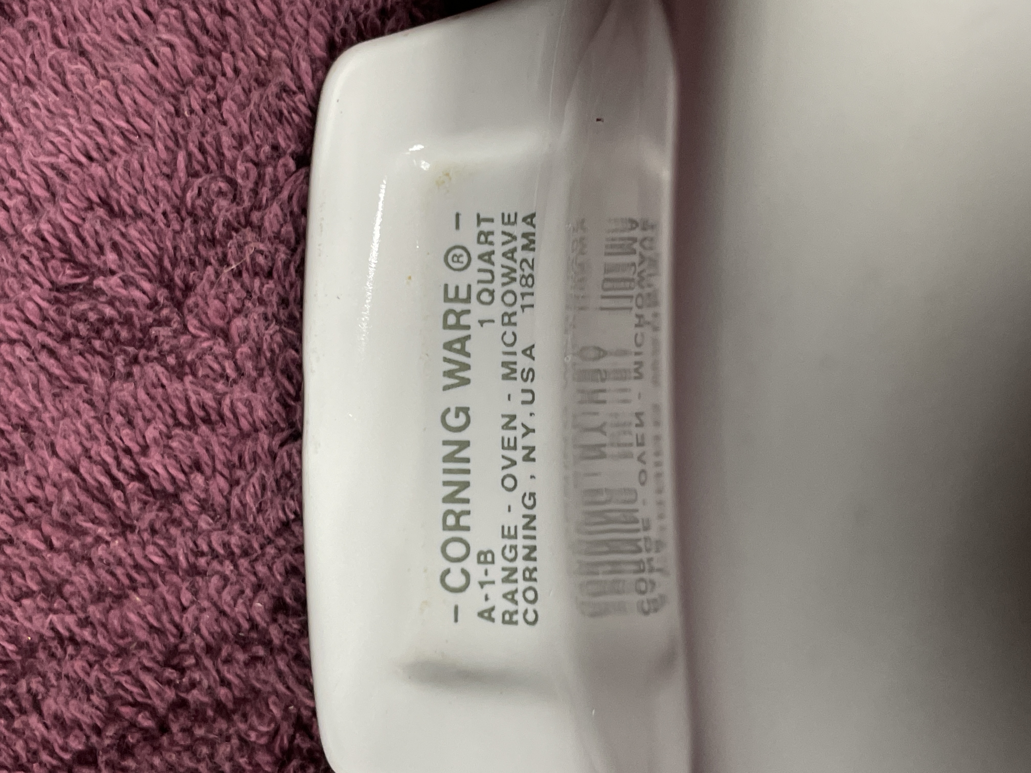 A collection of four vintage Corning Ware Pyroceram cooking vessels. The lot comprises three saucepans/skillets featuring the Floral Bouquet pattern (stylized yellow, blue, and green flowers) and one rectangular casserole dish featuring a different floral pattern (orange, red, blue, and green flowers). The vessels are constructed of white glass-ceramic suitable for range and microwave use. The three handled saucepans are marked on the base “CORNING WARE, ” “MADE IN U.S.A., ” and “FOR RANGE & MICROWAVE, ” with specific model numbers and capacities: P-81-B (1 Pint), P-82-B (1 1/2 Pint), and P-83-B (6 1/2 Inch skillet). The rectangular casserole dish is marked A-1-B, 1 QUART, CORNING, NY, USA, and is rated for range, oven, and microwave use.
