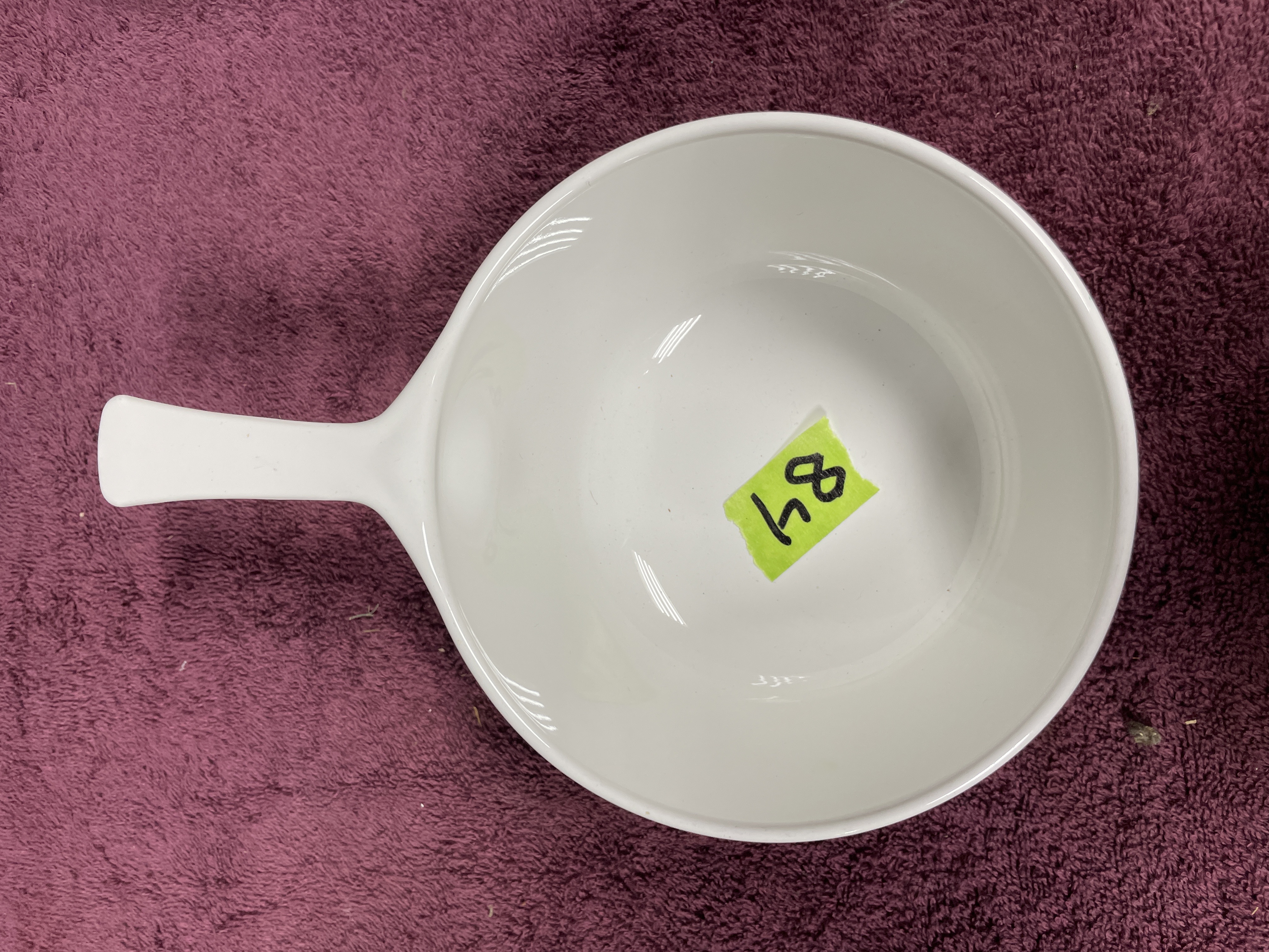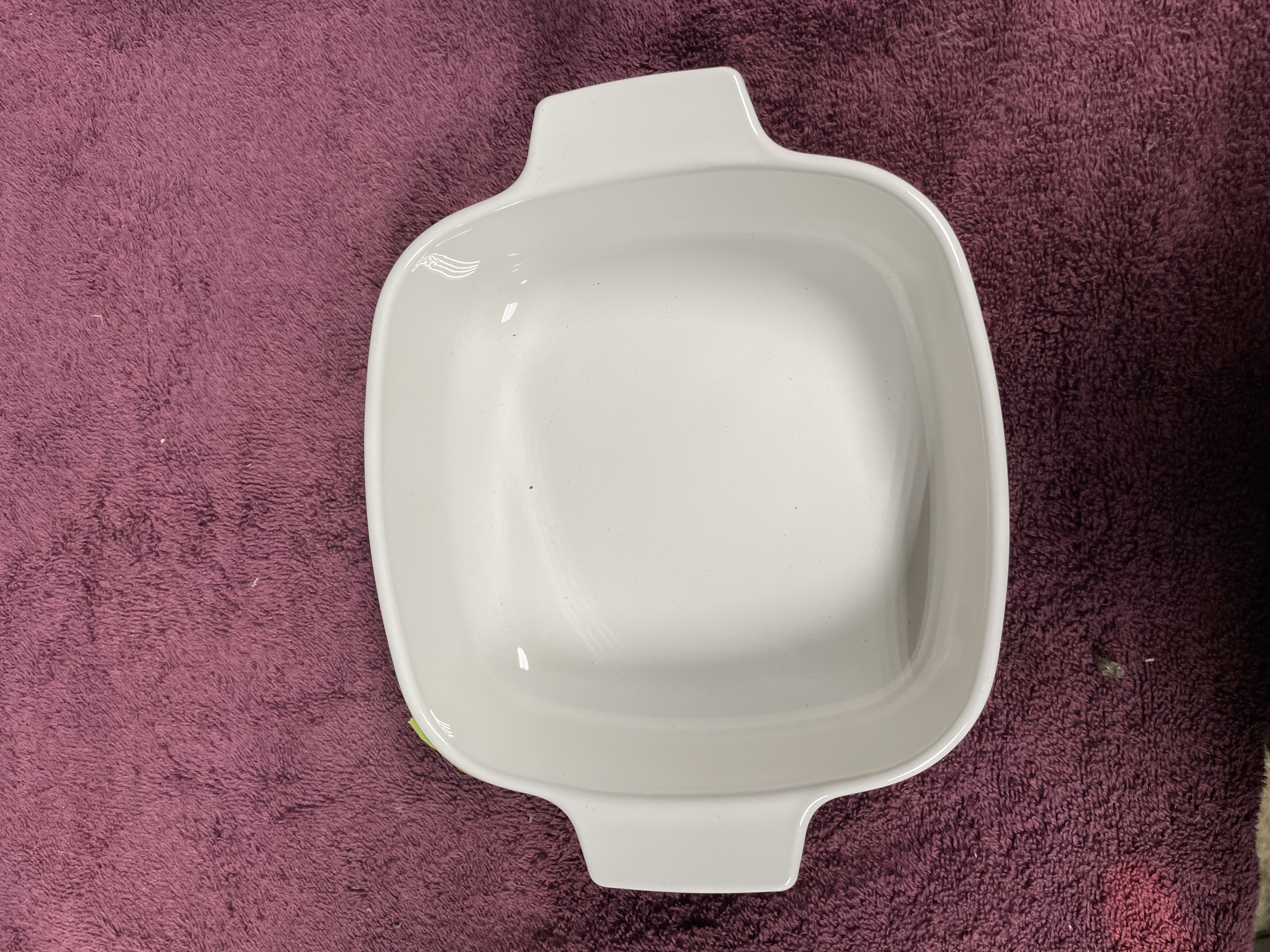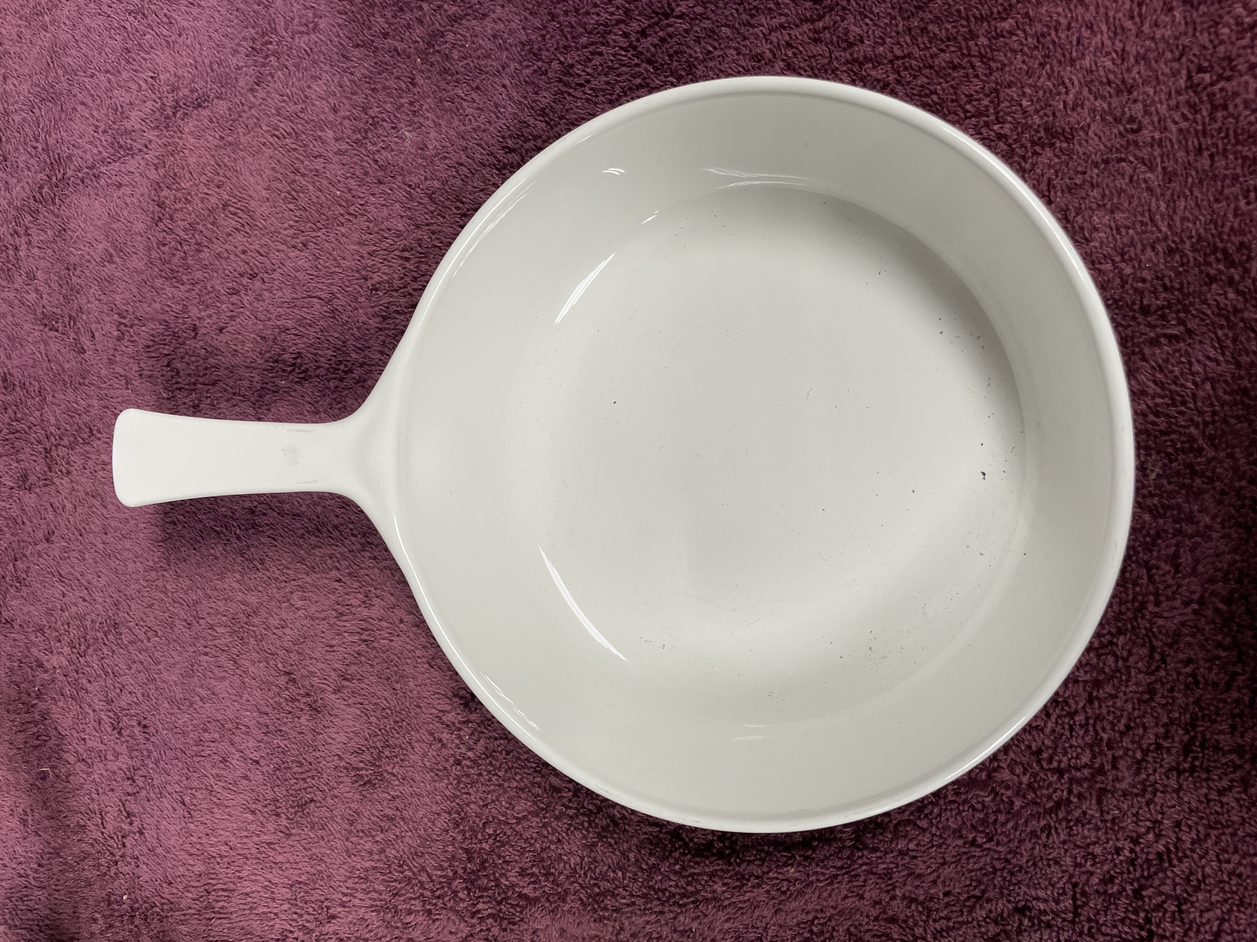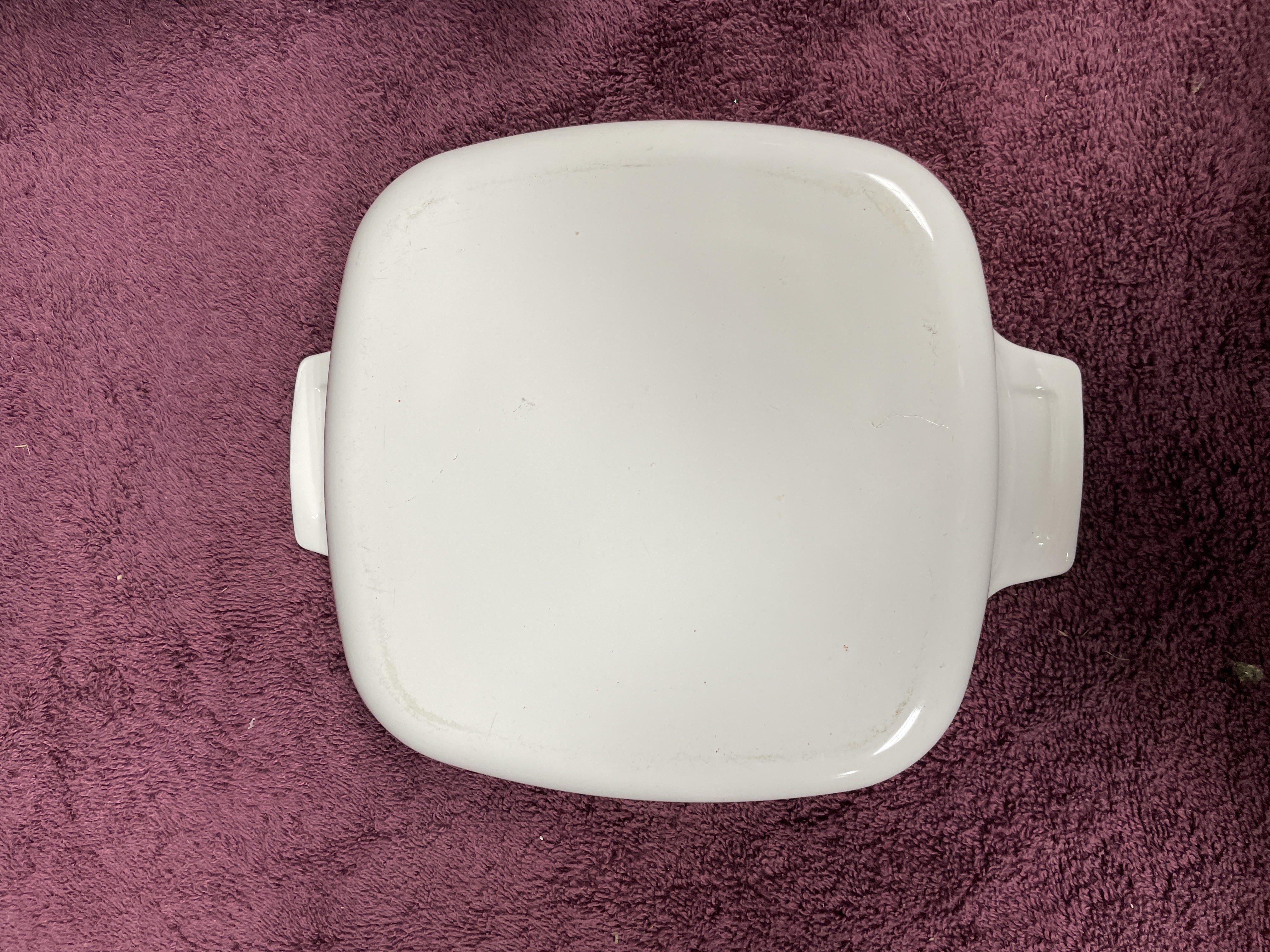 A collection of four vintage Corning Ware Pyroceram cooking vessels. The lot comprises three saucepans/skillets featuring the Floral Bouquet pattern (stylized yellow, blue, and green flowers) and one rectangular casserole dish featuring a different floral pattern (orange, red, blue, and green flowers). The vessels are constructed of white glass-ceramic suitable for range and microwave use. The three handled saucepans are marked on the base “CORNING WARE, ” “MADE IN U.S.A., ” and “FOR RANGE & MICROWAVE, ” with specific model numbers and capacities: P-81-B (1 Pint), P-82-B (1 1/2 Pint), and P-83-B (6 1/2 Inch skillet). The rectangular casserole dish is marked A-1-B, 1 QUART, CORNING, NY, USA, and is rated for range, oven, and microwave use.