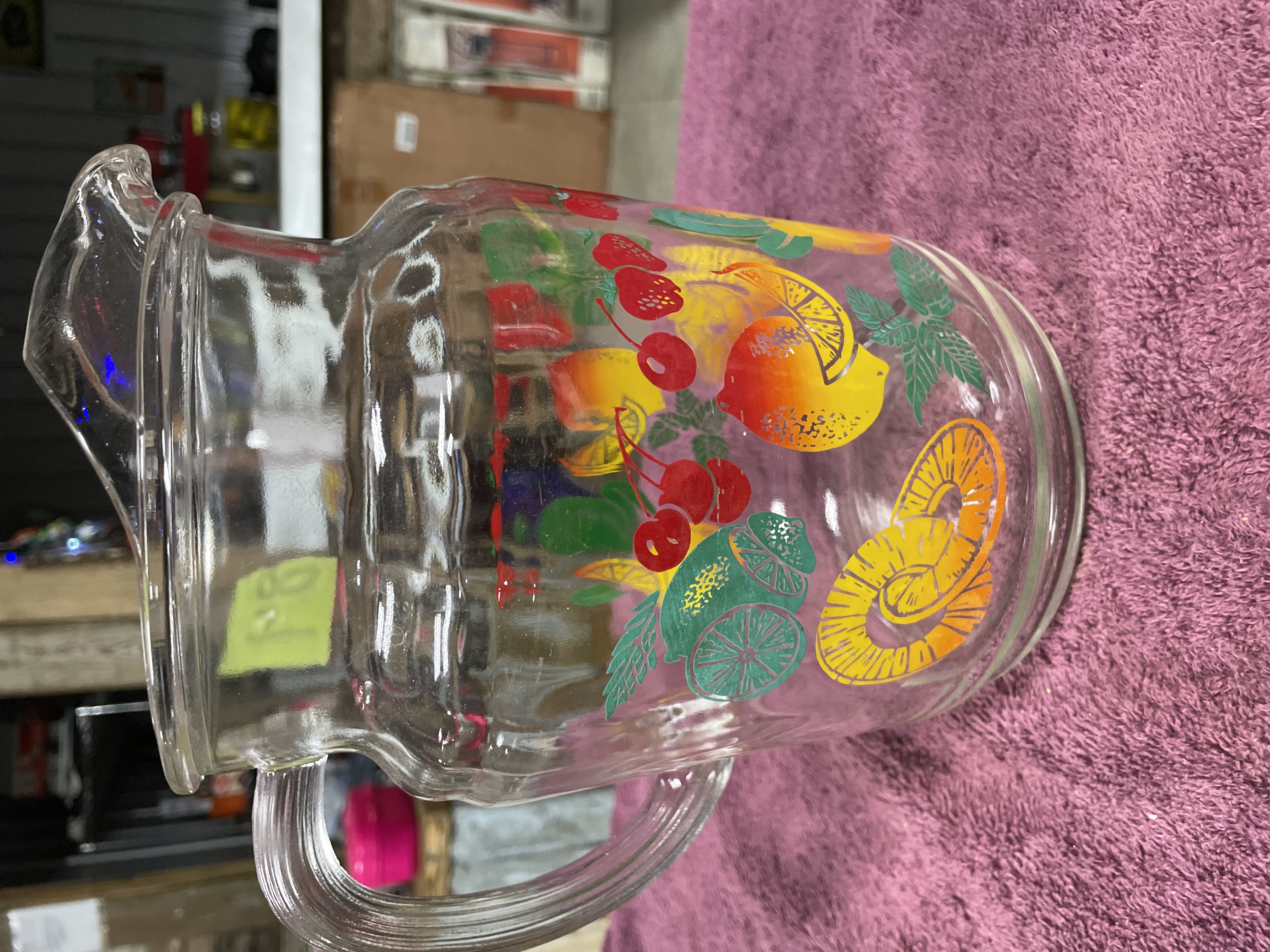 A single molded glass beverage pitcher, consistent with vintage kitchenware styling of the mid-20th century. The pitcher features a clear glass body, a ribbed C-scroll handle, and a defined pour spout. The rounded body is decorated with extensive applied decal transfers depicting stylized fruit, including lemons, oranges, cherries, strawberries, and pineapple slices, rendered in bright colors. The base exhibits typical mold lines and lacks any definitive manufacturer markings.