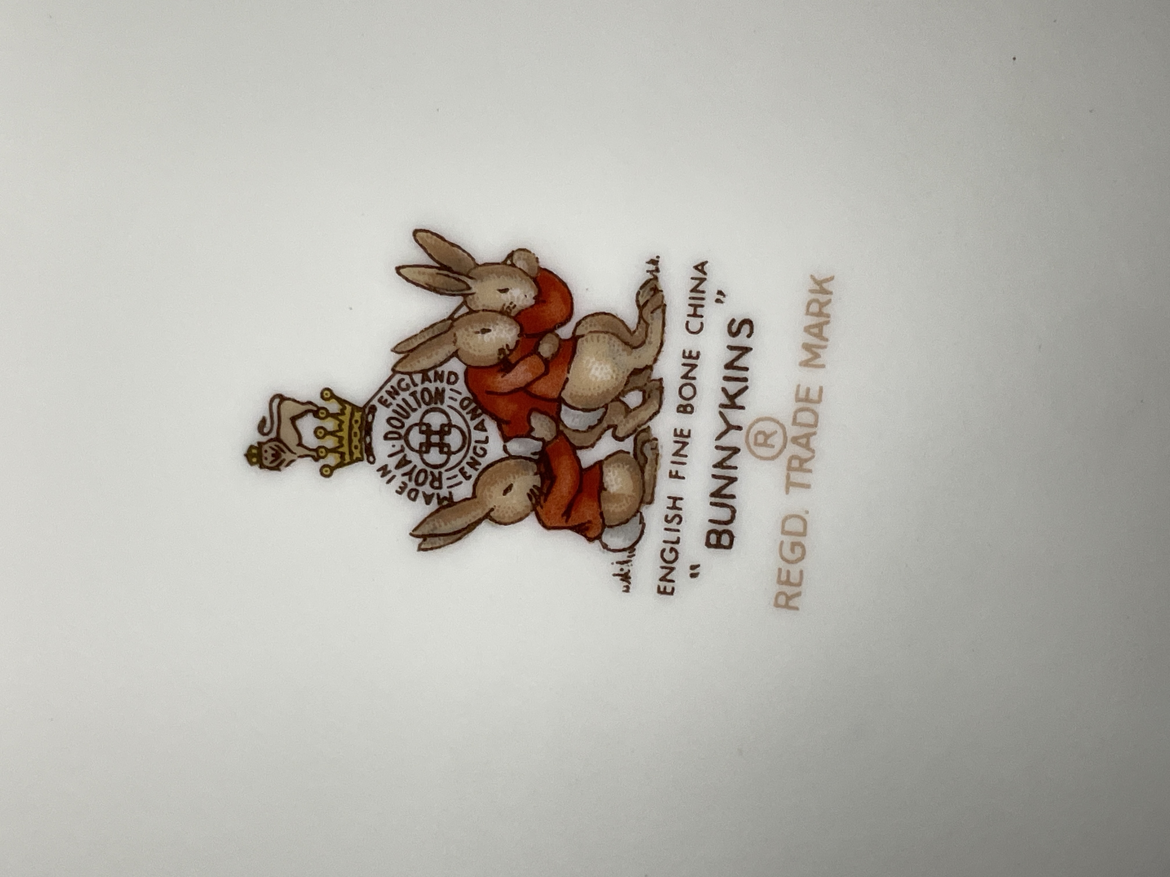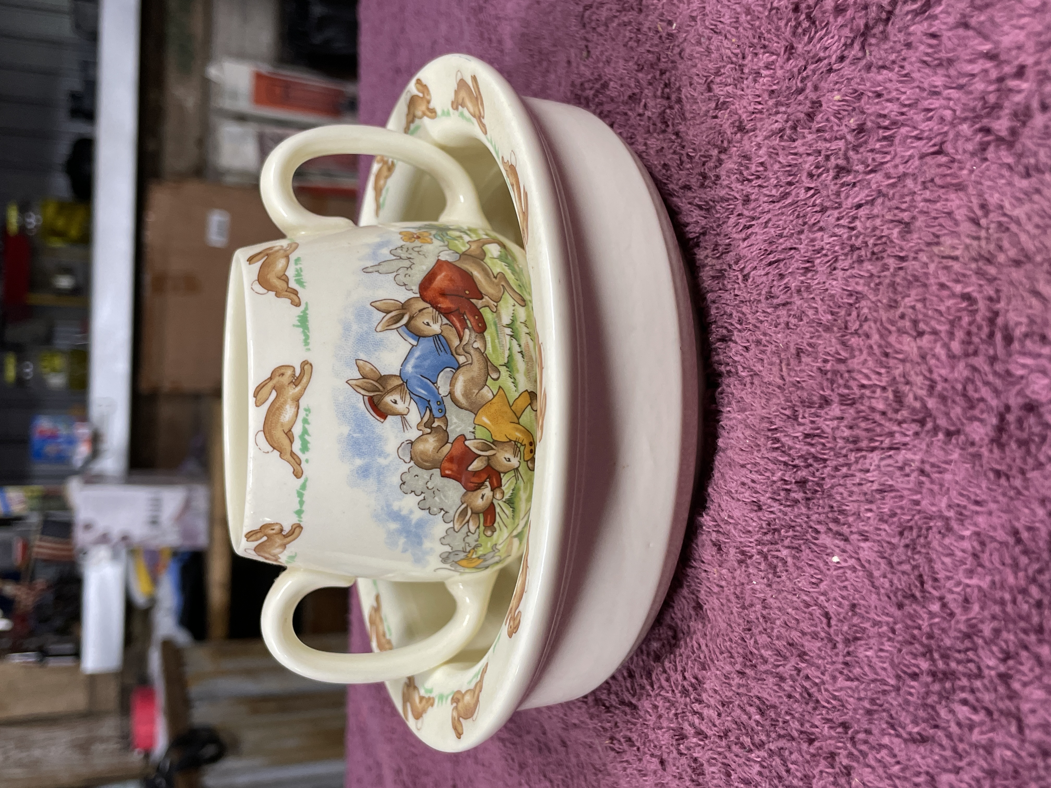 A matched set of two pieces of Royal Doulton Bunnykins English Fine Bone China tableware. The set comprises a two-handled child’s cup and a shallow feeding bowl. Both items feature multicolor transferware designs depicting anthropomorphic rabbits and mice engaged in various narrative scenes. The rims of both pieces are bordered by a repeated motif of running brown rabbits. The base of the cup is marked with the Royal Doulton crown logo and inscribed with "MADE IN ENGLAND, " "ENGLISH FINE BONE CHINA, " "BUNNYKINS, " and "REGD. TRADE MARK."
