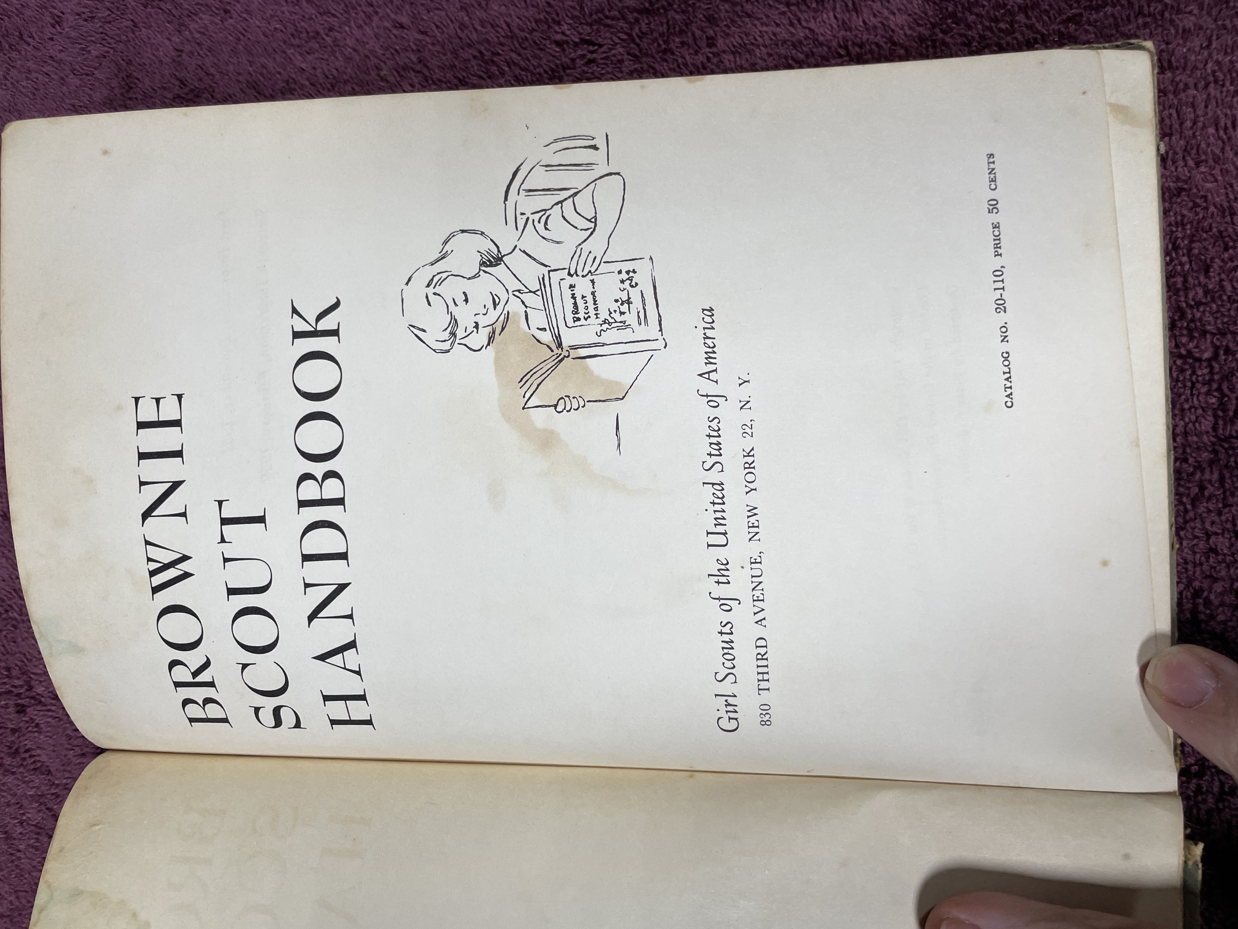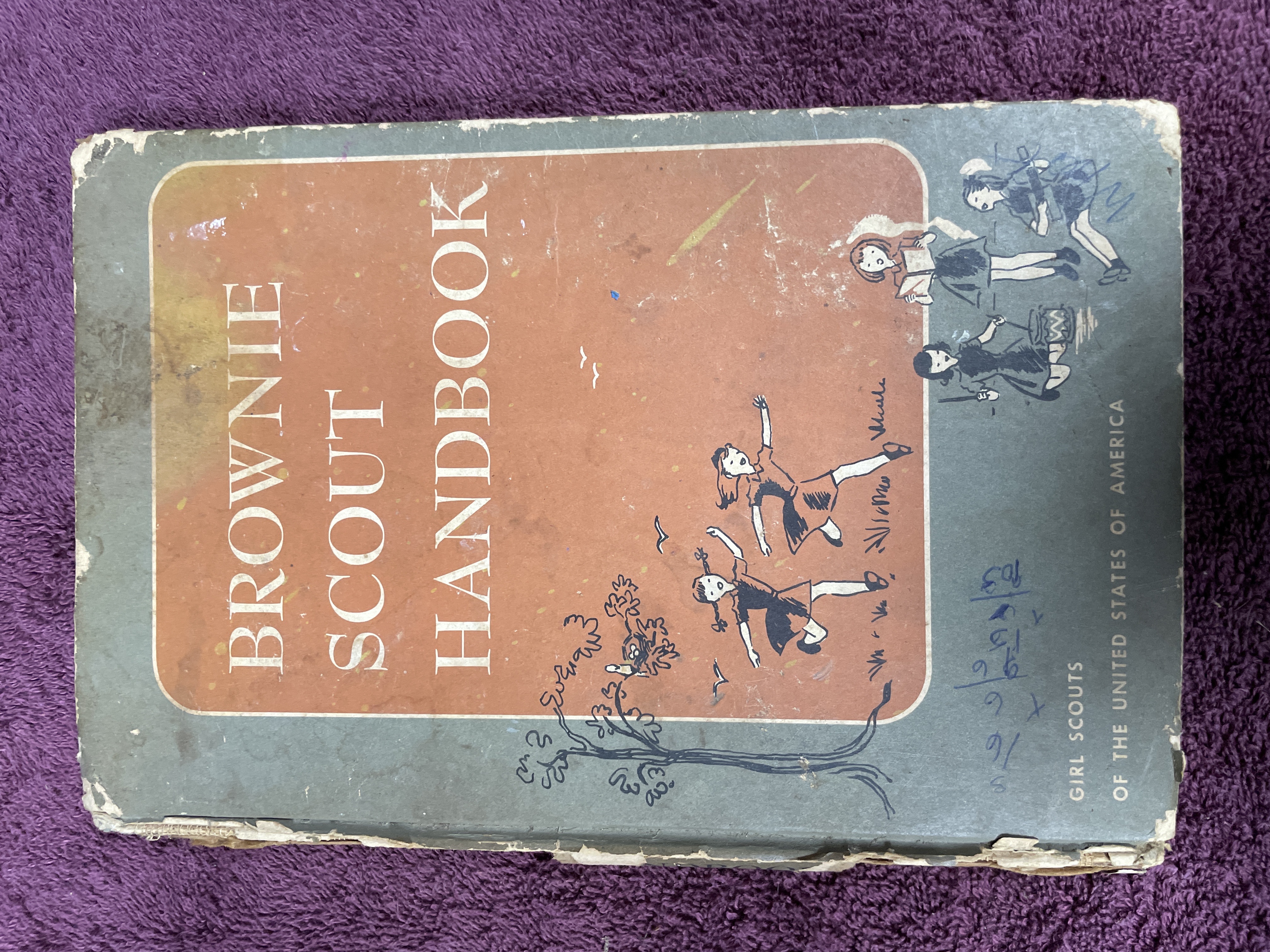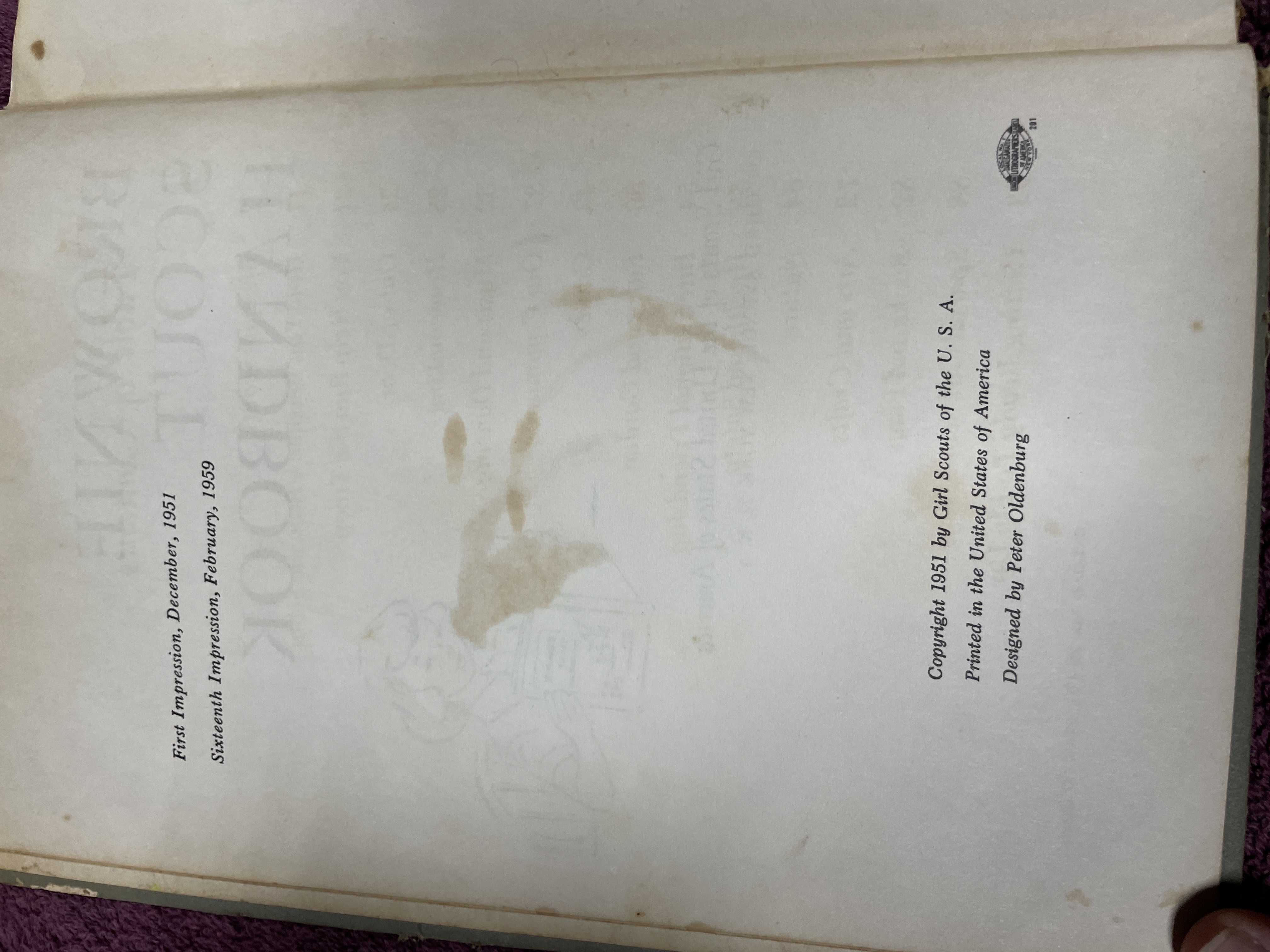 A vintage hardback edition of the Brownie Scout Handbook published by the Girl Scouts of the United States of America. The volume is identified as the Sixteenth Impression, dated February 1959, of the original 1951 copyrighted edition. The book was designed by Peter Oldenburg. The cover features stylized illustrations of Brownie Scouts rendered in a blue and burnt-orange color palette. The interior contains instructional text and numerous black-and-white line-drawn illustrations detailing activities, songs, and membership requirements, including a Certificate of Membership page. The book is cataloged as NO. 20-110, with an original printed price of 50 Cents.