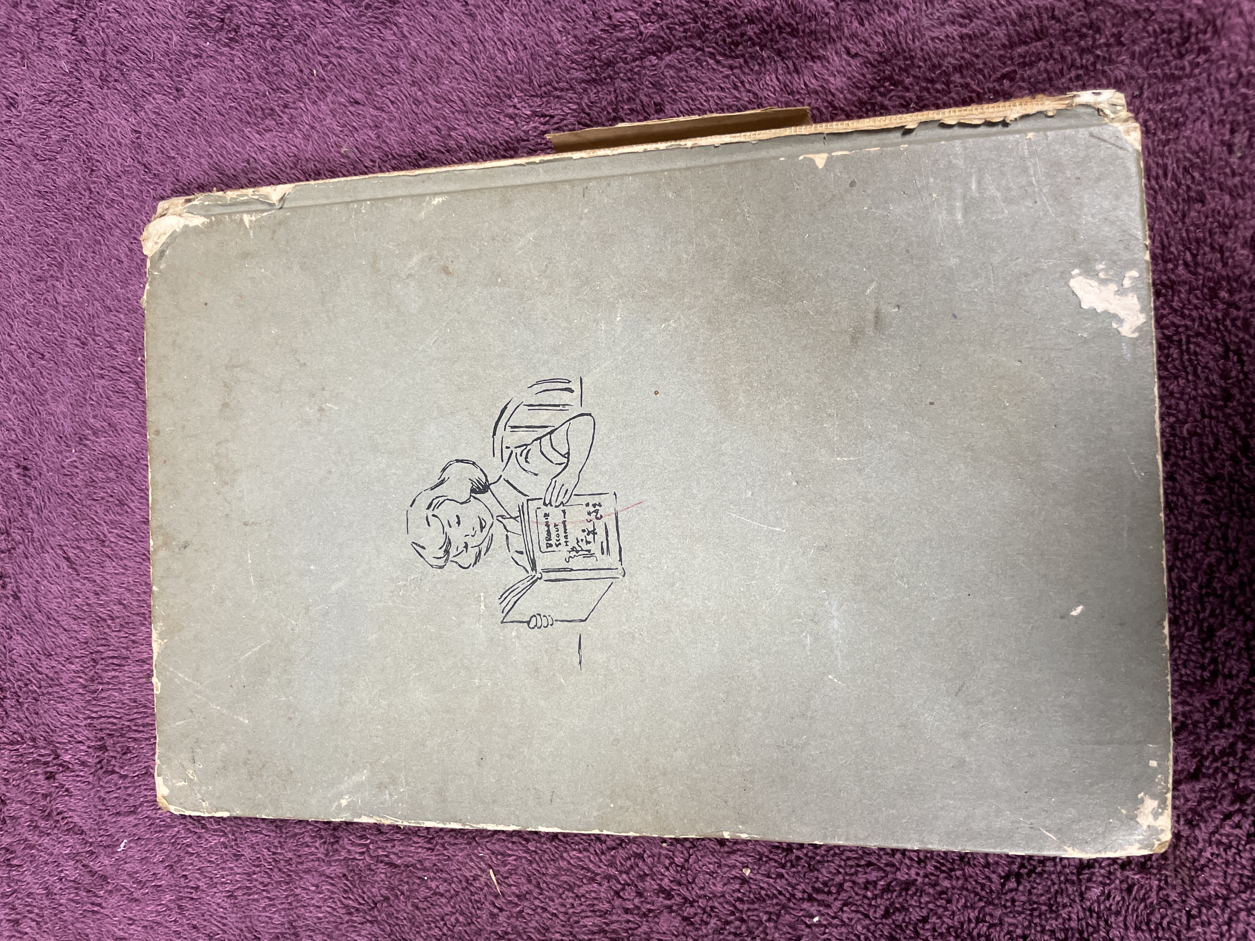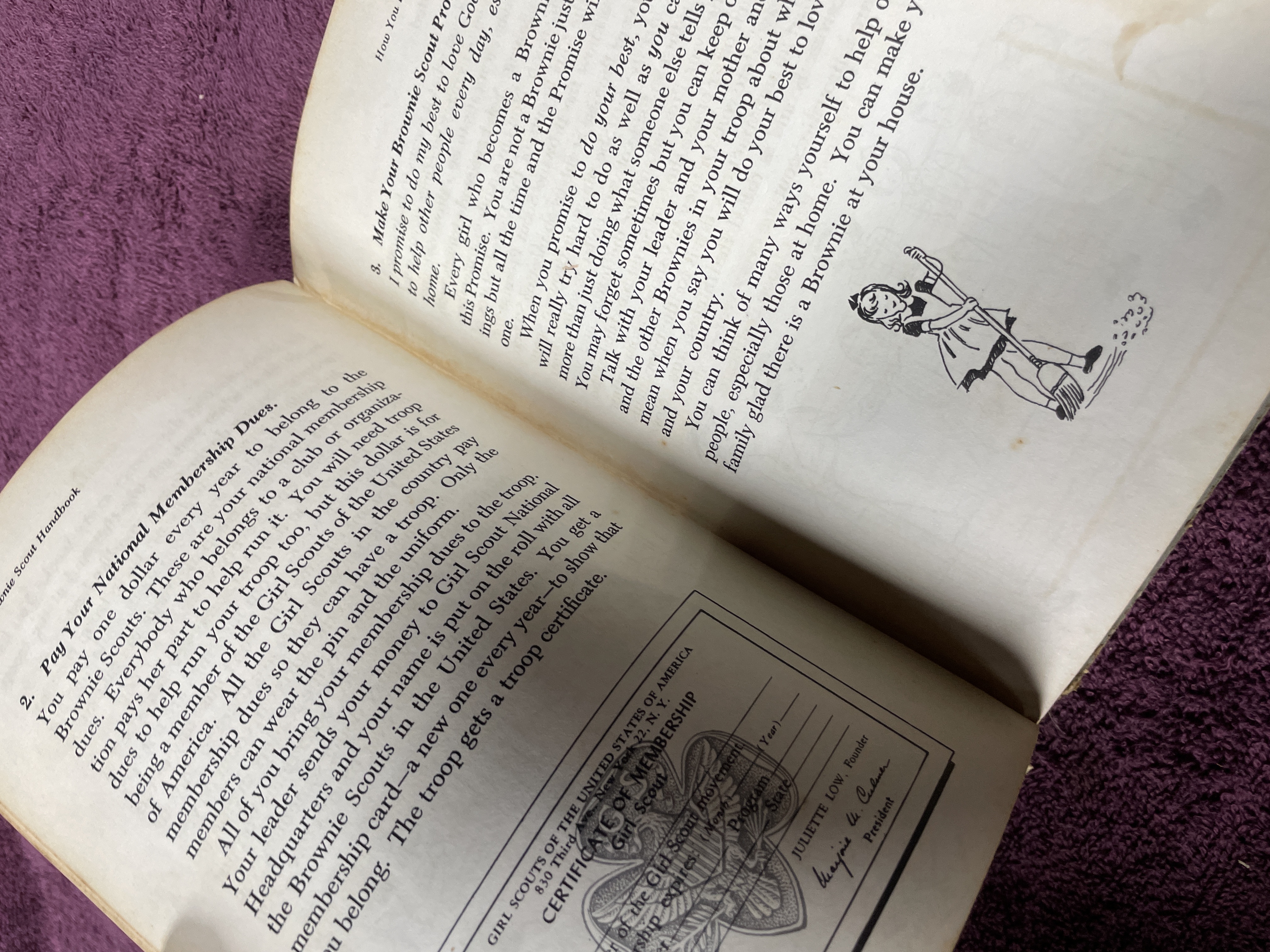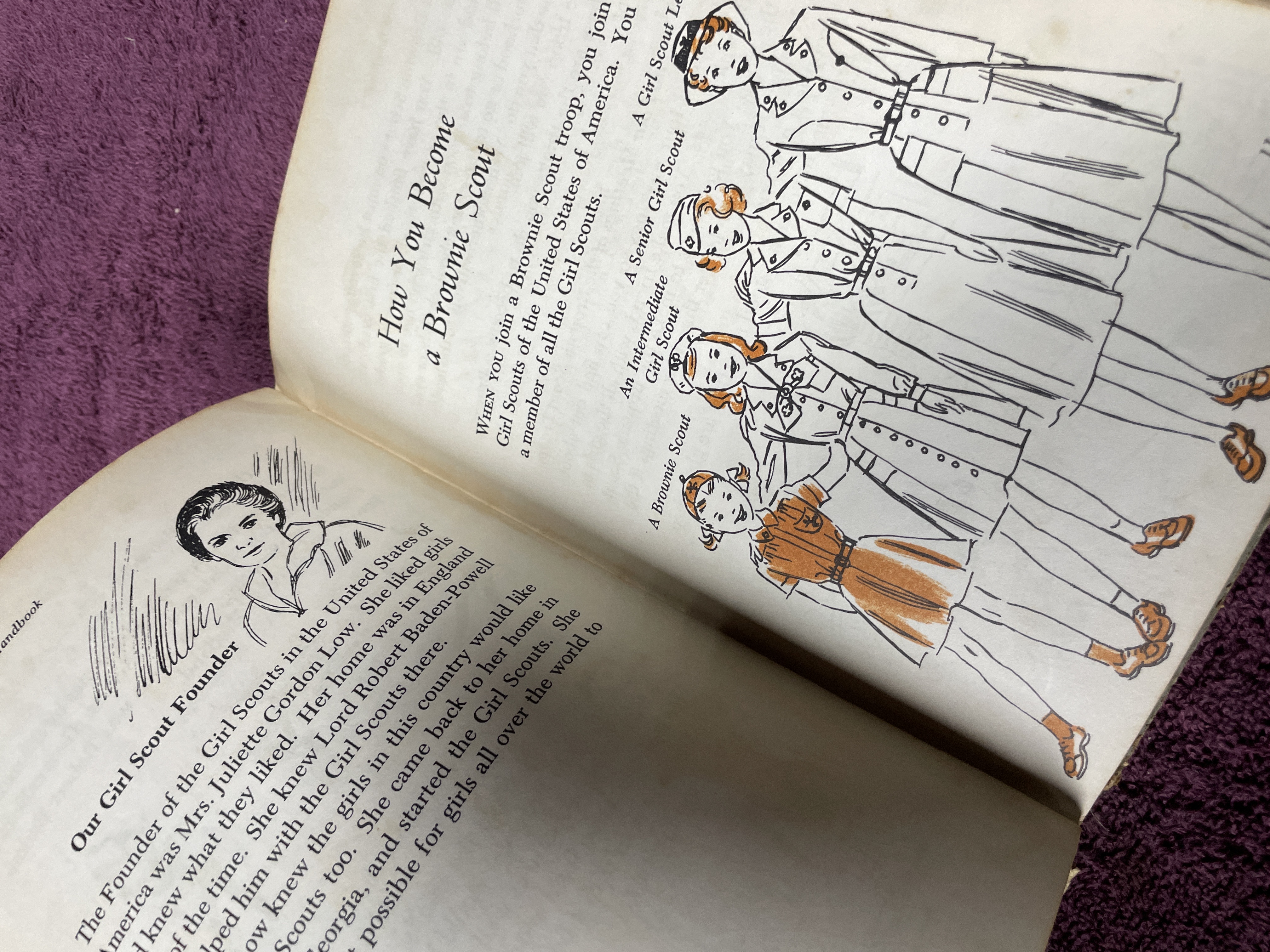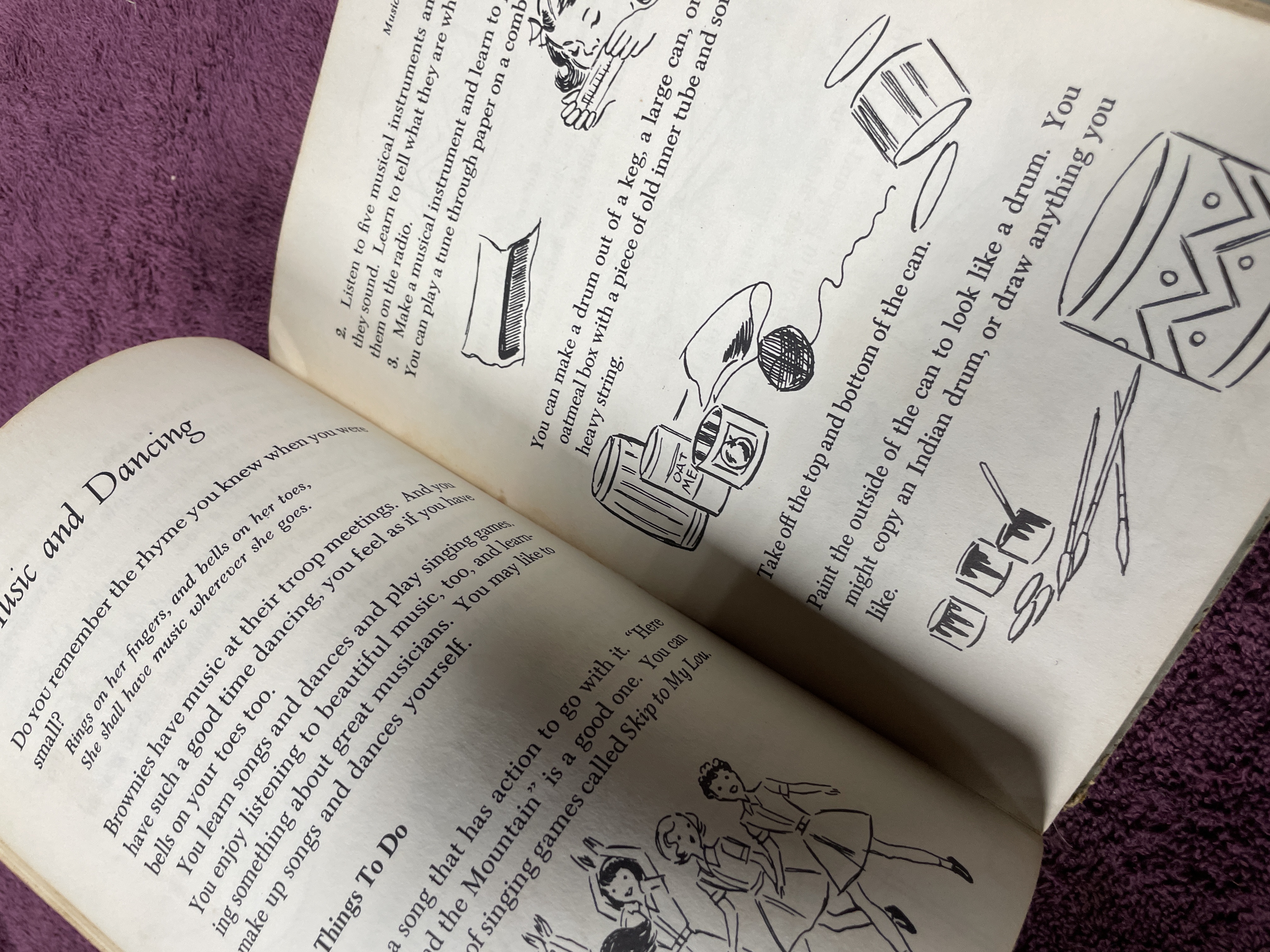 A vintage hardback edition of the Brownie Scout Handbook published by the Girl Scouts of the United States of America. The volume is identified as the Sixteenth Impression, dated February 1959, of the original 1951 copyrighted edition. The book was designed by Peter Oldenburg. The cover features stylized illustrations of Brownie Scouts rendered in a blue and burnt-orange color palette. The interior contains instructional text and numerous black-and-white line-drawn illustrations detailing activities, songs, and membership requirements, including a Certificate of Membership page. The book is cataloged as NO. 20-110, with an original printed price of 50 Cents.