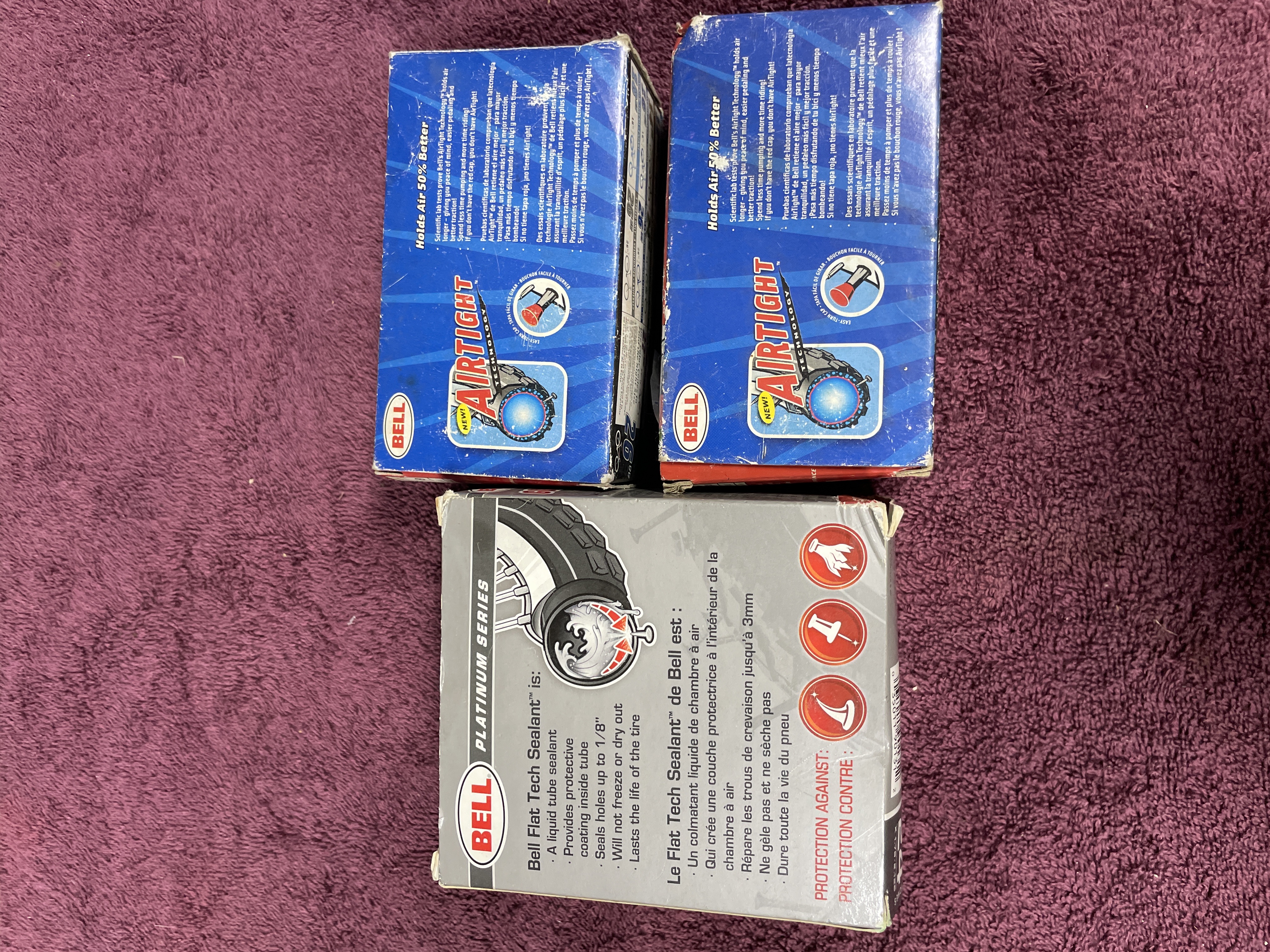 A collection of three new, sealed bicycle inner tubes manufactured by the BELL brand. The lot includes one large square box from the “Platinum Series” labeled “GUARANTEED NO FLATS SELF SEALING TUBE” for a 24-inch tire (1.75 – 2.125 wide). This tube utilizes Flat Tech Sealant designed to repair punctures up to 1/8 inch. The lot also contains two rectangular boxes from the “Ready to Ride AIRTIGHT Inner Tube” series. These two tubes are specified for a 26-inch Cruiser and Mountain application and a 24-inch JR Mountain application, respectively. The packaging features multilingual descriptive text, including English, Spanish, and French, advertising the sealant technology and claiming the tubes “Holds air 50% better.”