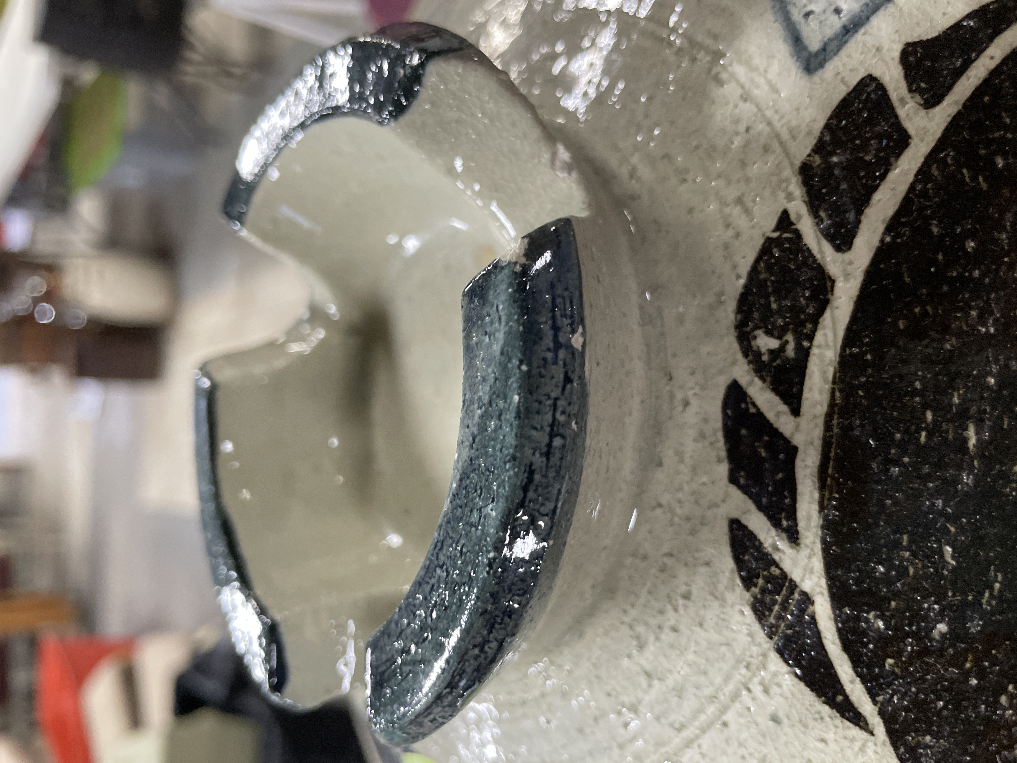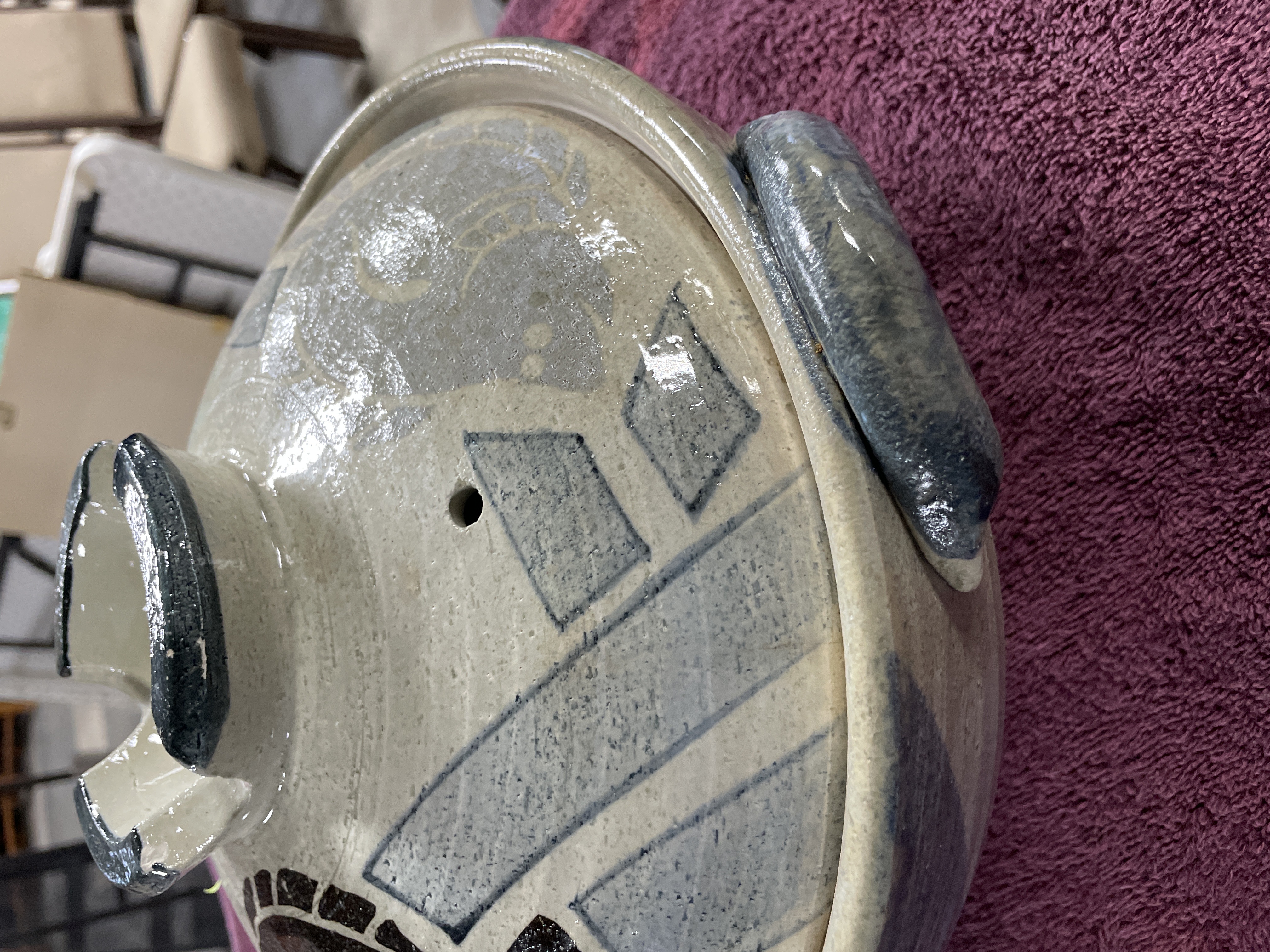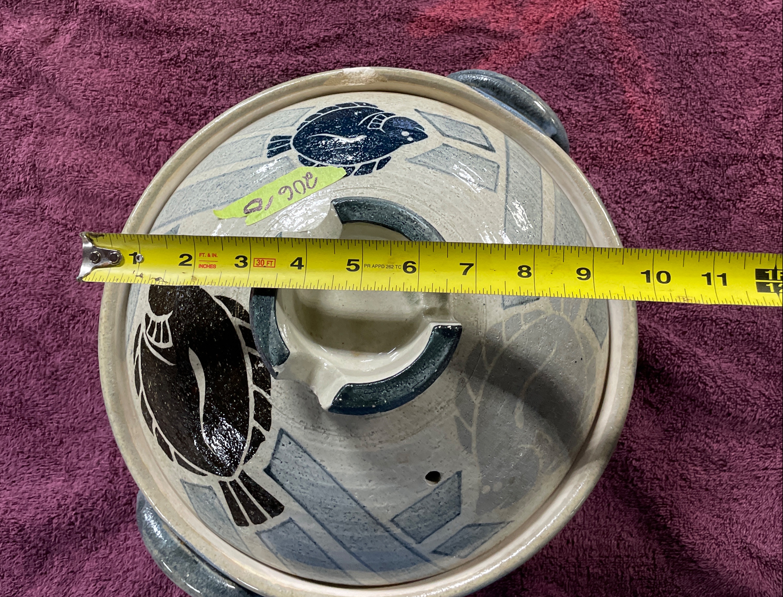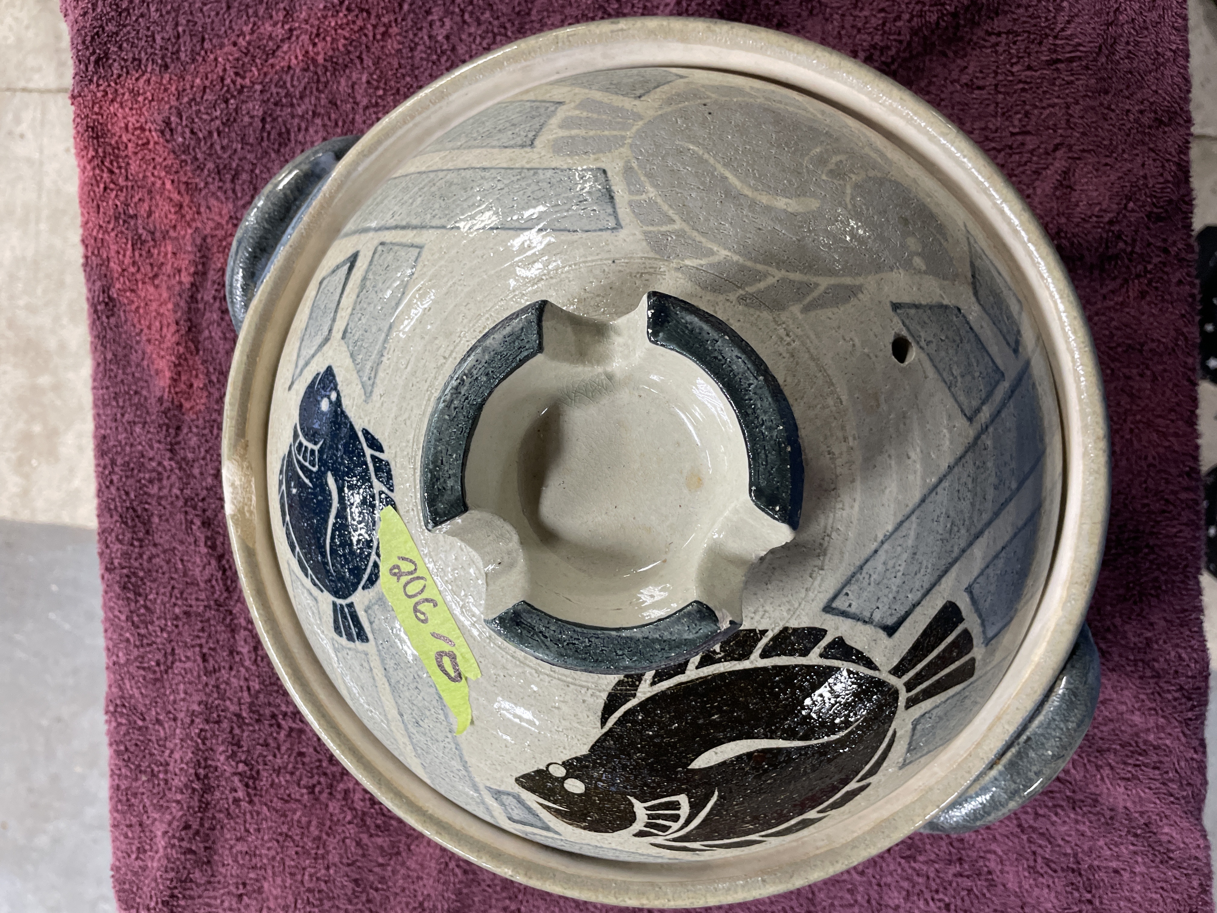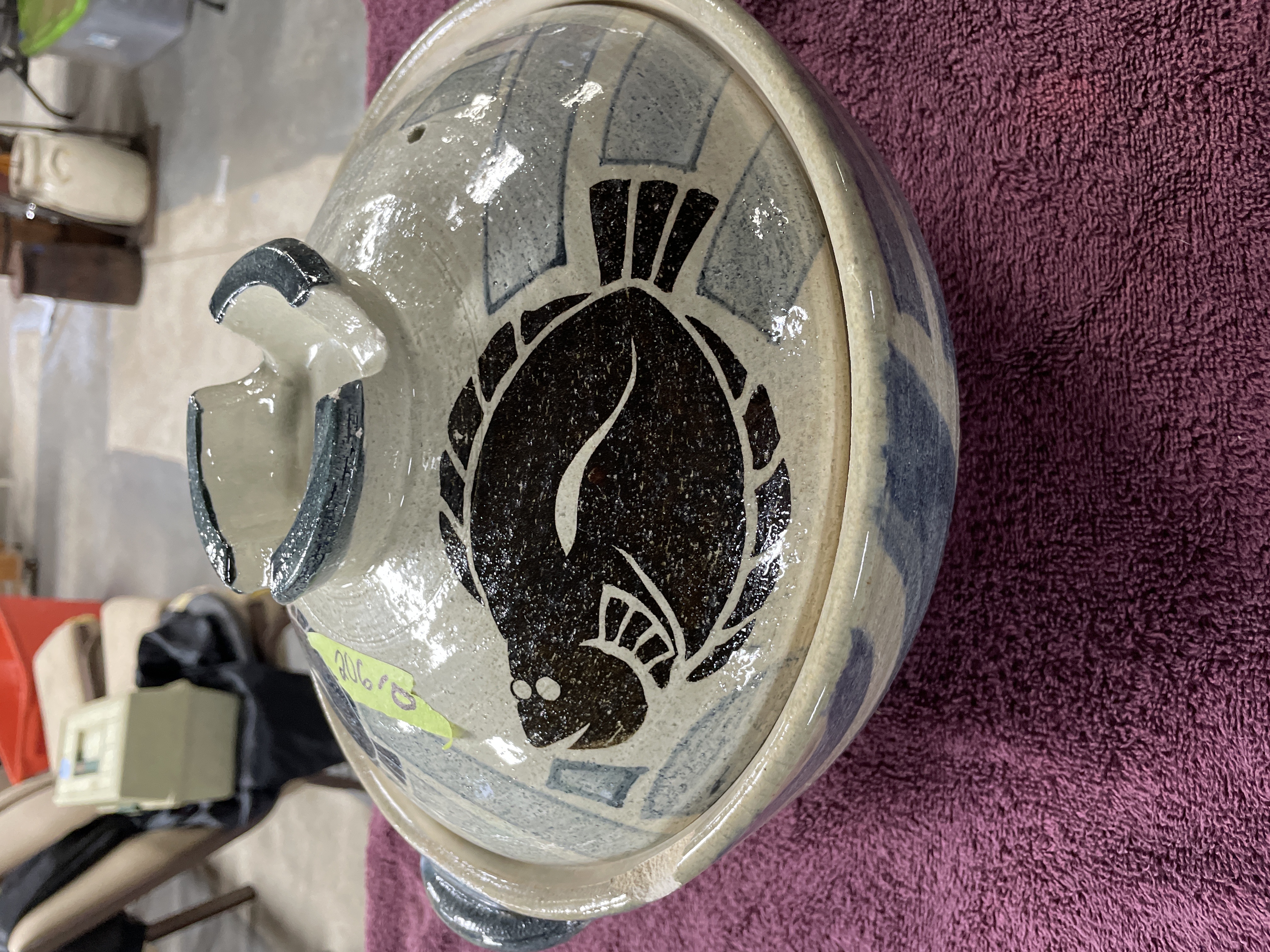 A Japanese earthenware lidded cooking vessel, consistent with a donabe or casserole, often associated with CtoC Japan Select or Banko Ware production. The heavy ceramic body is finished with a glossy glaze and decorated using slip-painted techniques featuring abstract geometric patterns in gray and blue. Large, stylized fish motifs are overlaid in black and dark blue on the lid. The bowl features two applied handles. The lid includes a single ventilation hole and a centrally located, recessed handle structure. The base displays an unglazed foot ring and a prominent central wheel-thrown spiral mark. A price sticker reading "$9.00" is affixed to the lid.