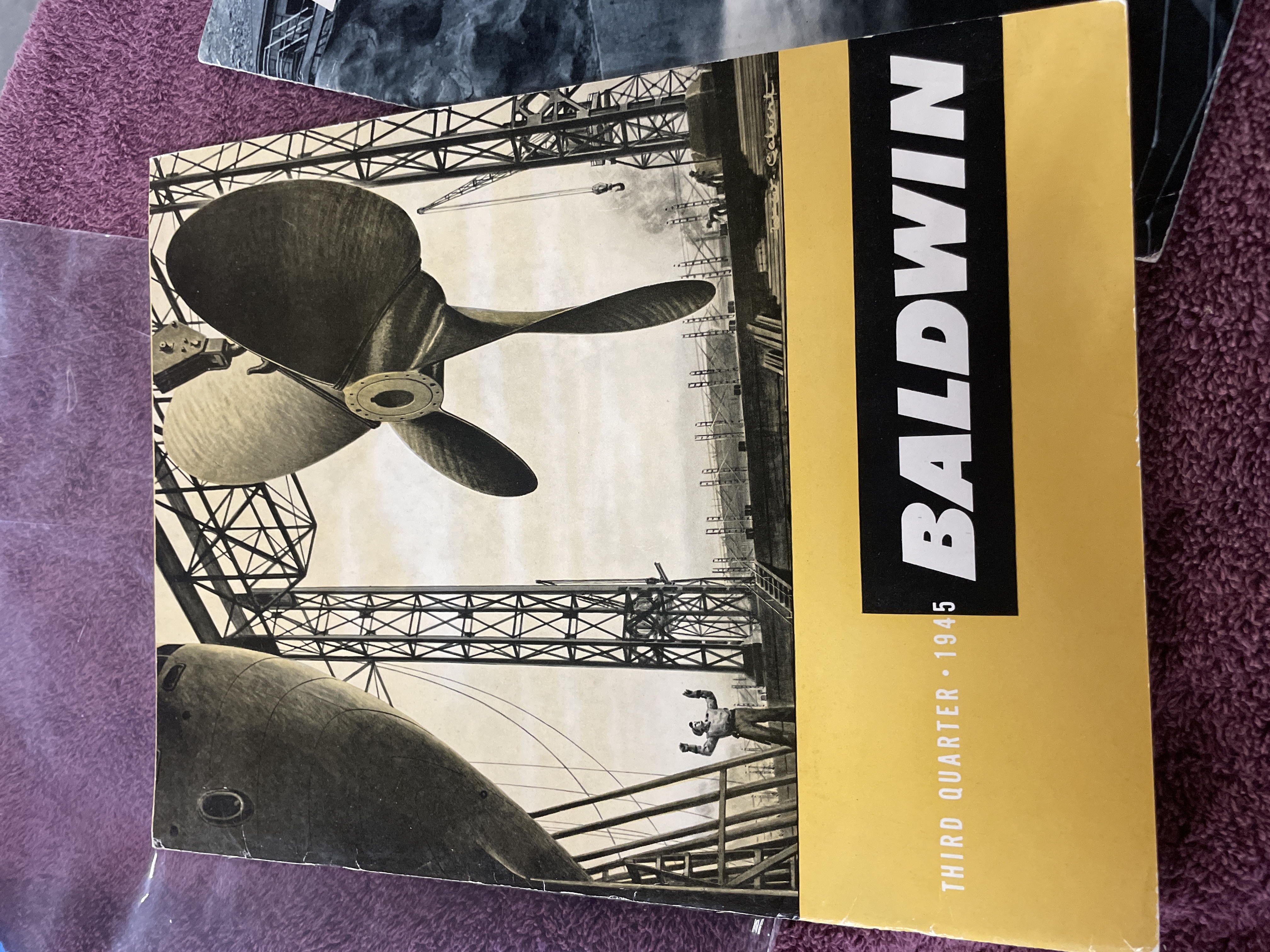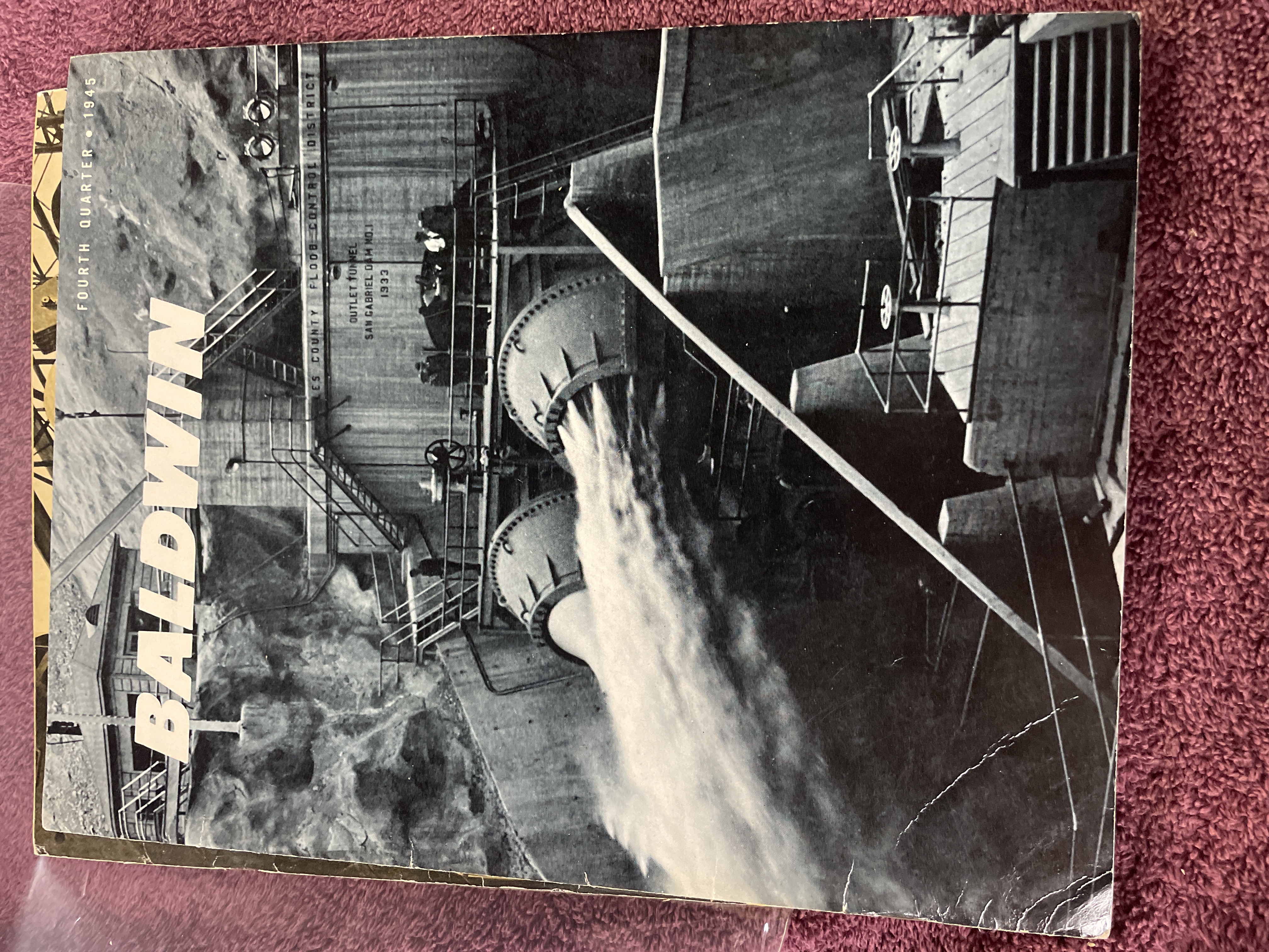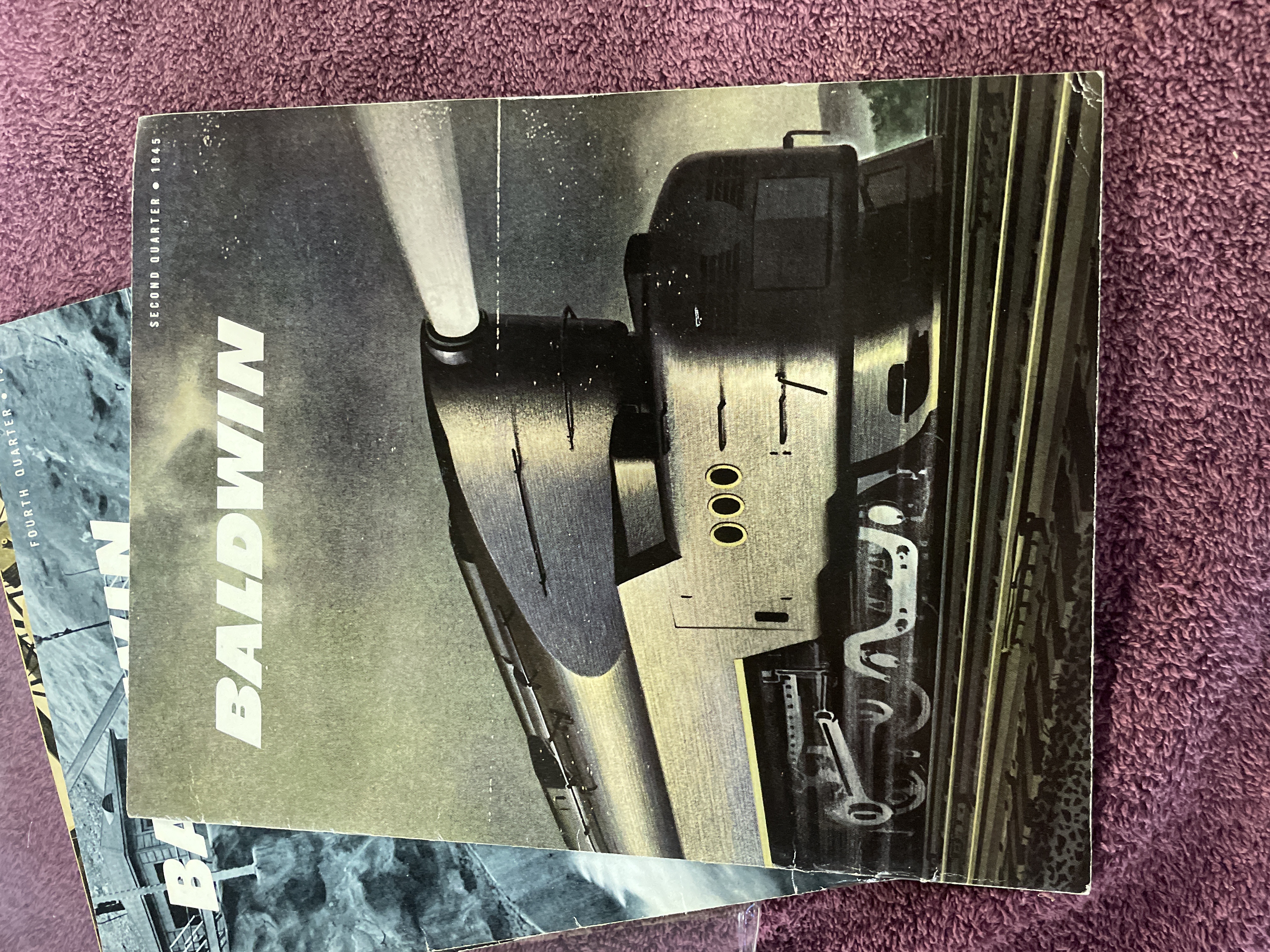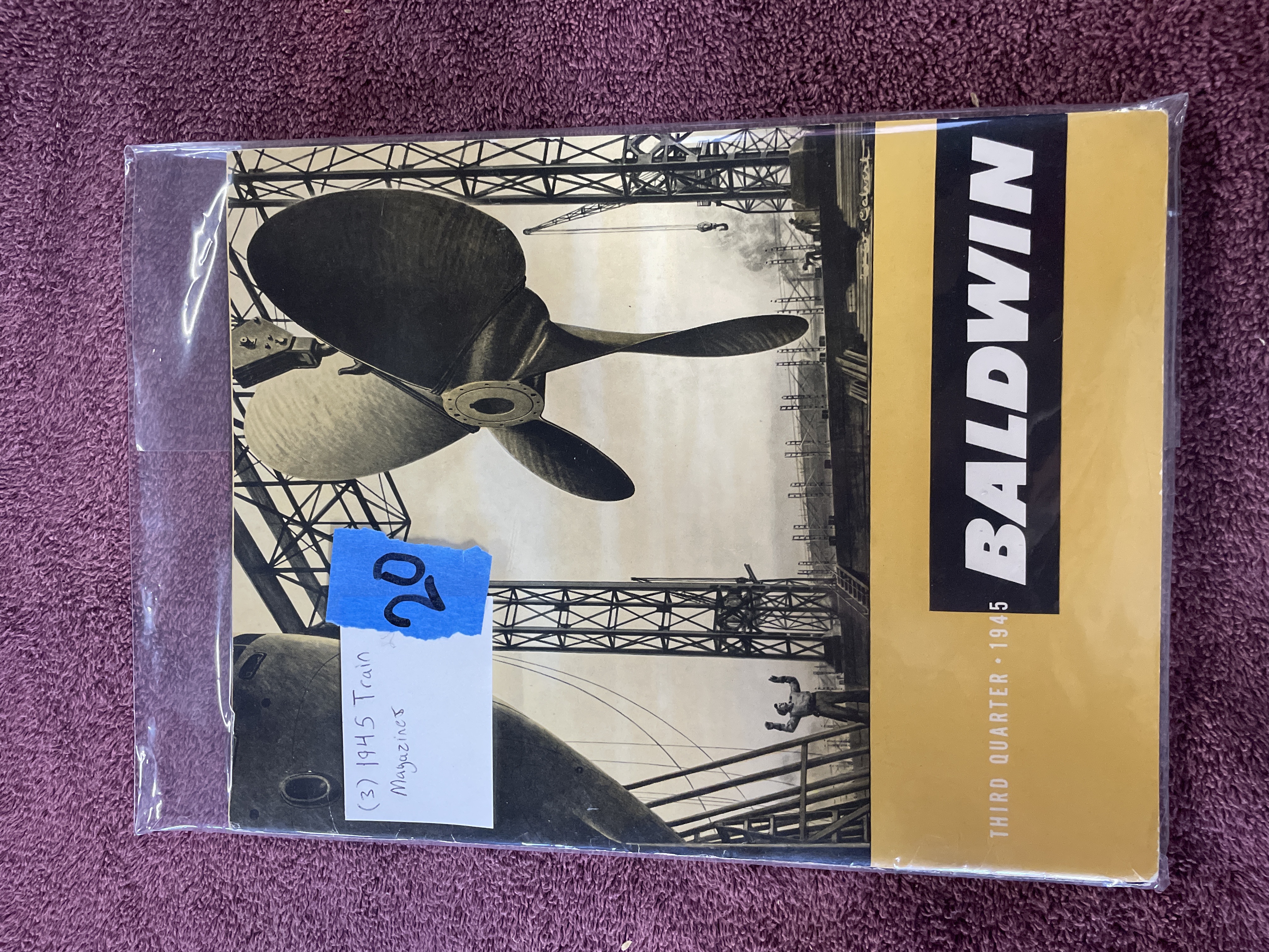 A collection of three vintage softcover periodicals titled BALDWIN, published by The Baldwin Locomotive Works of Philadelphia, Pennsylvania, U. S. A. The magazines are printed paper construction and date entirely from Volume 2, 1945. The collection includes the Second Quarter (No. 2, depicting a streamlined locomotive), the Third Quarter (No. 3, featuring an industrial shipyard scene with a large propeller), and the Fourth Quarter (No. 4, showing a dam or flood control structure). The internal pages detail various industrial products, projects, and engineering topics relevant to the post-war era, including articles on the T-1 locomotive, Baldwin Diesels, and hydraulic projects.