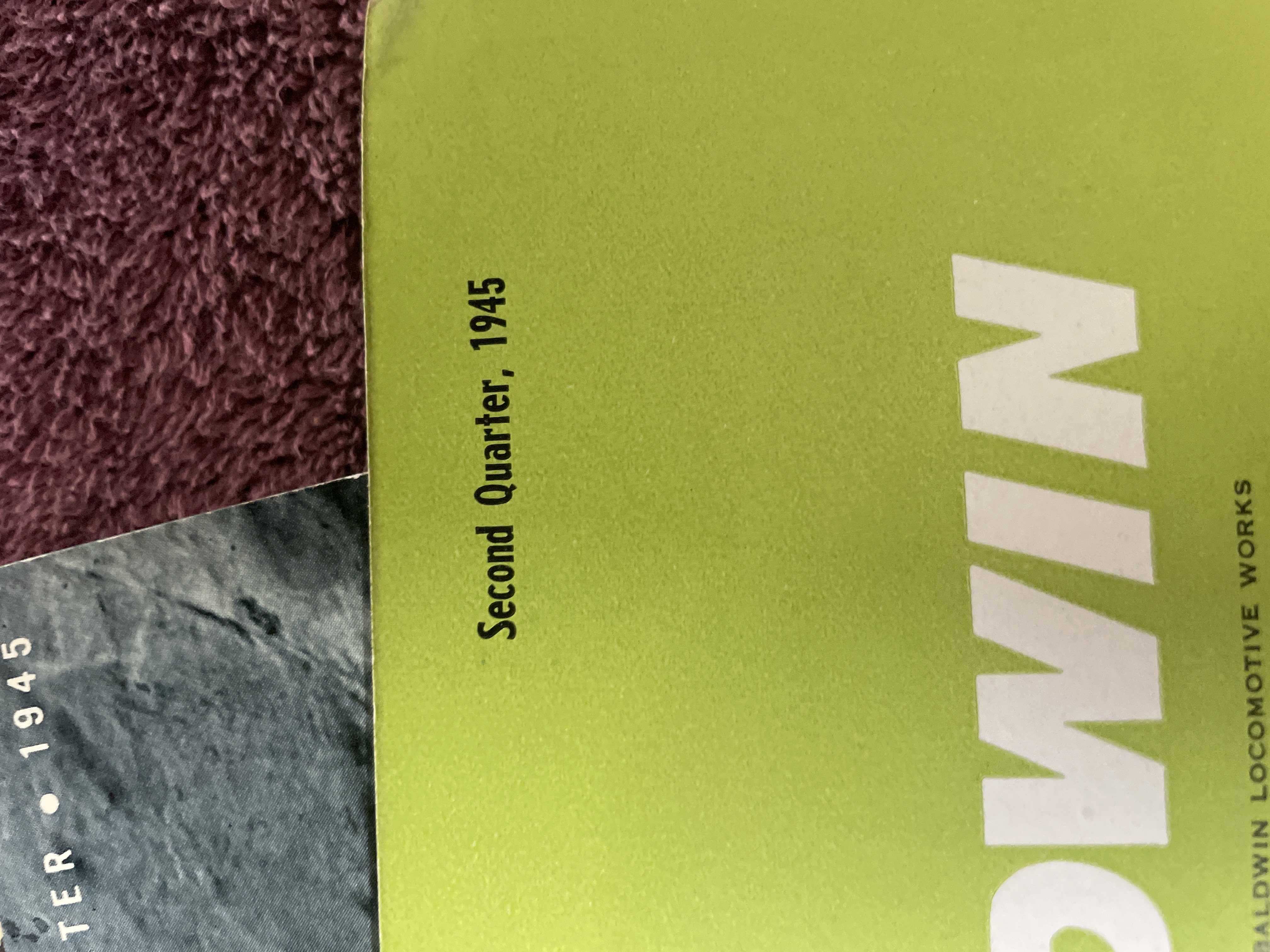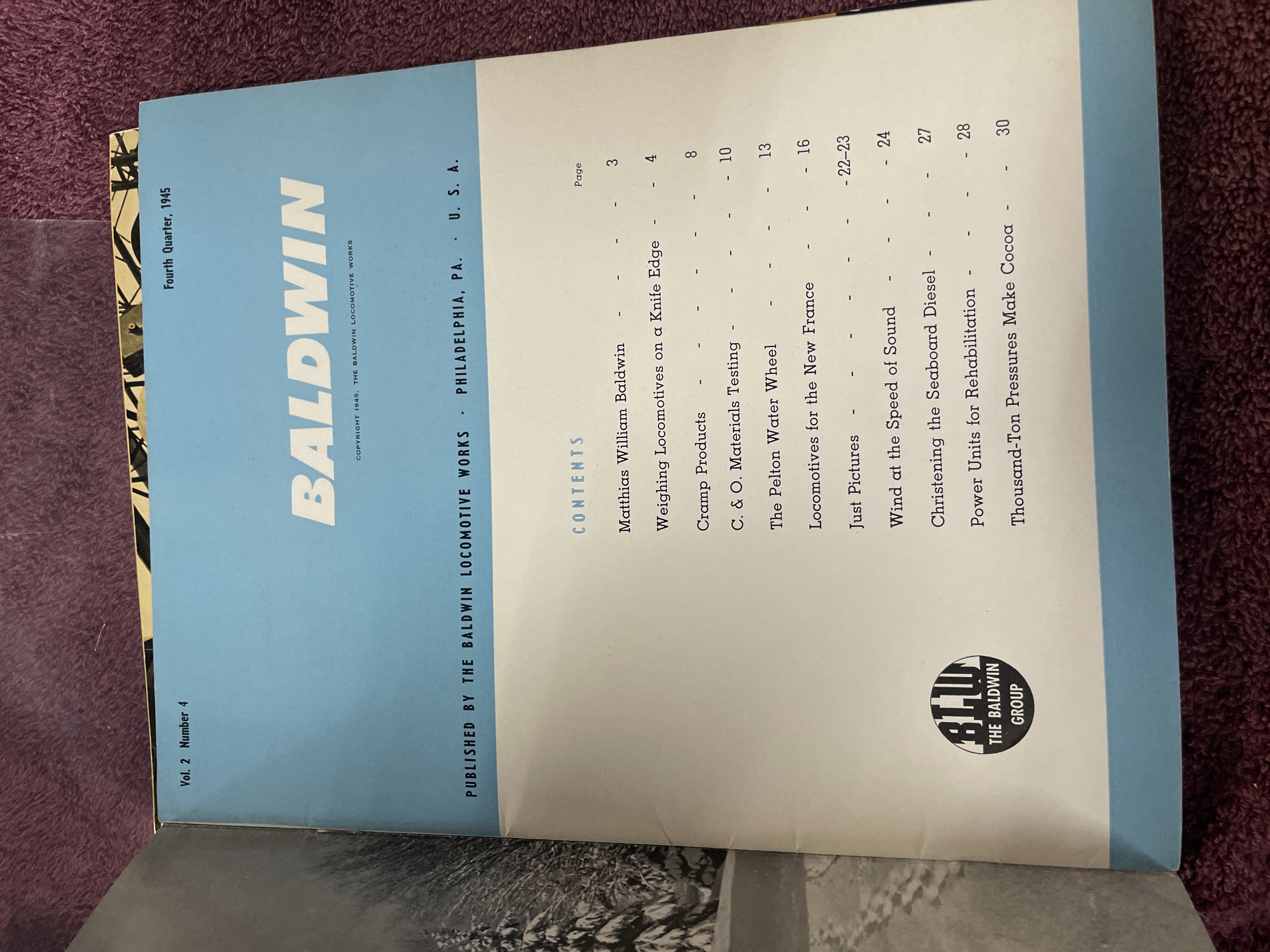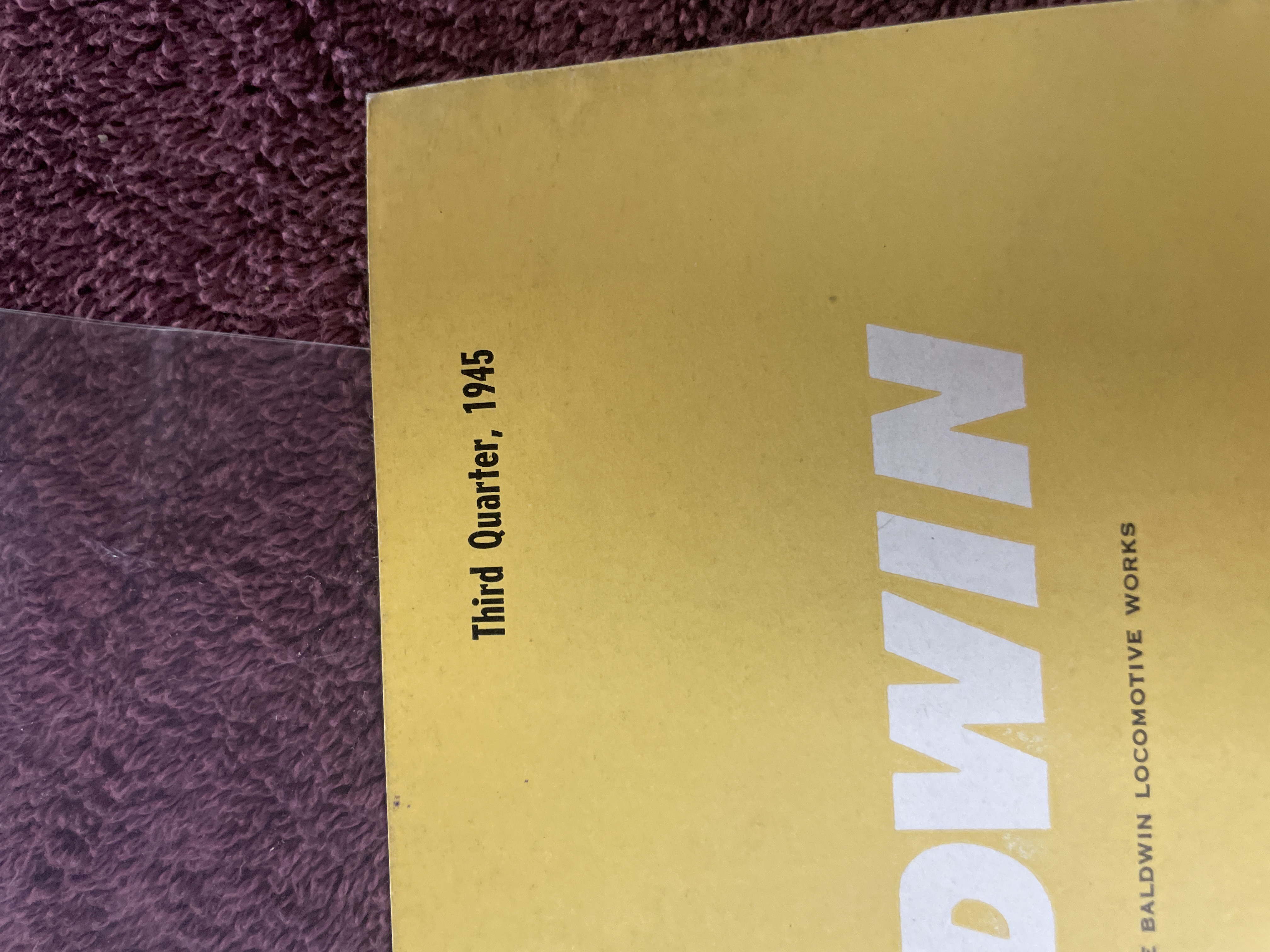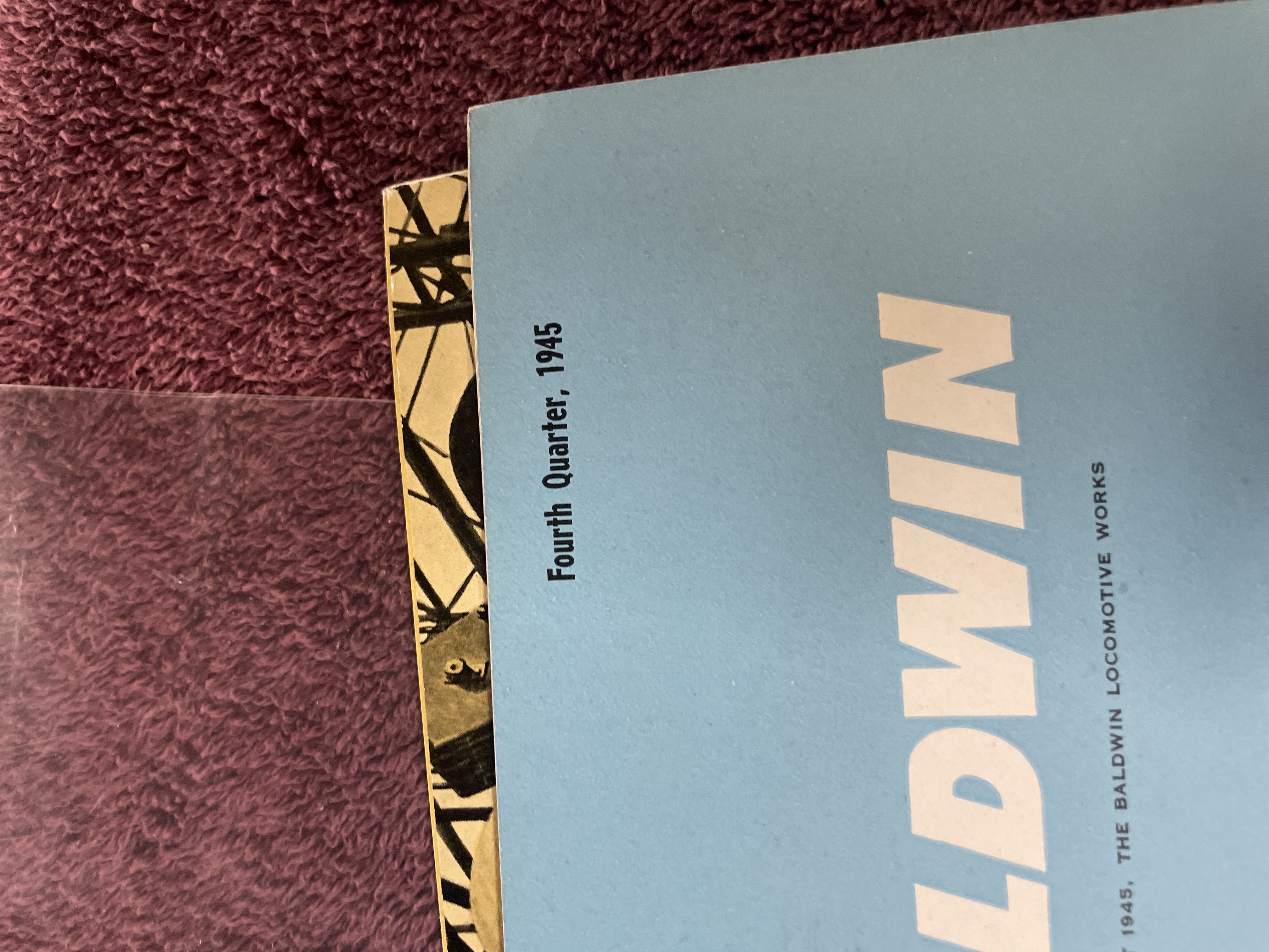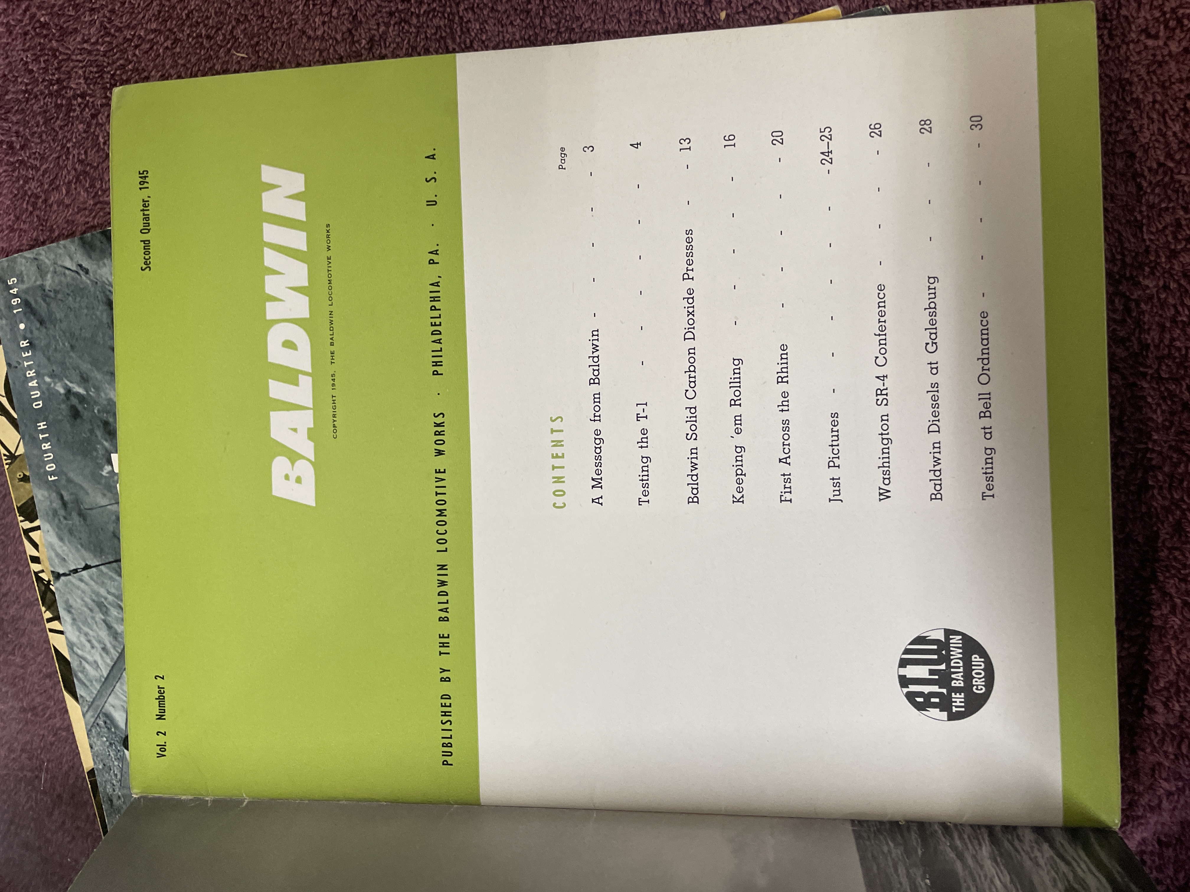 A collection of three vintage softcover periodicals titled BALDWIN, published by The Baldwin Locomotive Works of Philadelphia, Pennsylvania, U. S. A. The magazines are printed paper construction and date entirely from Volume 2, 1945. The collection includes the Second Quarter (No. 2, depicting a streamlined locomotive), the Third Quarter (No. 3, featuring an industrial shipyard scene with a large propeller), and the Fourth Quarter (No. 4, showing a dam or flood control structure). The internal pages detail various industrial products, projects, and engineering topics relevant to the post-war era, including articles on the T-1 locomotive, Baldwin Diesels, and hydraulic projects.