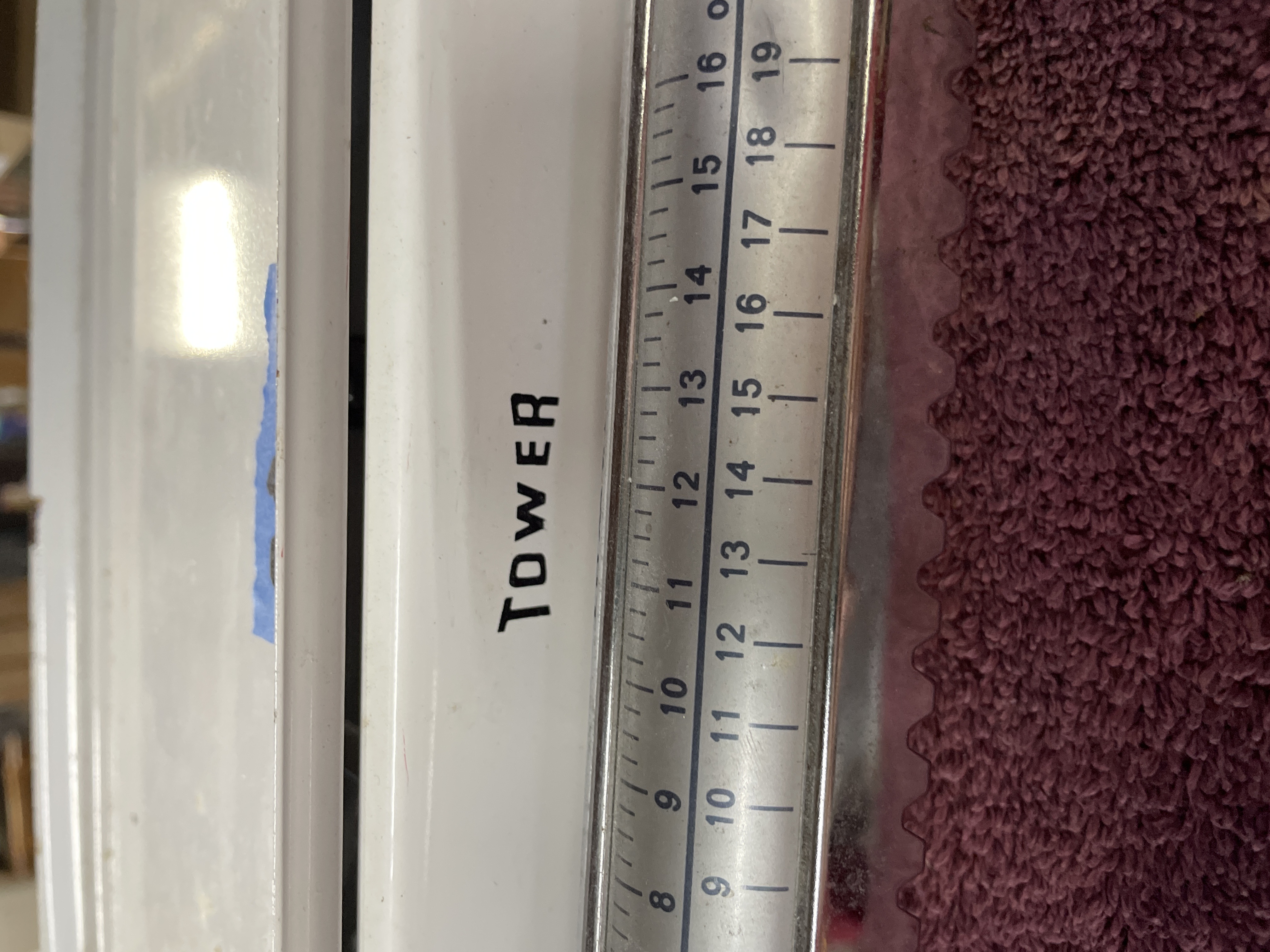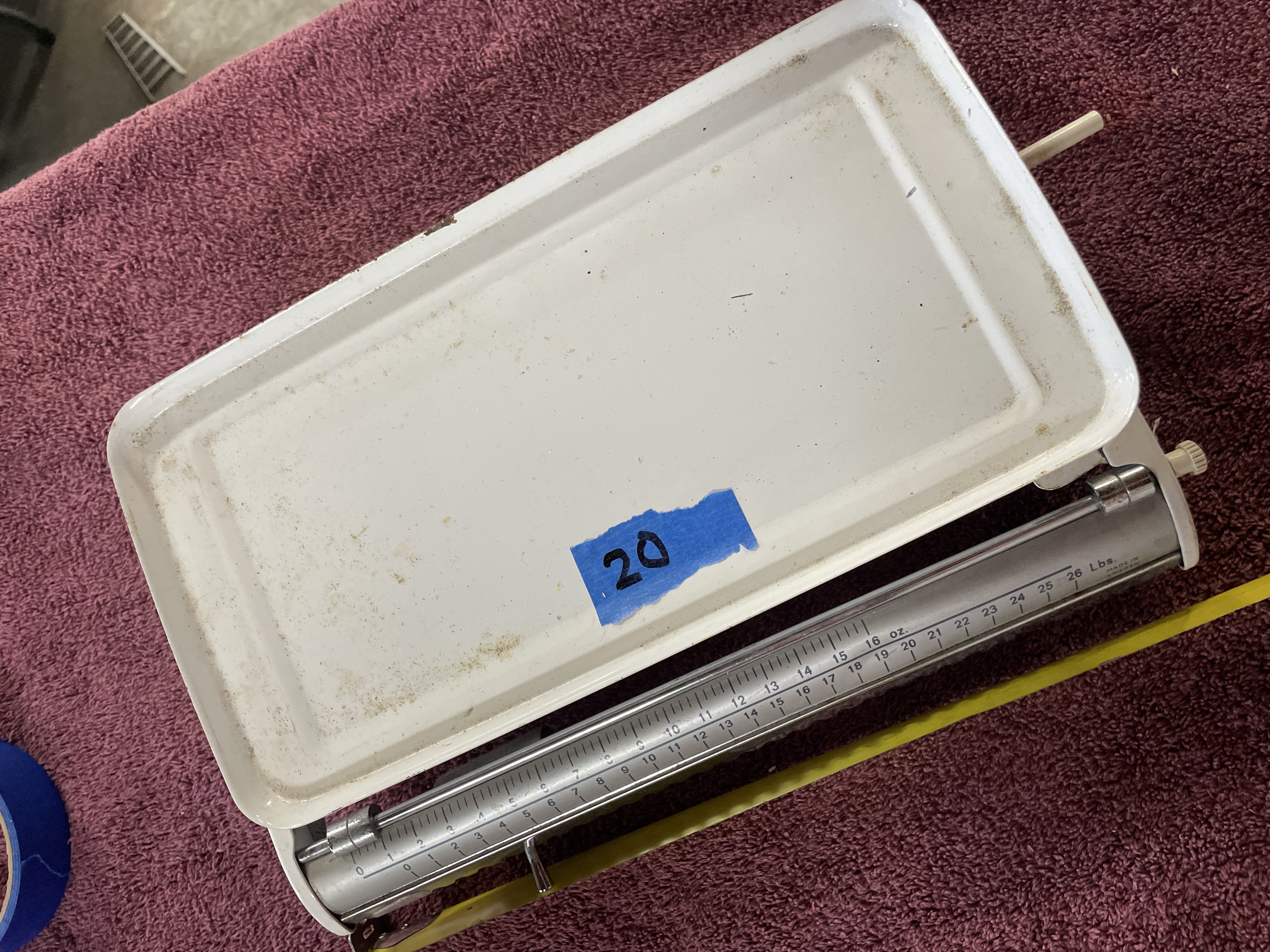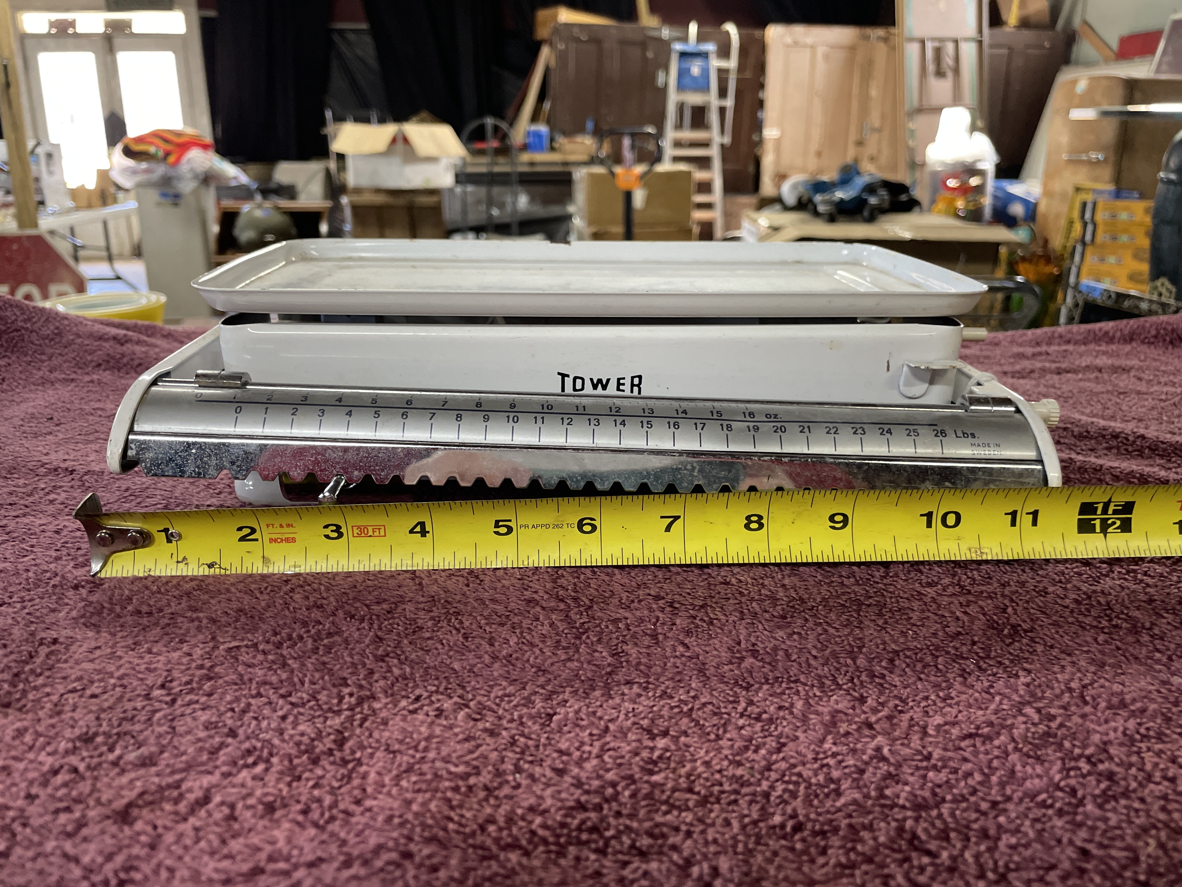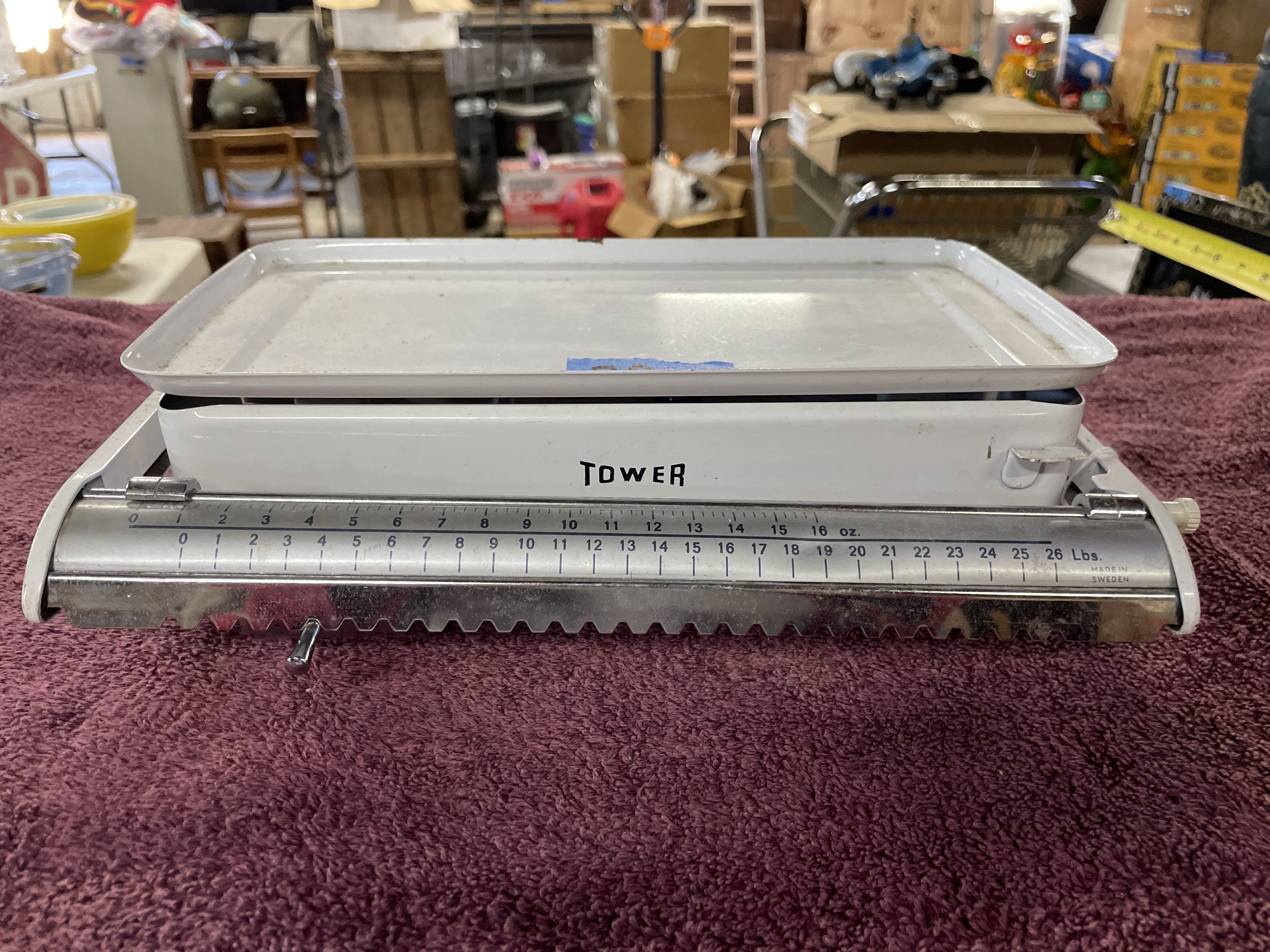 A vintage mechanical counter scale manufactured by Tower, featuring a rectangular body constructed of white enameled metal. The scale includes a removable top weighing tray. The weighing mechanism is exposed along the front, utilizing a polished metal roller bar calibrated to measure weight up to 26 Lbs. The scale displays measurements in both ounce (oz.) and pound (Lbs.) increments. Visible markings include the brand name TOWER prominently displayed on the front face, and the country of origin inscription MADE IN SWEDEN located near the base of the measuring bar.