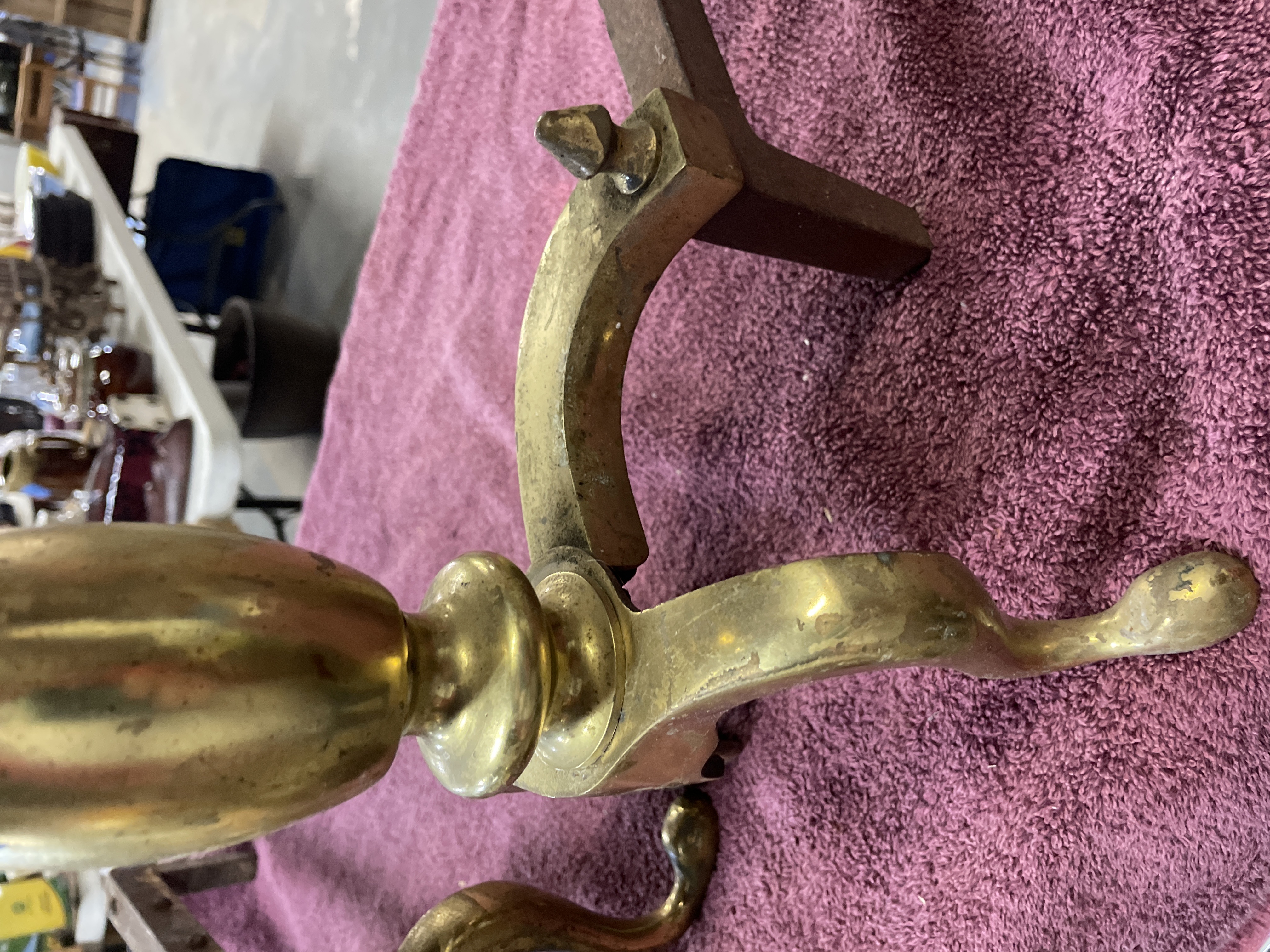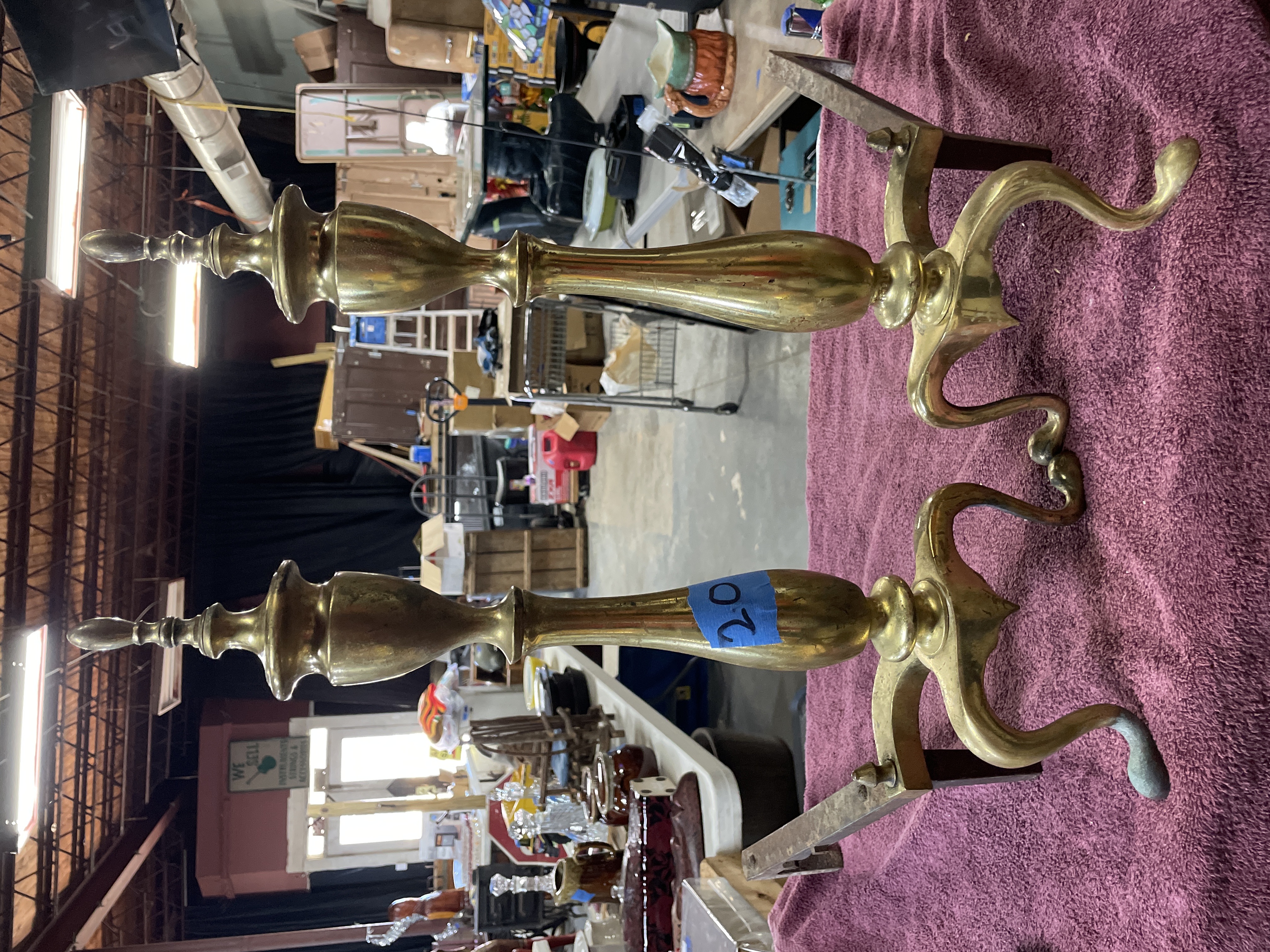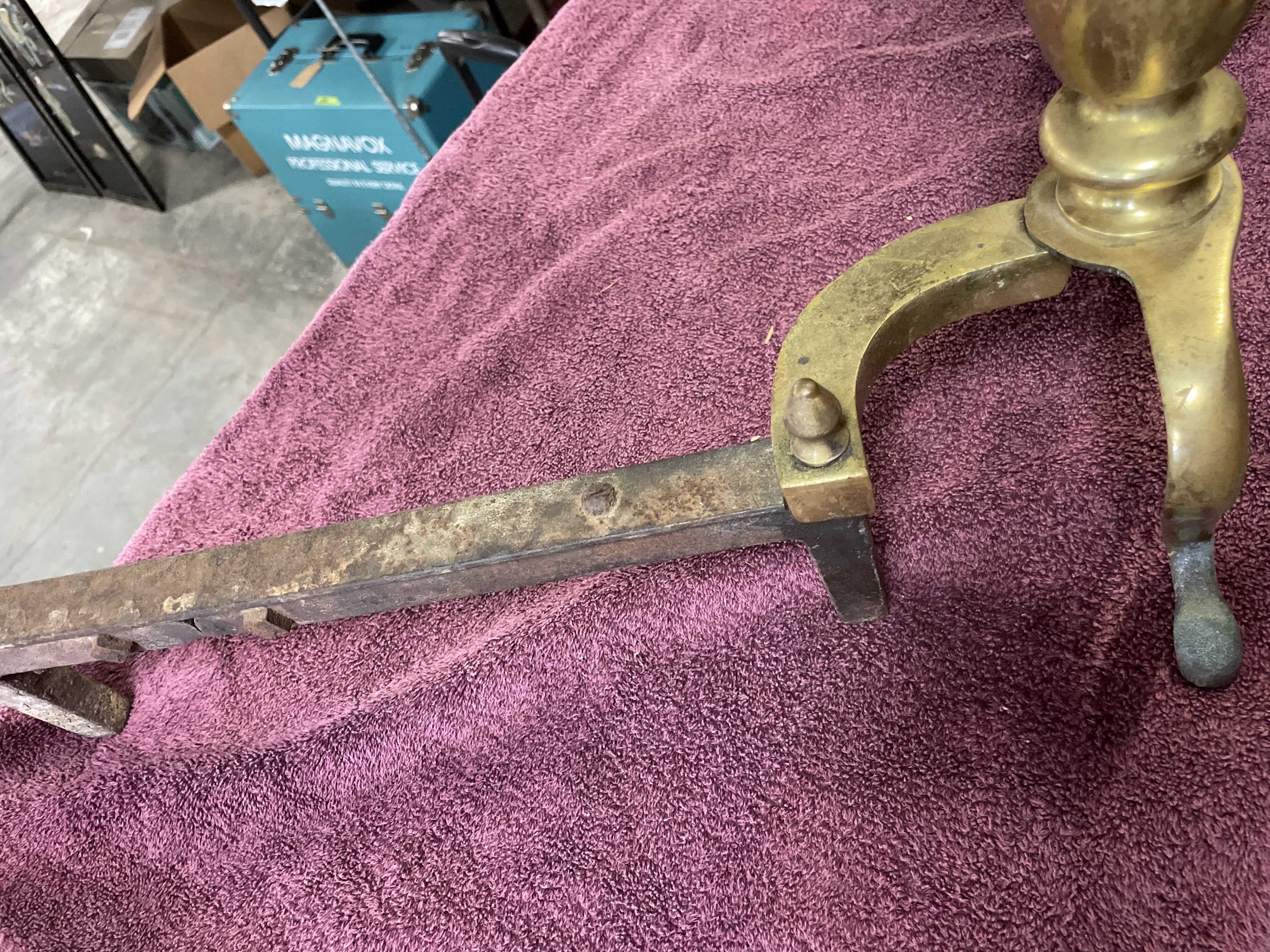 A pair of Federal Style fireplace andirons combining decorative brass standards with functional cast iron log supports. The vertical standards are constructed of multiple cast and spun brass sections, featuring a columnar body rising to a tapered finial. The base is supported by three scrolled, cabriole-style feet. The horizontal log supports are constructed of thick, unpolished ferrous metal, attached to the brass base. Visible marking includes a blue handwritten sticker adhered to the left andiron marked 20.