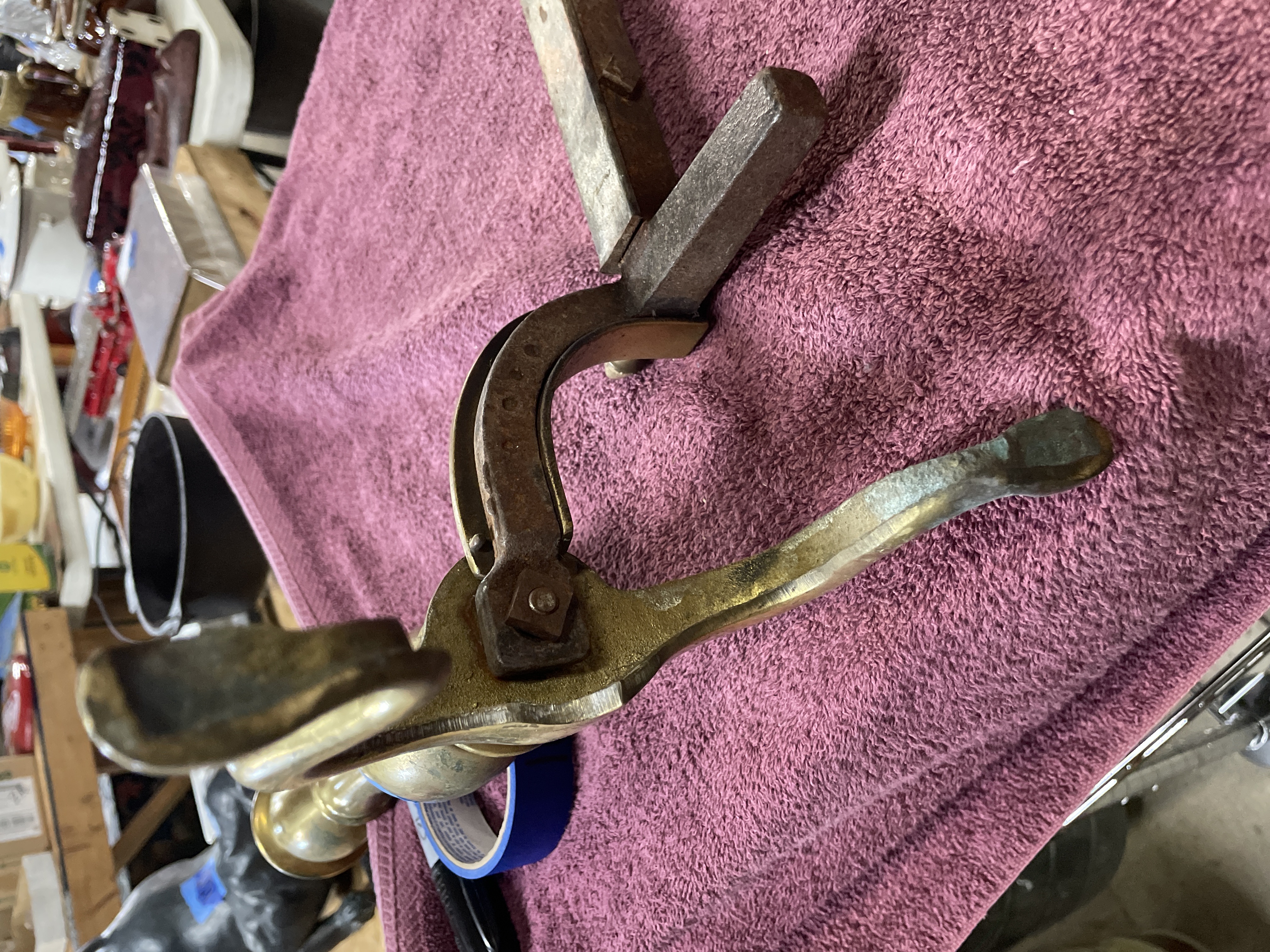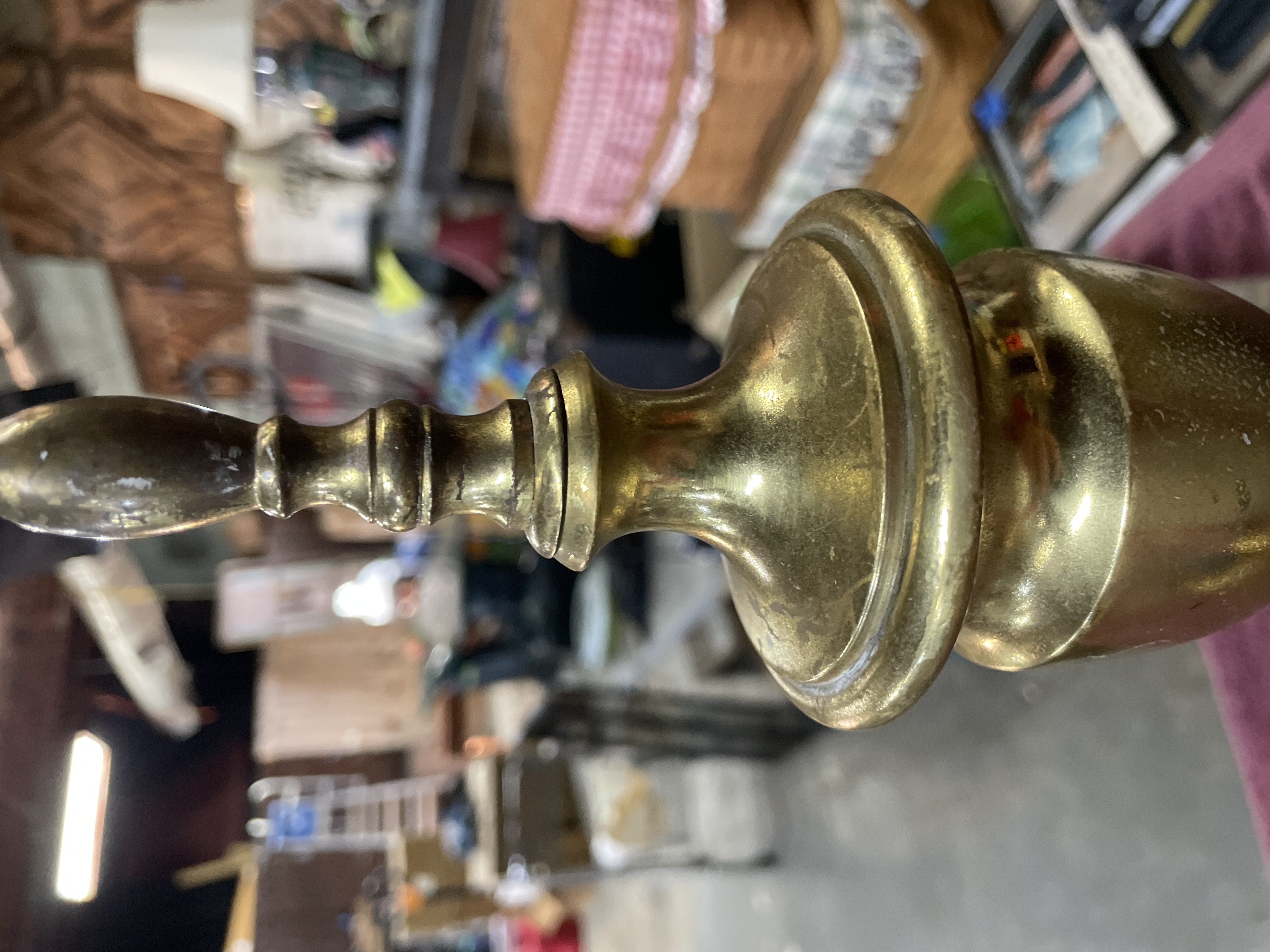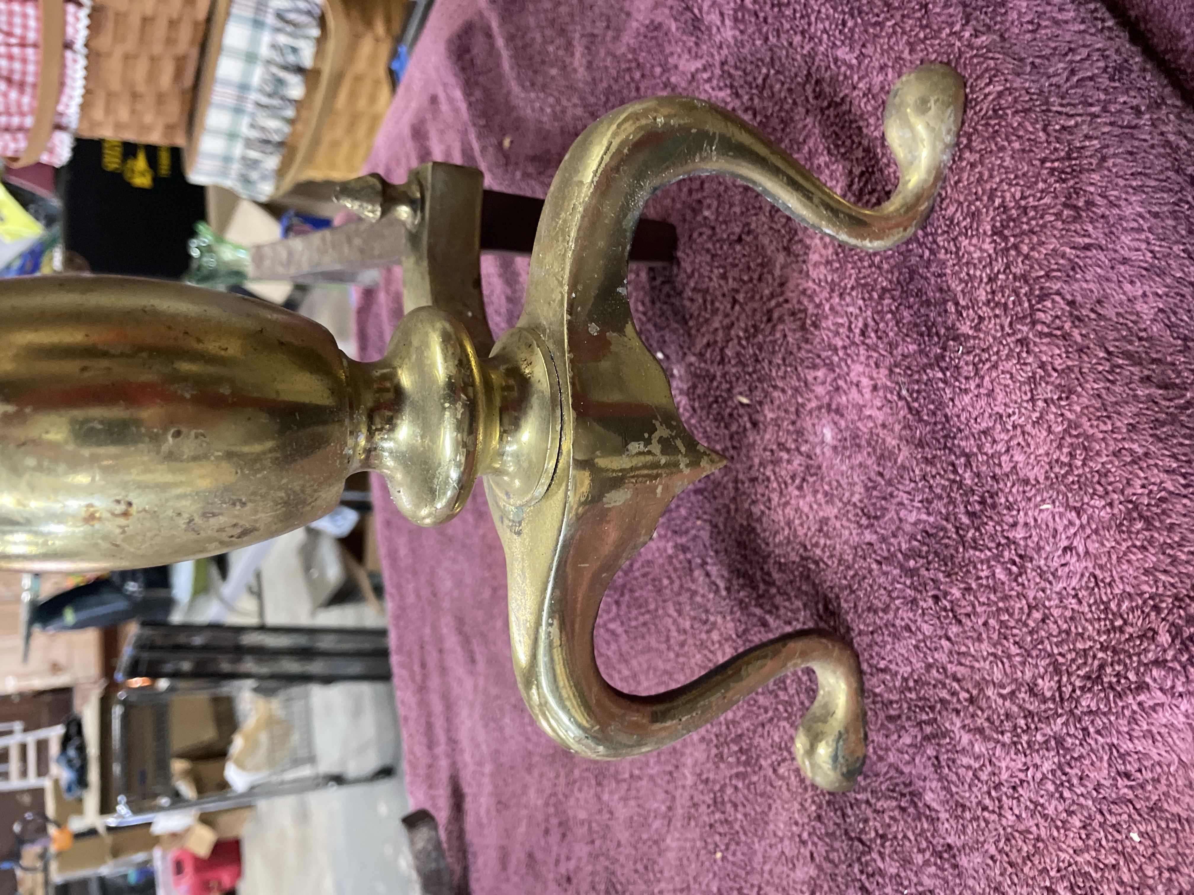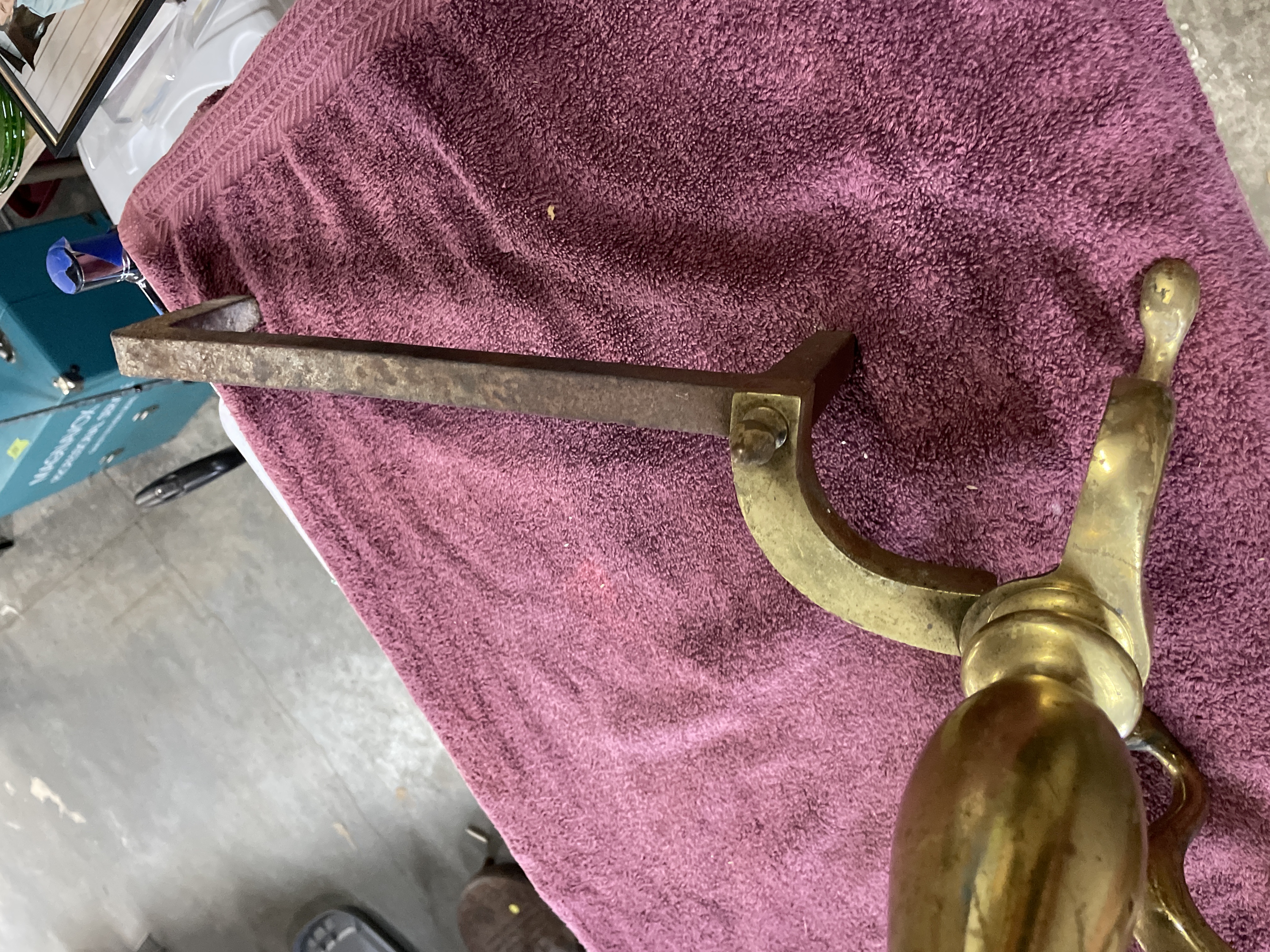 A pair of Federal Style fireplace andirons combining decorative brass standards with functional cast iron log supports. The vertical standards are constructed of multiple cast and spun brass sections, featuring a columnar body rising to a tapered finial. The base is supported by three scrolled, cabriole-style feet. The horizontal log supports are constructed of thick, unpolished ferrous metal, attached to the brass base. Visible marking includes a blue handwritten sticker adhered to the left andiron marked 20.