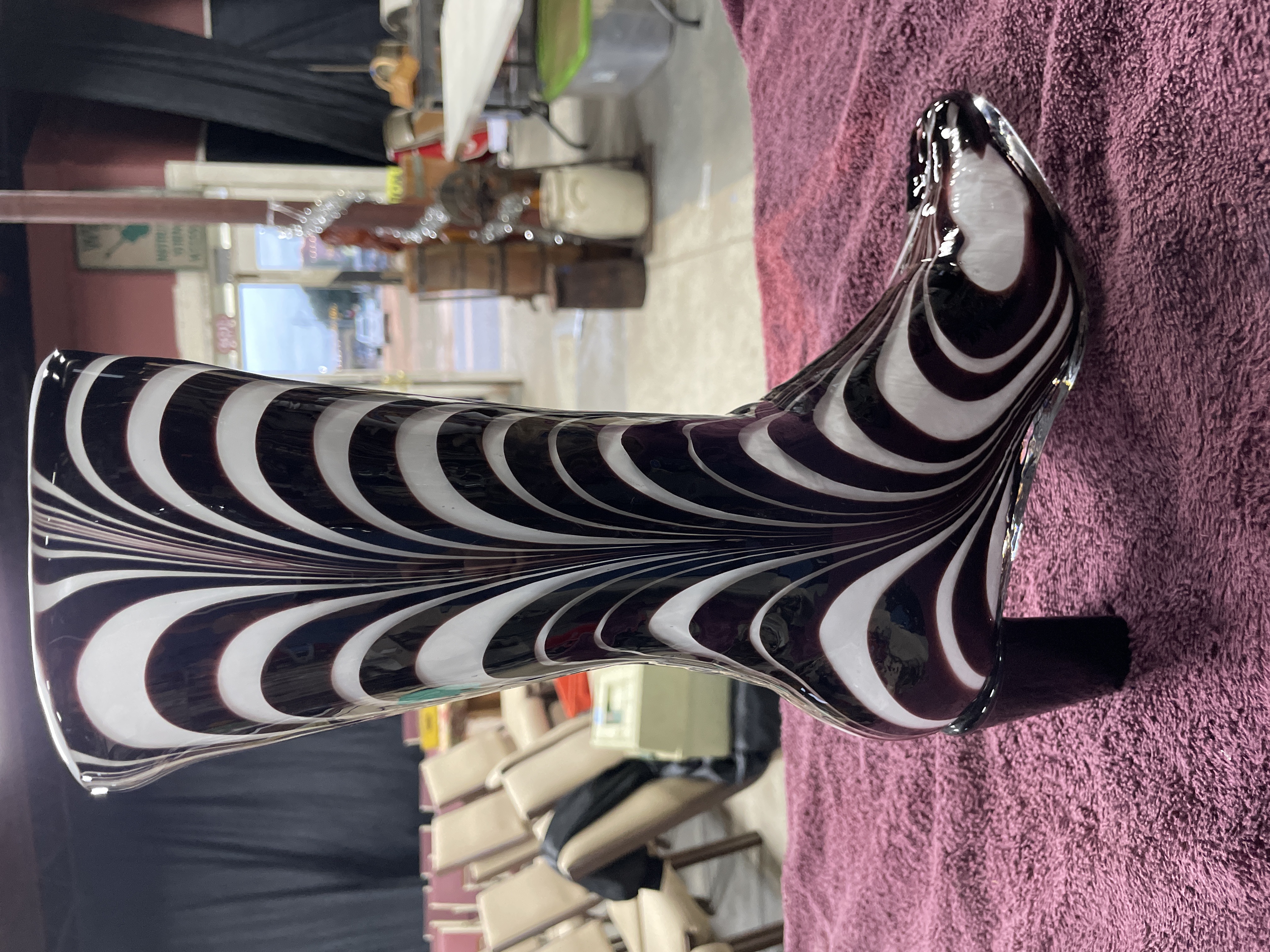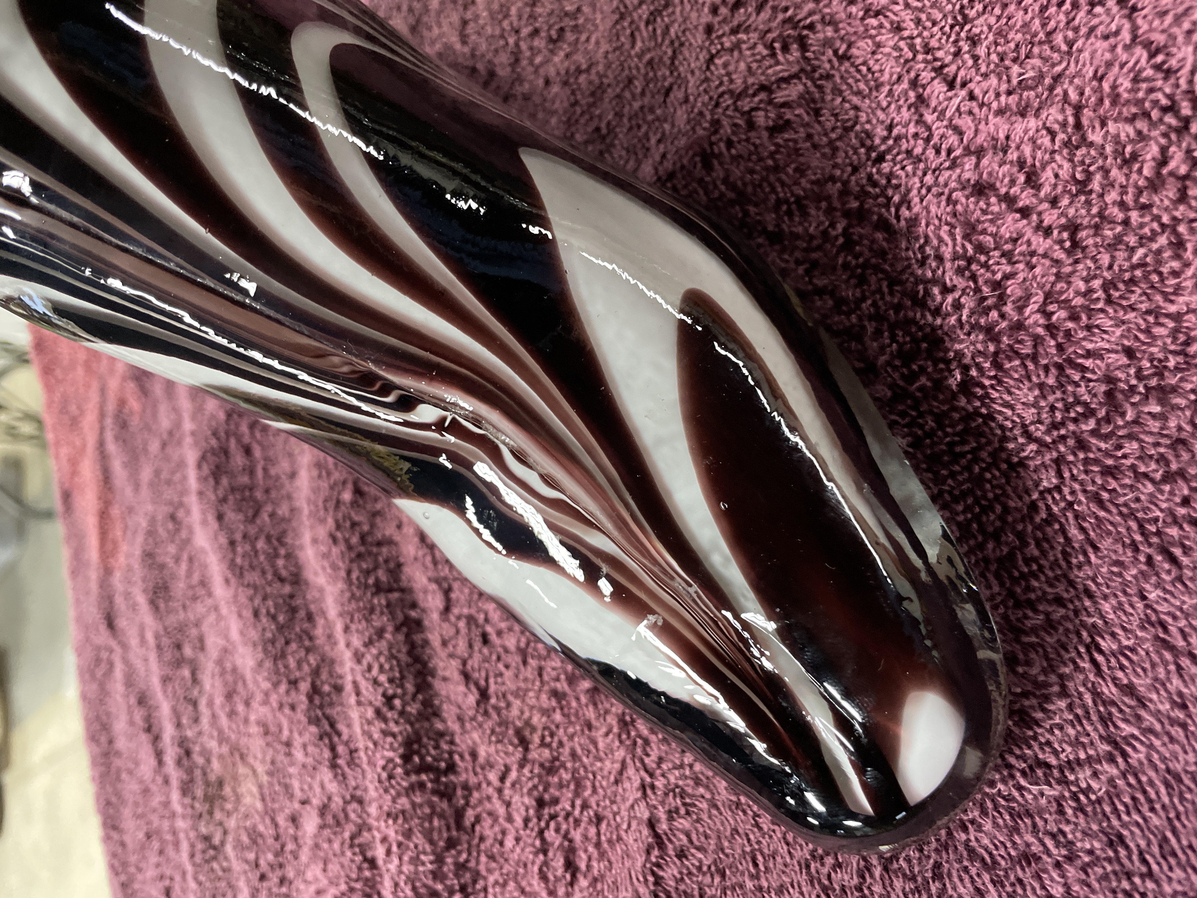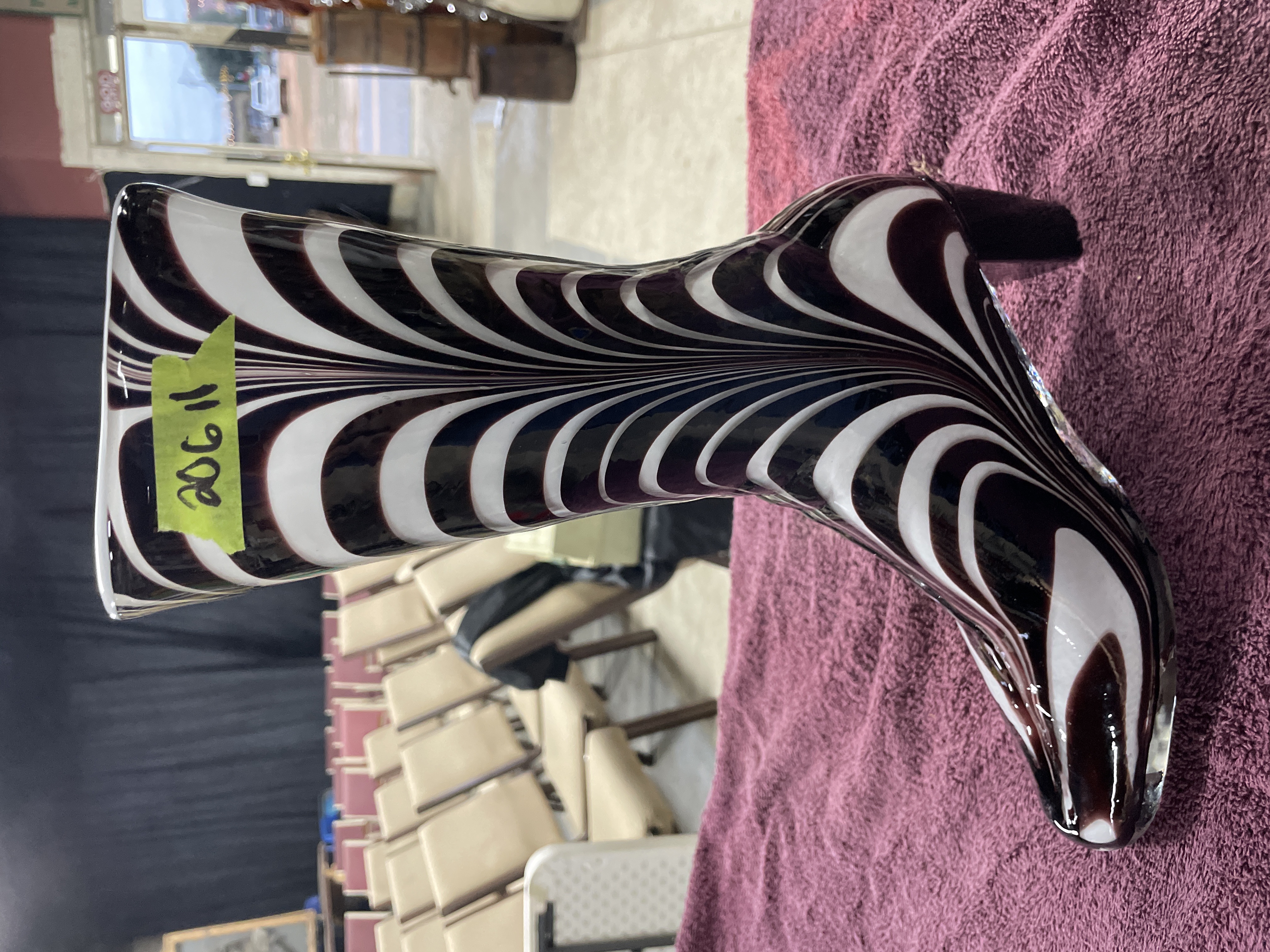 A single decorative sculpture or vase attributed to Murano, Italy, dating to the Mid-Century Modern period. The piece is crafted from hand-blown glass and formed in the shape of a high-heeled fashion boot. The body features a striking vertical swirling pattern, reminiscent of Op Art or Martele techniques, executed in opaque white and a deep, glossy reddish-brown/black coloration. The sole and toe section are formed from clear glass, and the block heel is solid dark glass. A yellow adhesive auction label reading 206 11 is affixed to the upper shaft.