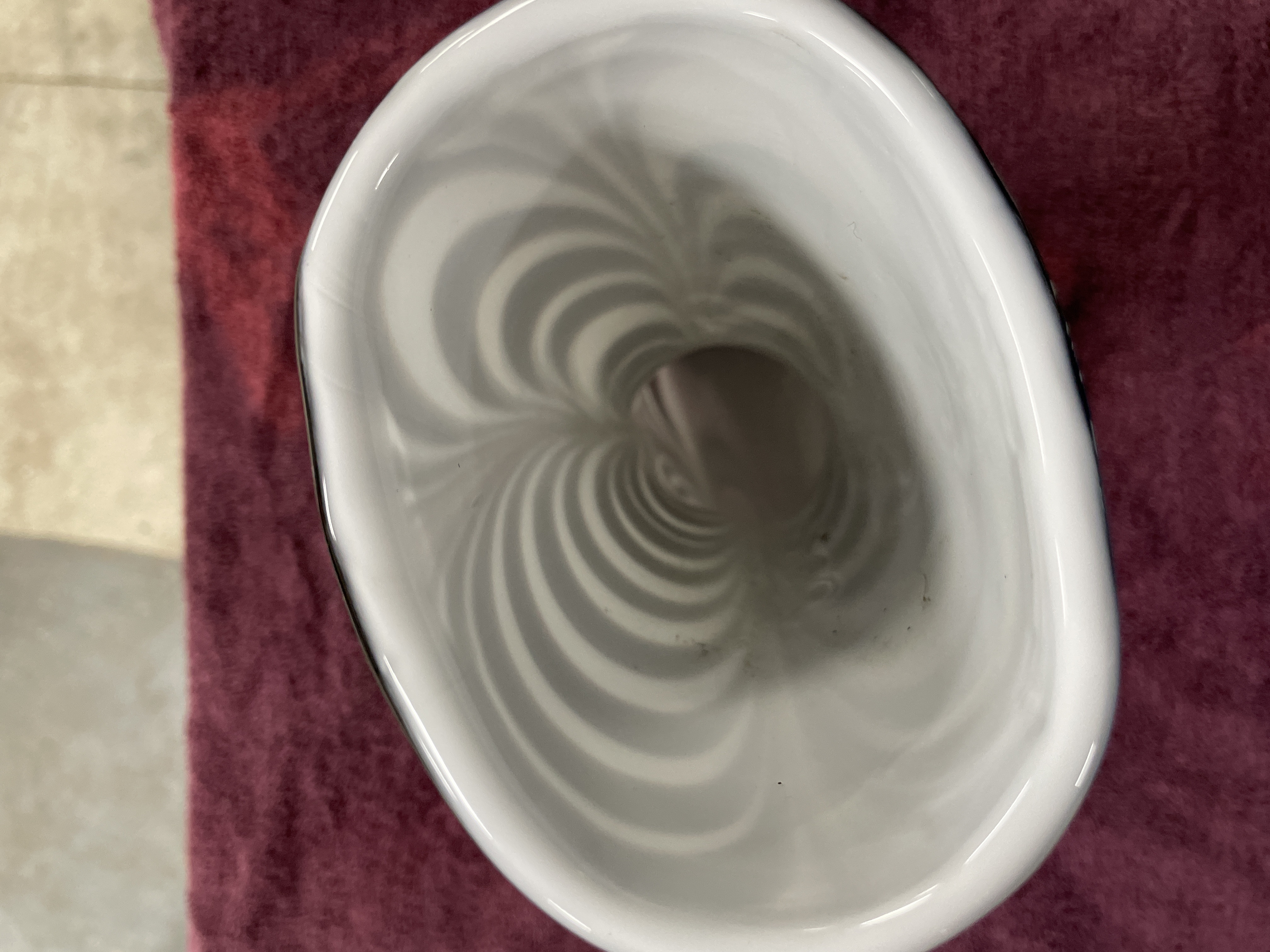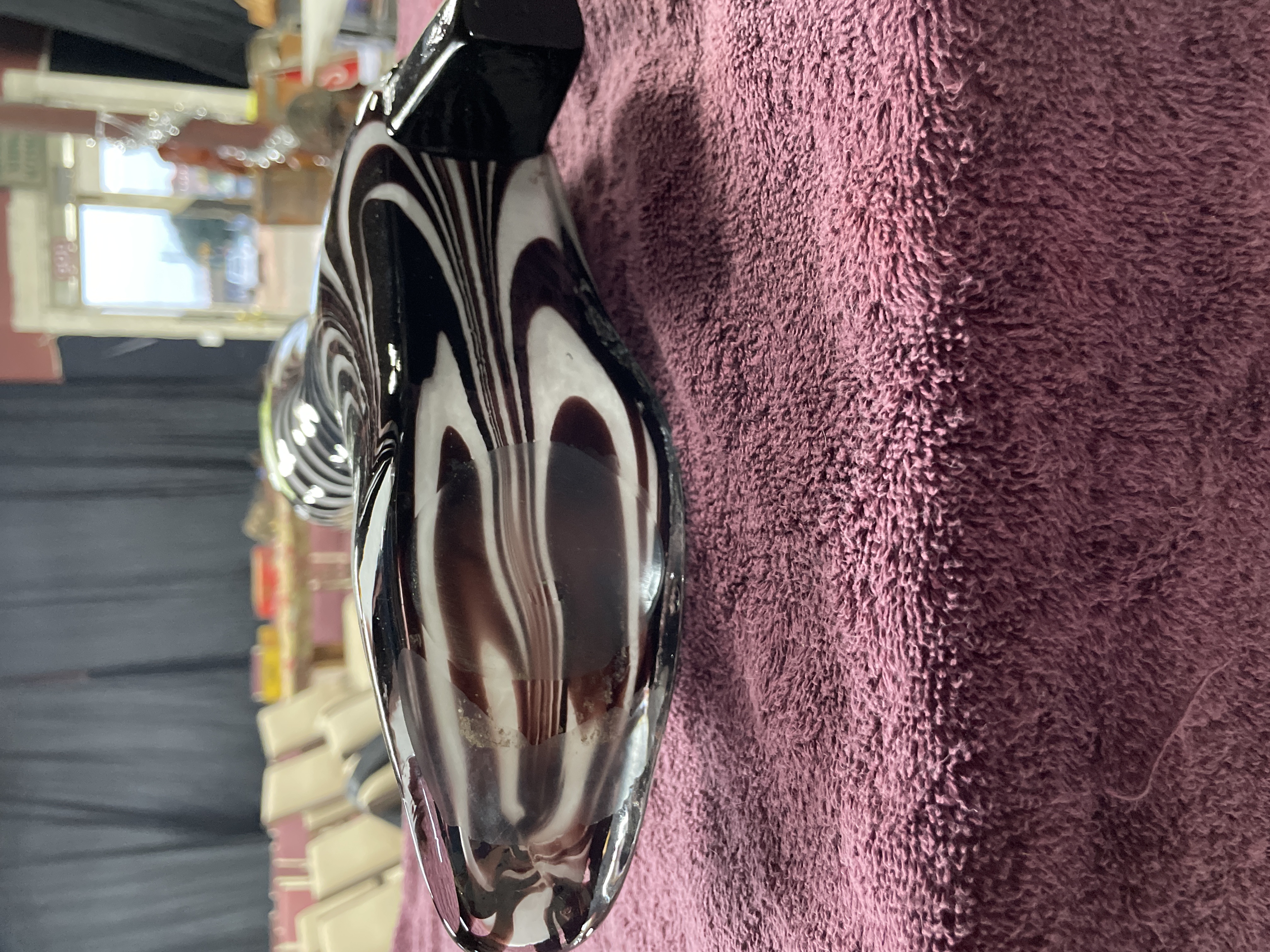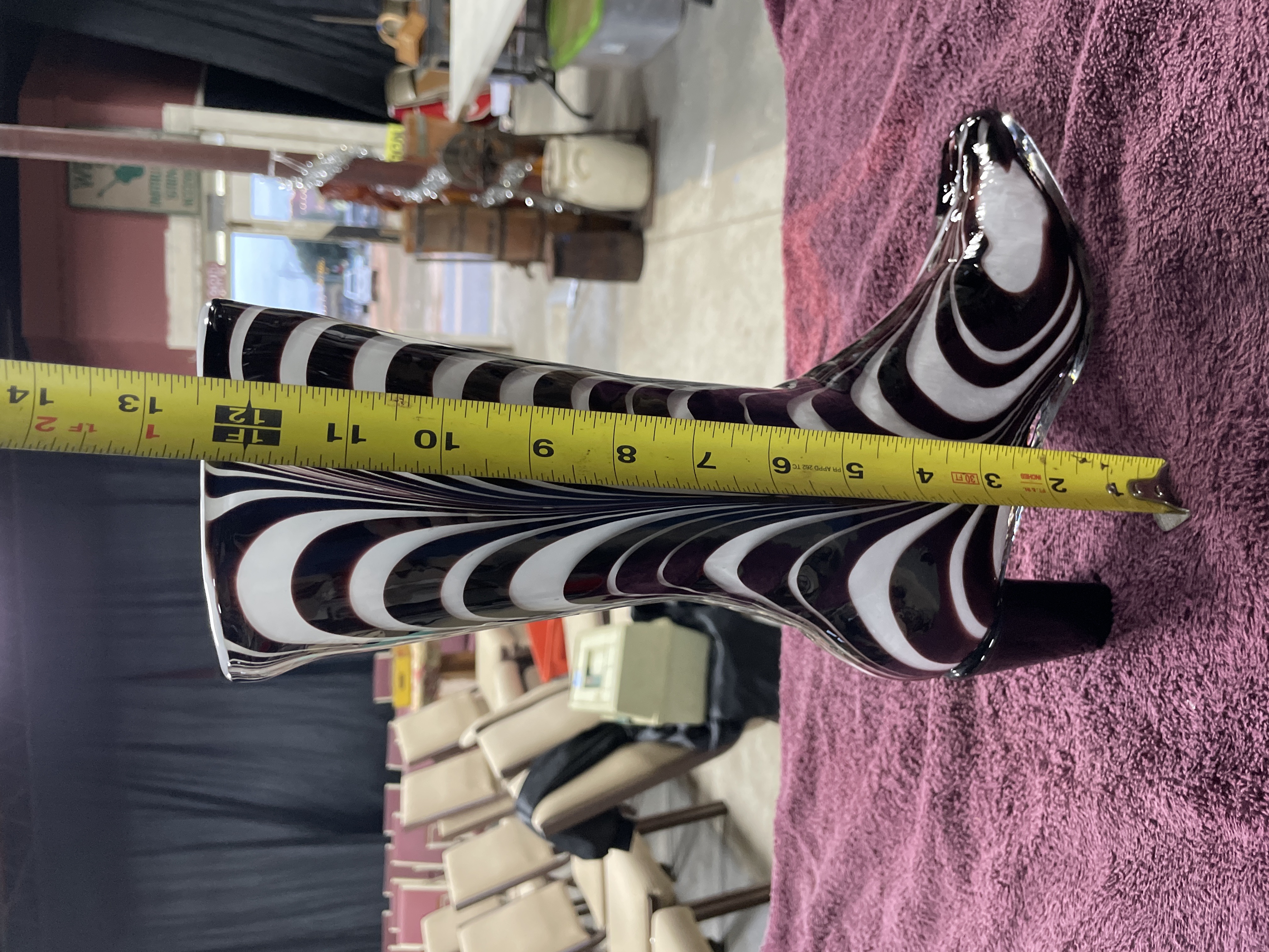 A single decorative sculpture or vase attributed to Murano, Italy, dating to the Mid-Century Modern period. The piece is crafted from hand-blown glass and formed in the shape of a high-heeled fashion boot. The body features a striking vertical swirling pattern, reminiscent of Op Art or Martele techniques, executed in opaque white and a deep, glossy reddish-brown/black coloration. The sole and toe section are formed from clear glass, and the block heel is solid dark glass. A yellow adhesive auction label reading 206 11 is affixed to the upper shaft.