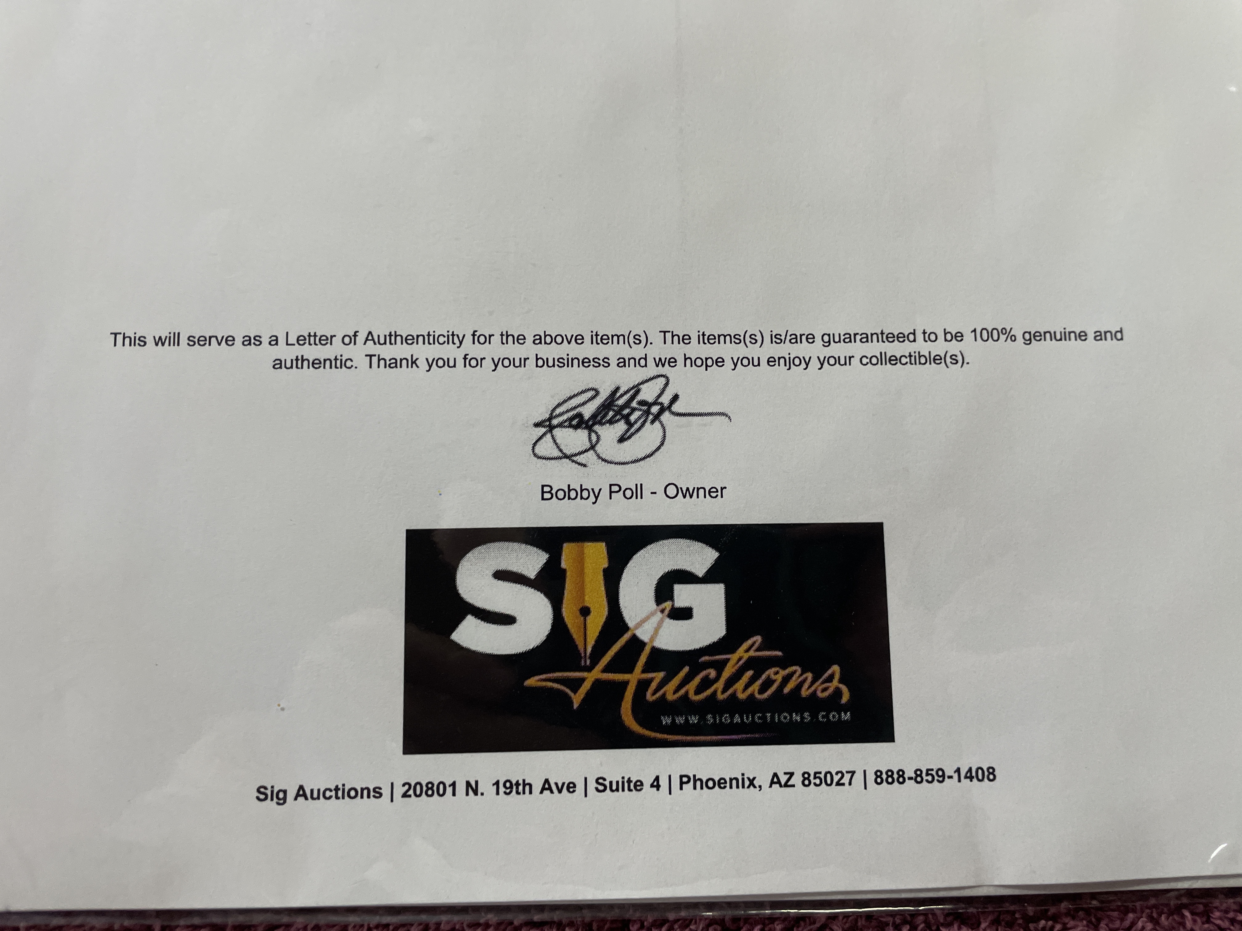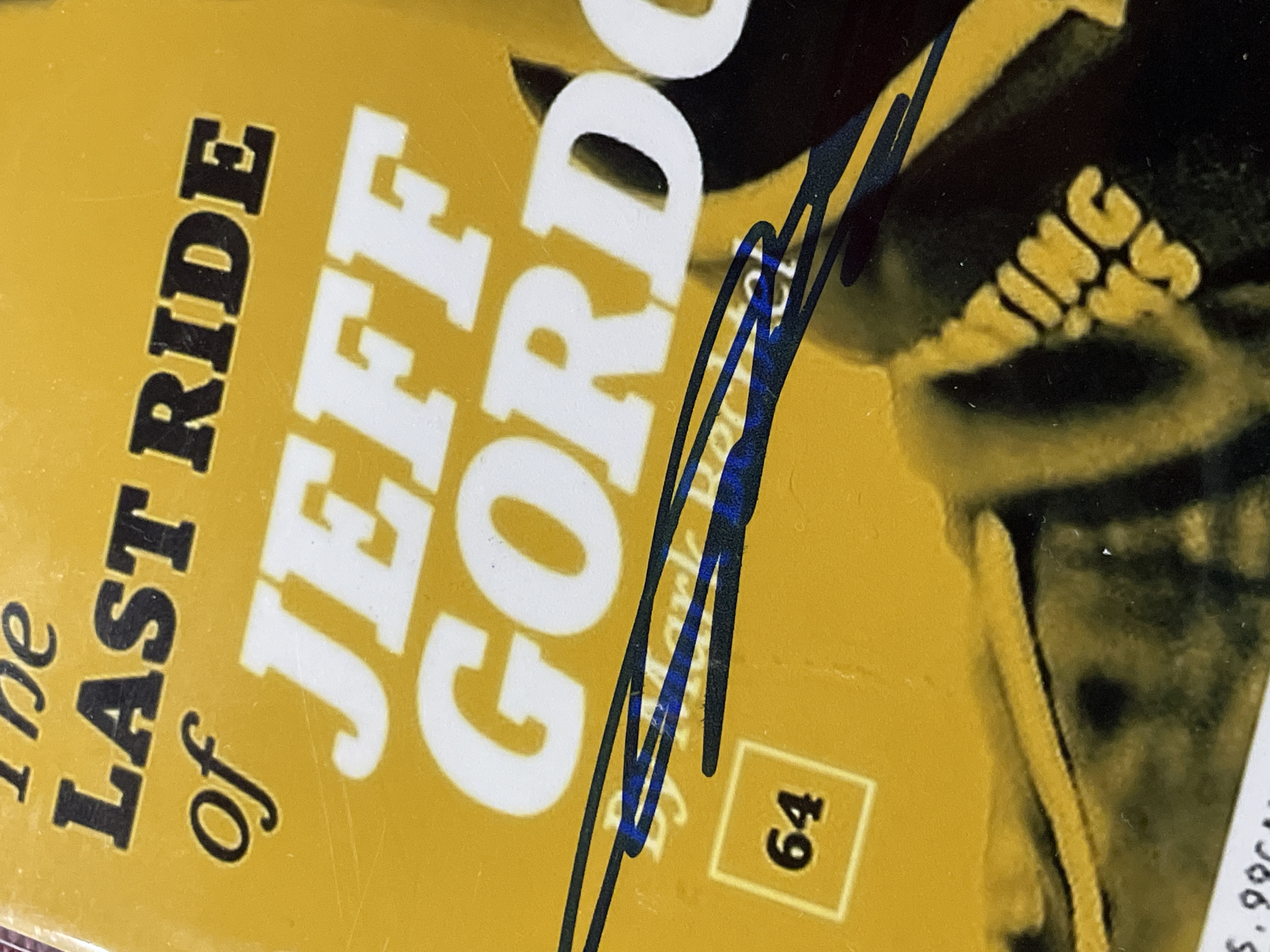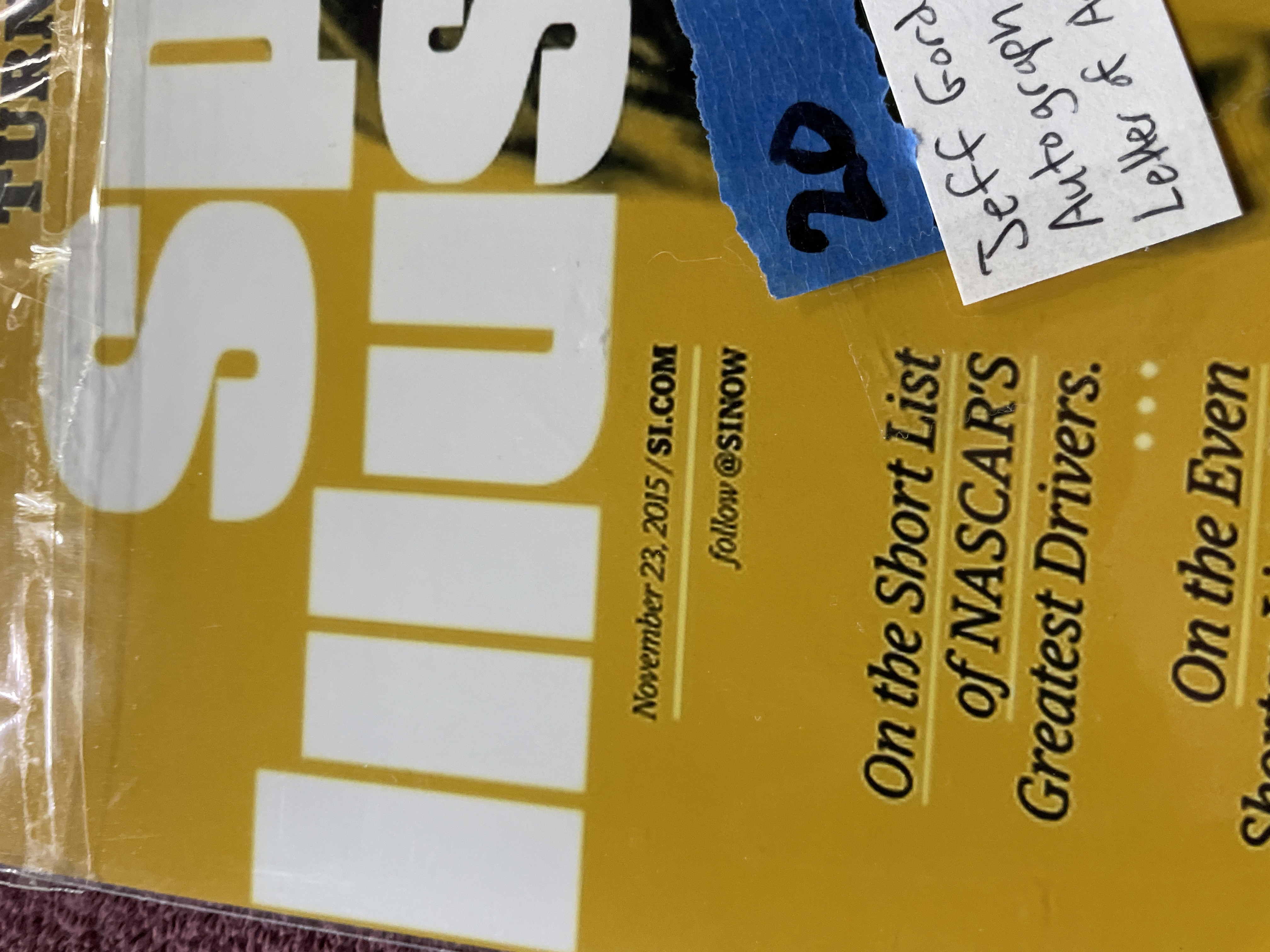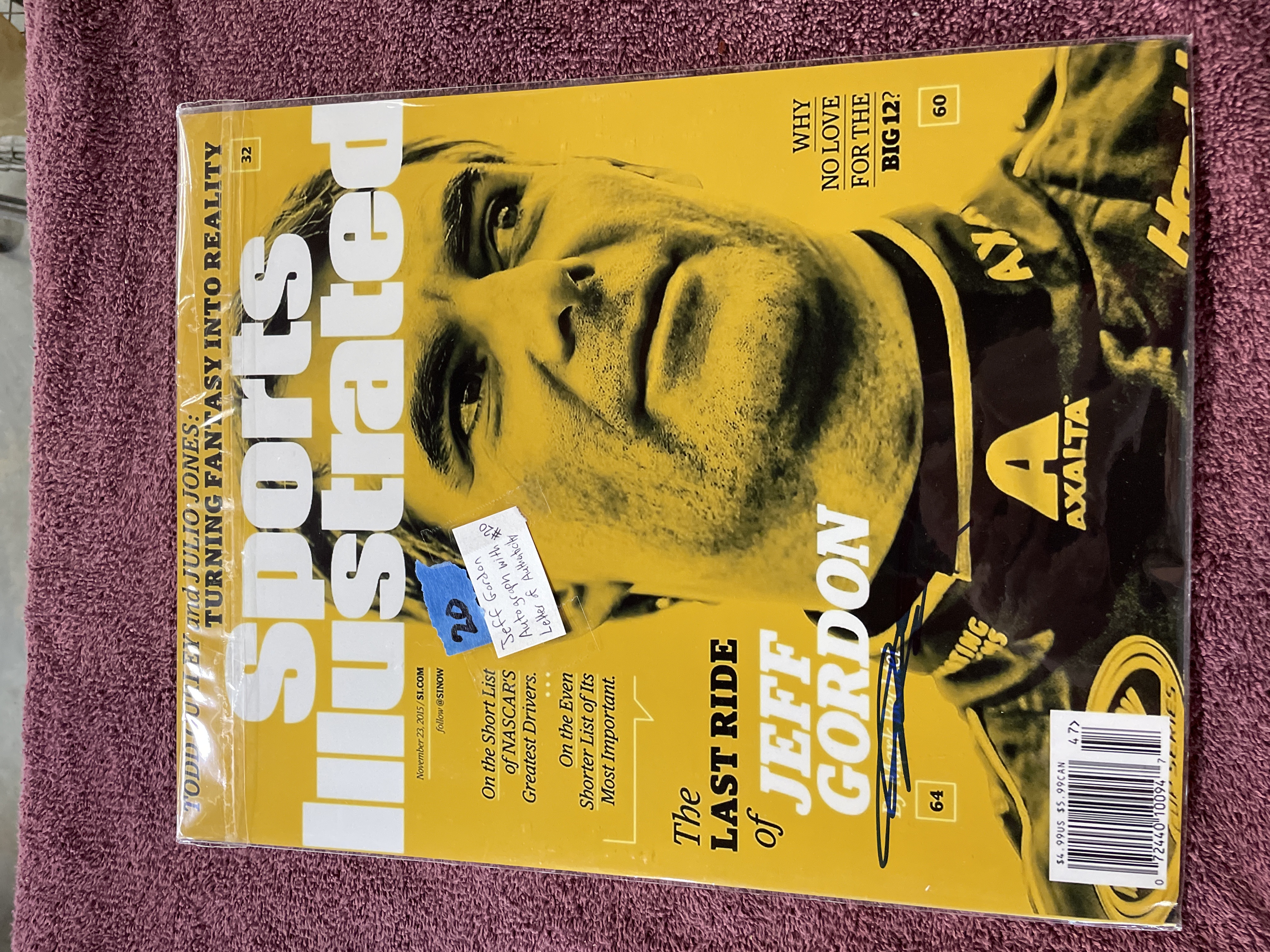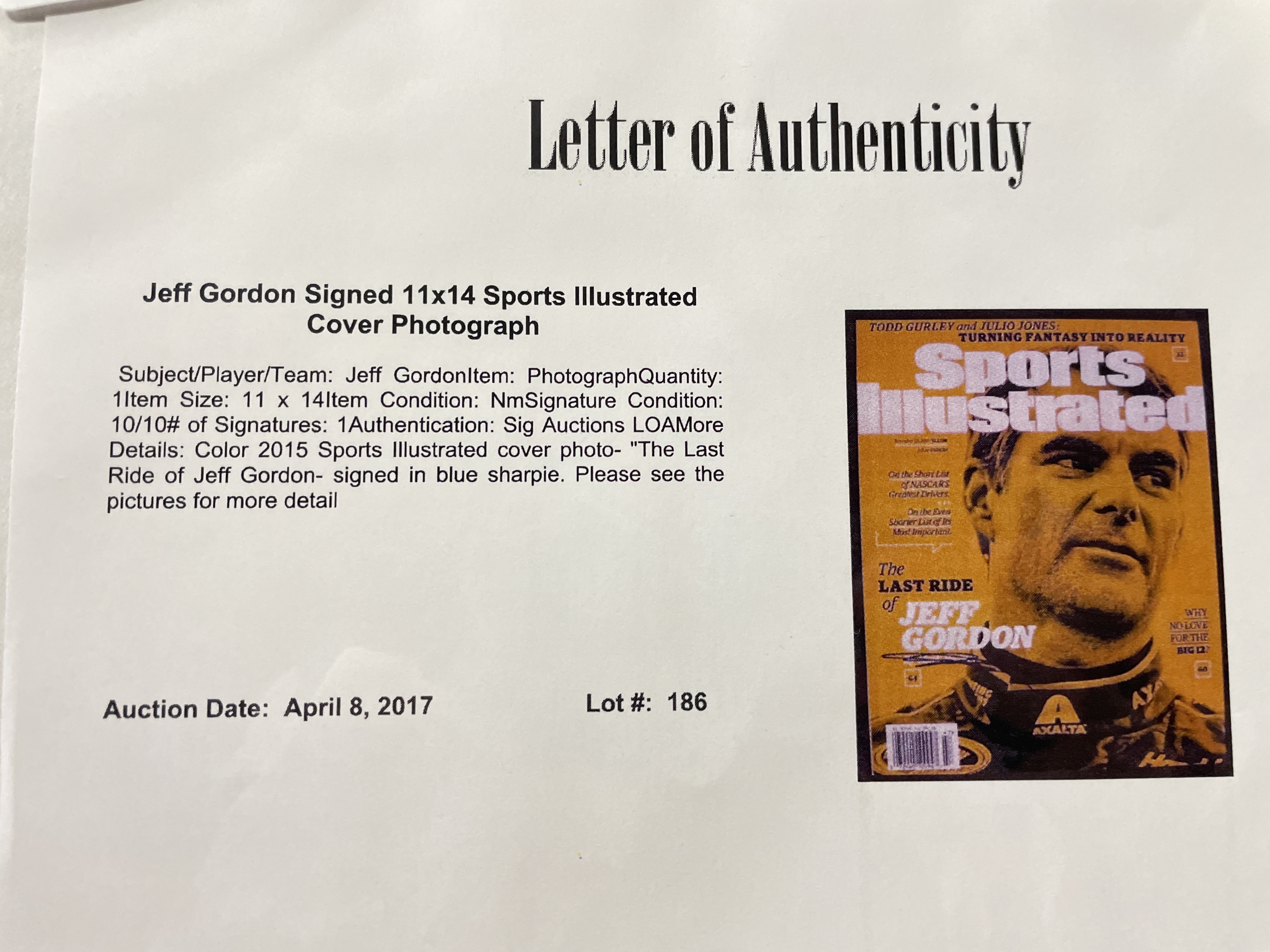 A single collectible lot featuring an autographed copy of the Sports Illustrated magazine, dated November 23, 2015. The cover features NASCAR driver Jeff Gordon under the headline The Last Ride of Jeff Gordon. The cover is hand-signed by Jeff Gordon in blue sharpie across the title text. The lot includes a Letter of Authenticity (LOA) issued by Sig Auctions, dated April 8, 2017. The LOA identifies the item as a Jeff Gordon Signed 11×14 Sports Illustrated Cover Photograph, bearing the signature of Bobby Poll, Owner, and marked with internal Lot #186 and inventory stickers #2933 and RLG 19452.