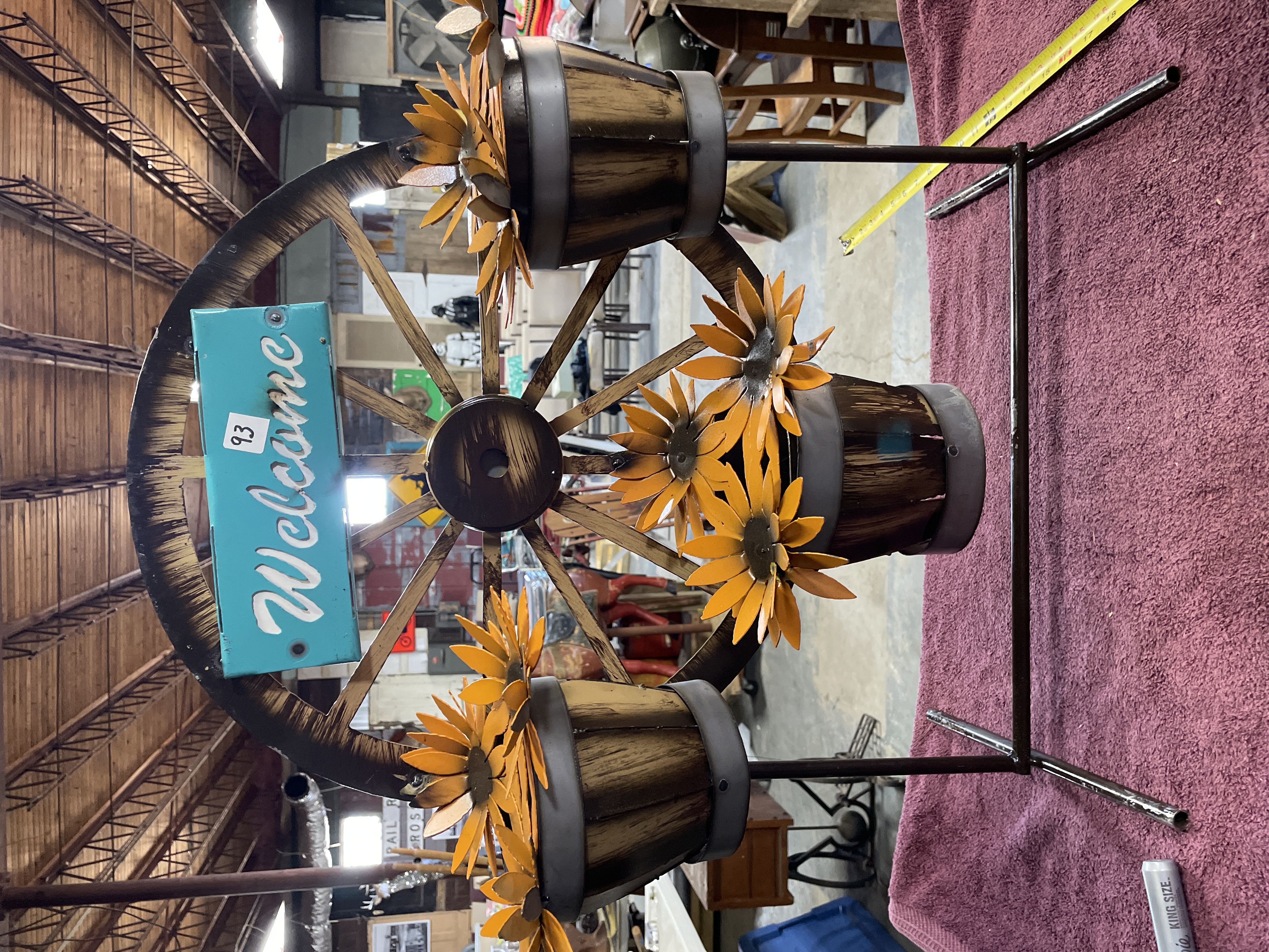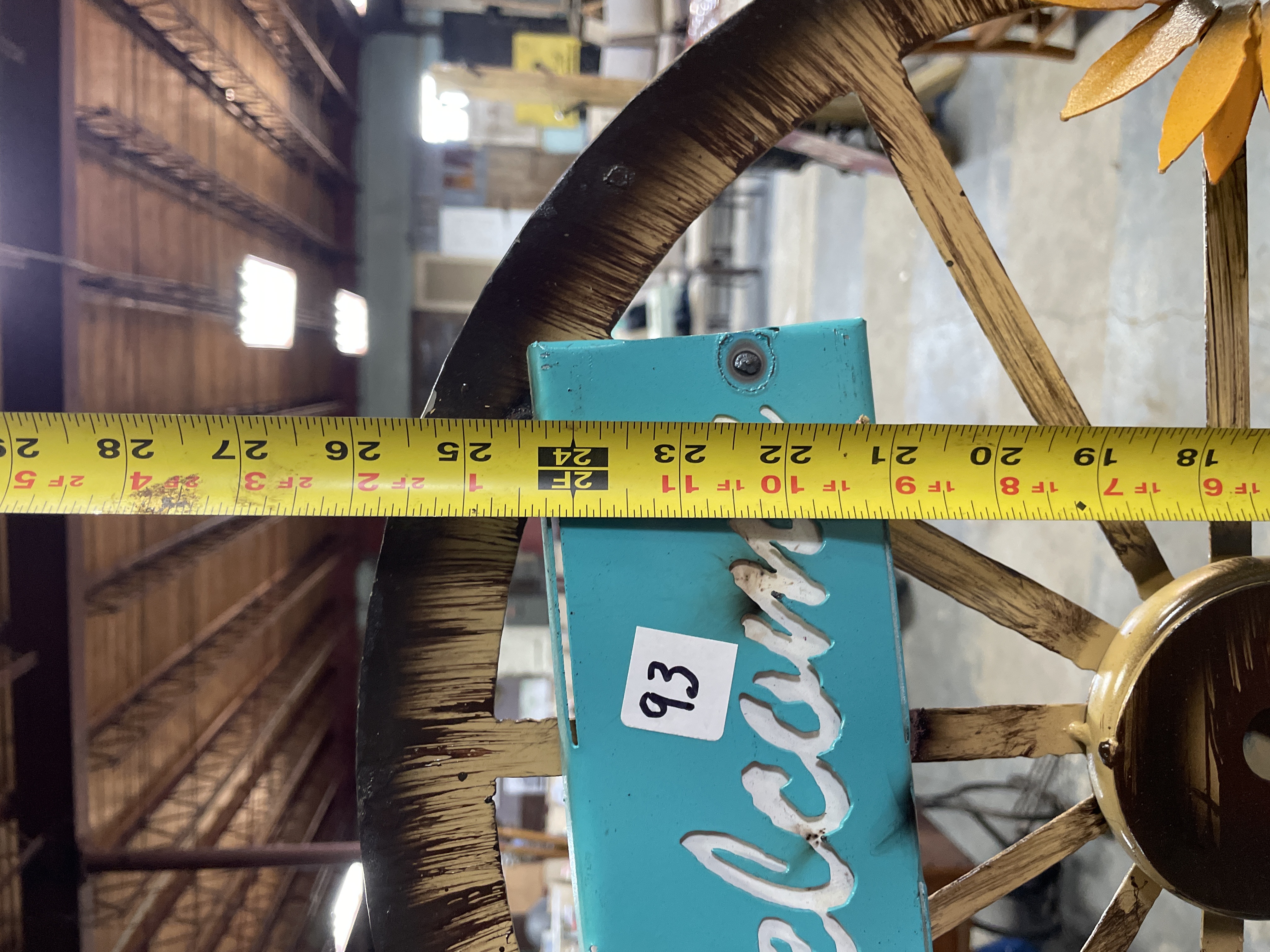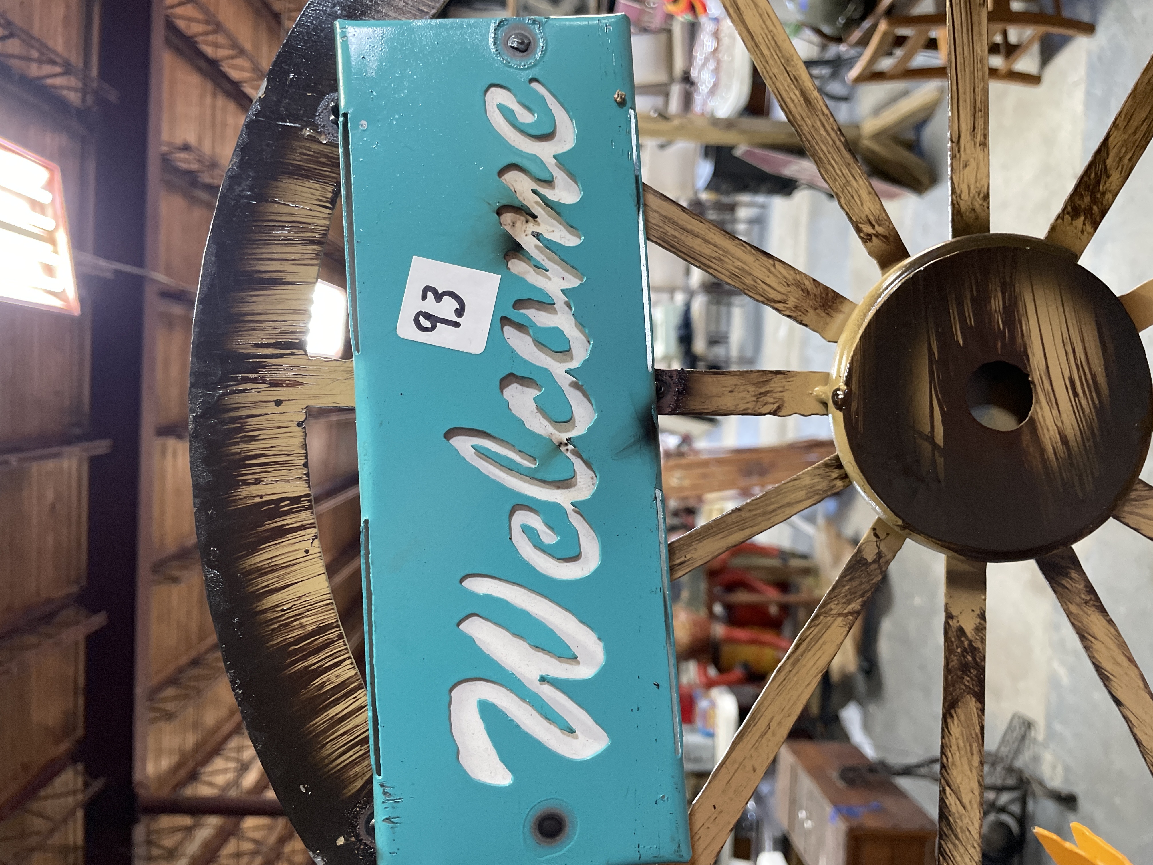 A single decorative metal yard ornament designed in the rustic or farmhouse style. The structure features a central wagon wheel motif, finished with faux wood grain paint and mounted on a dark metal rod base. Three barrel-style planters, also finished with faux wood grain paint, are attached to the stand. Each planter contains multiple welded metal sunflower representations painted in orange, yellow, and black. A turquoise metal sign bearing the white cursive text Welcome is bolted to the upper rim of the wheel. The item displays an intentional distressed finish consistent with its rustic aesthetic. A white inventory sticker marked 93 is affixed to the sign.