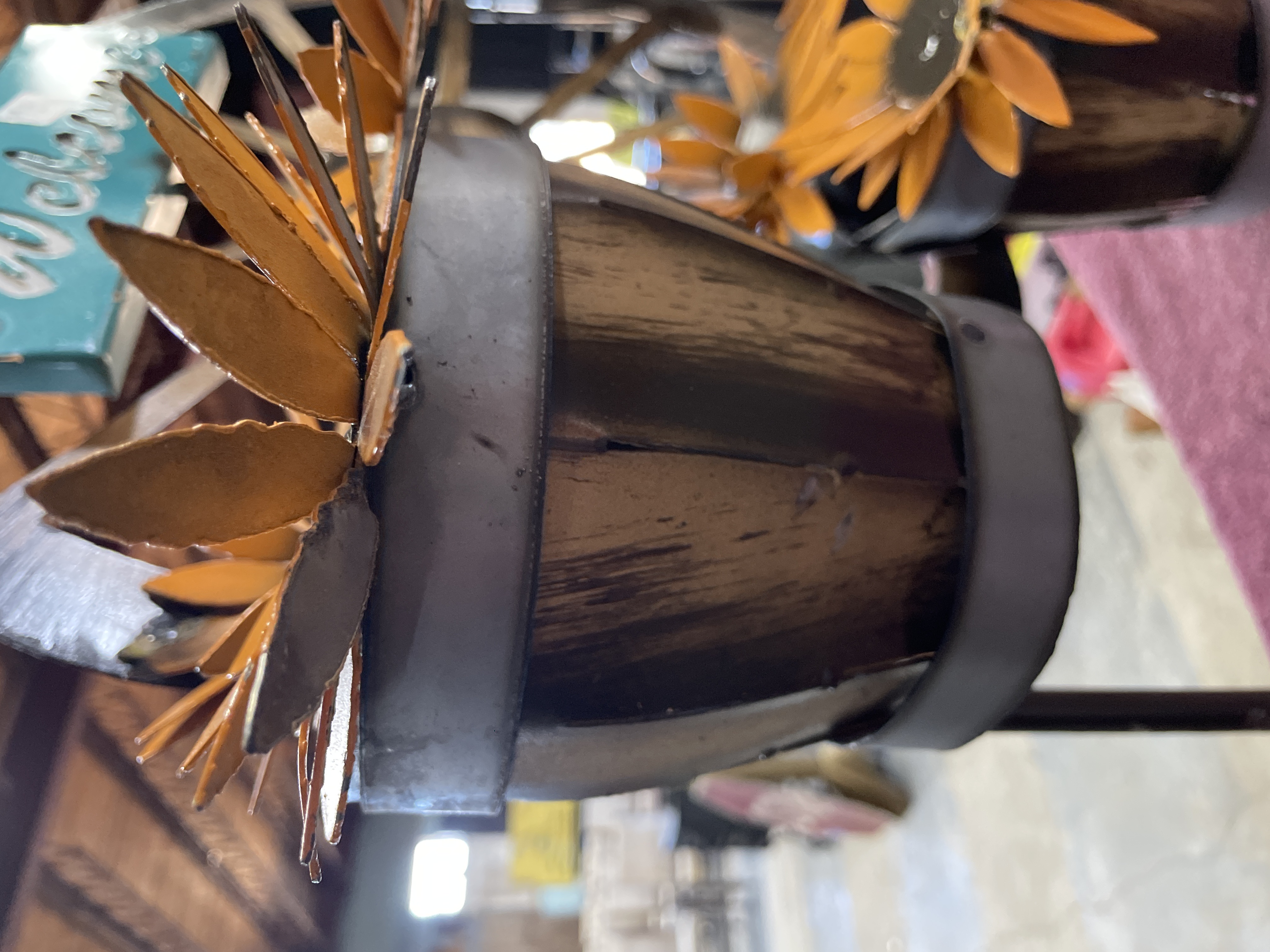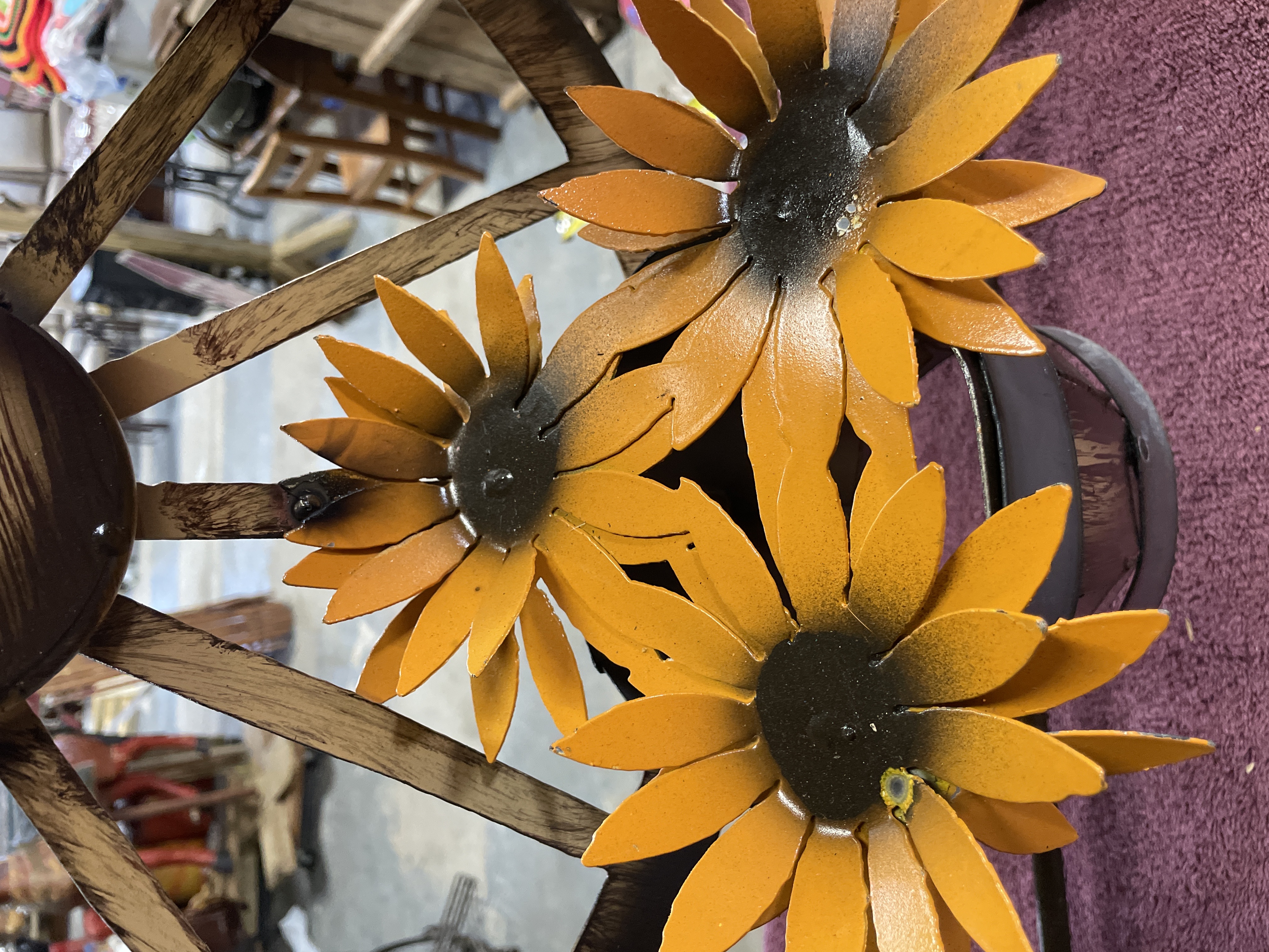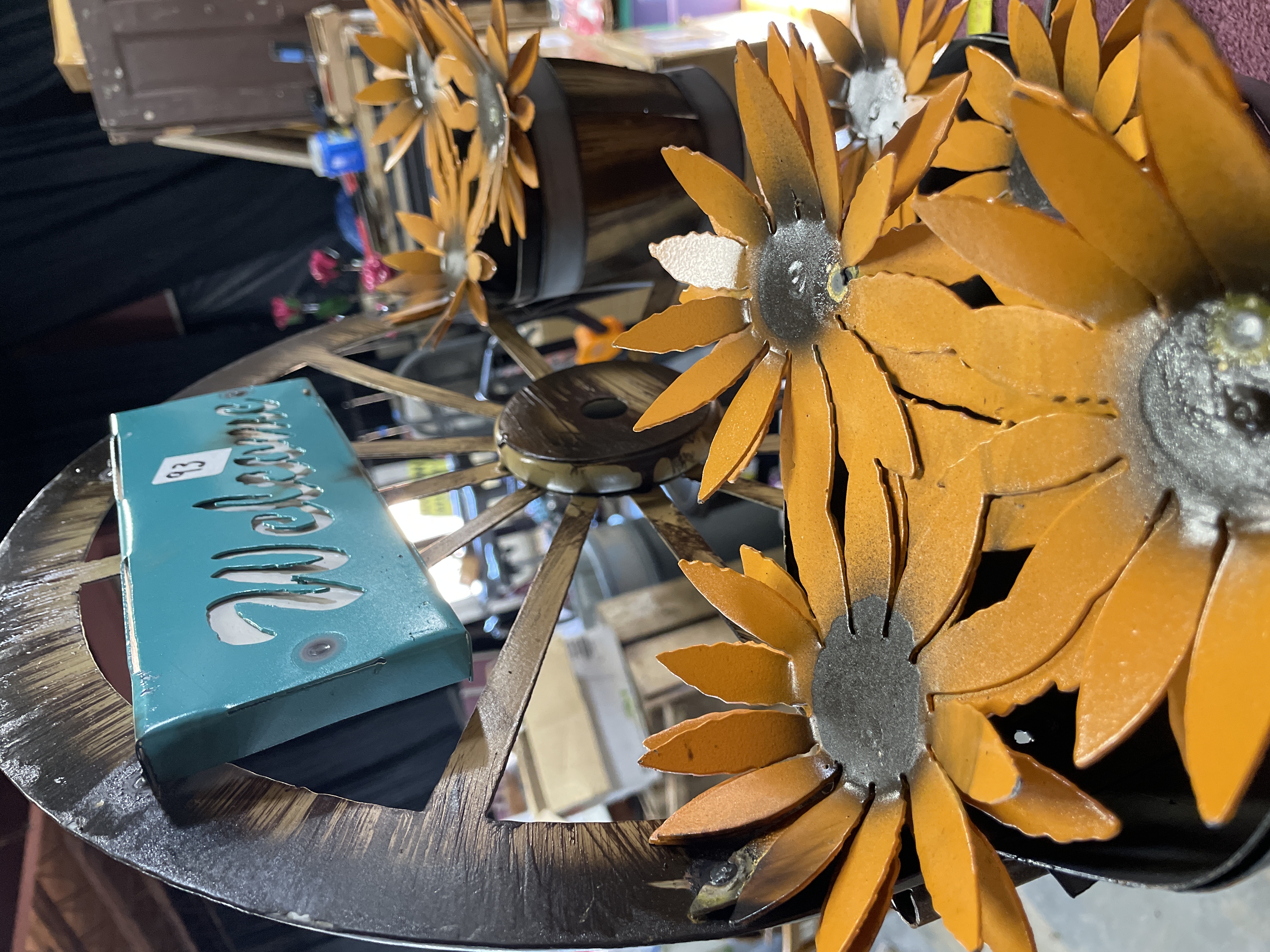 A single decorative metal yard ornament designed in the rustic or farmhouse style. The structure features a central wagon wheel motif, finished with faux wood grain paint and mounted on a dark metal rod base. Three barrel-style planters, also finished with faux wood grain paint, are attached to the stand. Each planter contains multiple welded metal sunflower representations painted in orange, yellow, and black. A turquoise metal sign bearing the white cursive text Welcome is bolted to the upper rim of the wheel. The item displays an intentional distressed finish consistent with its rustic aesthetic. A white inventory sticker marked 93 is affixed to the sign.