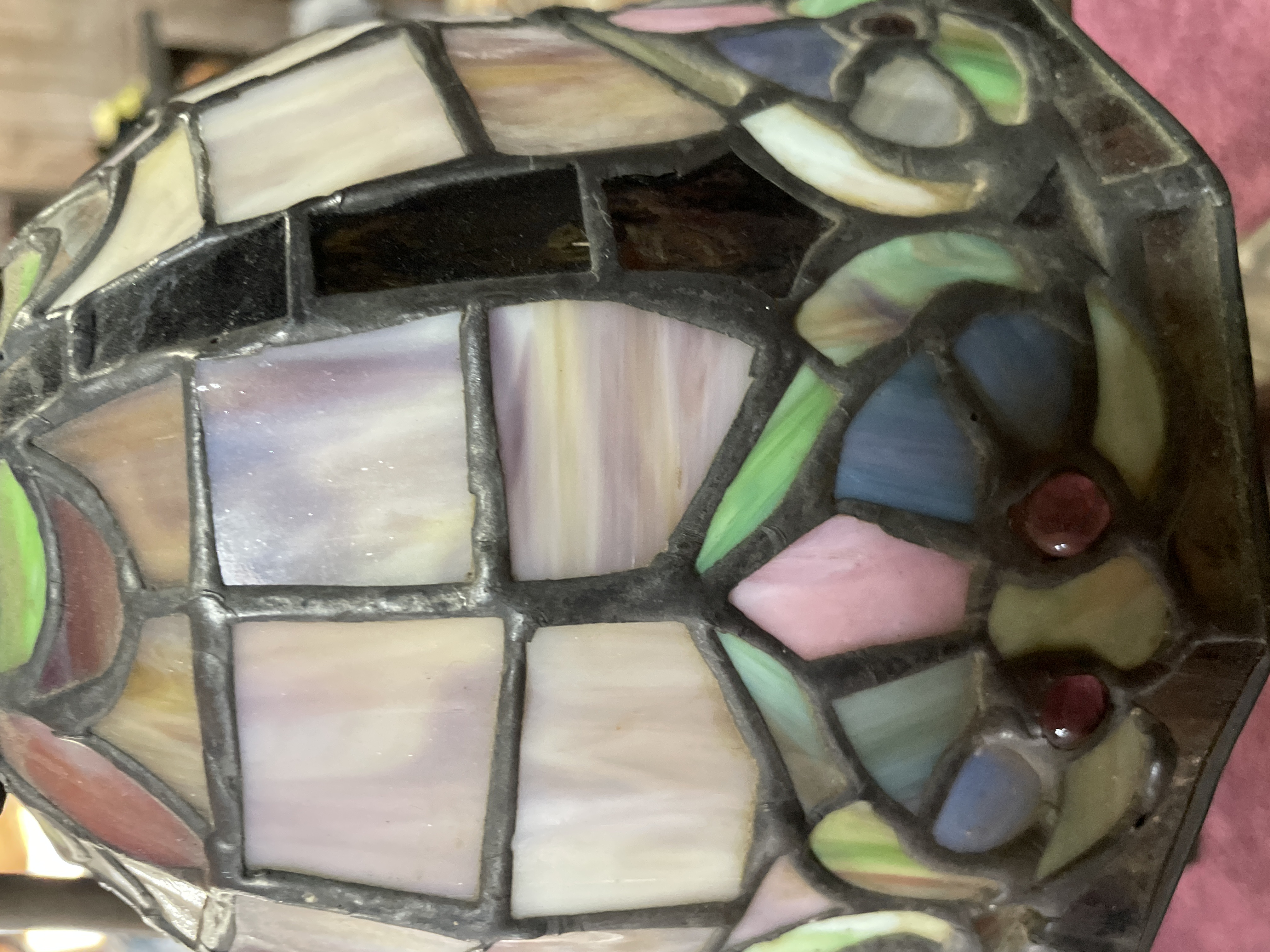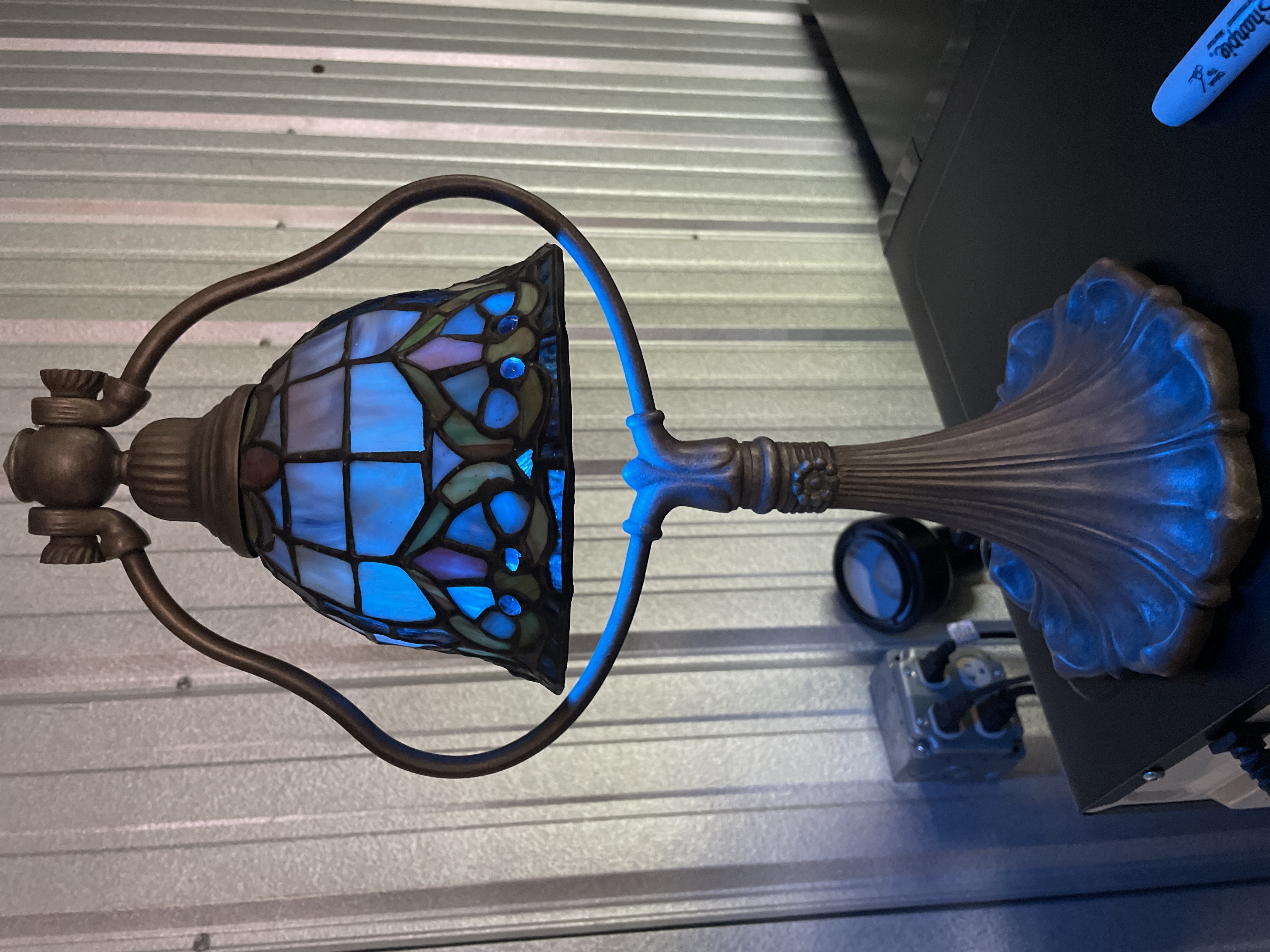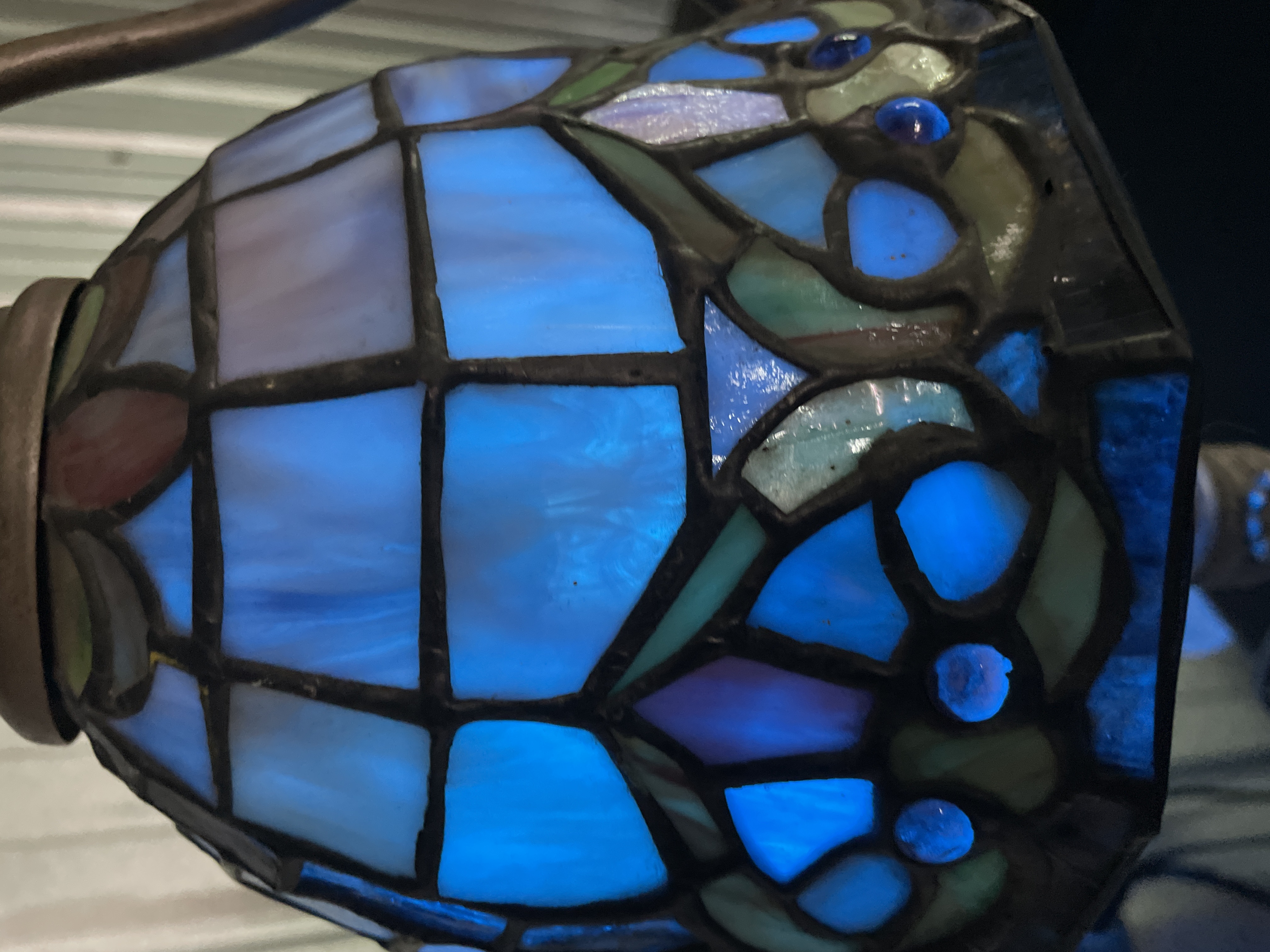 A single table lamp executed in the style of Tiffany leaded stained glass lighting. The shade is constructed of numerous segments of slag glass, featuring a geometric pattern of square and rectangular white and opalescent panes in the upper section. The lower border transitions to a complex scrolling floral and geometric design incorporating blue, green, and pink glass segments, accented by small reddish glass cabochons. The lamp is shown illuminated, highlighting the blue tones of the glass. The body and base are constructed of cast metal, finished with an antiqued bronze or dark patina. The base is circular and heavily fluted with a scalloped edge, supporting a neck that rises to two curved arms (harp) holding the shade. The black electrical cord is visible and bears faint markings including the number 219617.