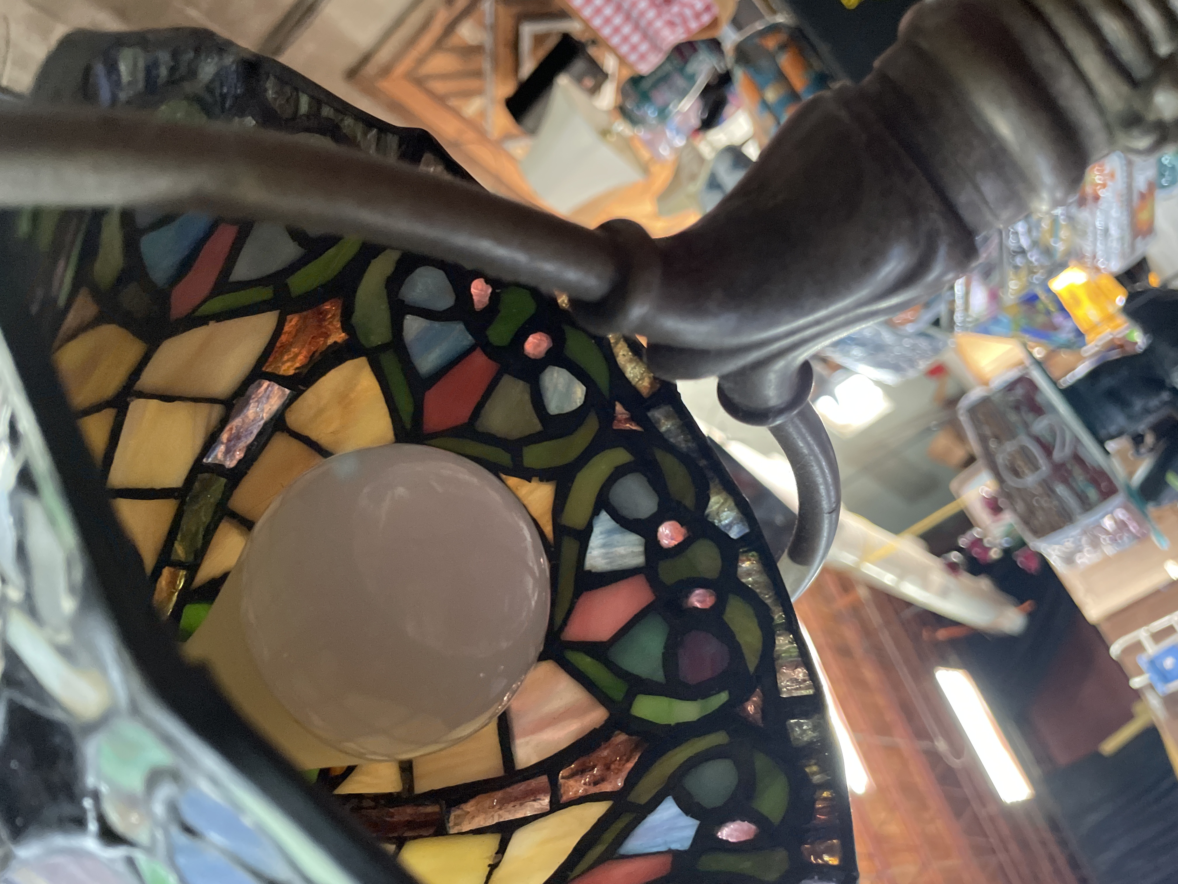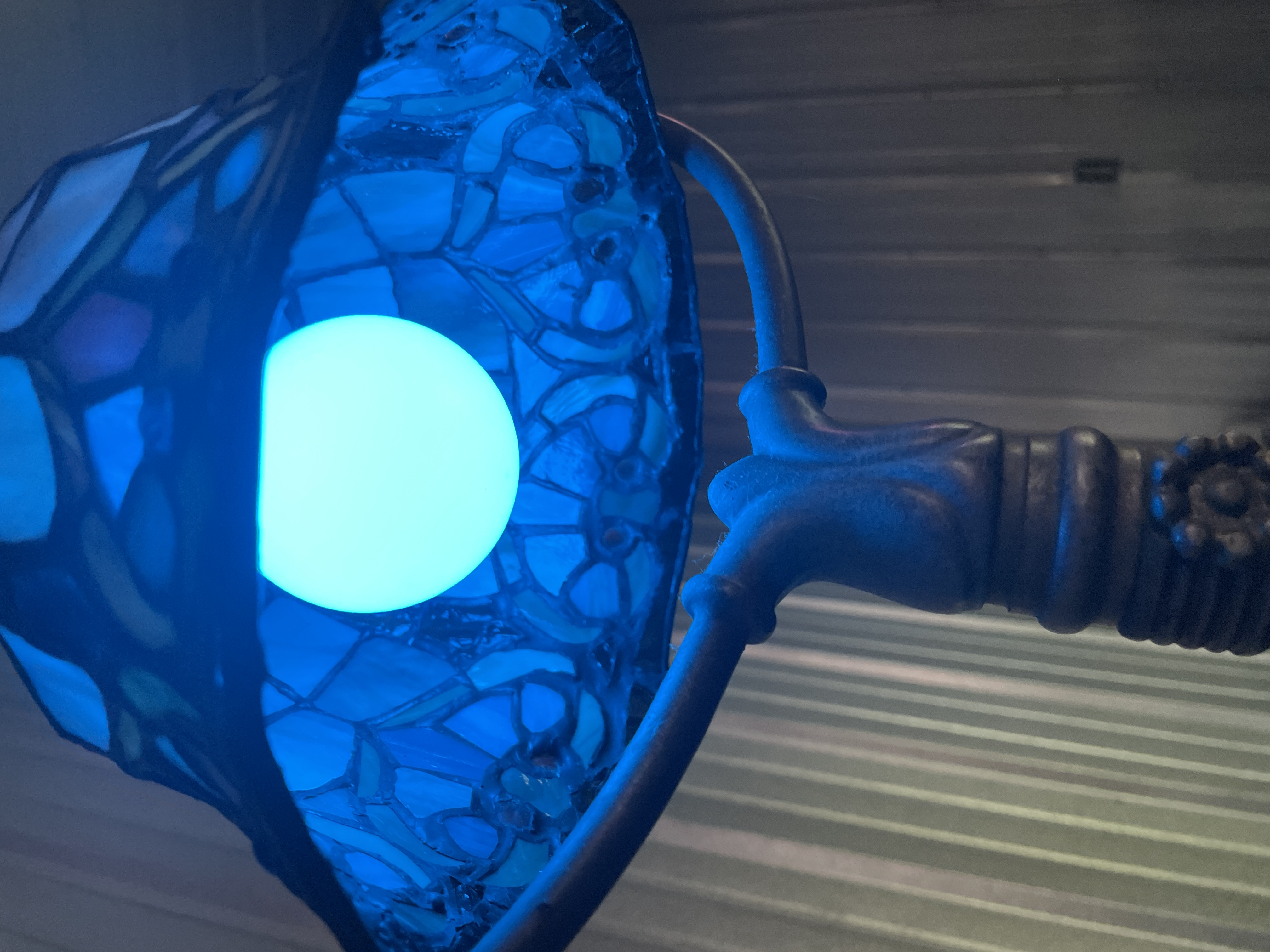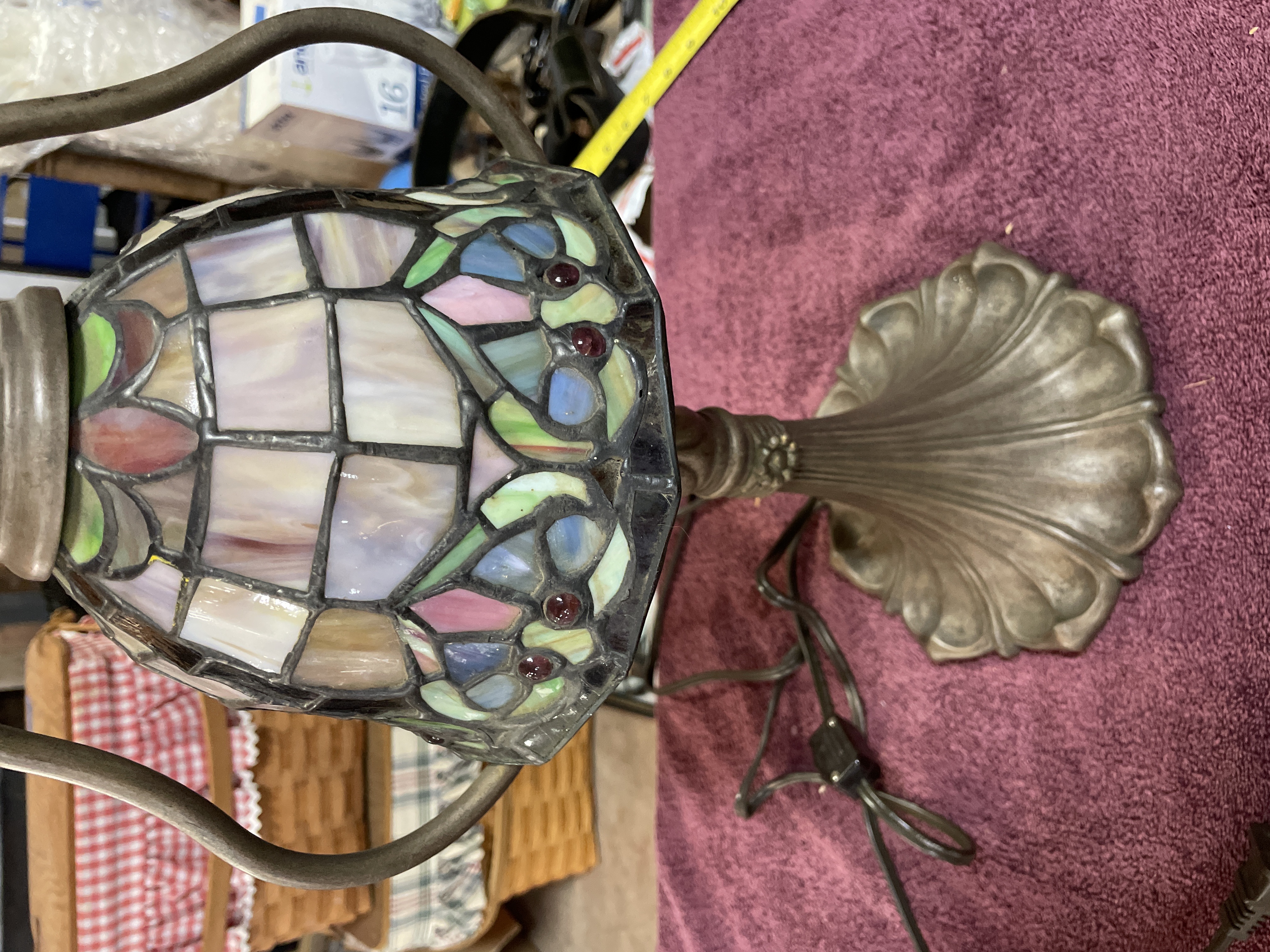A single table lamp executed in the style of Tiffany leaded stained glass lighting. The shade is constructed of numerous segments of slag glass, featuring a geometric pattern of square and rectangular white and opalescent panes in the upper section. The lower border transitions to a complex scrolling floral and geometric design incorporating blue, green, and pink glass segments, accented by small reddish glass cabochons. The lamp is shown illuminated, highlighting the blue tones of the glass. The body and base are constructed of cast metal, finished with an antiqued bronze or dark patina. The base is circular and heavily fluted with a scalloped edge, supporting a neck that rises to two curved arms (harp) holding the shade. The black electrical cord is visible and bears faint markings including the number 219617.