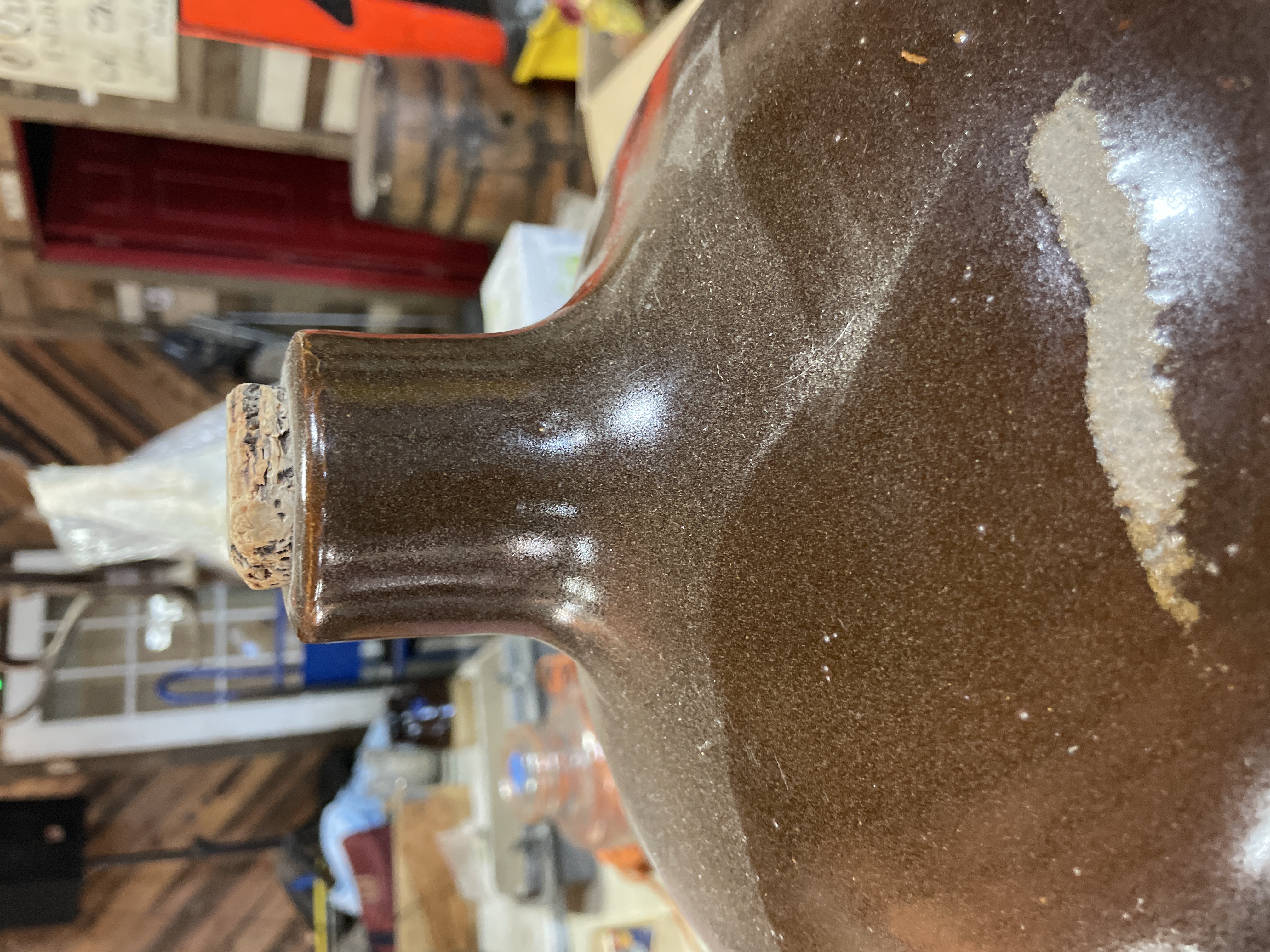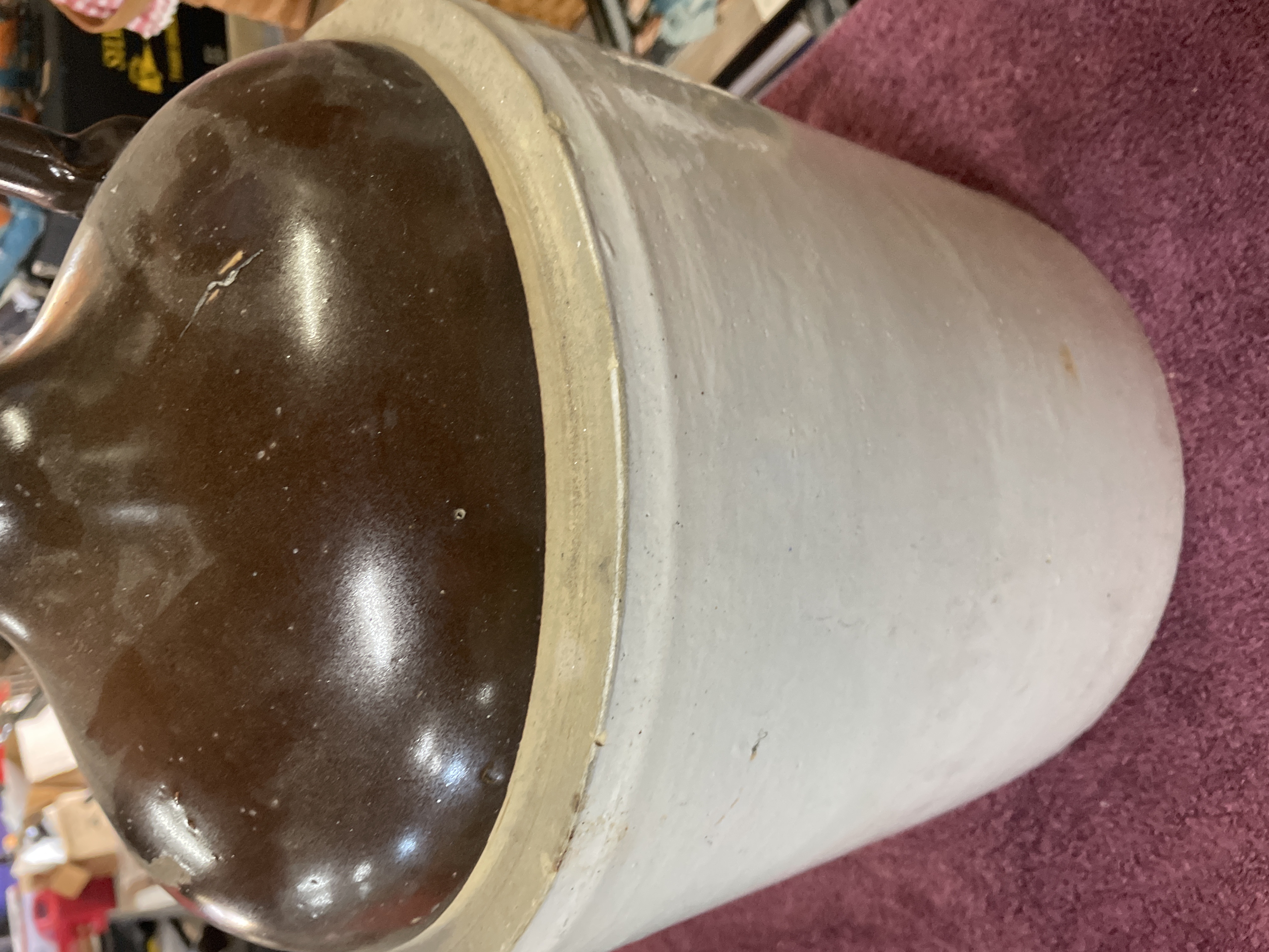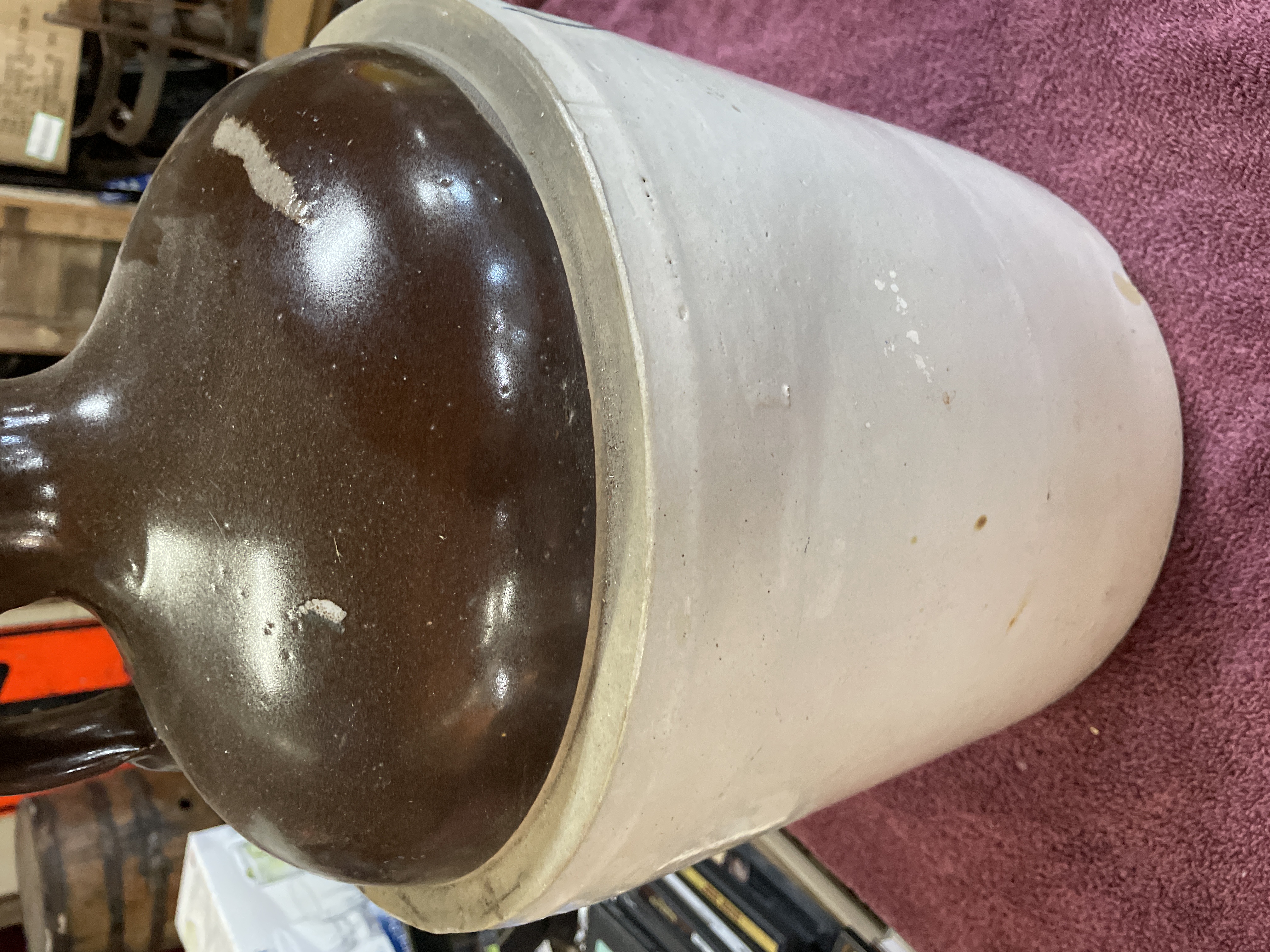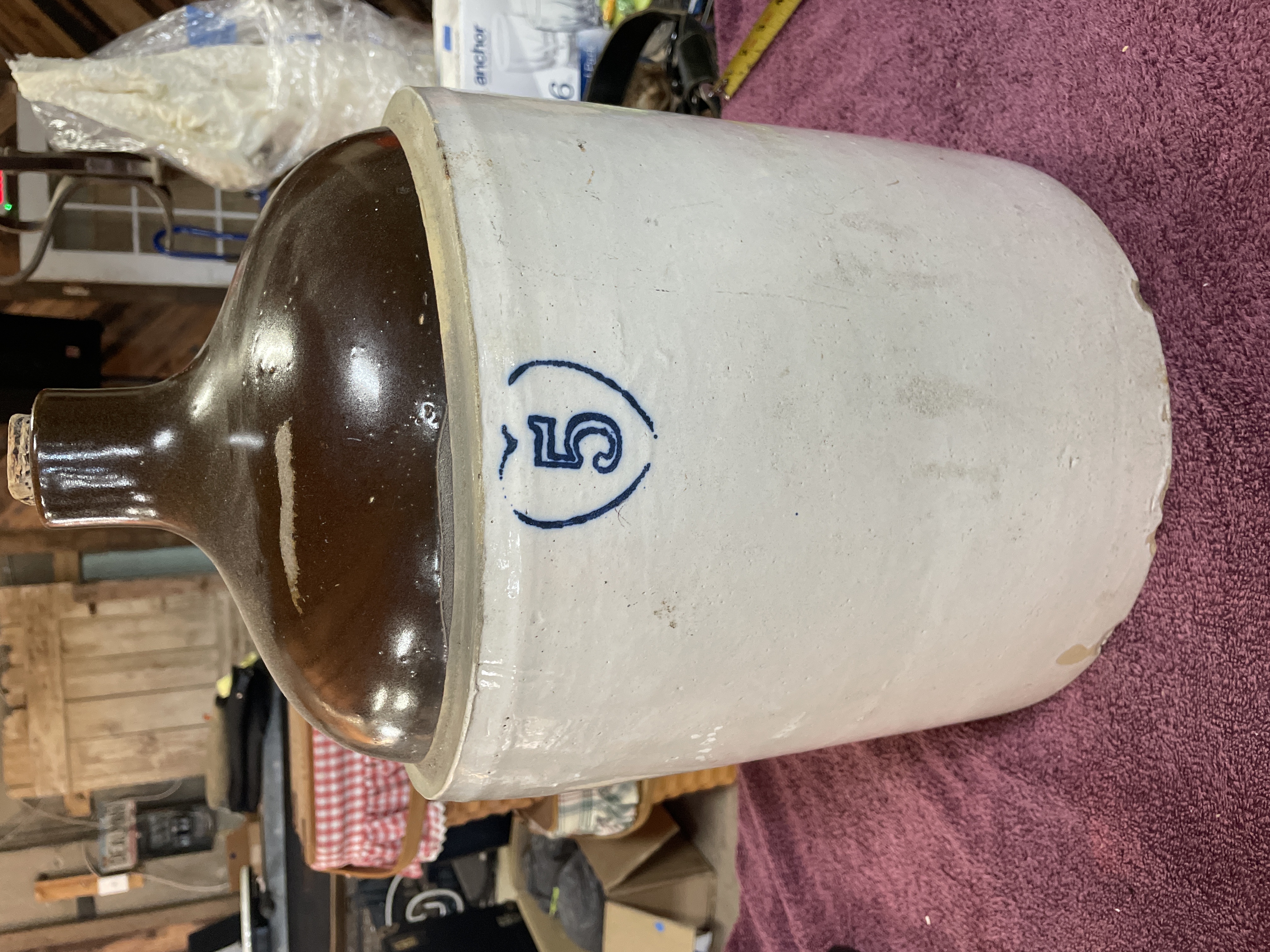A single, large-capacity utilitarian stoneware jug, characteristic of American pottery from the late 19th or early 20th century. The vessel features a classic two-tone glazing application. The main cylindrical body is covered in an off-white or light grey salt glaze. The shoulder, neck, and applied handle are finished with a glossy, dark brown Albany slip glaze. The front of the jug is decorated with a cobalt blue slip marking depicting the numeral “5” centered within a stylized shield or heart outline, indicating a five-gallon capacity. A cork stopper is visible in the narrow neck opening.