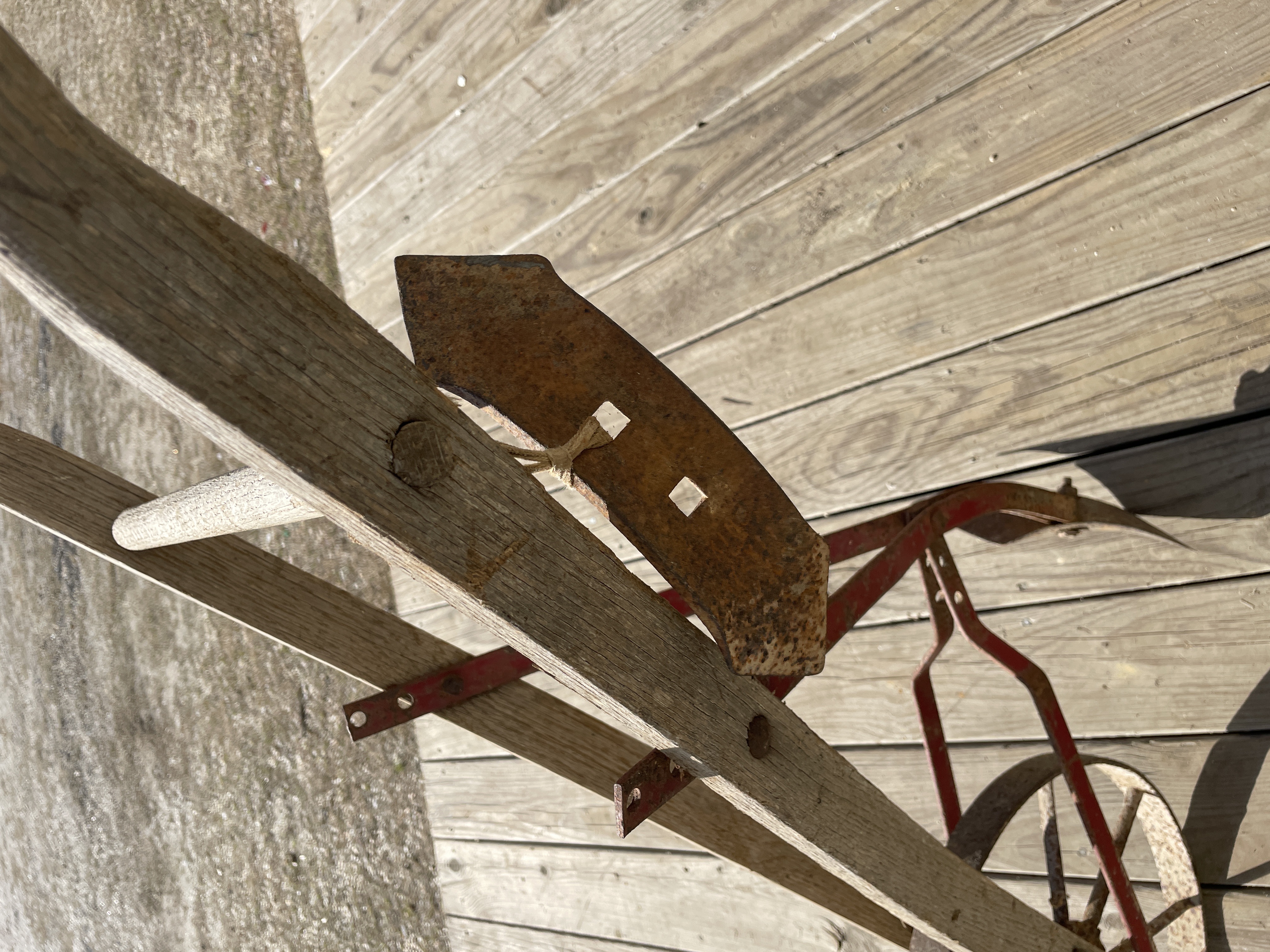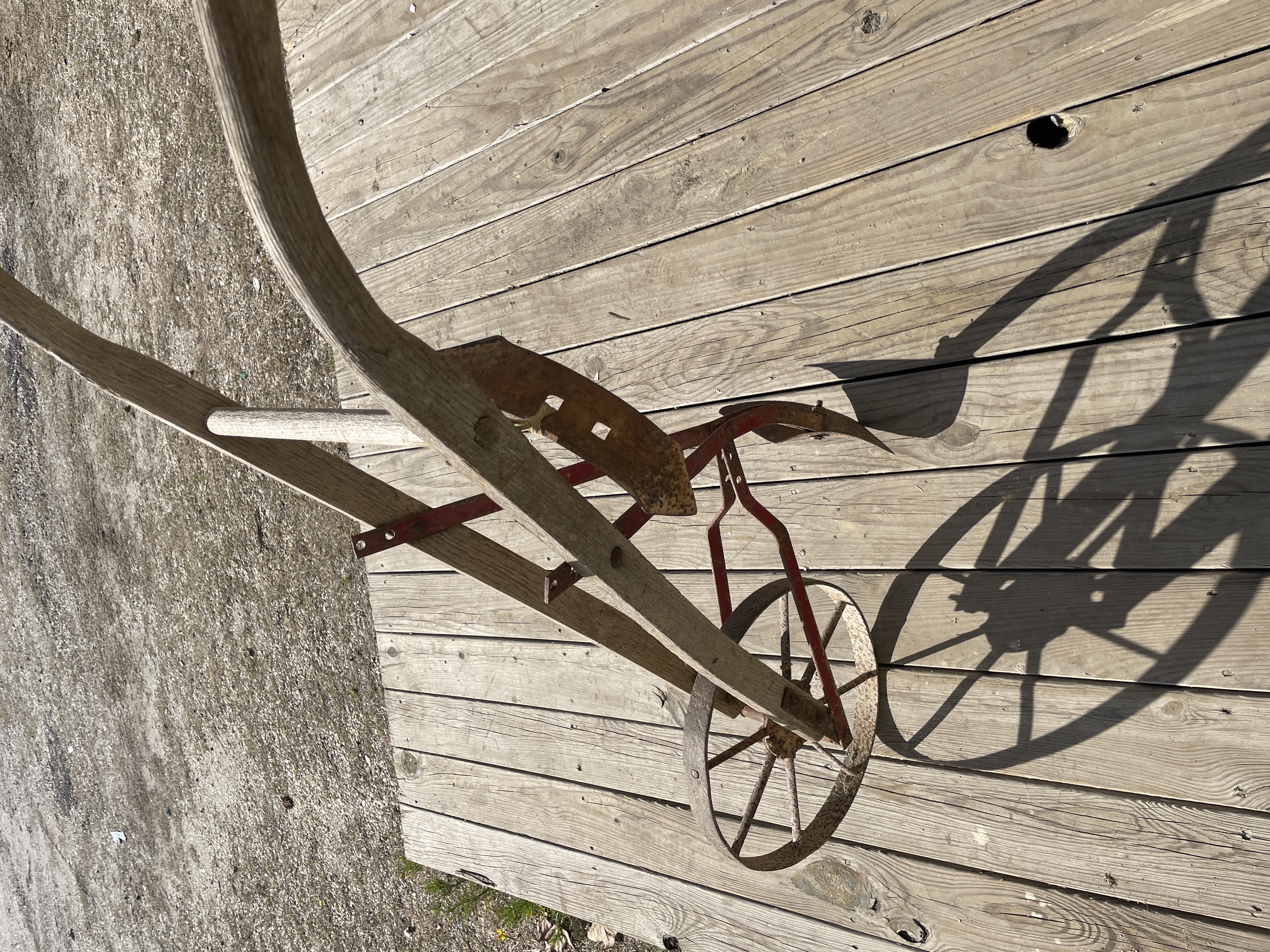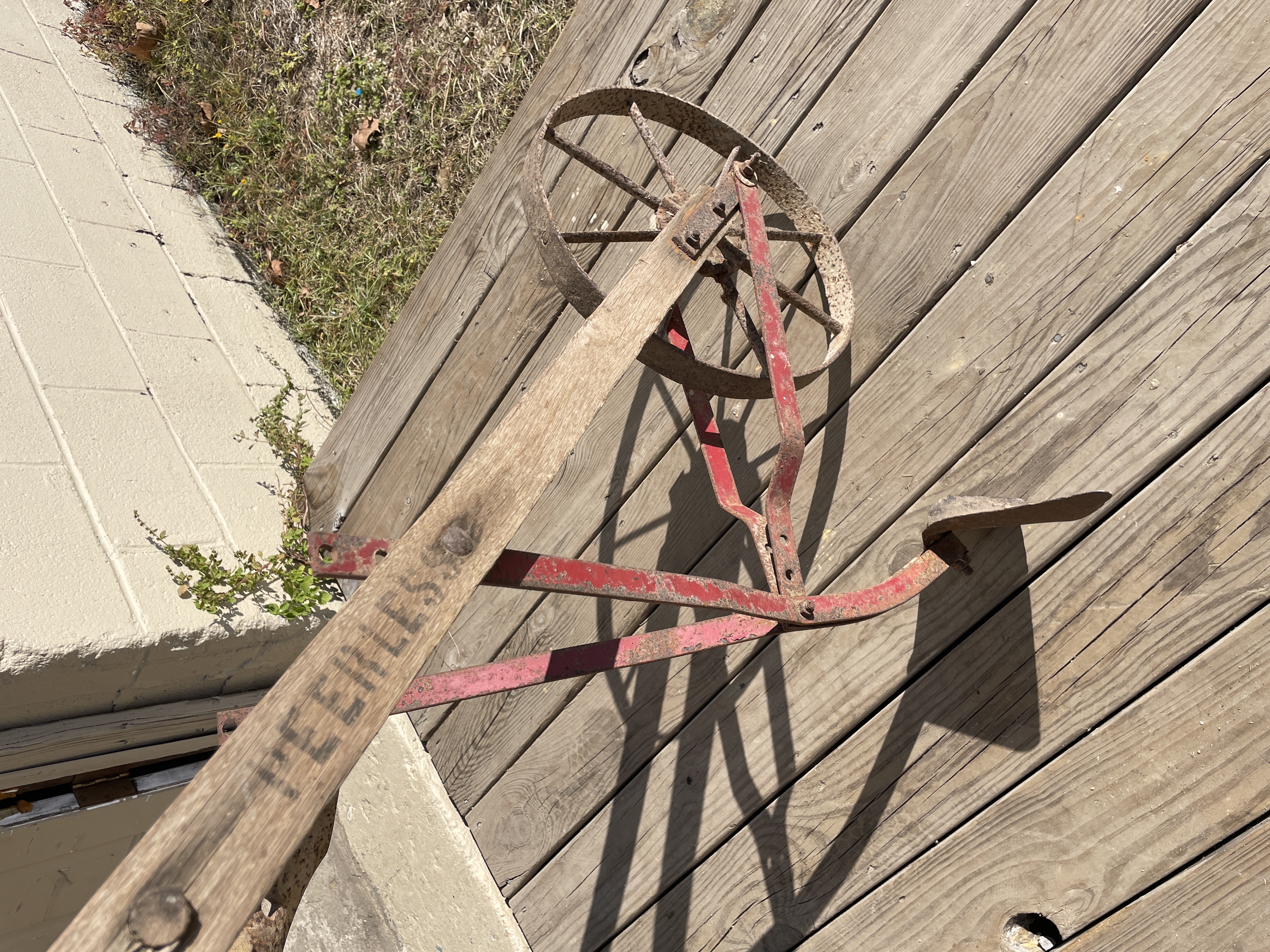 A single antique or vintage hand-pushed farming or gardening implement, likely a wheel hoe or single-wheel cultivator. The implement is constructed primarily of weathered wood handles and frame arms, connected by ferrous metal components. The identifying name PEERLESS is stenciled in black capital letters on one of the main wooden arms. The implement features a large, single spoked metal wheel connected to the supporting frame via red-painted metal braces. The working end is fitted with a pointed metal plow or furrowing share. A secondary, heavily rusted rectangular blade attachment is also visible, temporarily secured to the frame by twine, suggesting it is a removable accessory.