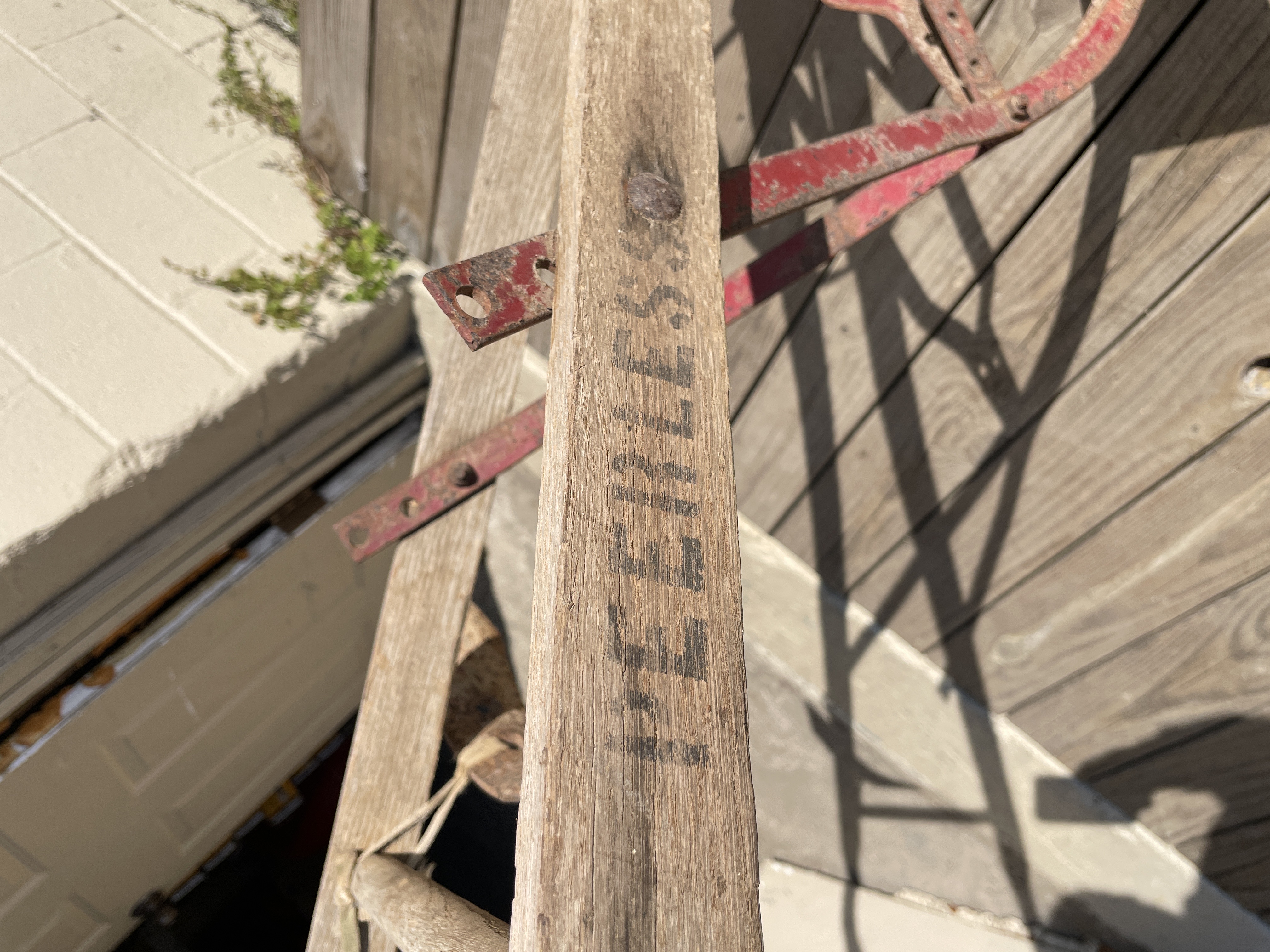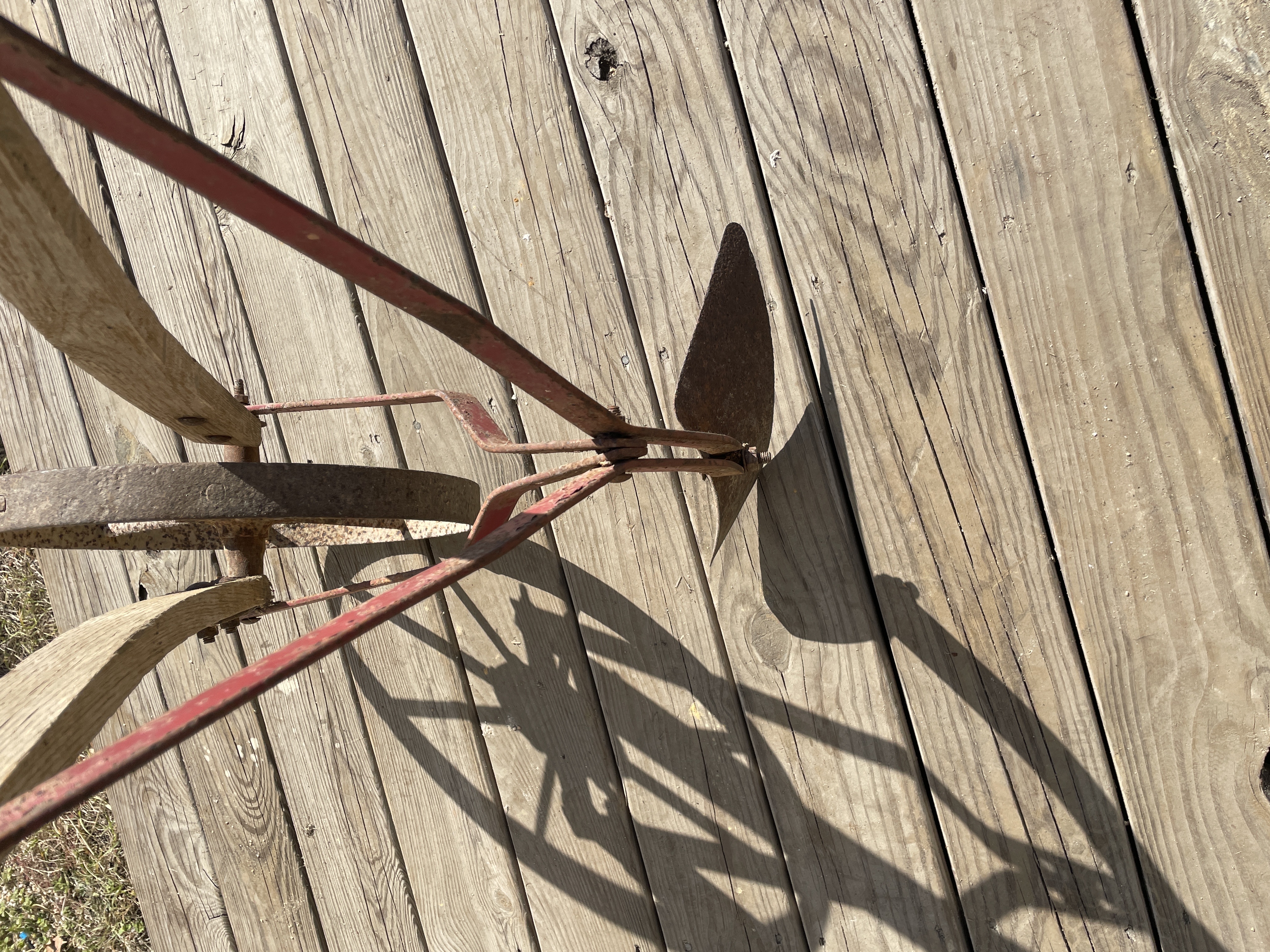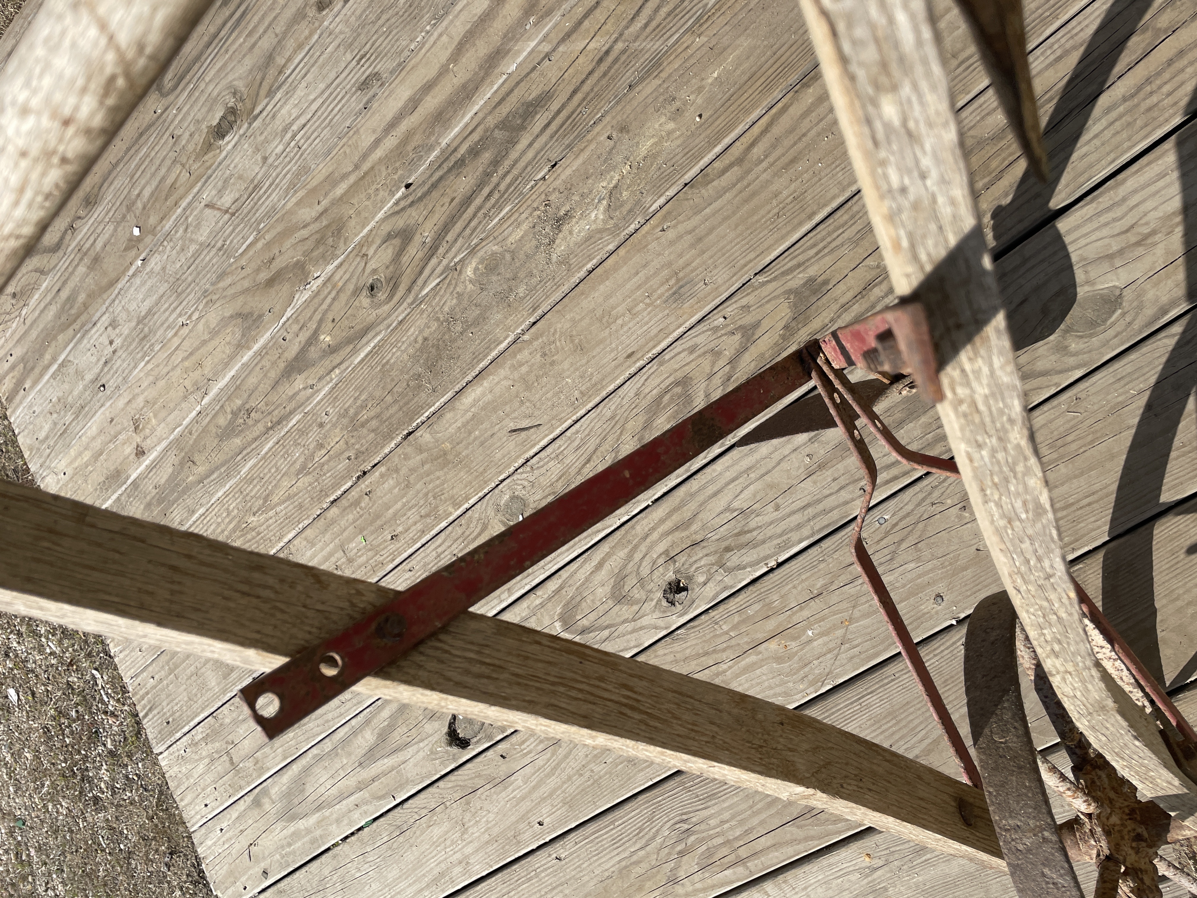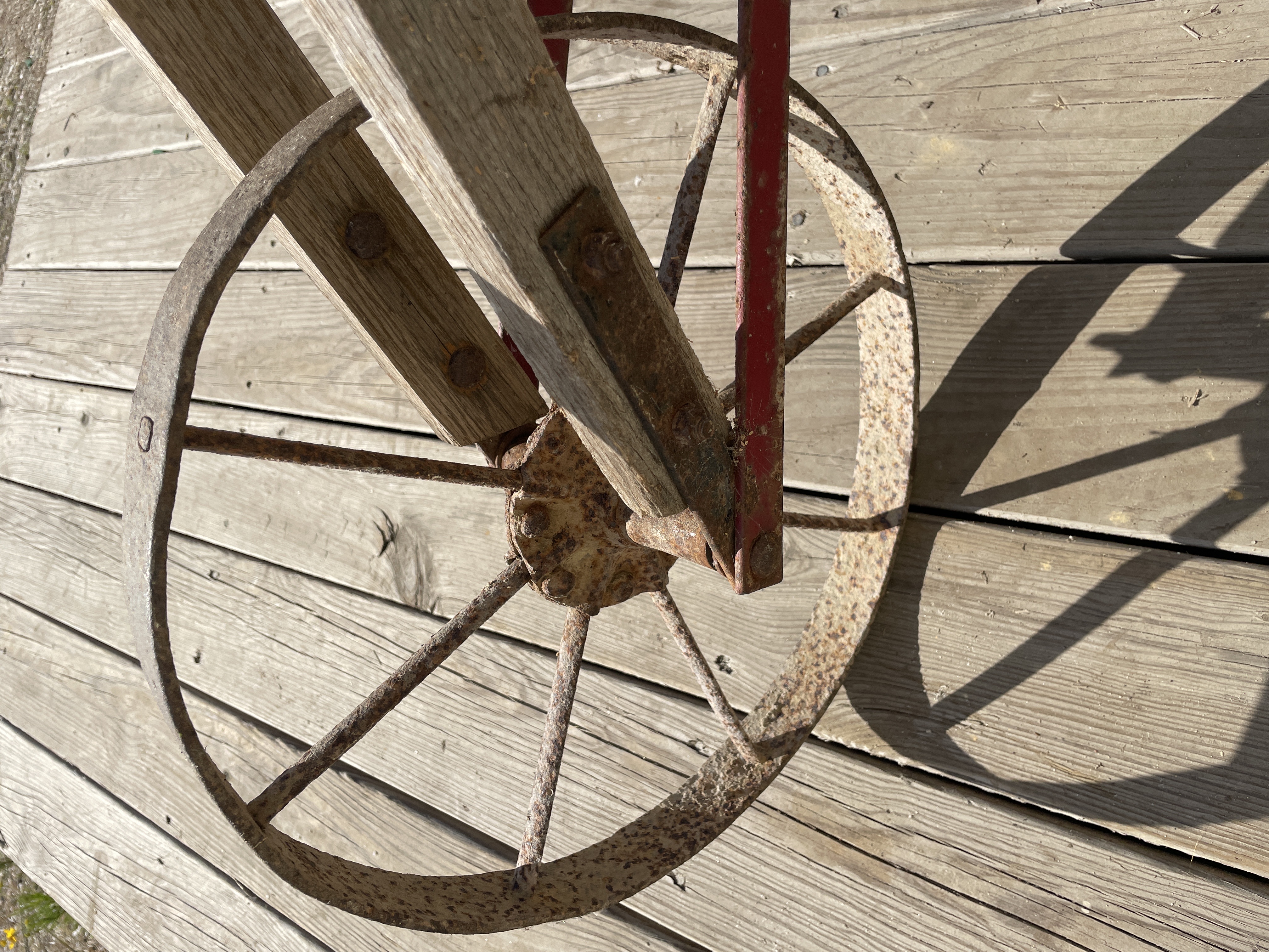 A single antique or vintage hand-pushed farming or gardening implement, likely a wheel hoe or single-wheel cultivator. The implement is constructed primarily of weathered wood handles and frame arms, connected by ferrous metal components. The identifying name PEERLESS is stenciled in black capital letters on one of the main wooden arms. The implement features a large, single spoked metal wheel connected to the supporting frame via red-painted metal braces. The working end is fitted with a pointed metal plow or furrowing share. A secondary, heavily rusted rectangular blade attachment is also visible, temporarily secured to the frame by twine, suggesting it is a removable accessory.