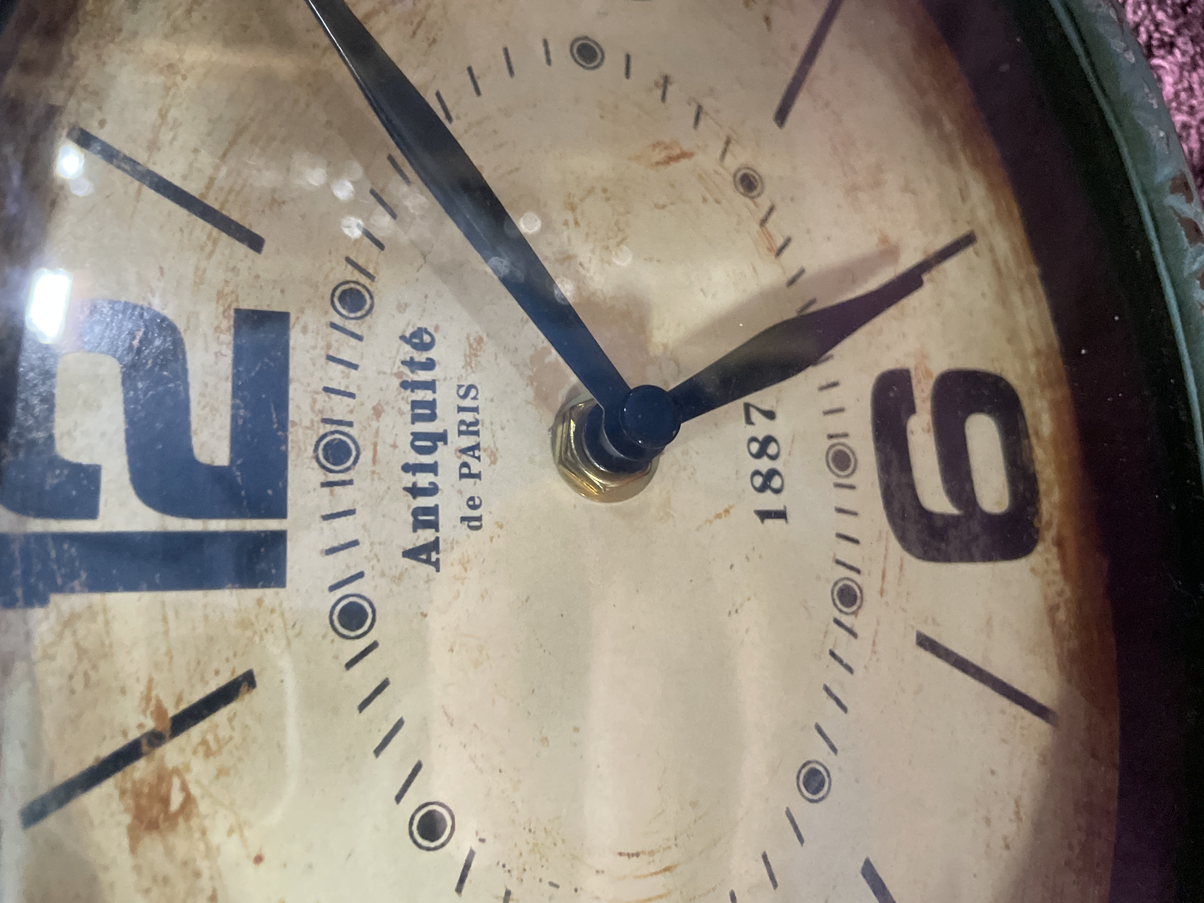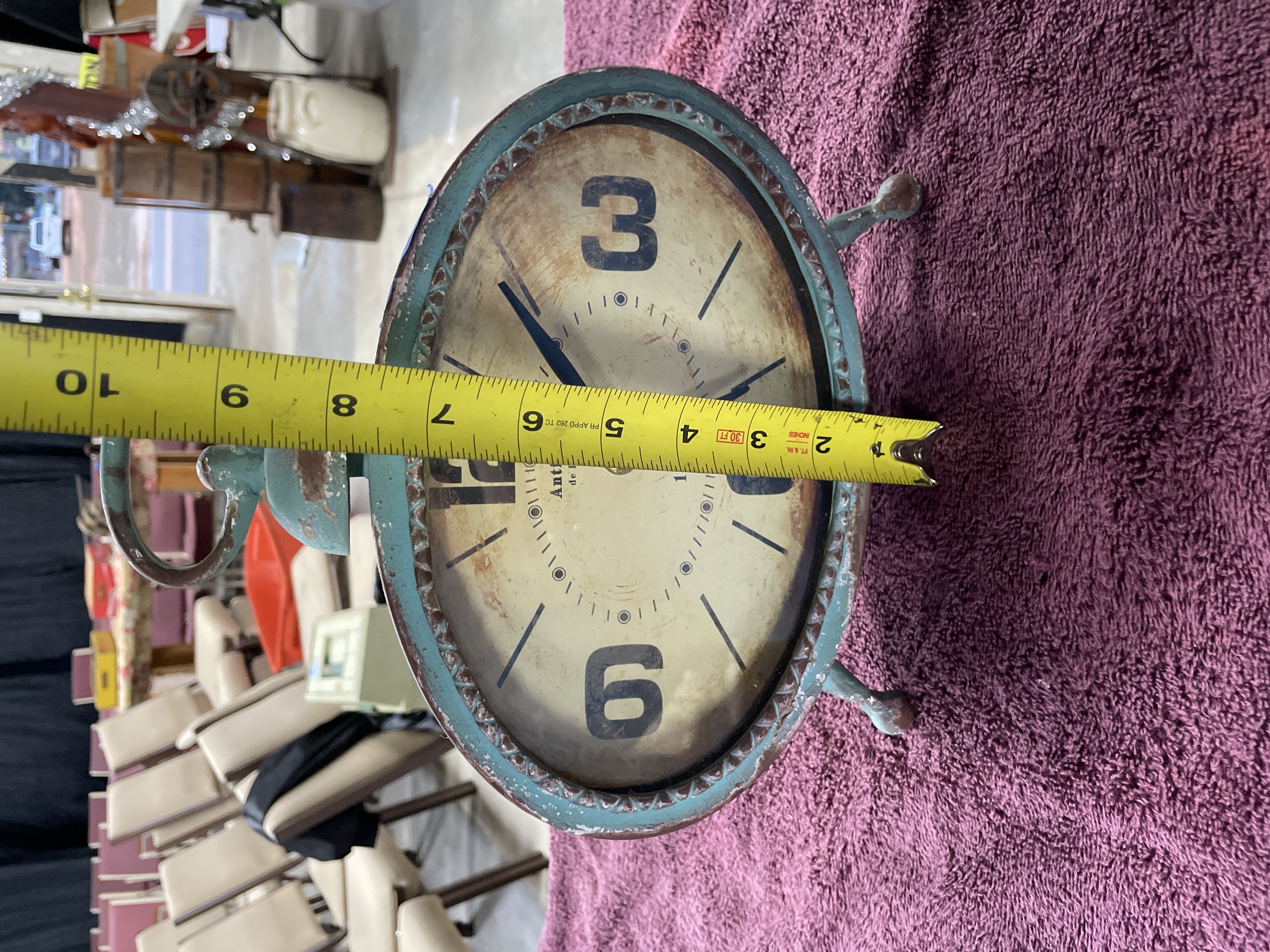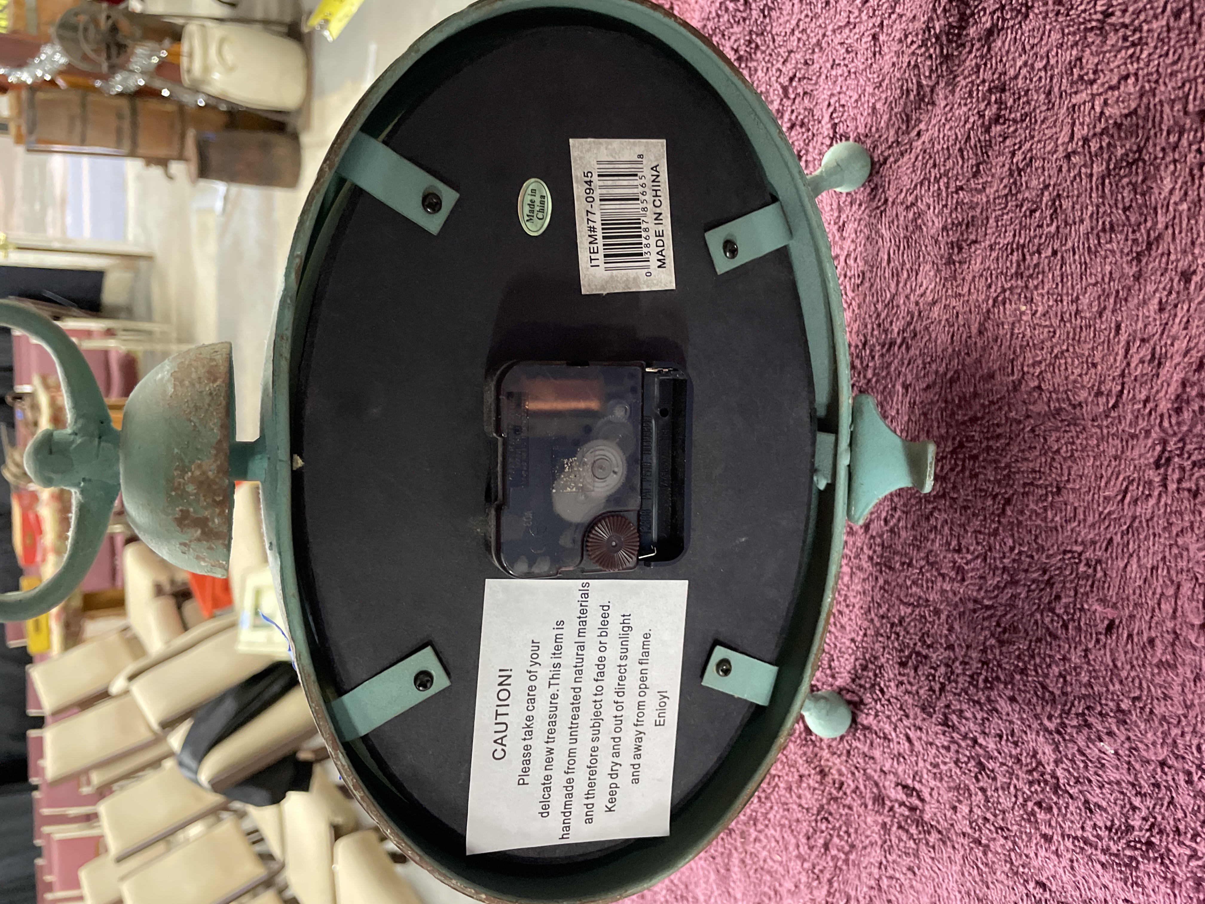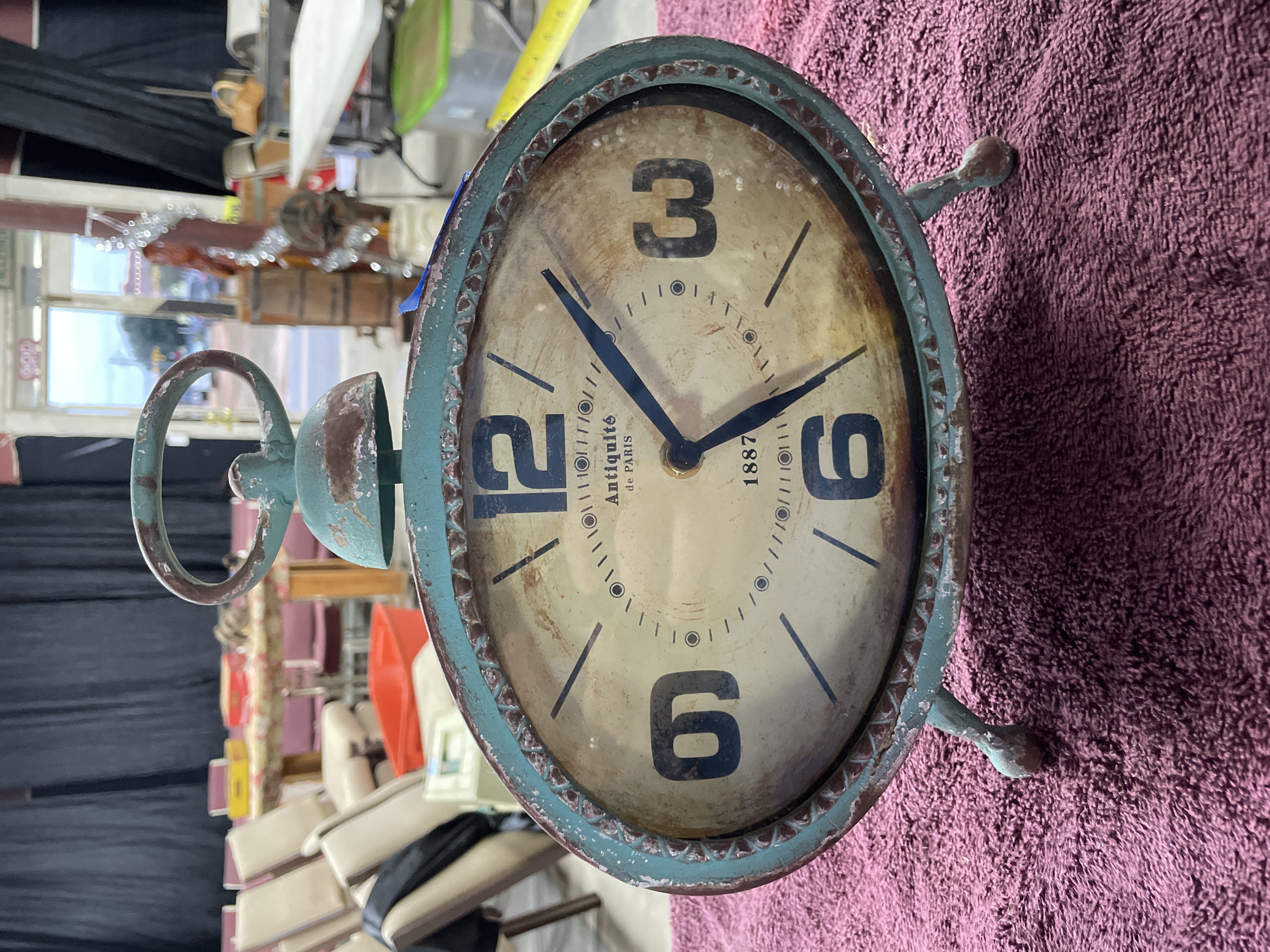 A single decorative table clock constructed of metal in an oval or elliptical form, finished in a distressed verdigris and teal blue patina with intentional rust effects to simulate age. The clock stands on four small feet and features a decorative carrying loop atop a small bell-shaped housing. The dial is designed to appear aged, featuring bold numerical hour markers (12, 3, 6, 9 emphasized) and is inscribed "Antiquité de PARIS" above the center and "1887" below, emphasizing a French vintage aesthetic. The reverse side reveals a modern battery-operated quartz movement. The item bears stickers confirming it is handmade and was manufactured in China.