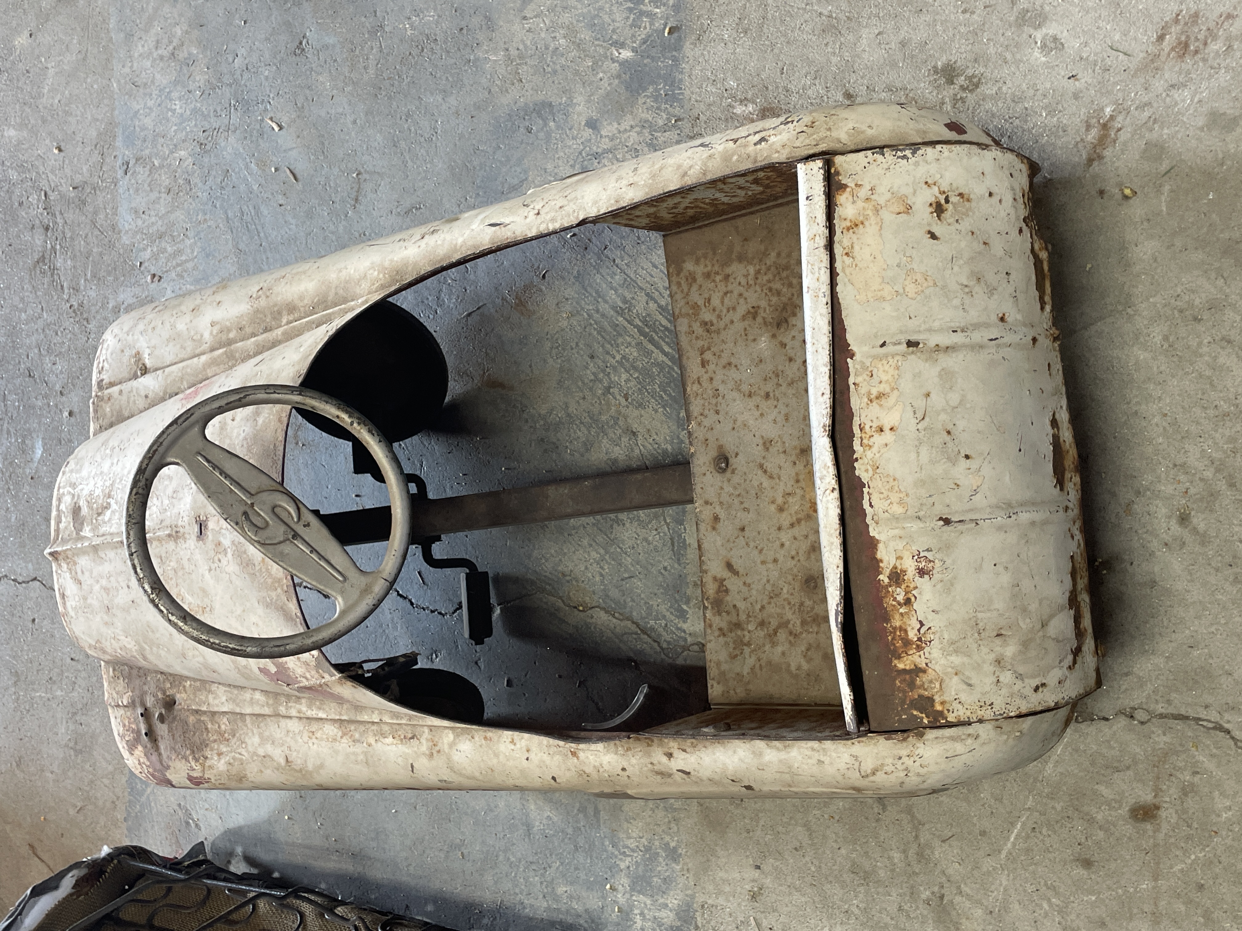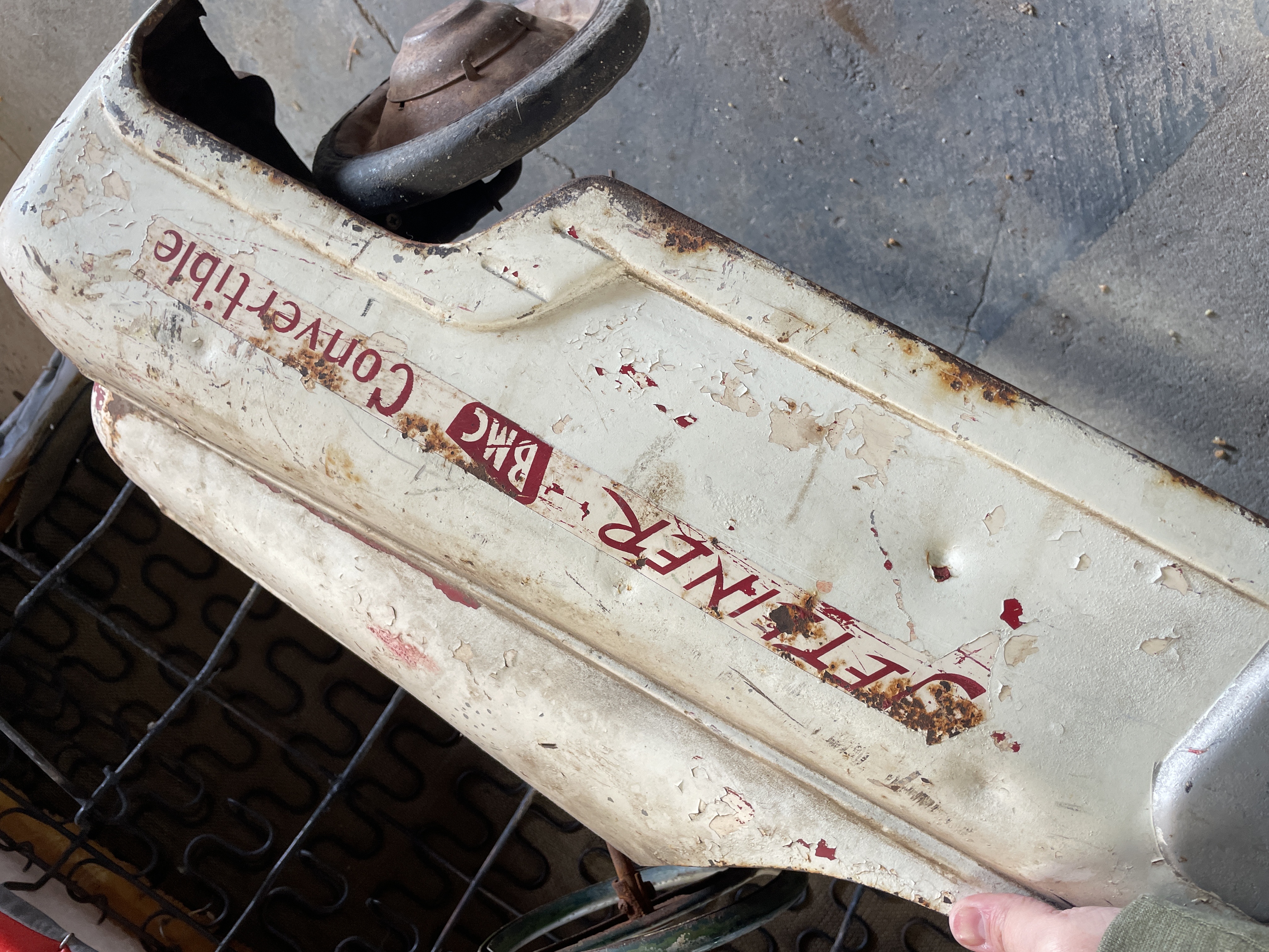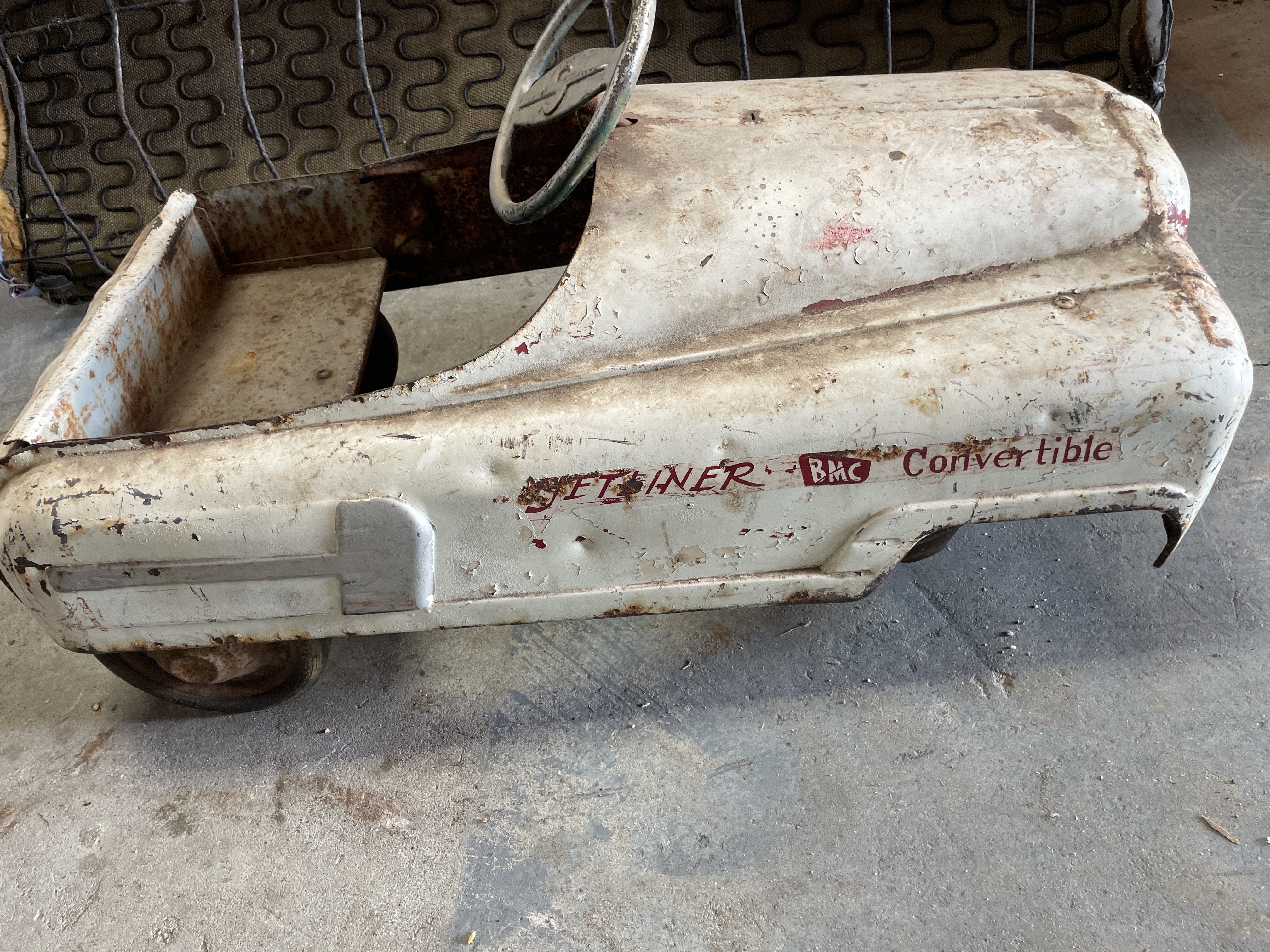 A single vintage ride-on pedal car constructed primarily of sheet metal, styled after a mid-20th century automobile. The car features red stenciled text on the side panels identifying the model as “JETLINER – BMC Convertible.” The front fascia includes a simulated silver bumper and integrated headlights. The vehicle is operated via a pedal mechanism and features a metal steering wheel embossed with a stylized ‘S’ logo at its center. The body retains remnants of its original white paint finish.
