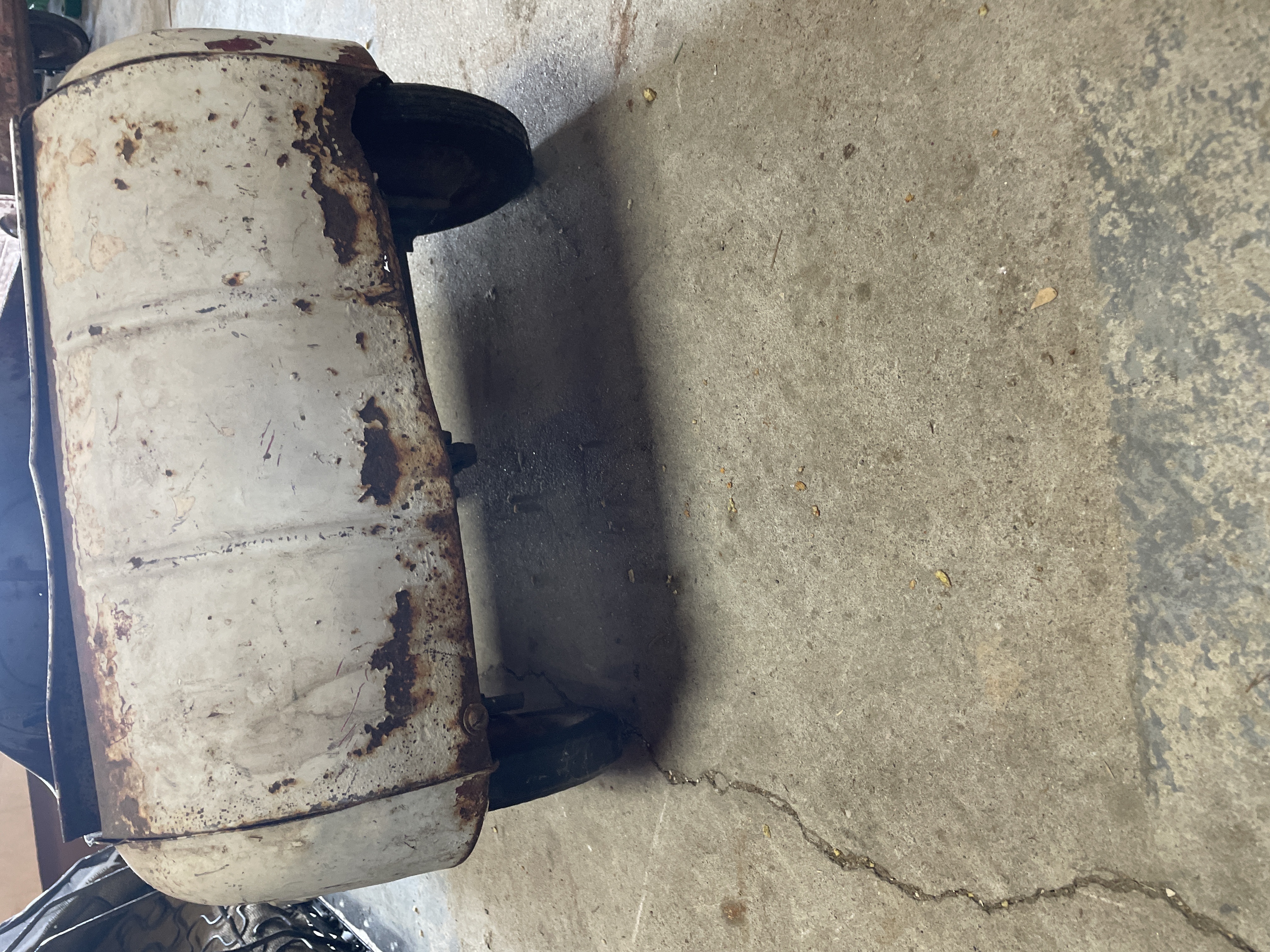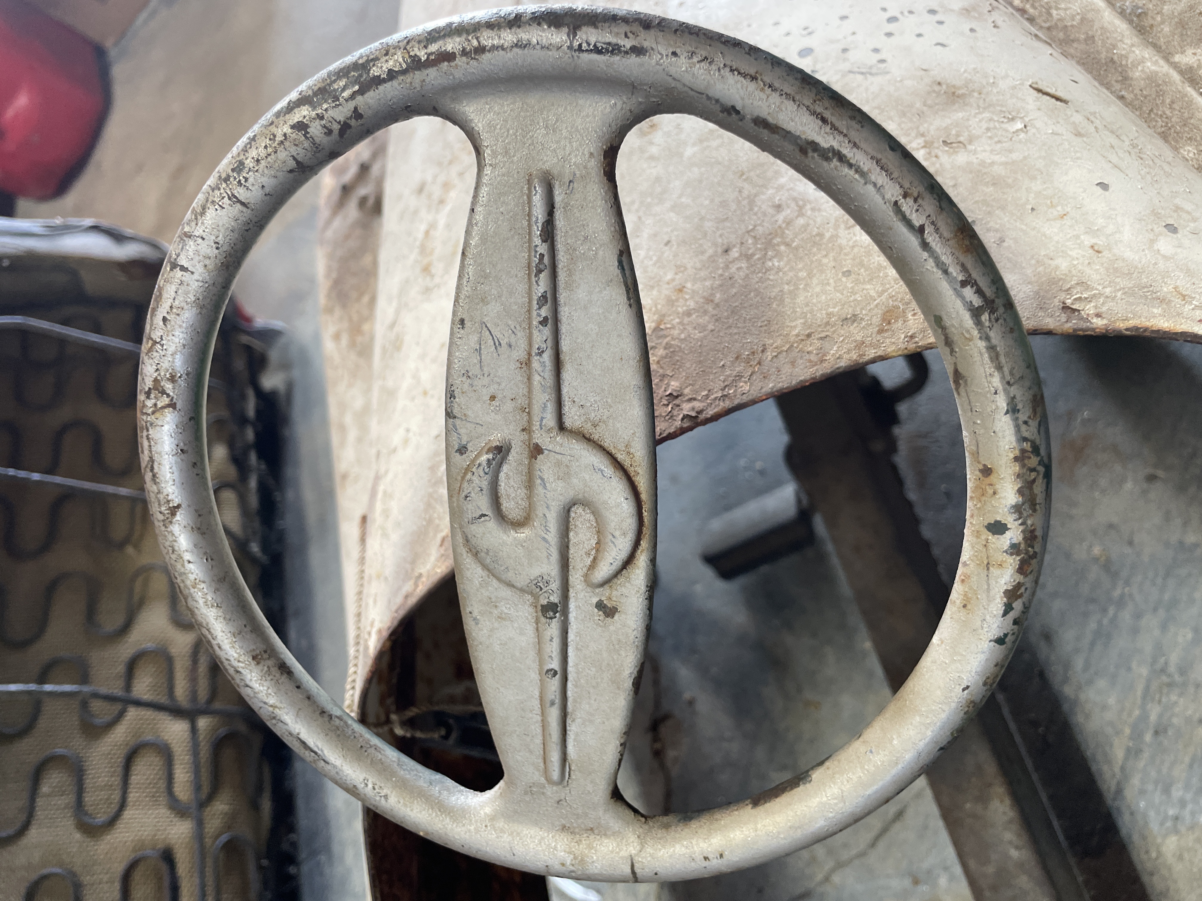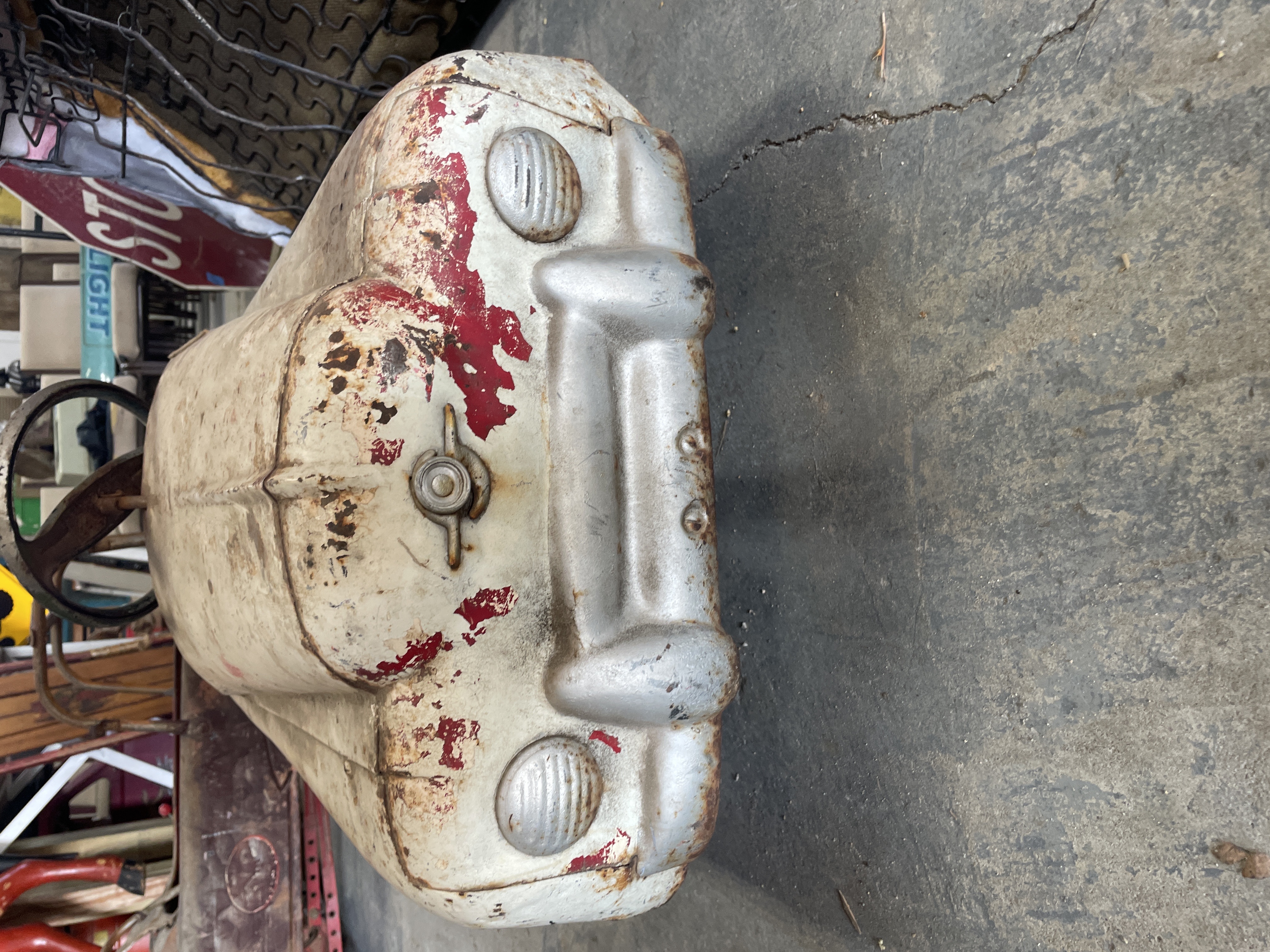 A single vintage ride-on pedal car constructed primarily of sheet metal, styled after a mid-20th century automobile. The car features red stenciled text on the side panels identifying the model as “JETLINER – BMC Convertible.” The front fascia includes a simulated silver bumper and integrated headlights. The vehicle is operated via a pedal mechanism and features a metal steering wheel embossed with a stylized ‘S’ logo at its center. The body retains remnants of its original white paint finish.