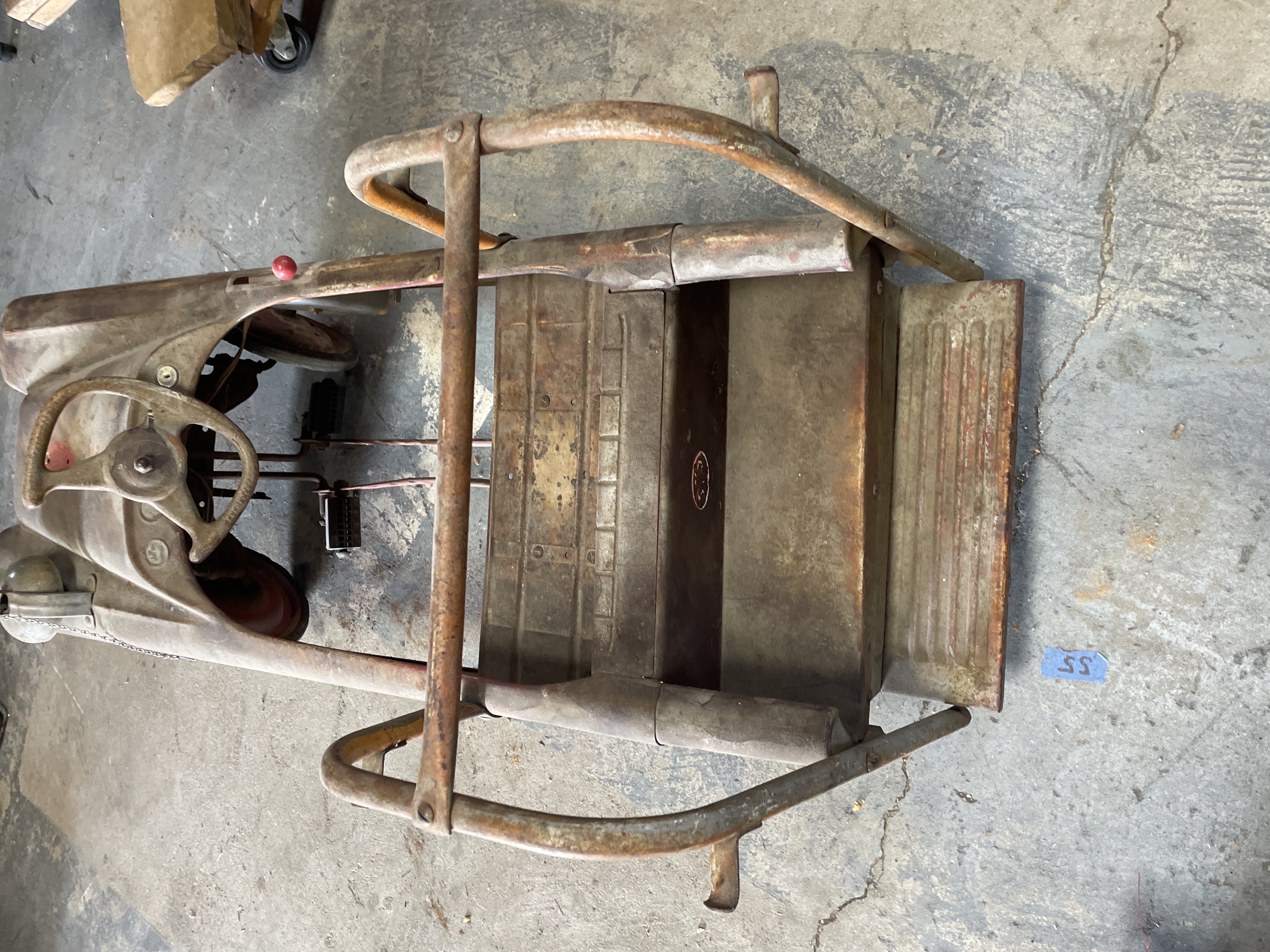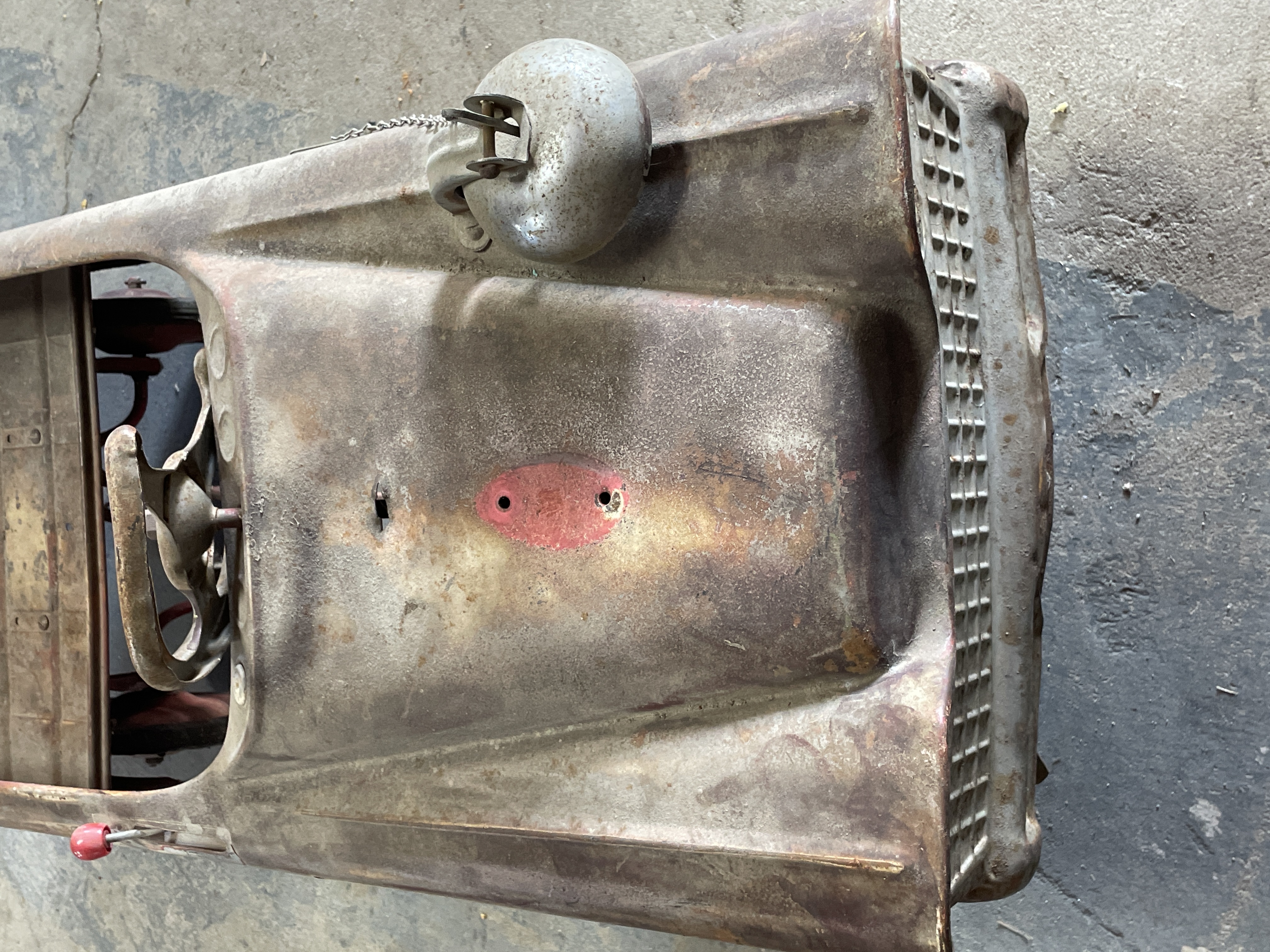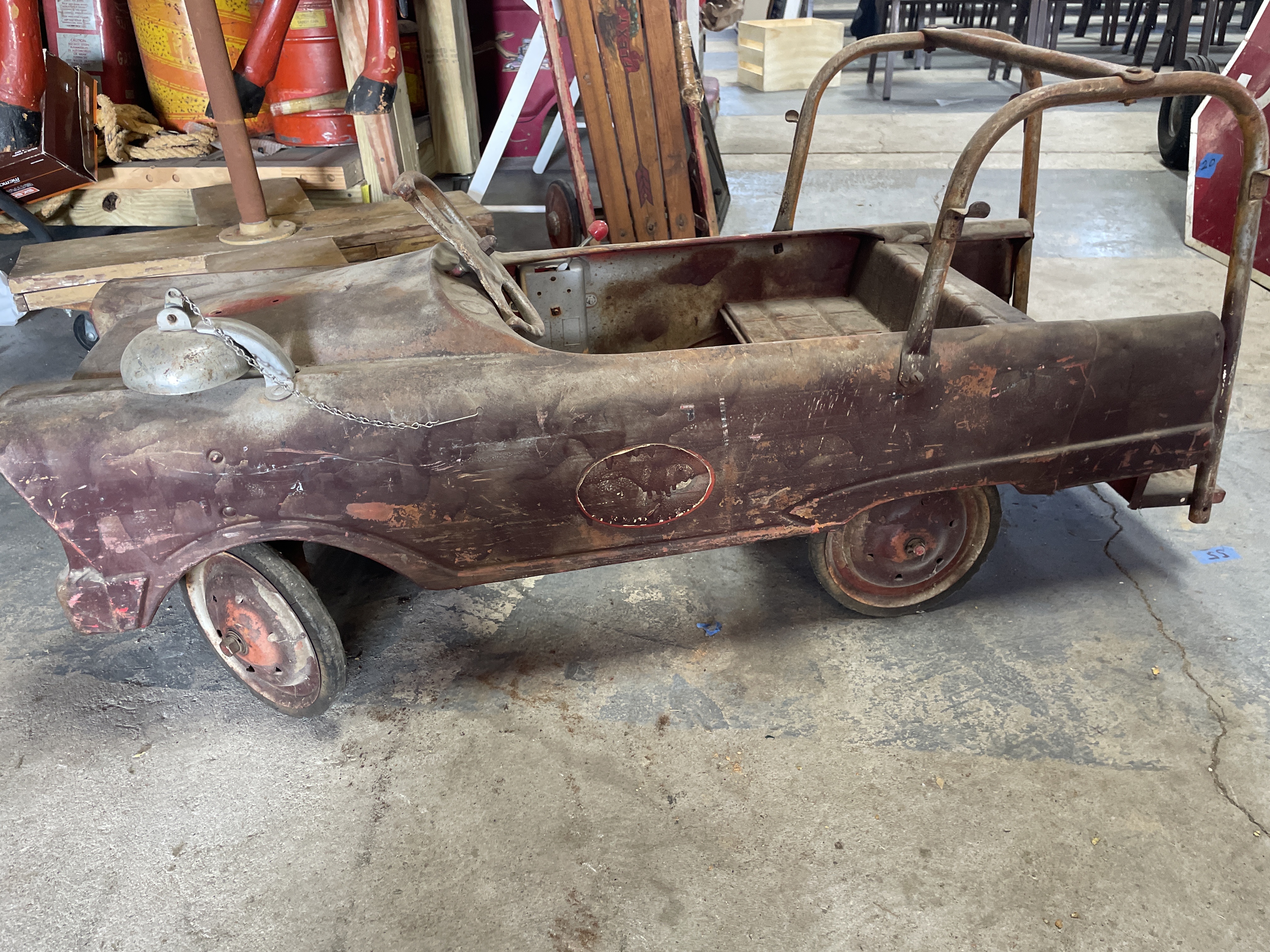 A vintage pressed steel pedal car attributed to the Murray company, styled after a mid-1950s American station wagon or tandem vehicle. The elongated body features a squared front end with a wide grille impression and dual headlight impressions. Constructed primarily of pressed steel, the car includes a four-spoke cast metal steering wheel, metal pedals, and four spoked metal wheels. The rear section is fitted with an attached metal seat assembly, characteristic of the Murray wagon models. Remnants of the original dark maroon or red paint are visible, particularly around a hood aperture and on the side body where an oval, stylized manufacturer’s decal is partially present but illegible. A small metal bell on a chain is attached near the hood.