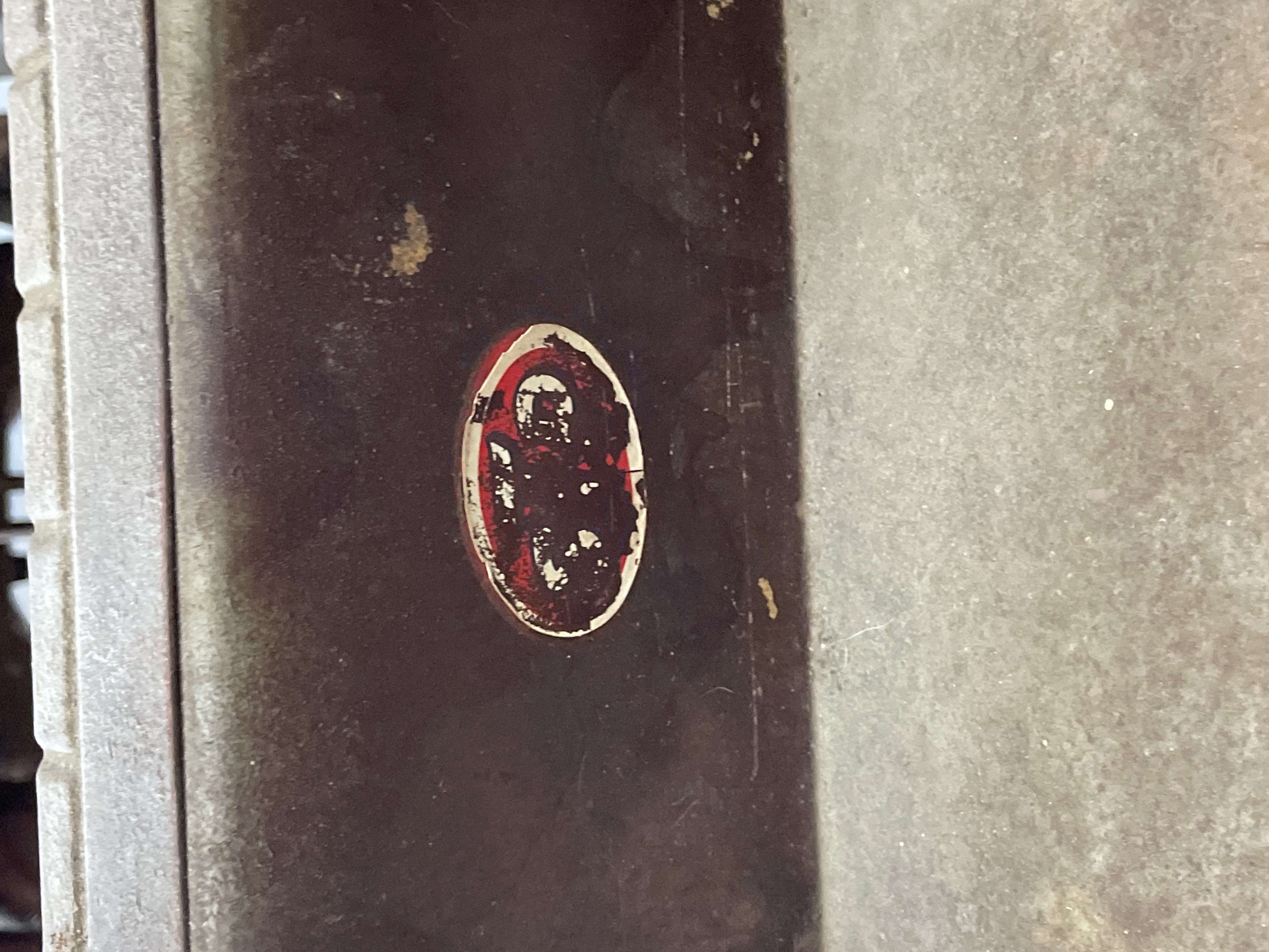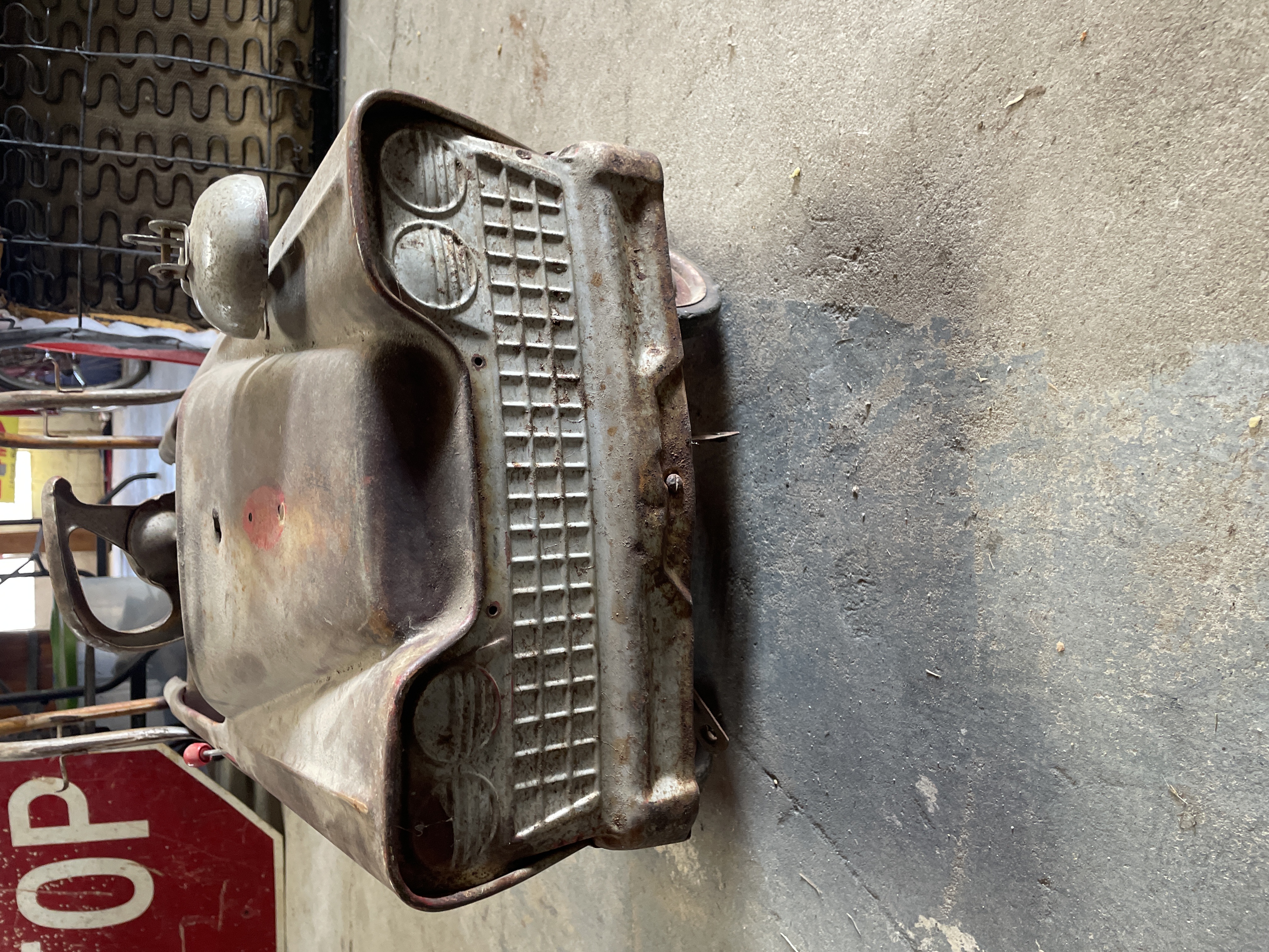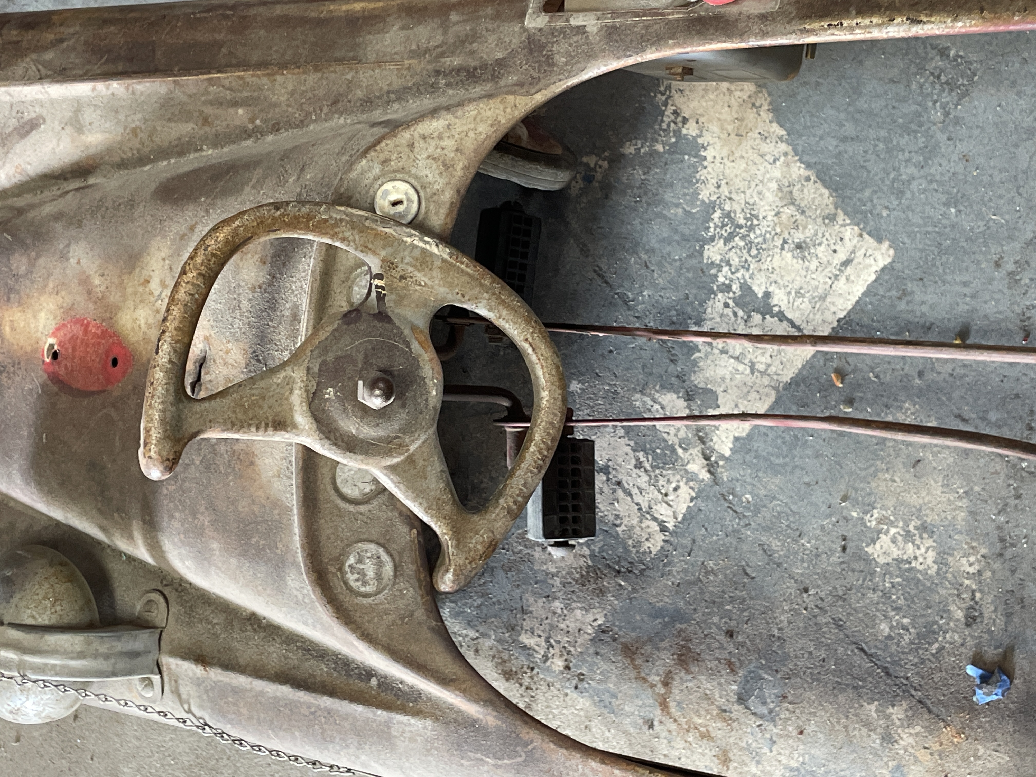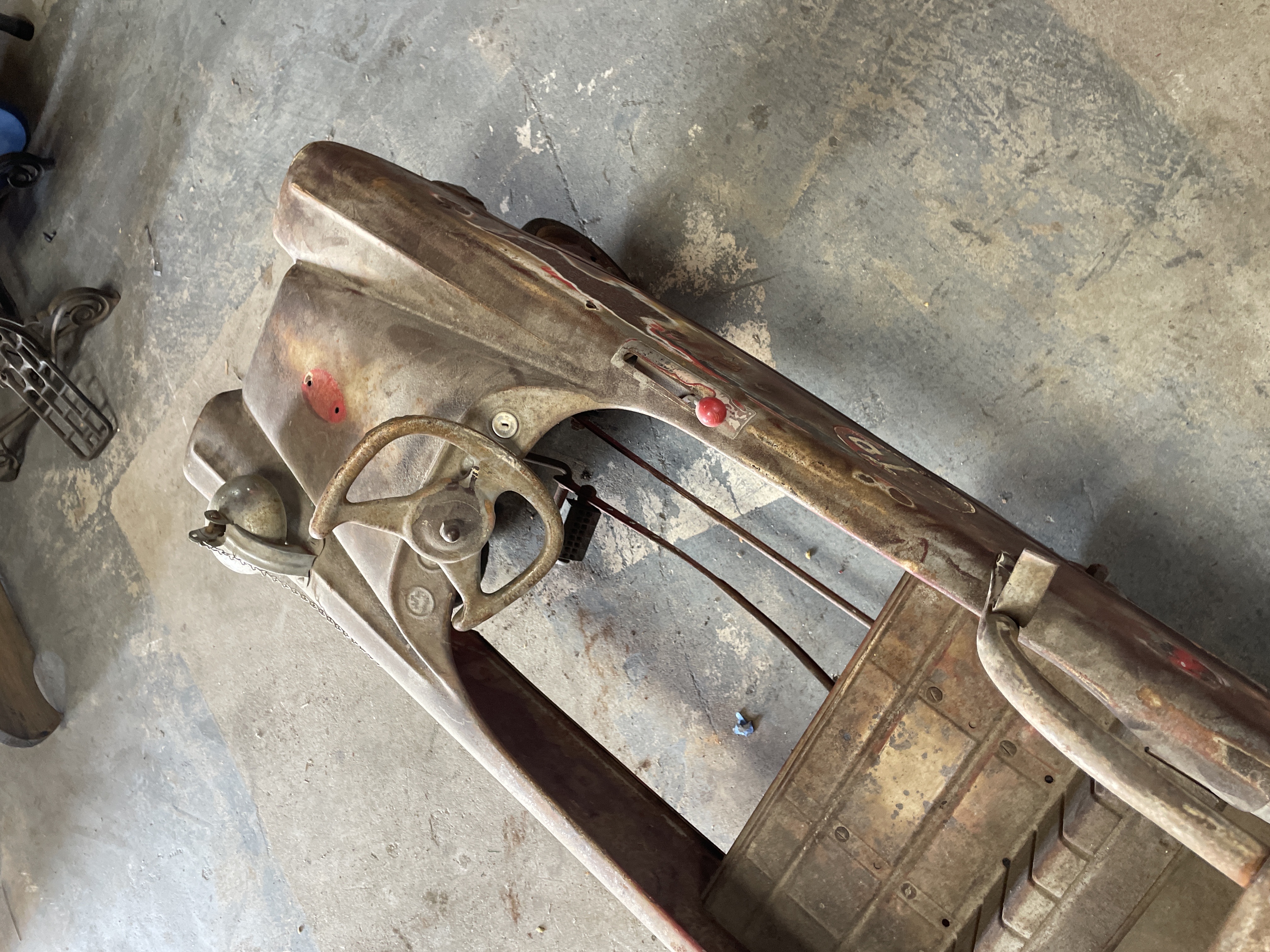 A vintage pressed steel pedal car attributed to the Murray company, styled after a mid-1950s American station wagon or tandem vehicle. The elongated body features a squared front end with a wide grille impression and dual headlight impressions. Constructed primarily of pressed steel, the car includes a four-spoke cast metal steering wheel, metal pedals, and four spoked metal wheels. The rear section is fitted with an attached metal seat assembly, characteristic of the Murray wagon models. Remnants of the original dark maroon or red paint are visible, particularly around a hood aperture and on the side body where an oval, stylized manufacturer’s decal is partially present but illegible. A small metal bell on a chain is attached near the hood.