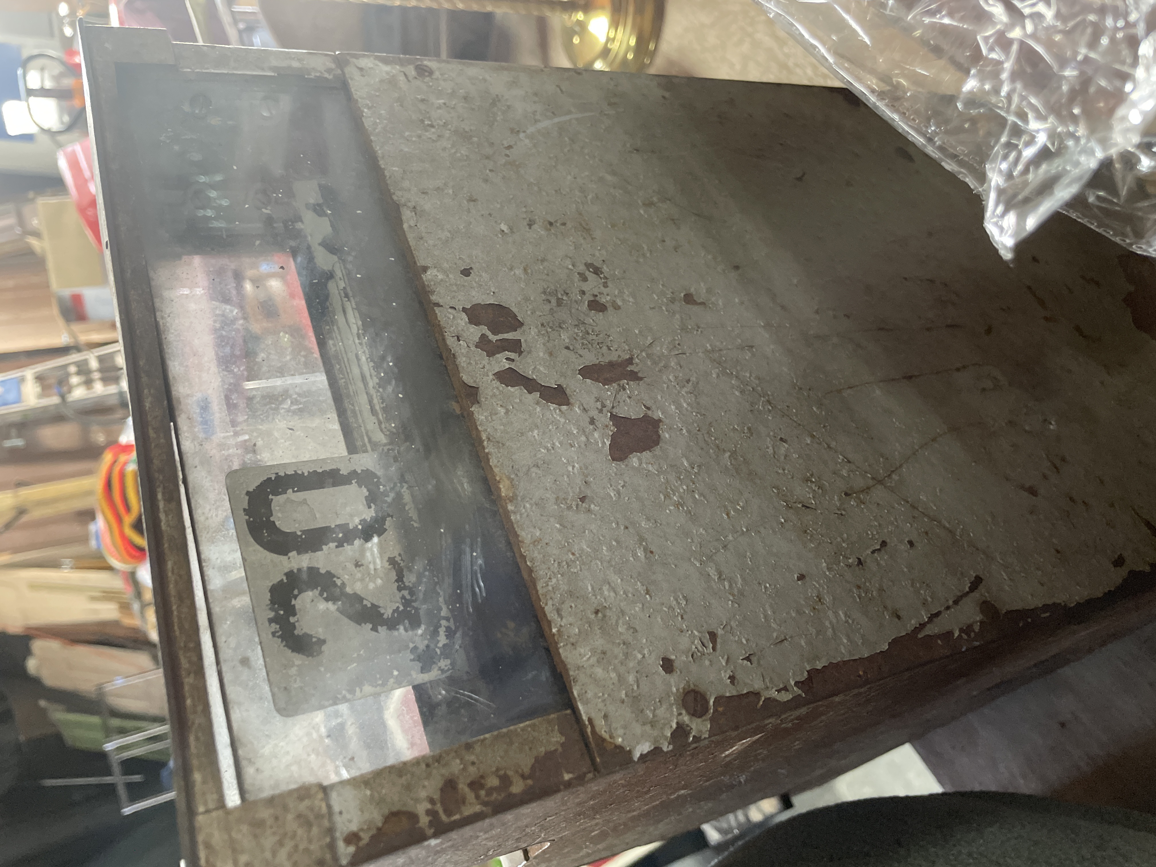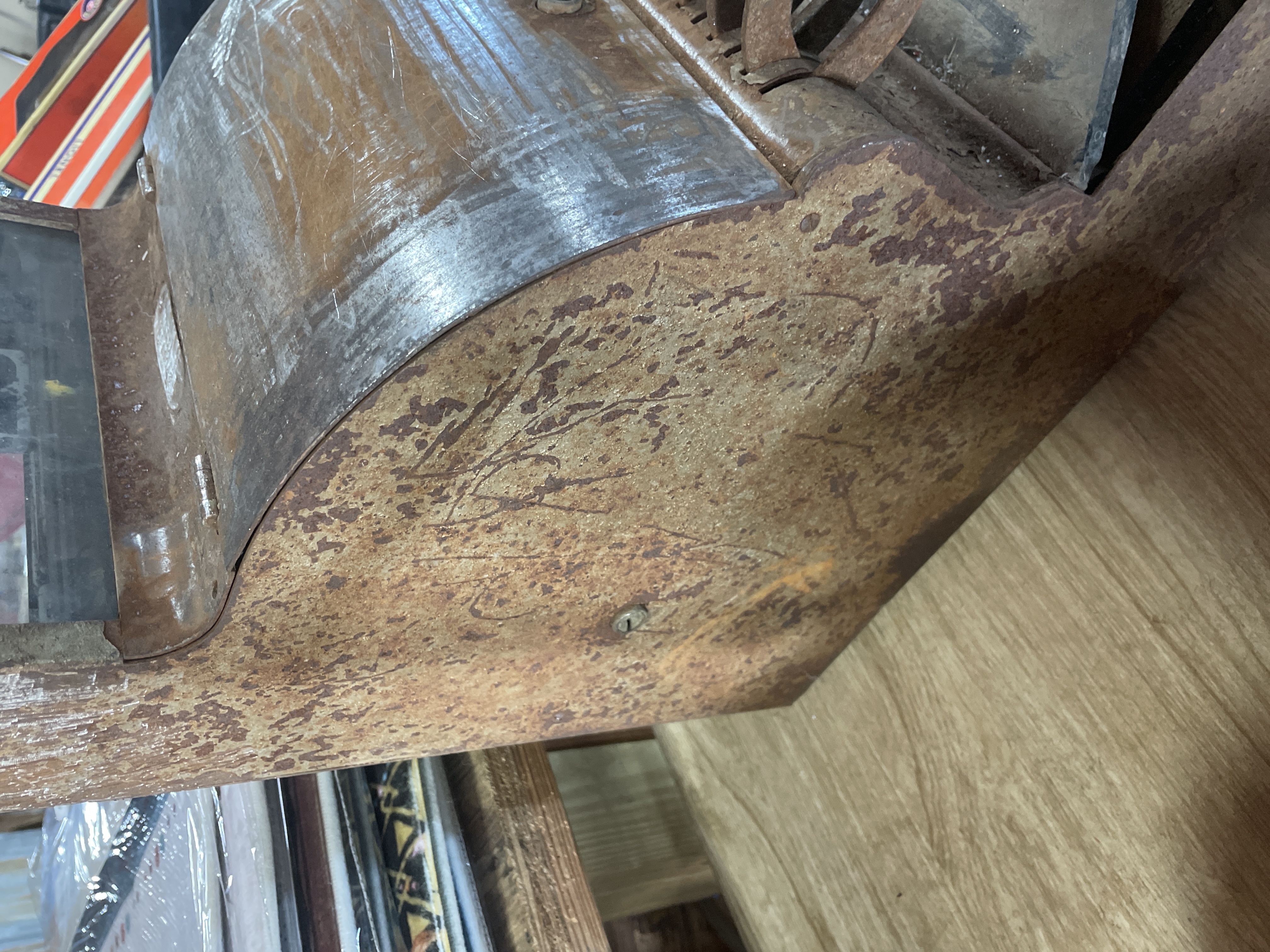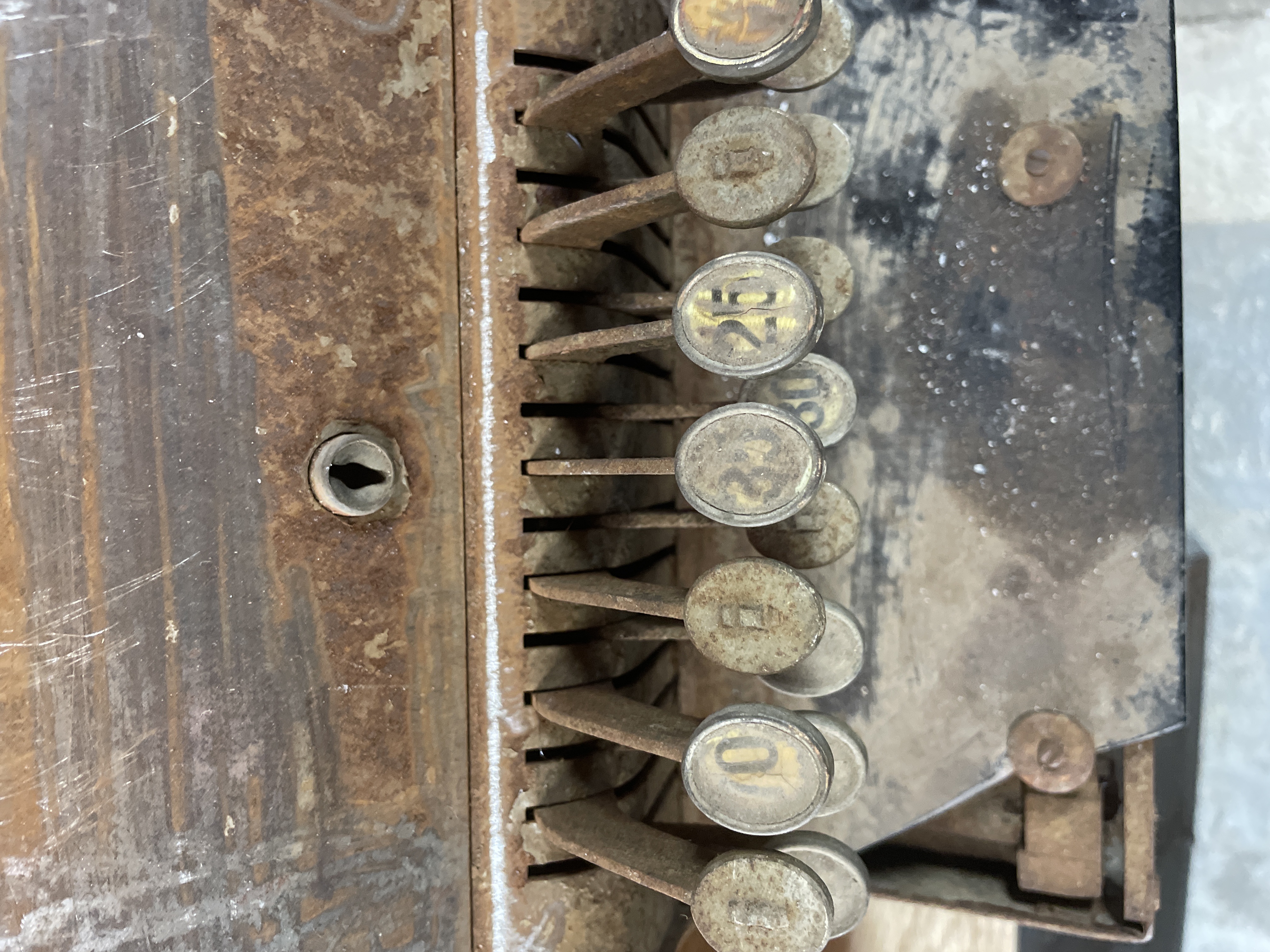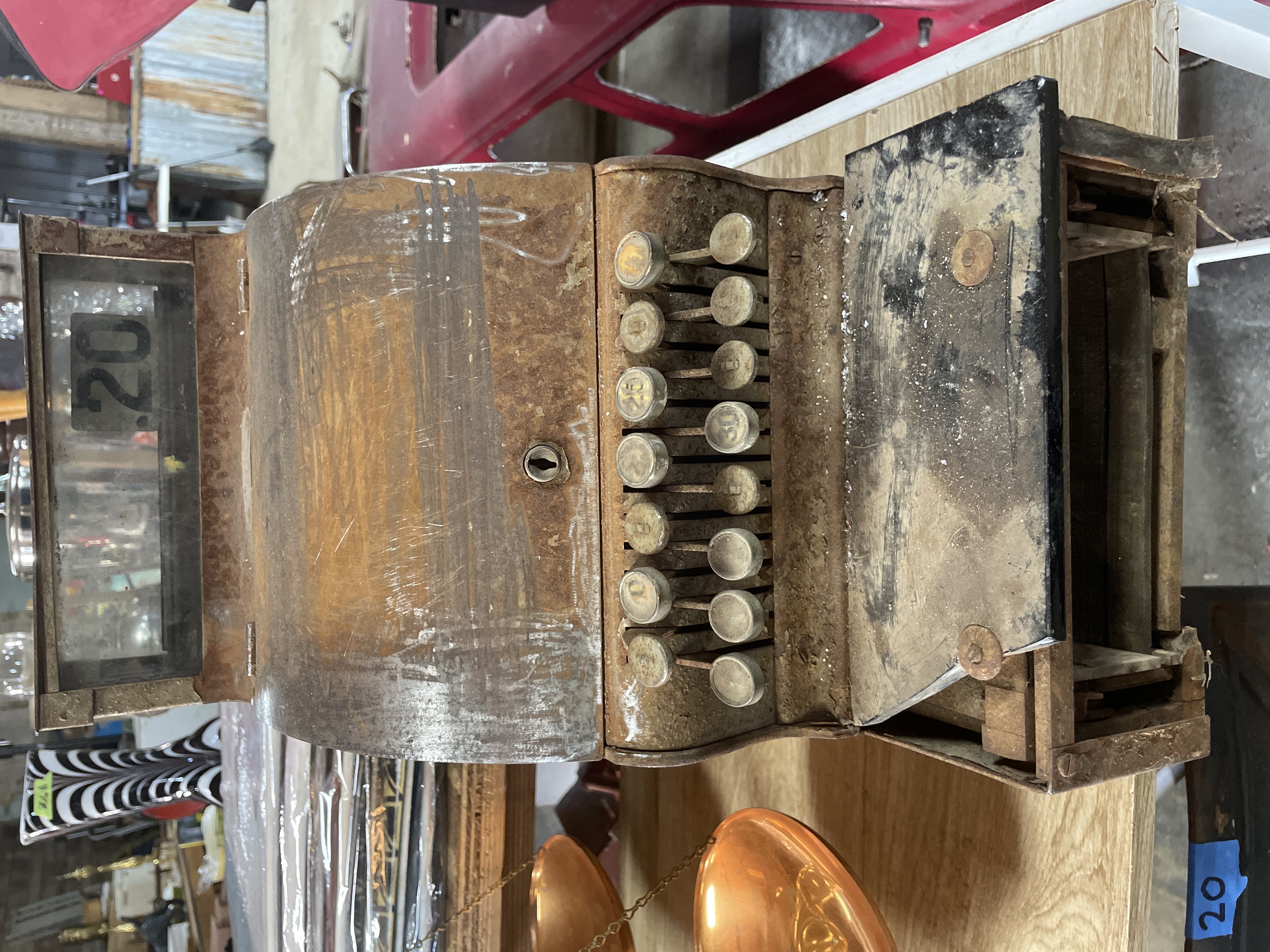 A single vintage mechanical cash register constructed of heavy gauge metal, likely steel or cast iron. The register features a domed top casing and a glass-enclosed display at the top, currently showing the number 20. The operating mechanism includes 16 visible keys arranged in two rows. Visible numerical values on the key tops include 0, 1, 5, 10, 20, 25, 50, and 100. The front includes a visible, open cash drawer compartment. An identification plate is affixed to the frame, stamped with the numbers 2909 and 717.