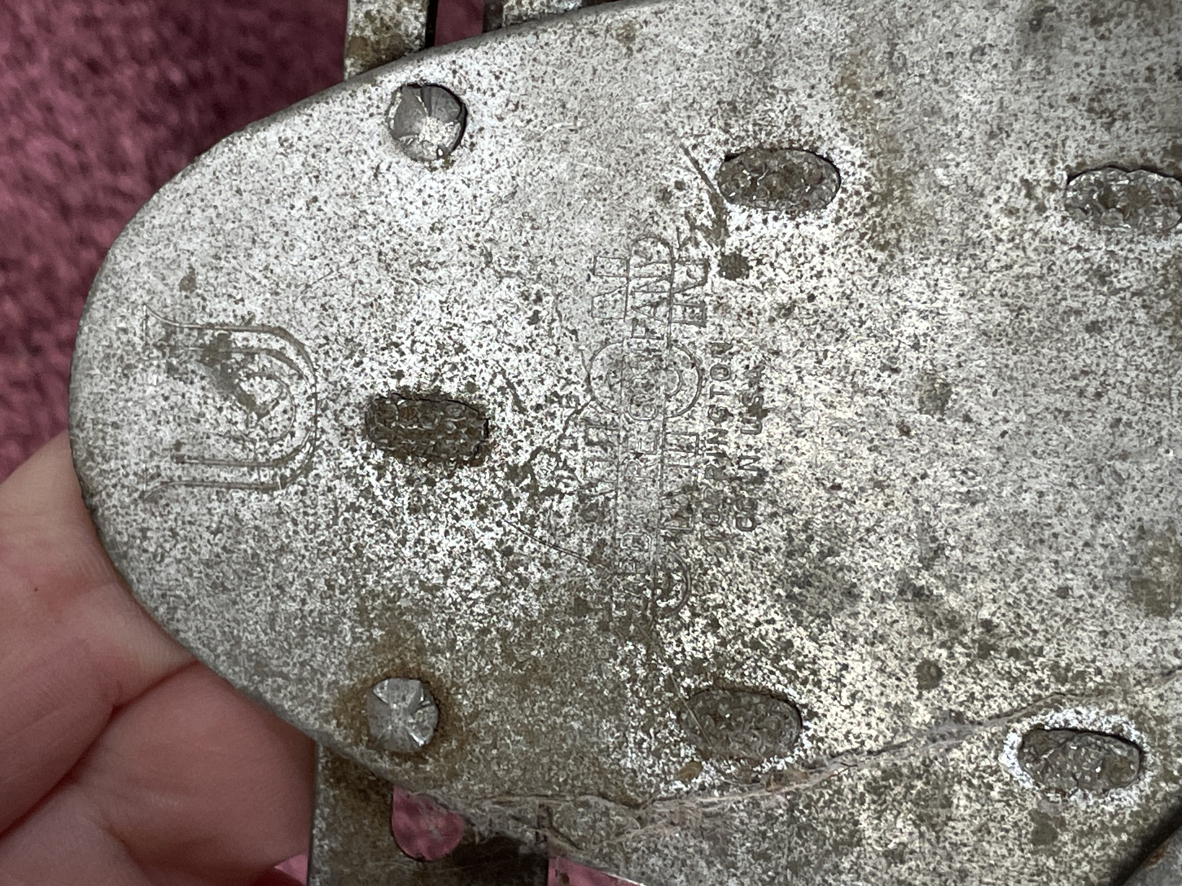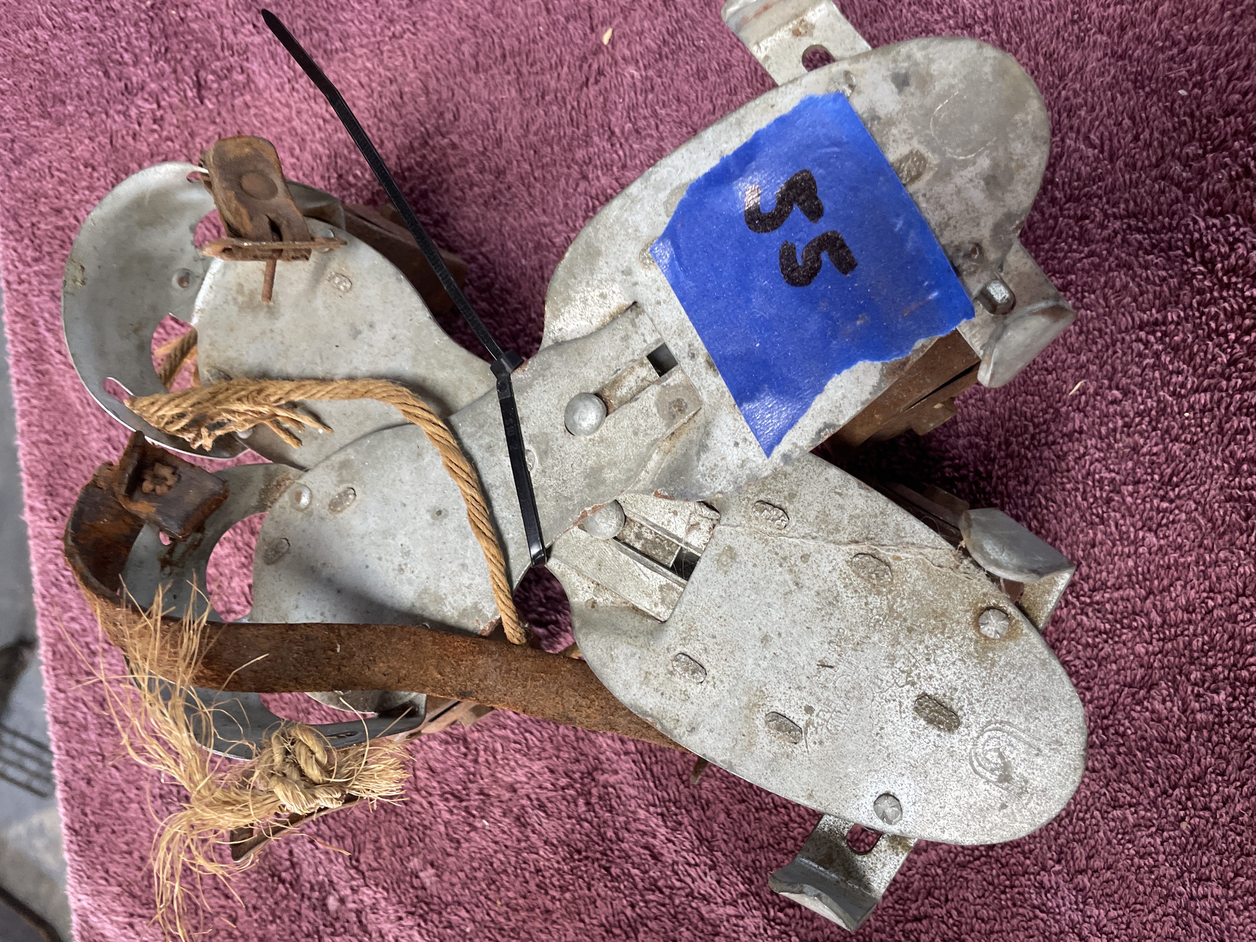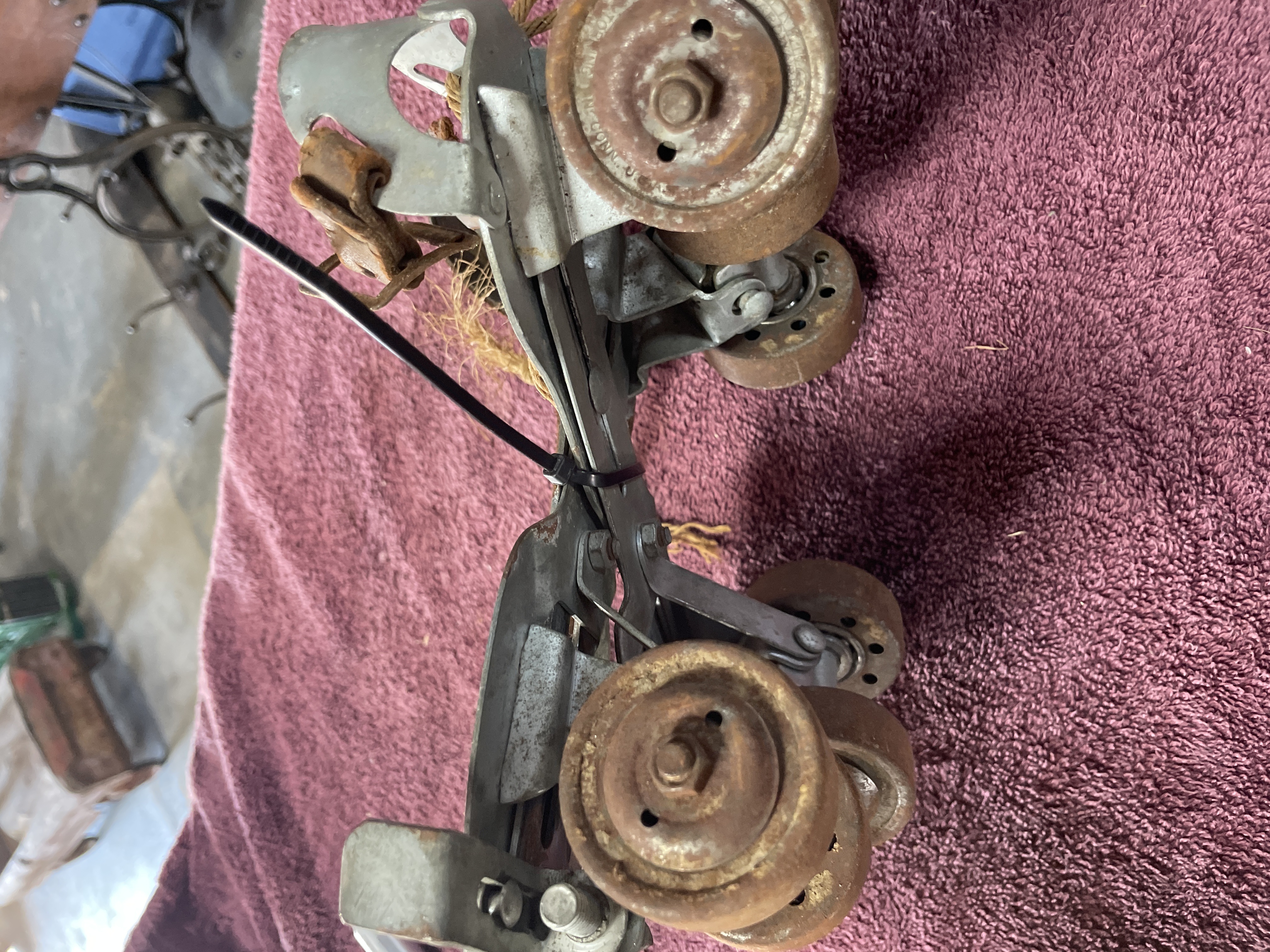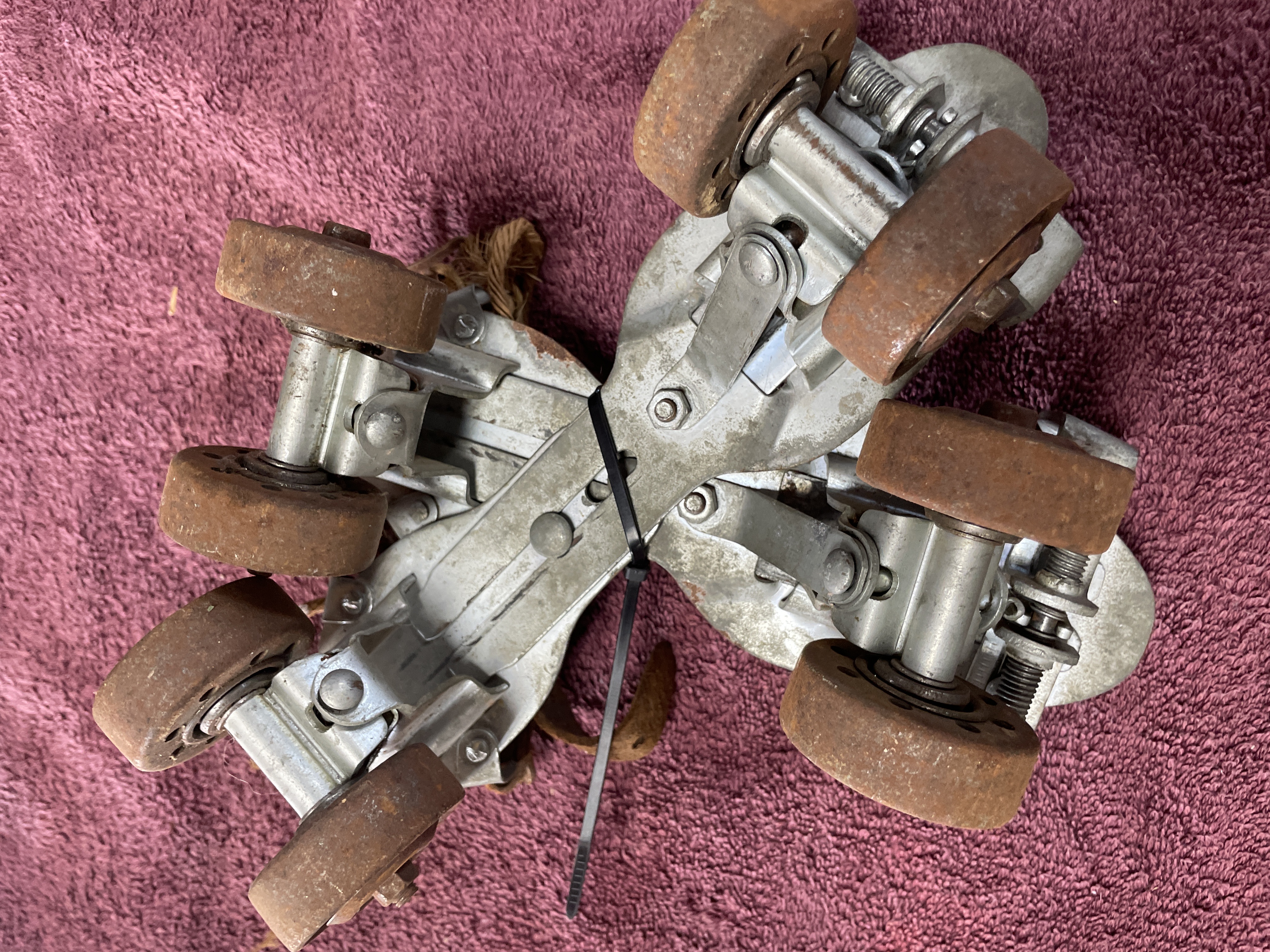 A pair of adjustable clamp-on roller skates attributed to the Union Hardware Company, based on consistent market identification. The skates are constructed from plated metal frames with four solid composite or heavily rusted metal wheels per skate. The adjustable design is typical of early to mid-20th-century sidewalk skates. Impressed markings are visible on the top plate of one skate, including an obscured shield or crest logo, and legible text reading “WASHINGTON” and “MADE IN U.S.A.” The underside of one skate bears a blue sticker marked “55.”