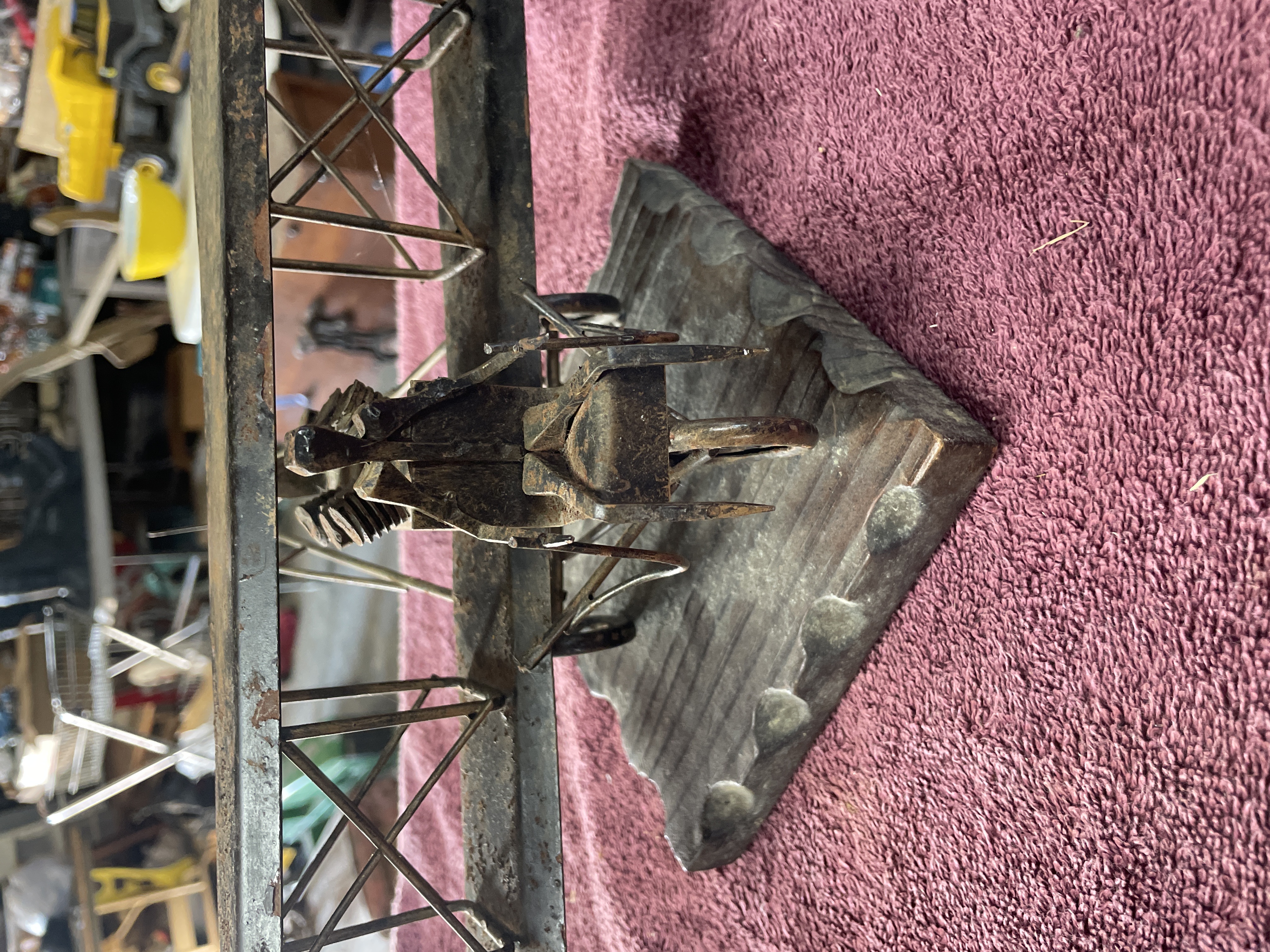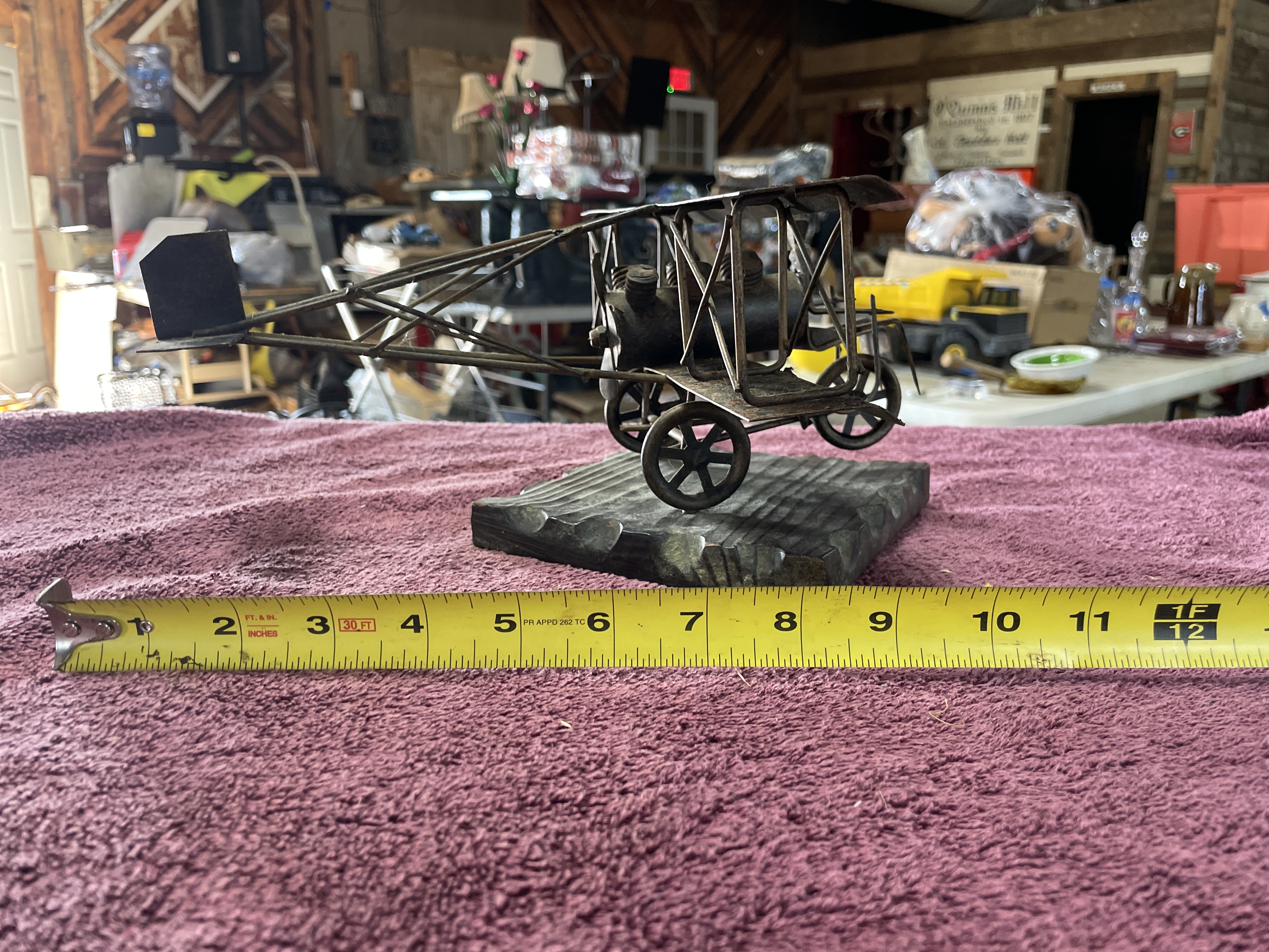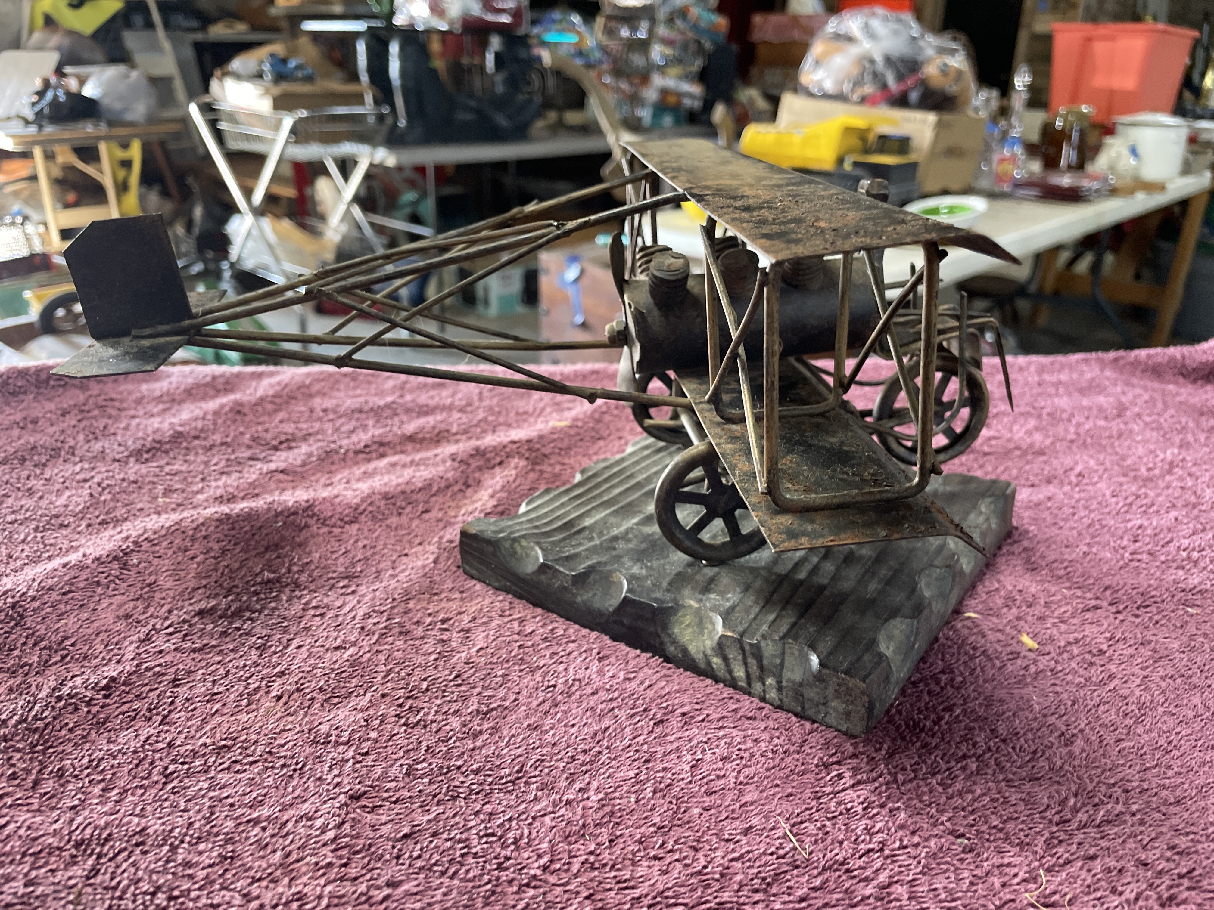 A single piece of folk art sculpture depicting an early 20th-century style biplane. The model is constructed primarily from various ferrous metal components, including rusted sheet metal used for the wings and tail fin, bent wire forming the structural supports and rigging, and cylindrical metal pieces assembled to represent a rudimentary engine block. The aircraft features a four-wheeled undercarriage and includes a simplistic pilot figure constructed from bent metal pieces seated in the cockpit. The entire metal structure is mounted securely on a dark-stained, rectangular wooden base. The base features deep, parallel diagonal grooves carved across its surface. No manufacturer’s marks or inscriptions are visible.
