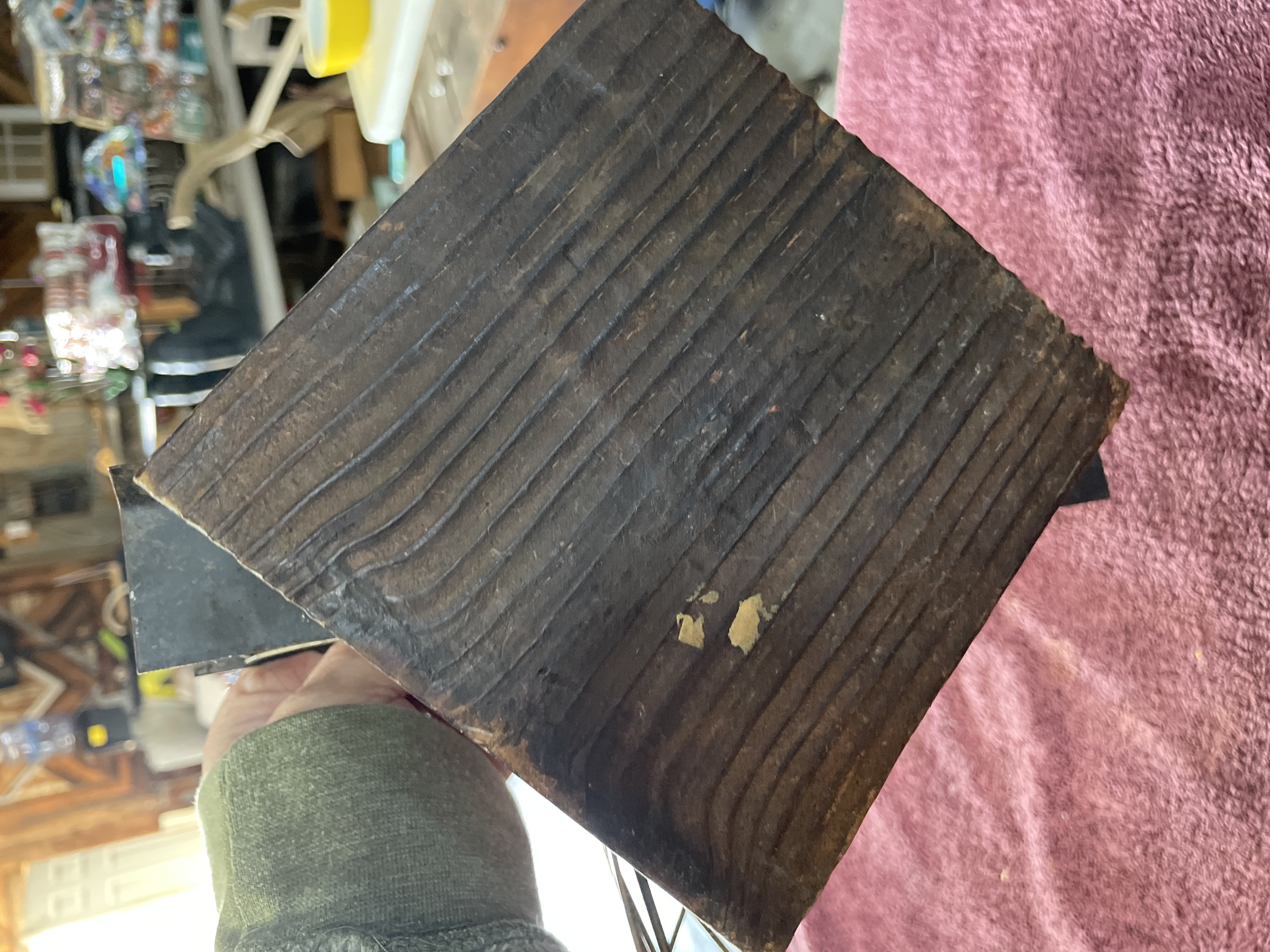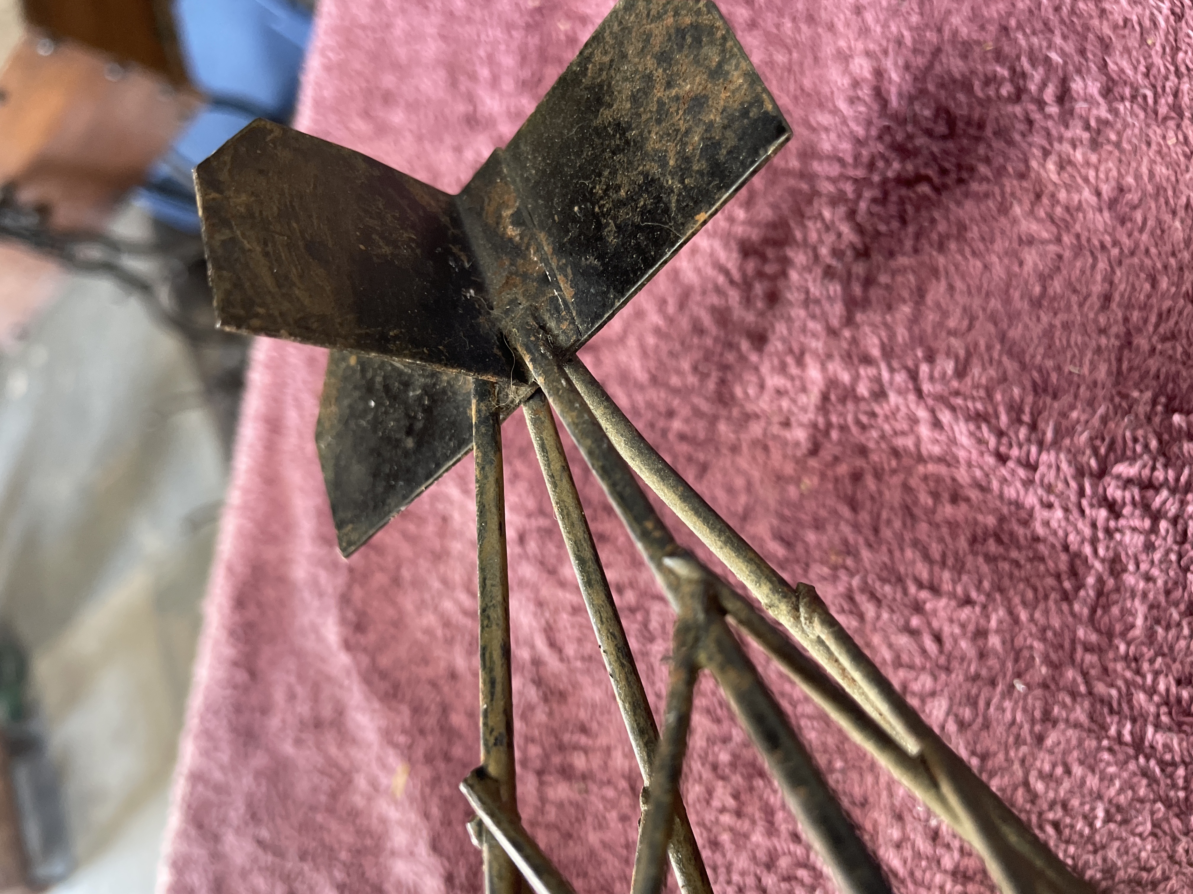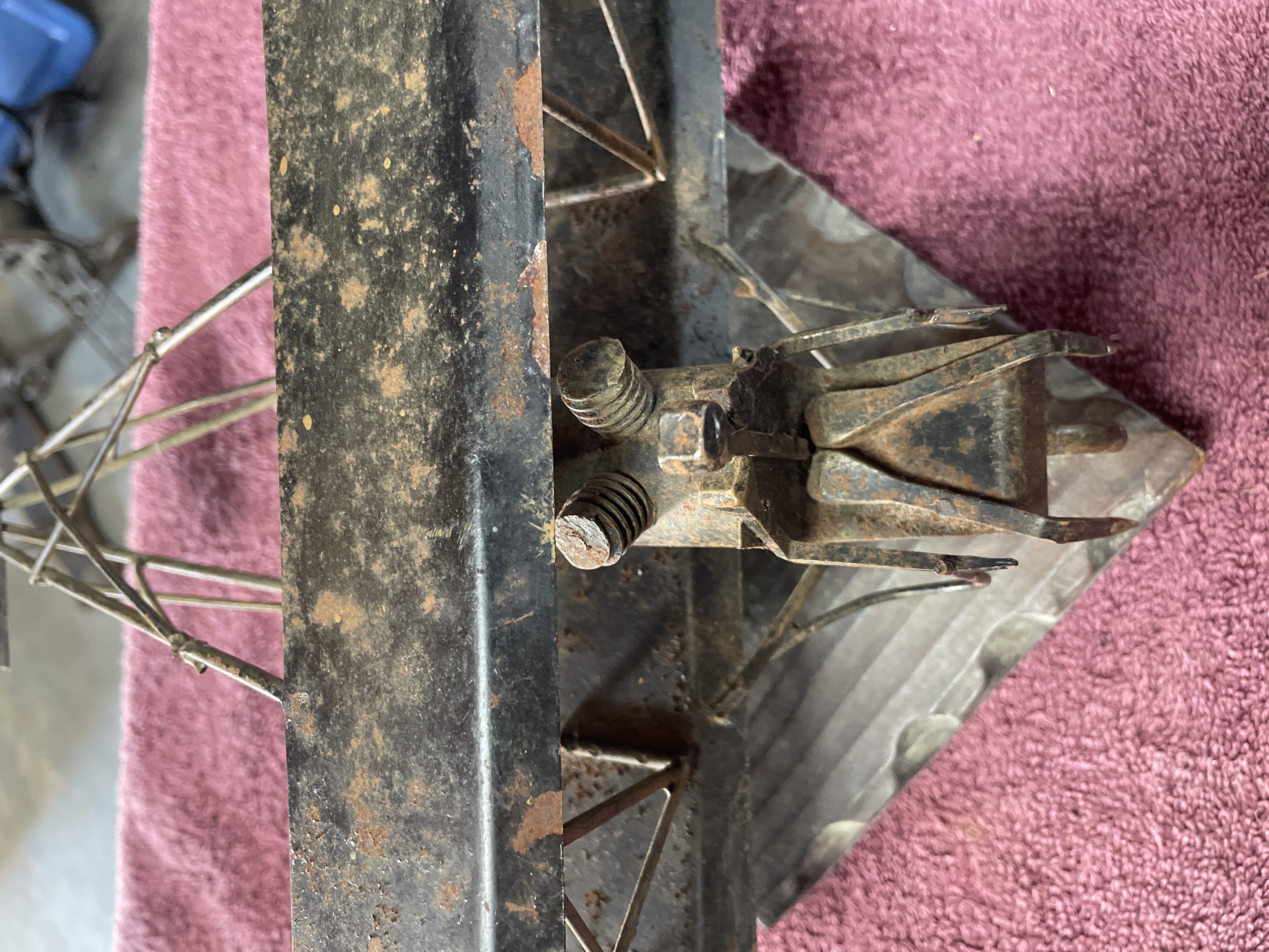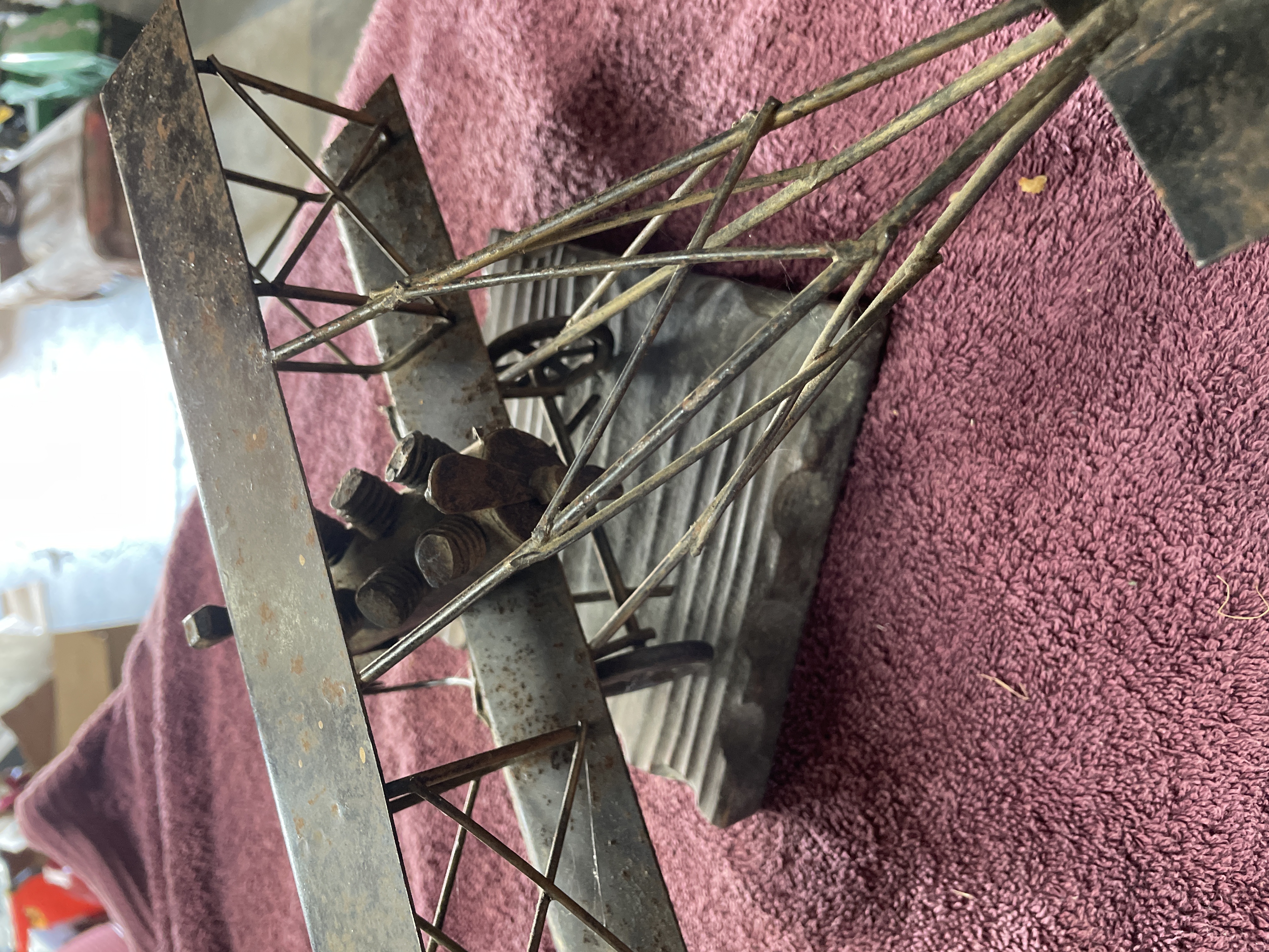 A single piece of folk art sculpture depicting an early 20th-century style biplane. The model is constructed primarily from various ferrous metal components, including rusted sheet metal used for the wings and tail fin, bent wire forming the structural supports and rigging, and cylindrical metal pieces assembled to represent a rudimentary engine block. The aircraft features a four-wheeled undercarriage and includes a simplistic pilot figure constructed from bent metal pieces seated in the cockpit. The entire metal structure is mounted securely on a dark-stained, rectangular wooden base. The base features deep, parallel diagonal grooves carved across its surface. No manufacturer’s marks or inscriptions are visible.