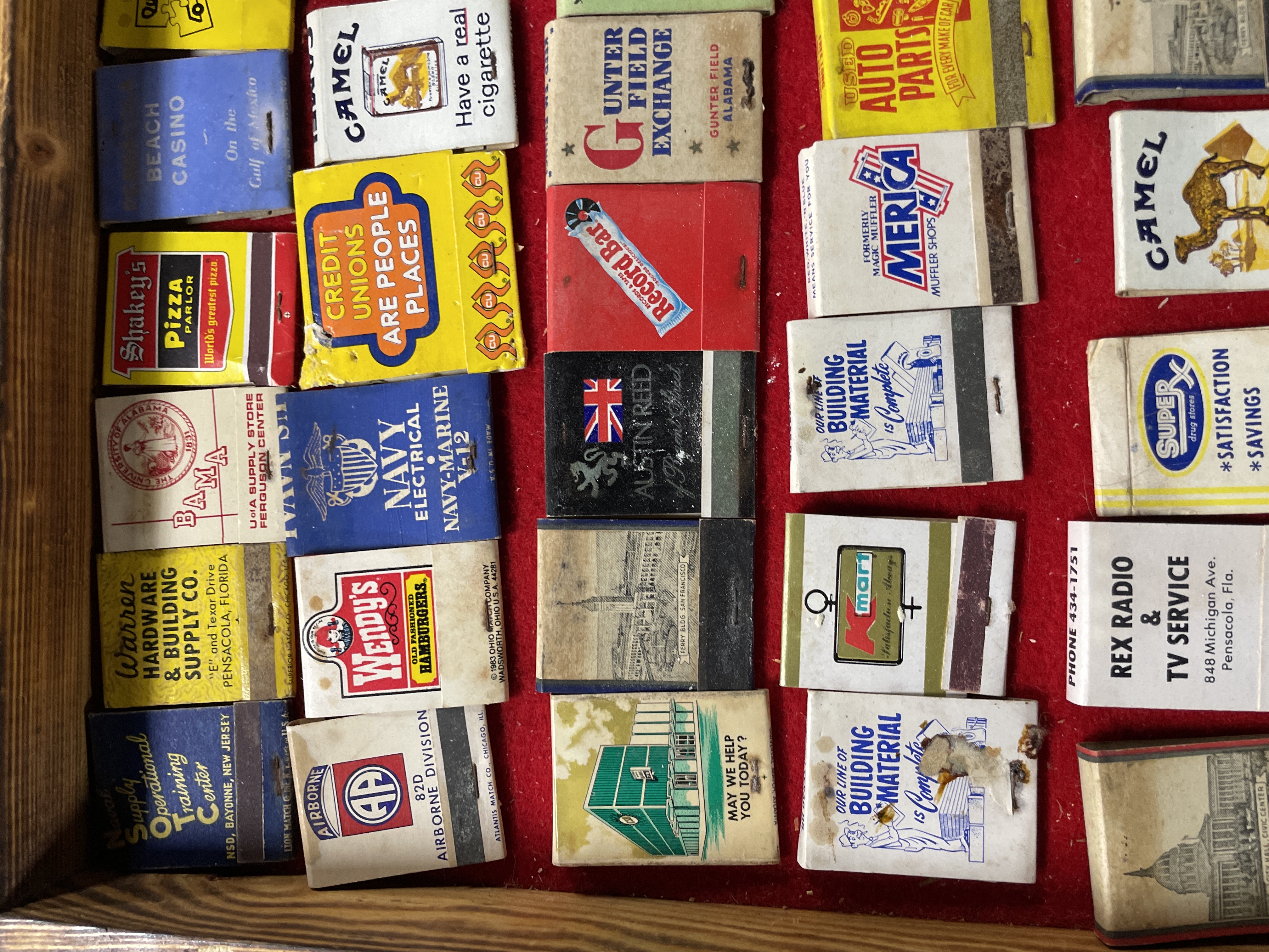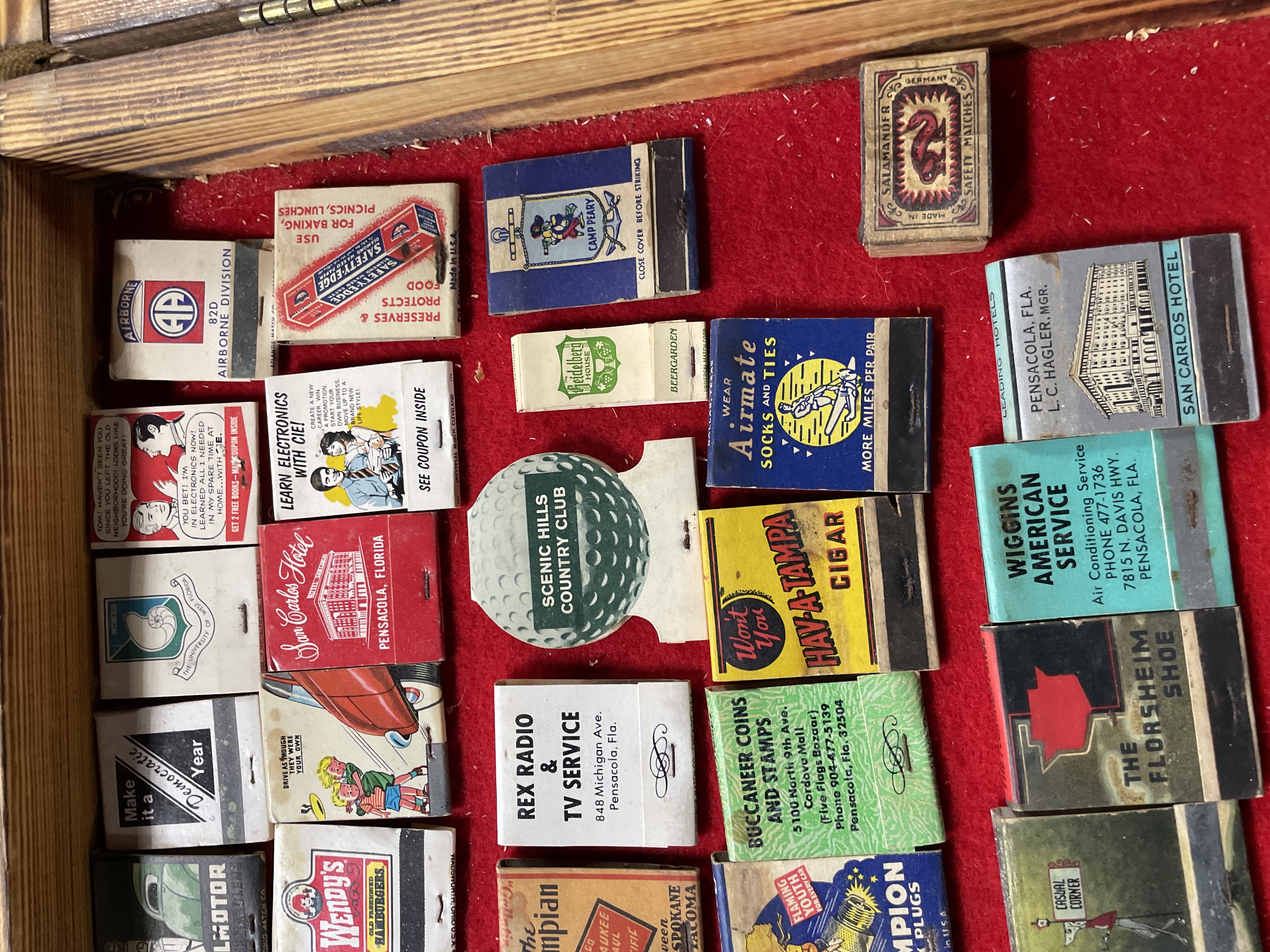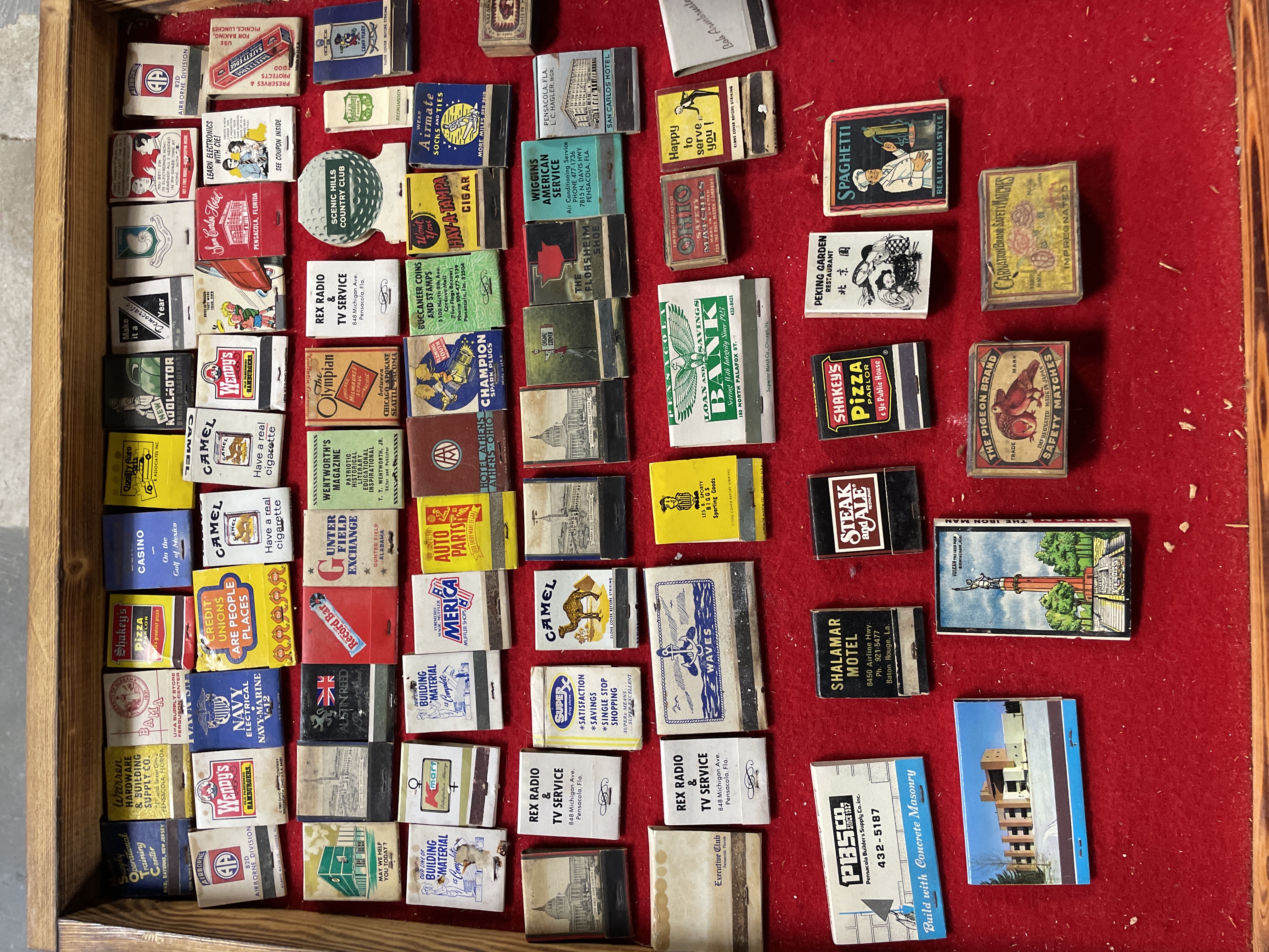 A collection of 77 vintage advertising matchbooks and matchboxes, characteristic of mid-to-late 20th-century American commercial design. The items are constructed from paper and cardboard ephemera and are displayed within a wooden case lined with red felt. The collection features a mix of regional and national advertisements, including photorealistic depictions of buildings (such as the US Capitol and the San Carlos Hotel) and colorful graphics and logos. Many items advertise businesses referencing Pensacola, Florida (e.g., Rex Radio & TV Service, Pensacola Builders Supply), alongside national brands (Camel, Wendy’s, Shakey’s Pizza, K-Mart, Champion Spark Plugs). The lot also includes military references (82D Airborne Division, Navy Electrical) and one item displaying Chinese characters for “Peking Garden” (景園). Novelty items include one golf ball-shaped matchbook (Scenic Hills Country Club) and two postcard-style cardboard covers.
