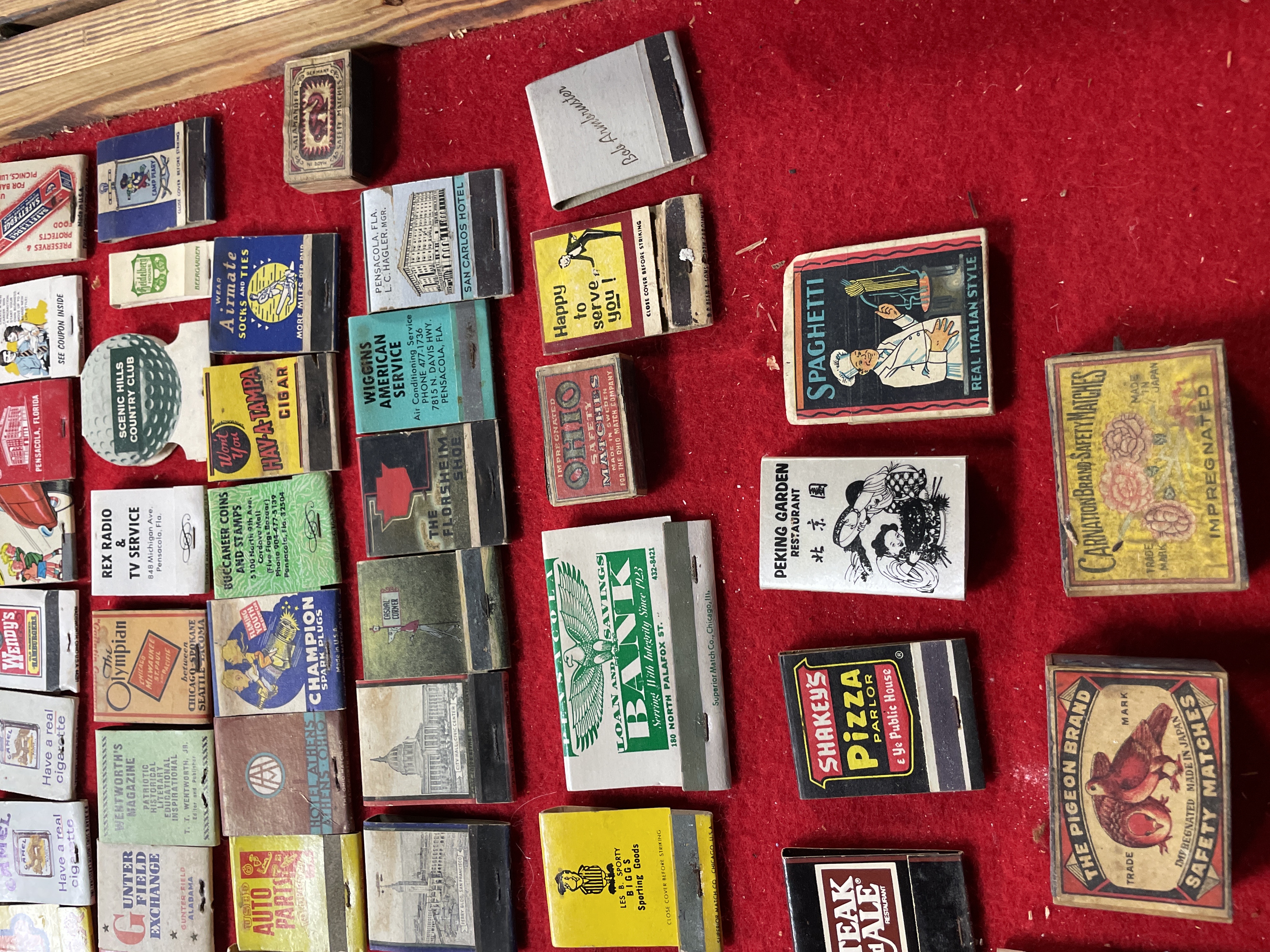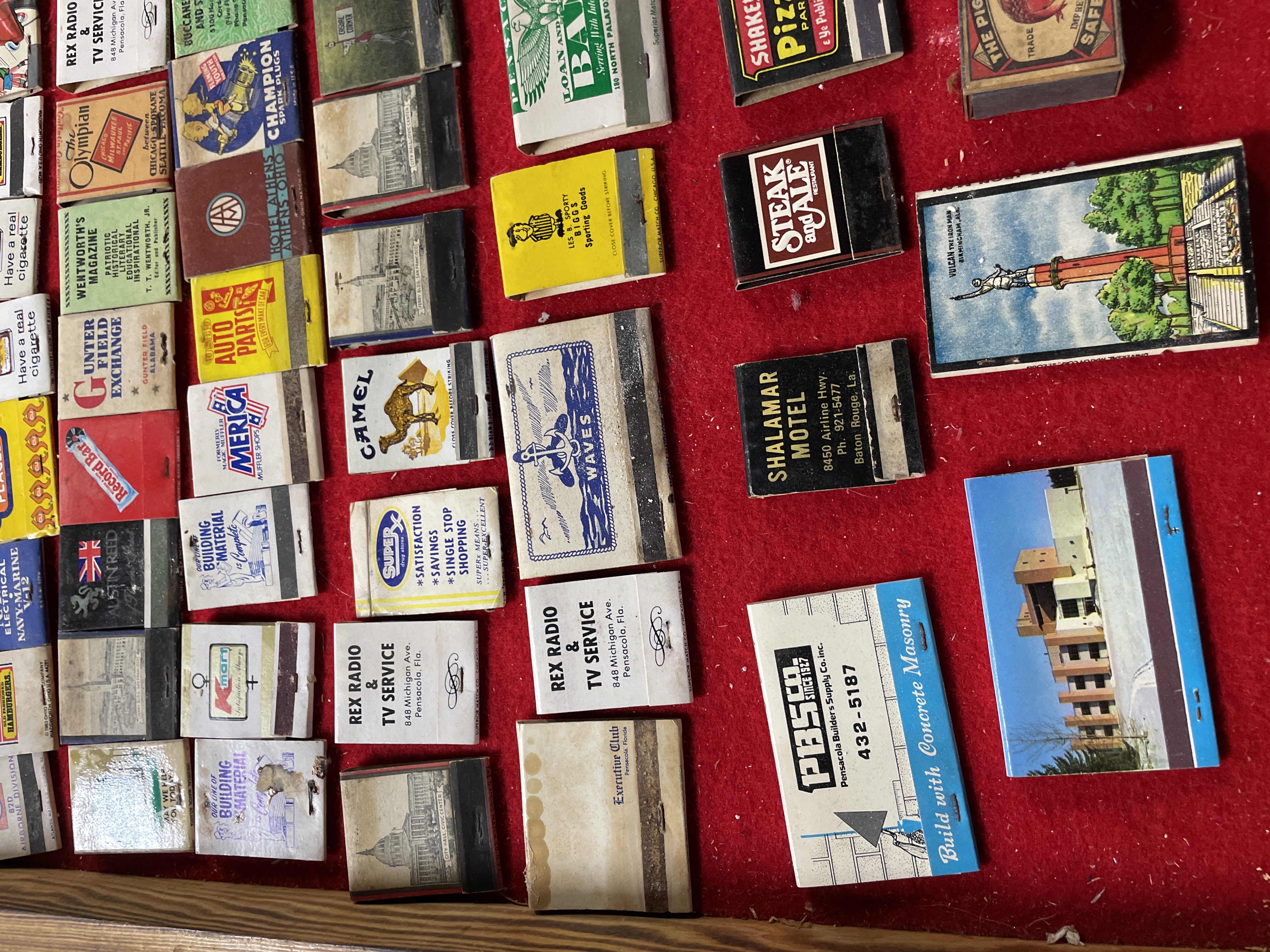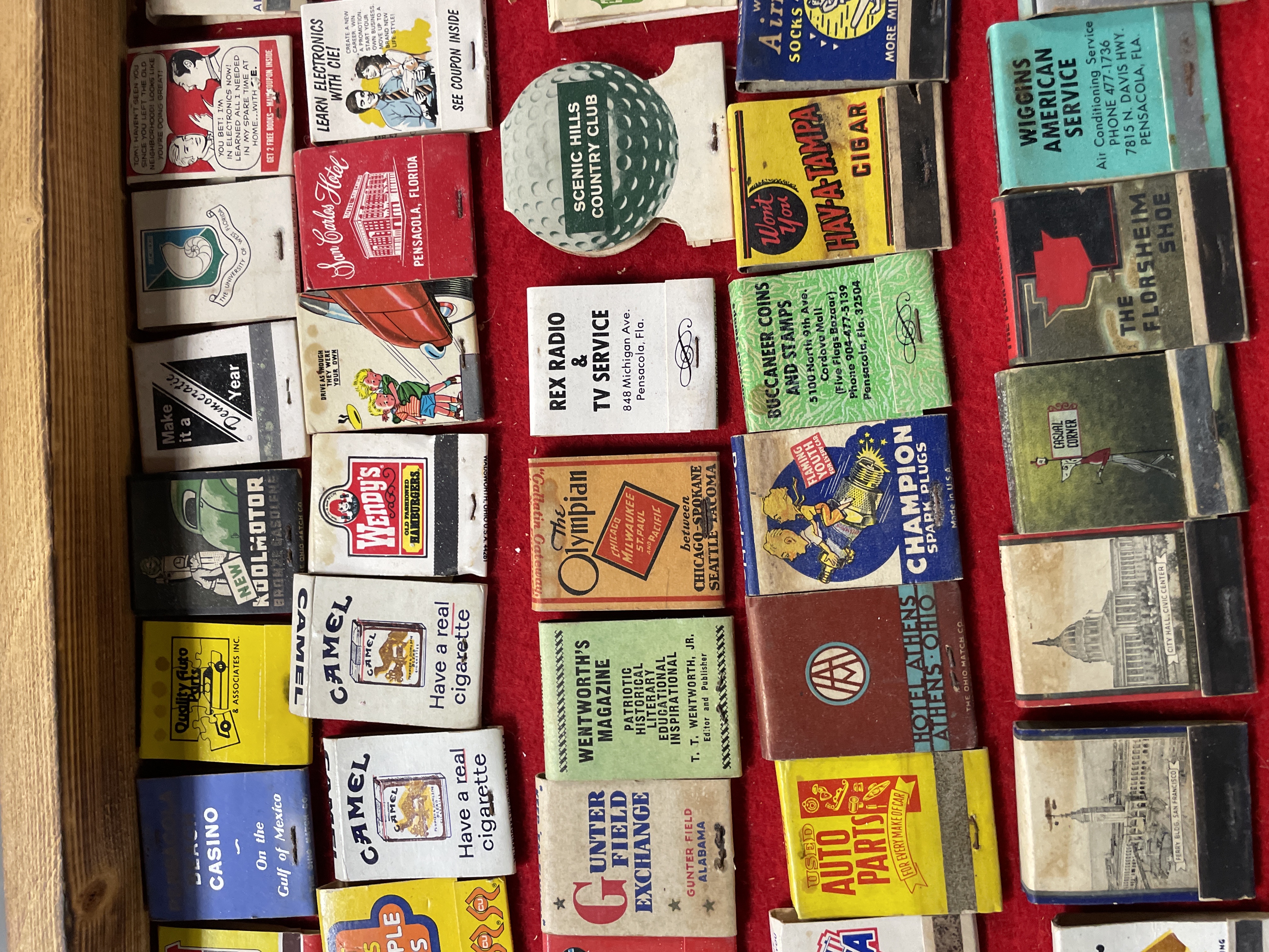 A collection of 77 vintage advertising matchbooks and matchboxes, characteristic of mid-to-late 20th-century American commercial design. The items are constructed from paper and cardboard ephemera and are displayed within a wooden case lined with red felt. The collection features a mix of regional and national advertisements, including photorealistic depictions of buildings (such as the US Capitol and the San Carlos Hotel) and colorful graphics and logos. Many items advertise businesses referencing Pensacola, Florida (e.g., Rex Radio & TV Service, Pensacola Builders Supply), alongside national brands (Camel, Wendy’s, Shakey’s Pizza, K-Mart, Champion Spark Plugs). The lot also includes military references (82D Airborne Division, Navy Electrical) and one item displaying Chinese characters for “Peking Garden” (景園). Novelty items include one golf ball-shaped matchbook (Scenic Hills Country Club) and two postcard-style cardboard covers.
