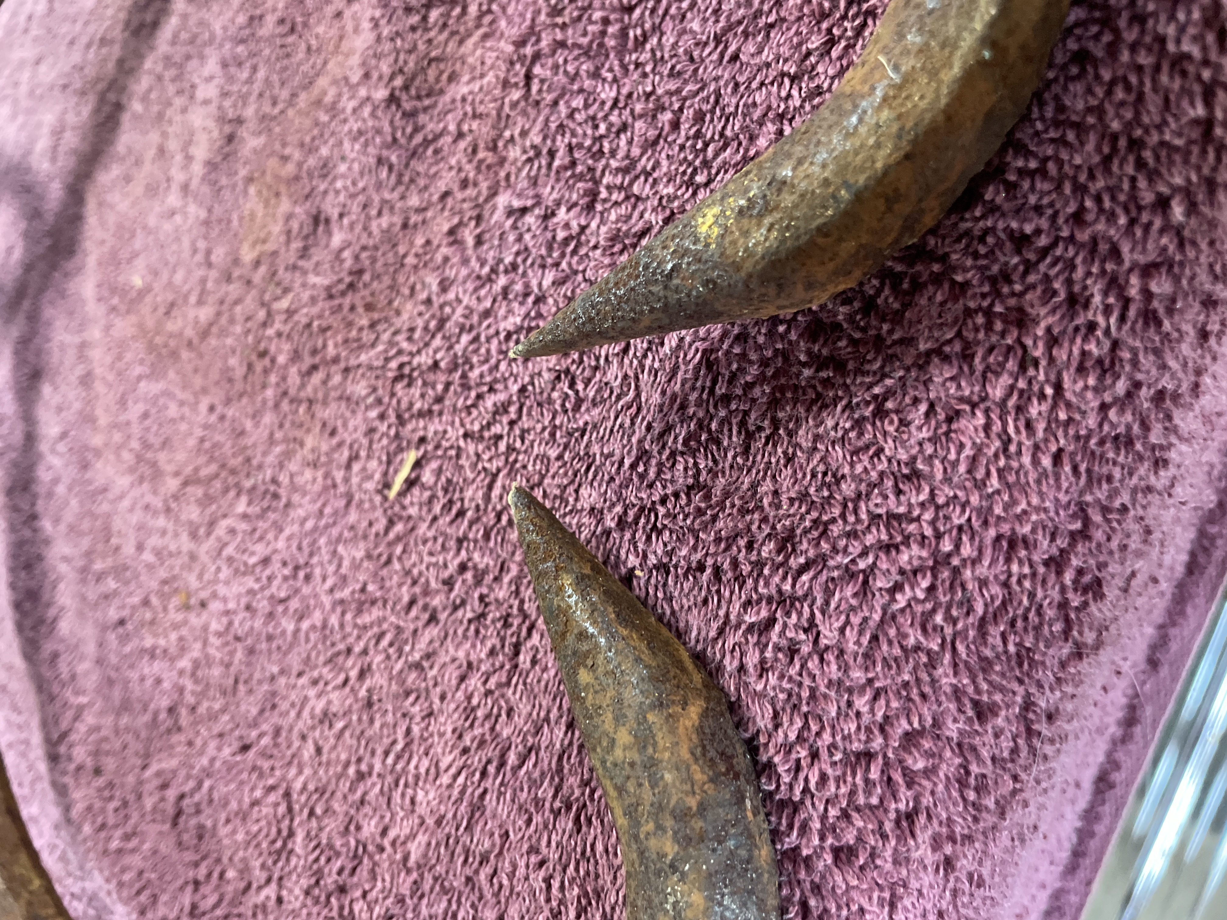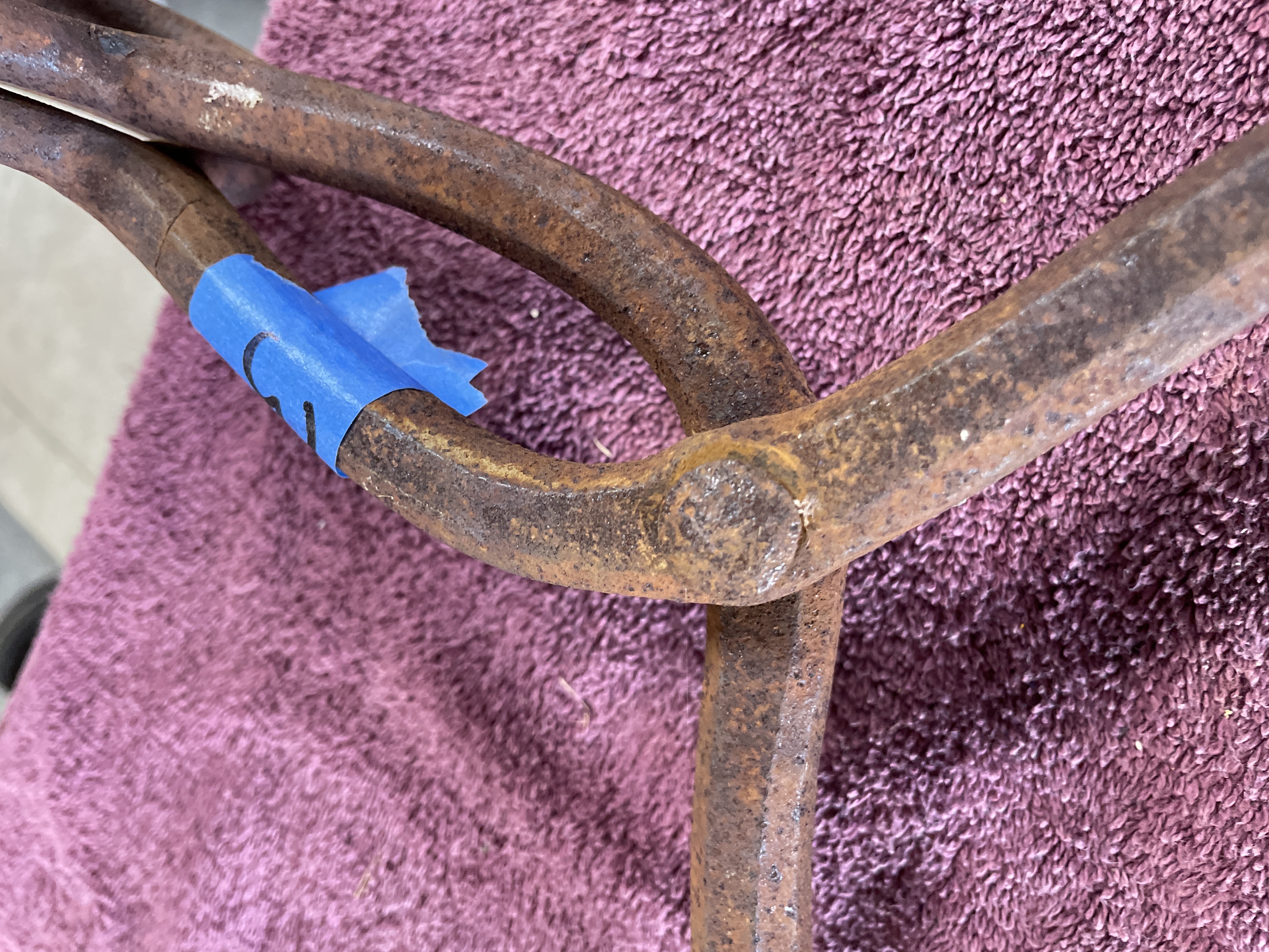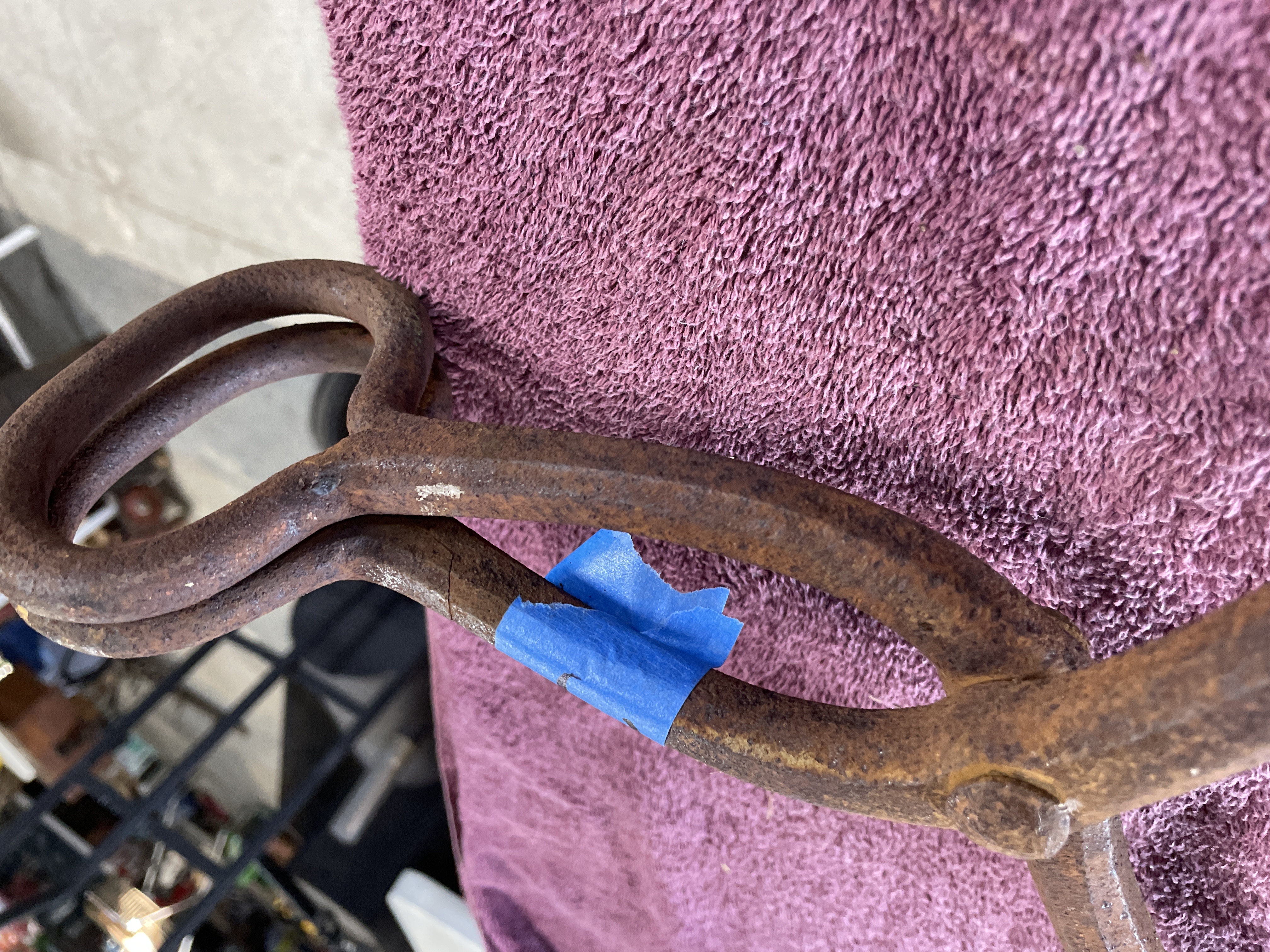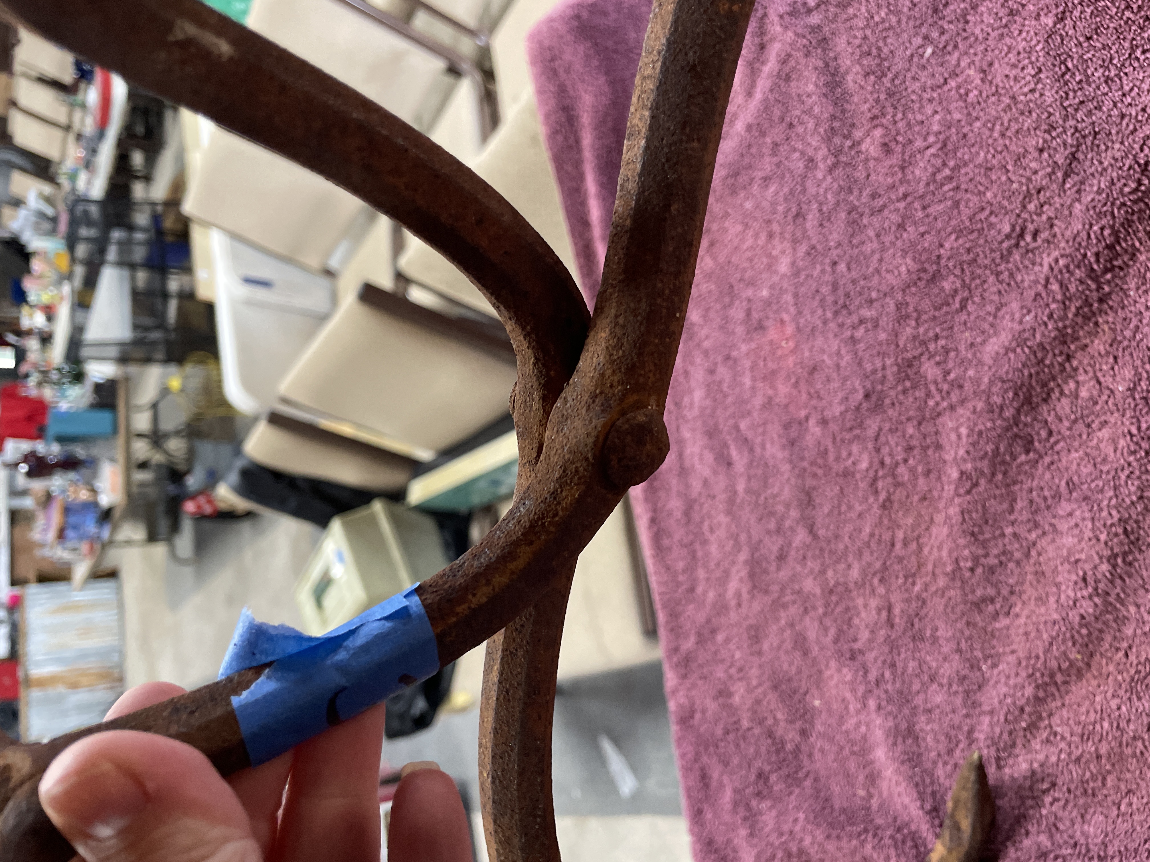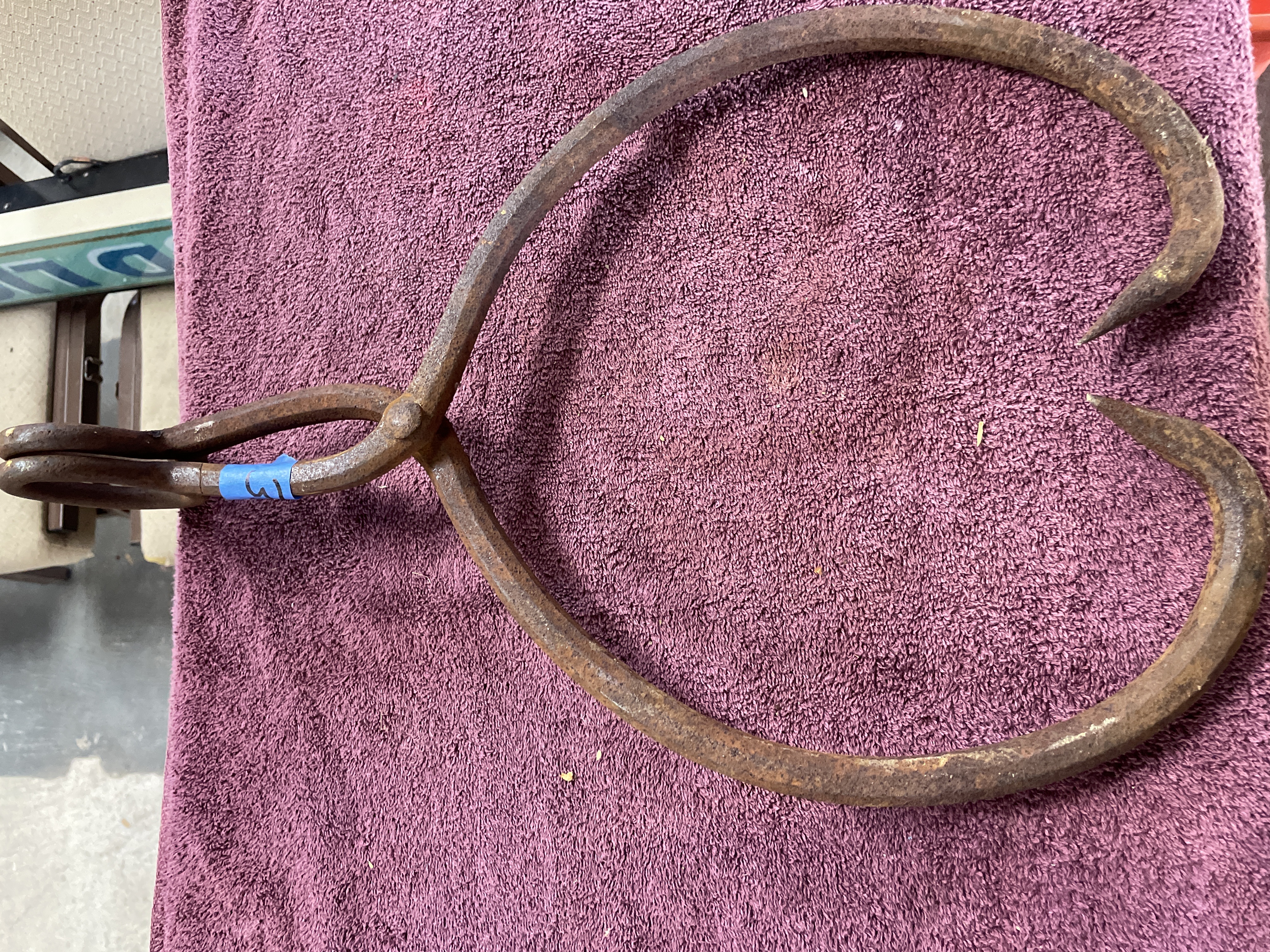 An antique or vintage ice block carrier, commonly referred to as ice tongs. The implement is constructed from heavy forged iron or steel, featuring a central pivotal connection point. The upper section forms two large, overlapping loops designed for carrying or handling the tool. The lower arms terminate in two sharply pointed, curved tips intended for securely gripping heavy material such as ice blocks. A piece of blue painter’s tape bearing the numerical marking ‘7’ is affixed to the upper arms. No manufacturer marks or stamps are discernible.