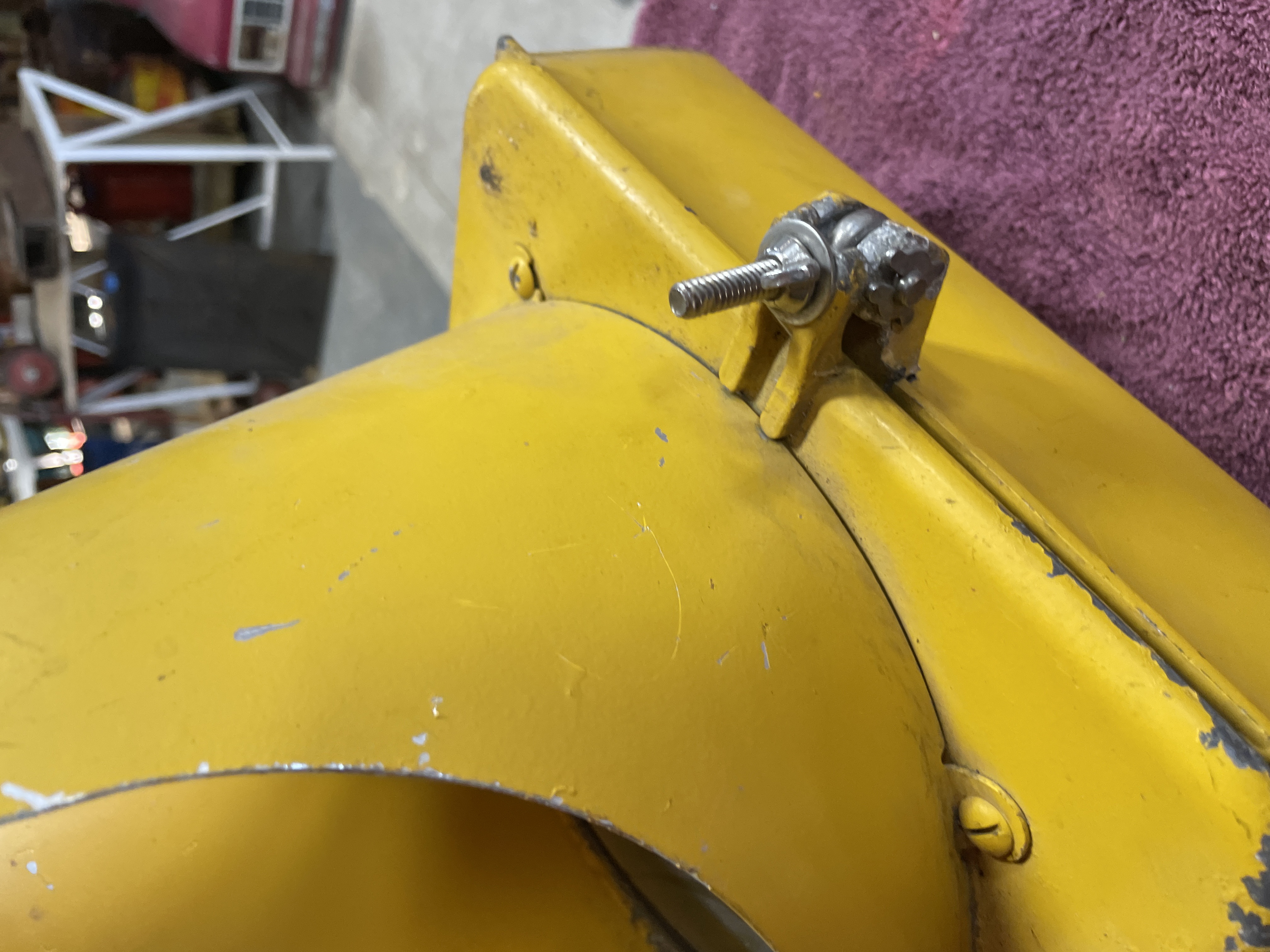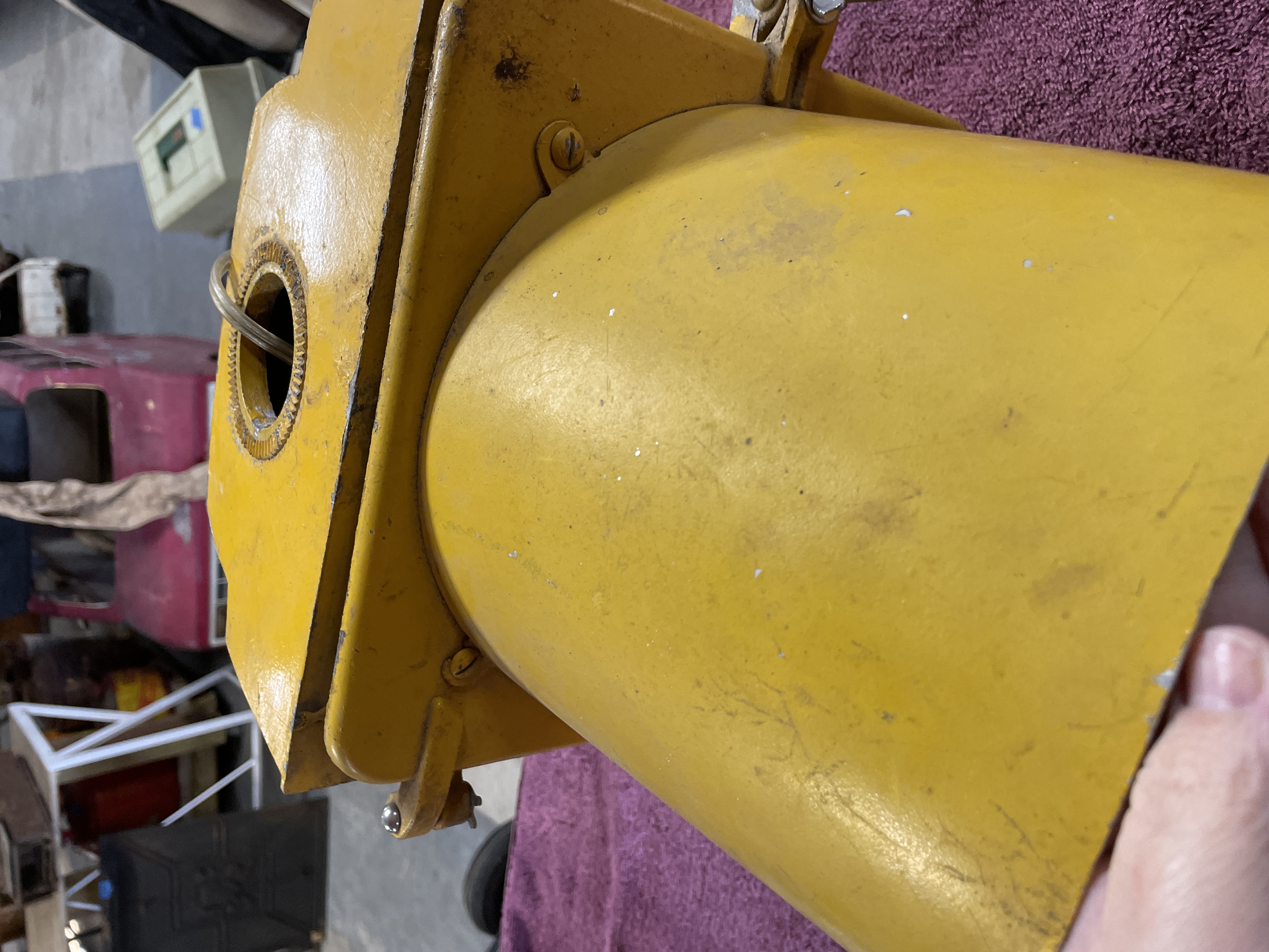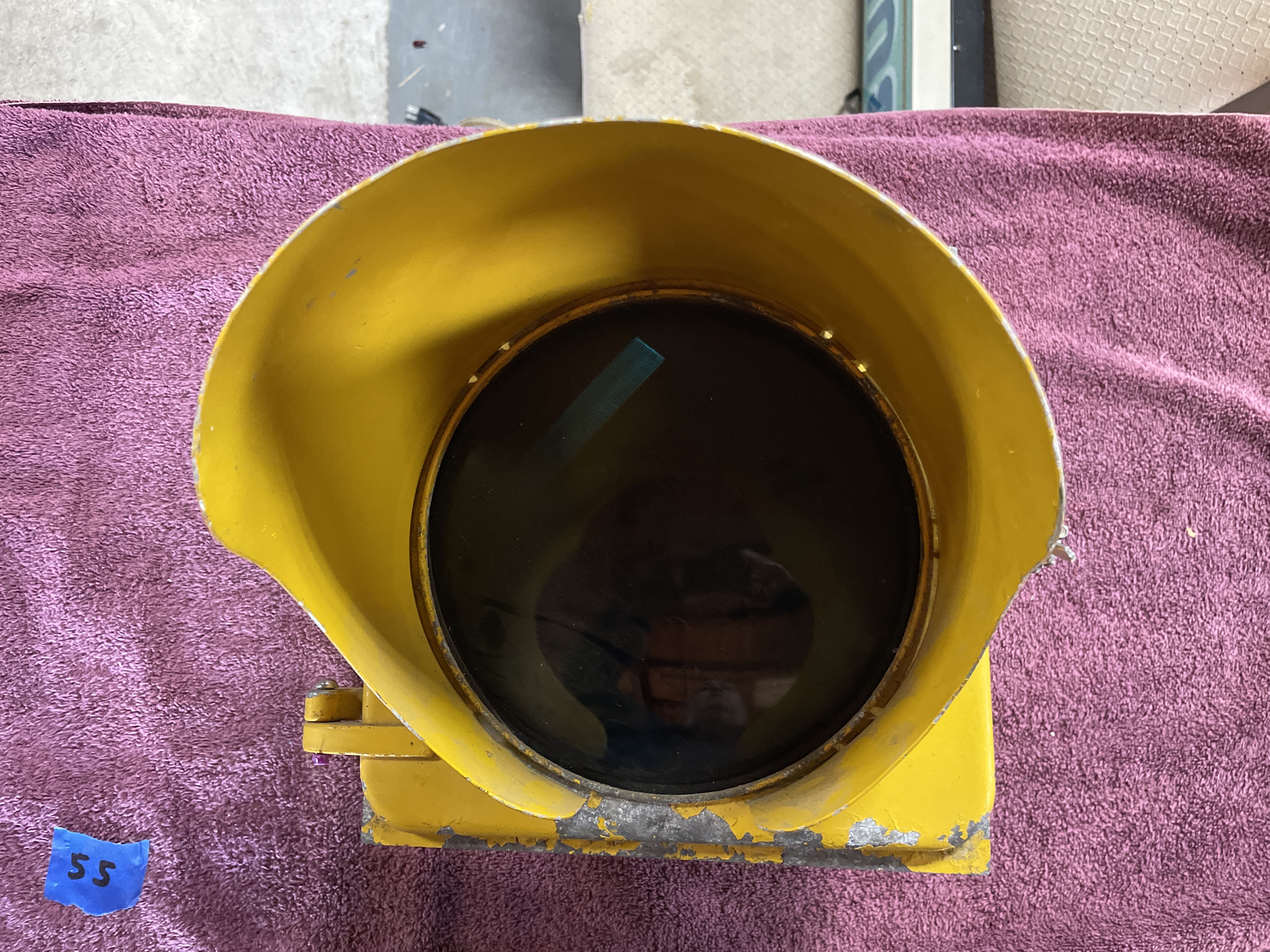 A single-section traffic signal head, likely constructed of cast aluminum or heavy-gauge steel, finished in a bright yellow paint. The unit features a deep, cylindrical hood or visor attached to a rectangular housing base via hinged mechanisms and bolts. The lens, consistent with 8-inch (200mm) models found in the market, displays a segmented green left-turn arrow indicator when illuminated. This industrial municipal equipment is of vintage style, similar to those produced by manufacturers such as Marbelite. A blue inventory or auction sticker marked “55” is affixed to the side shroud.