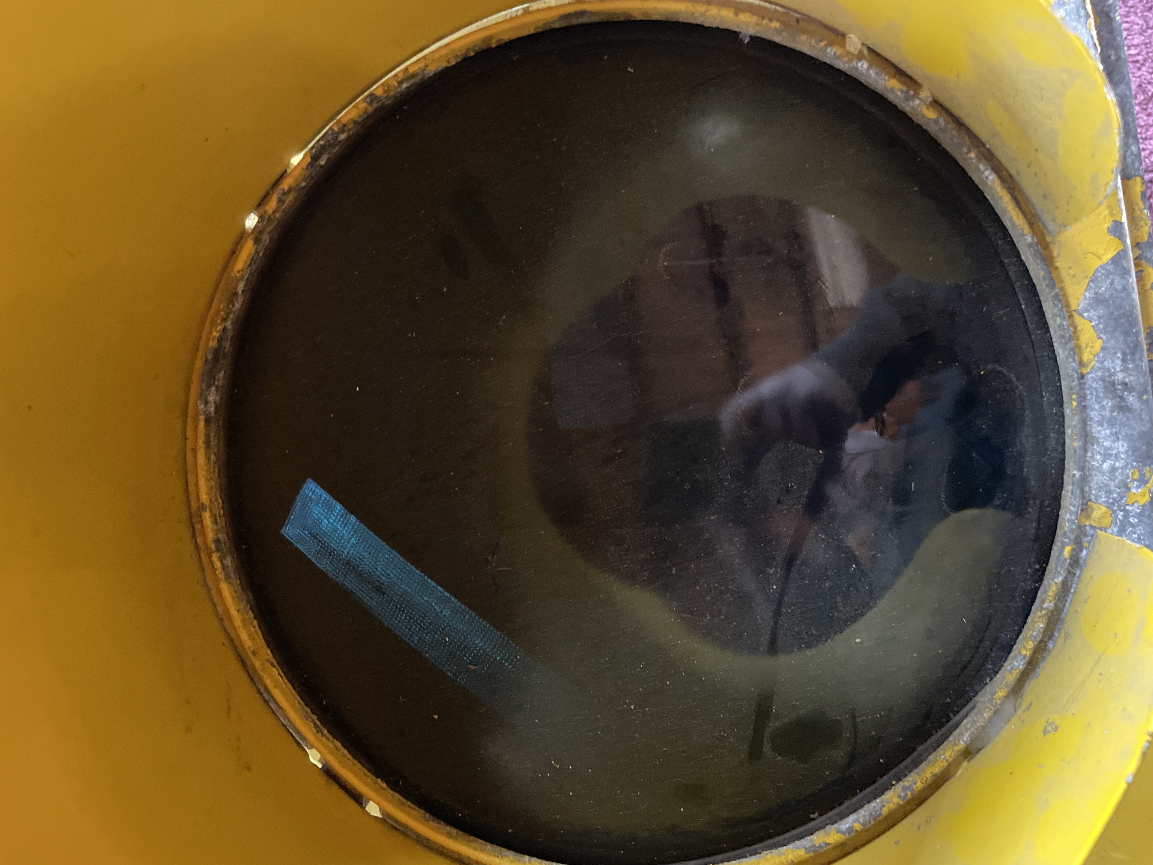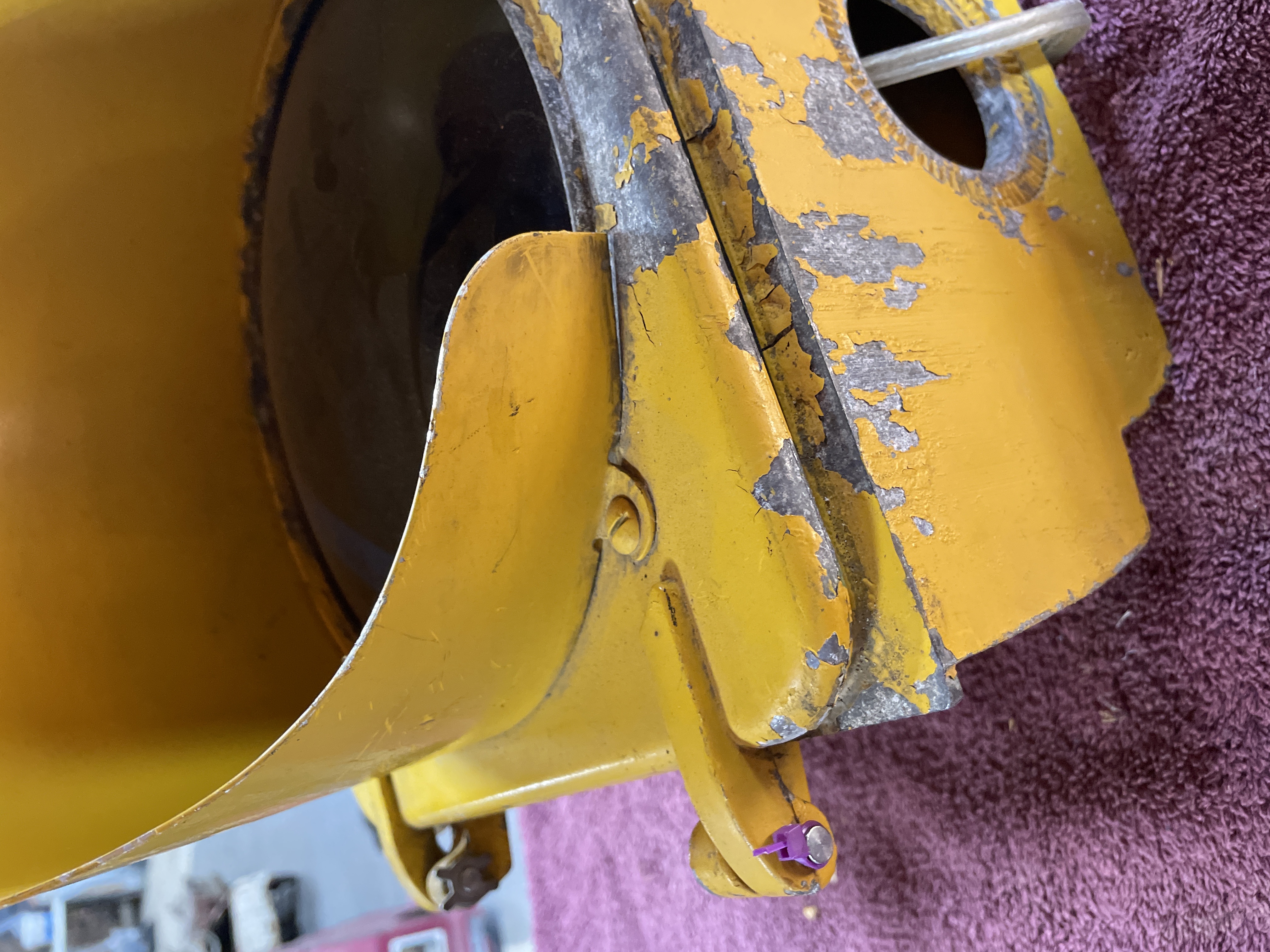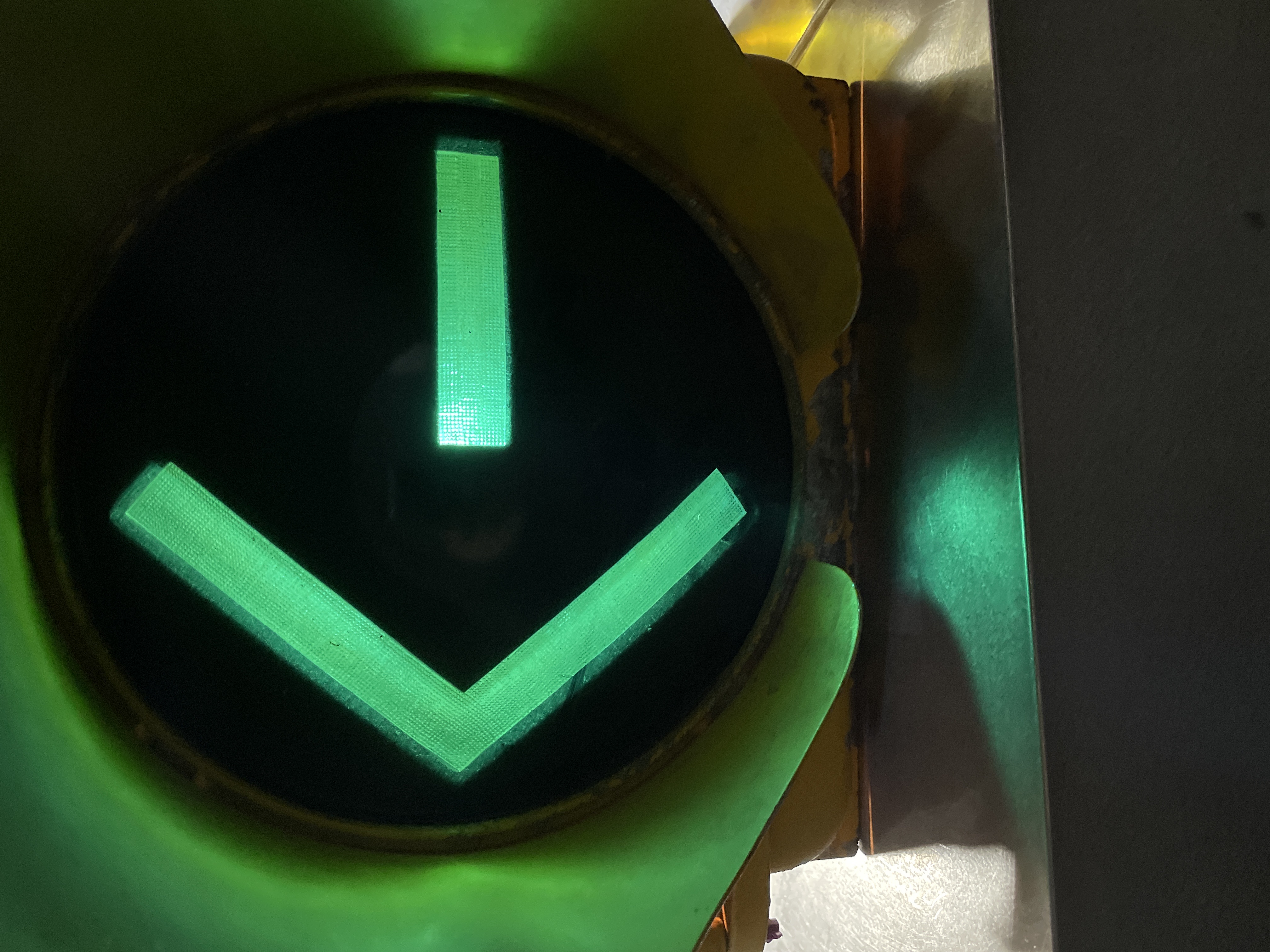 A single-section traffic signal head, likely constructed of cast aluminum or heavy-gauge steel, finished in a bright yellow paint. The unit features a deep, cylindrical hood or visor attached to a rectangular housing base via hinged mechanisms and bolts. The lens, consistent with 8-inch (200mm) models found in the market, displays a segmented green left-turn arrow indicator when illuminated. This industrial municipal equipment is of vintage style, similar to those produced by manufacturers such as Marbelite. A blue inventory or auction sticker marked “55” is affixed to the side shroud.