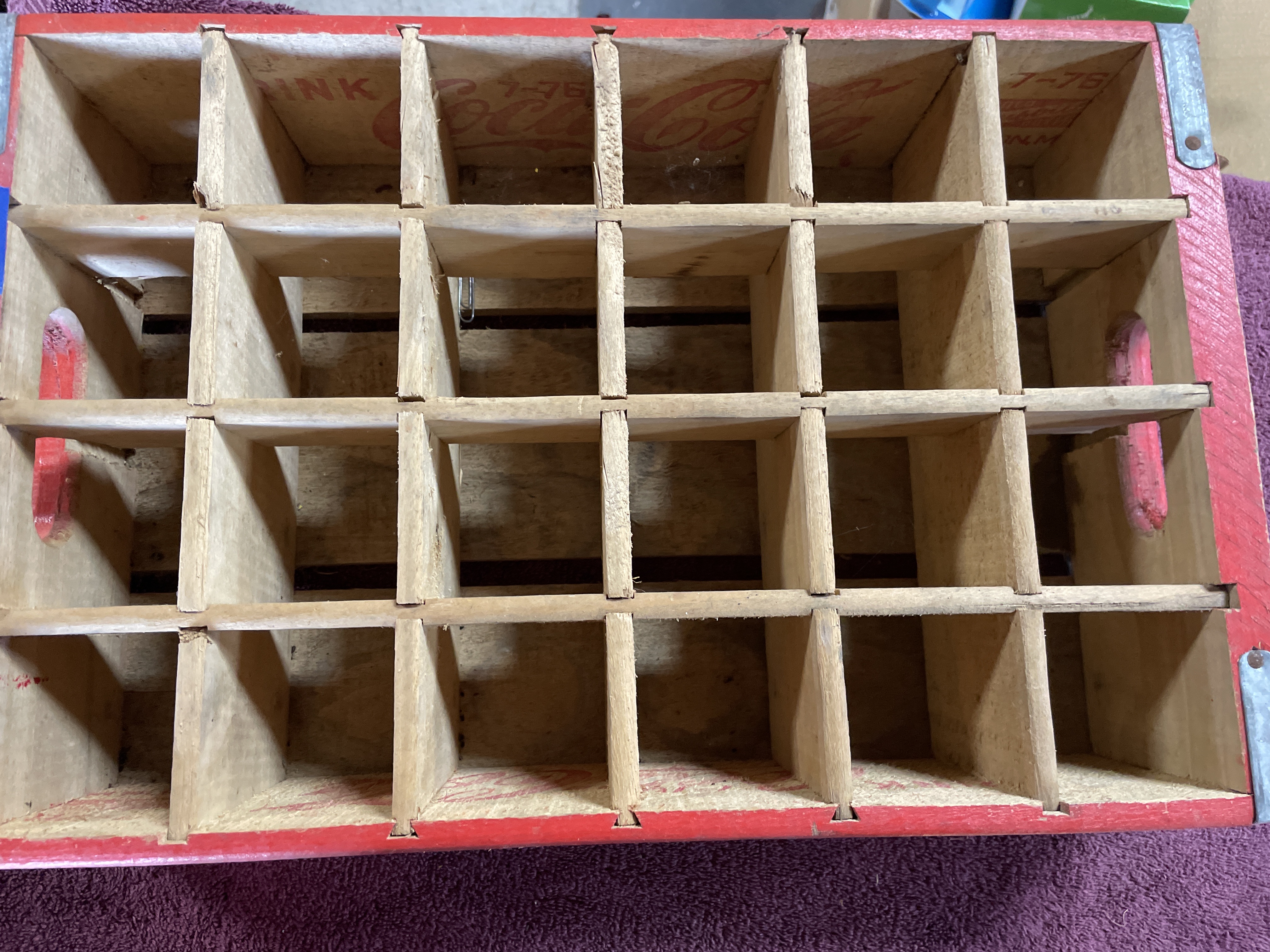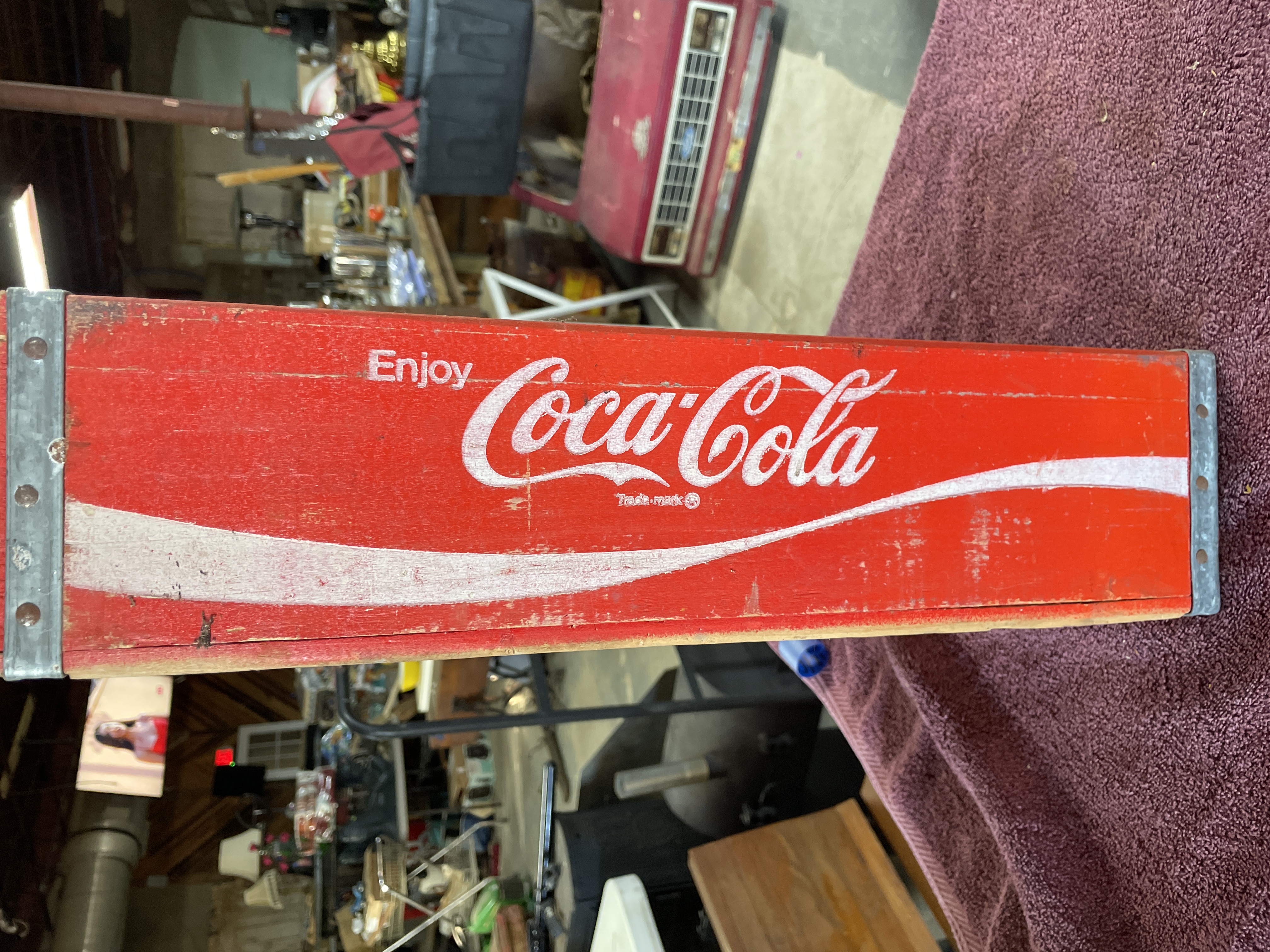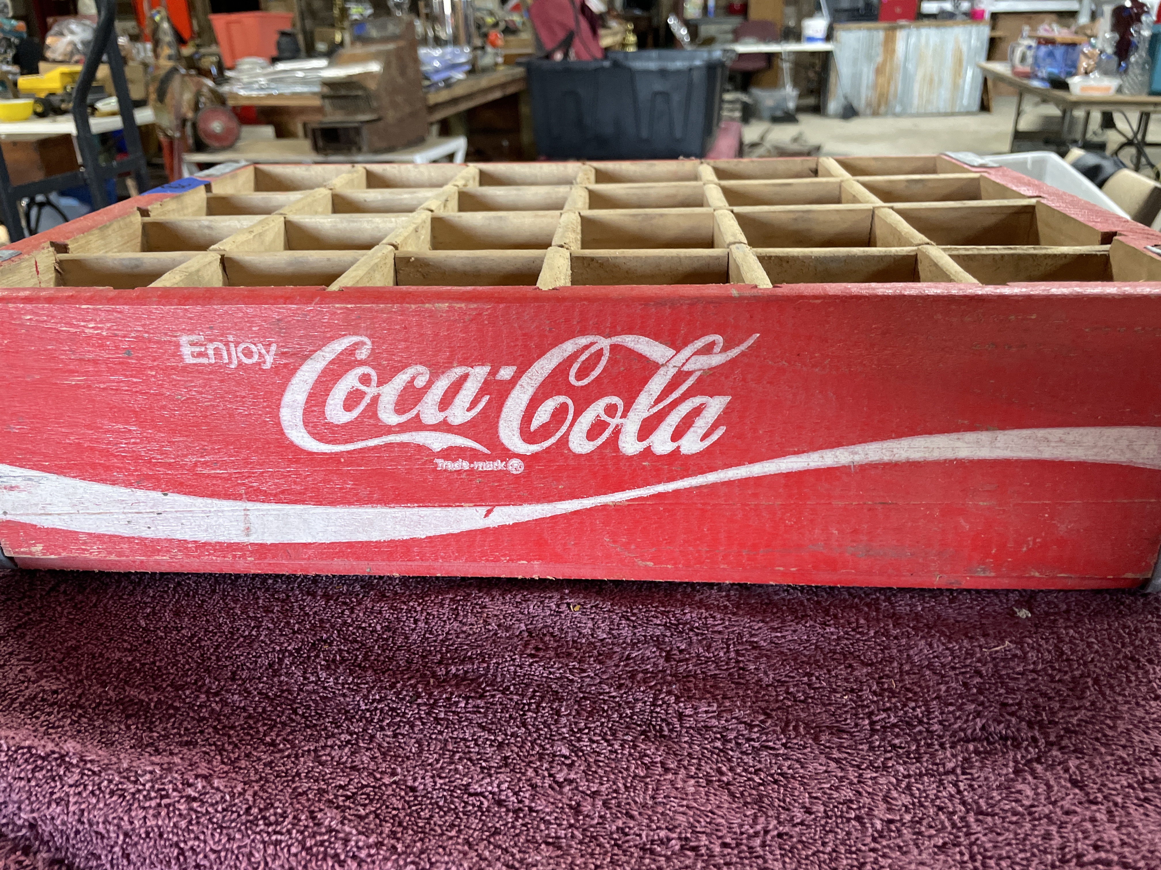 A vintage wooden bottling crate manufactured for the Coca-Cola Company, designed to hold 24 individual bottles in a 4×6 grid configuration. The crate is constructed of wood and painted bright red, featuring white graphic advertising on the long sides. The graphics include the script logo “Enjoy Coca-Cola” and “Trade-mark®” over a white accent stripe. The ends of the crate include cut-out carrying handles and are reinforced with galvanized metal strapping secured by nails. The crate is typical of those used for commercial bottling and distribution.