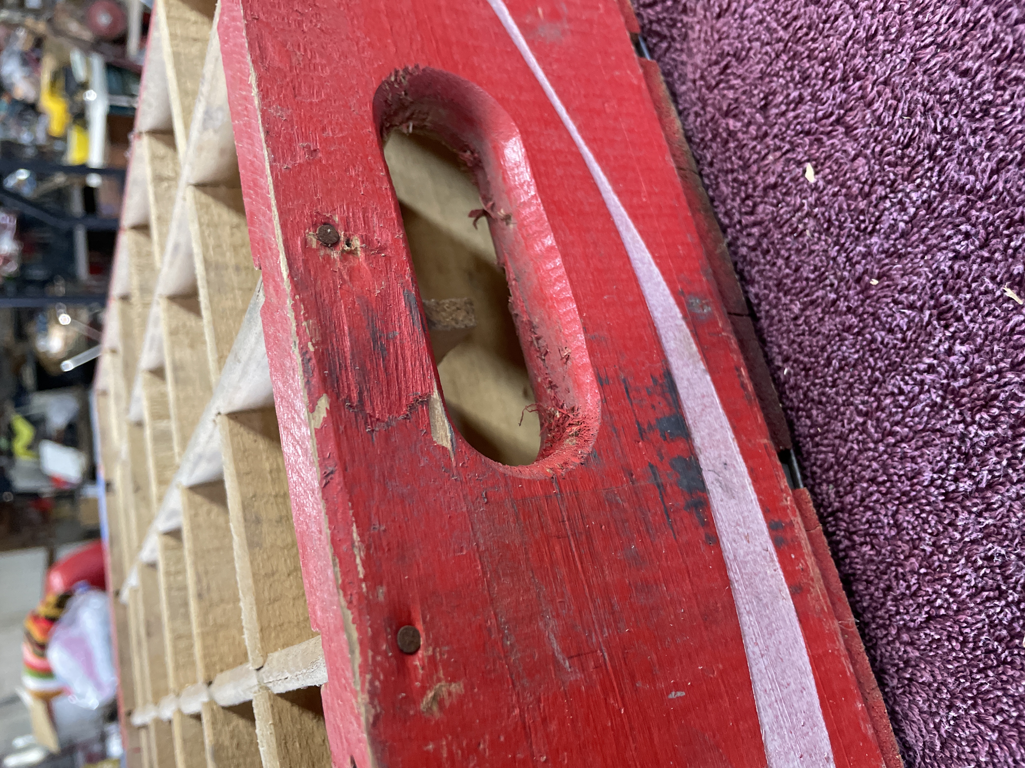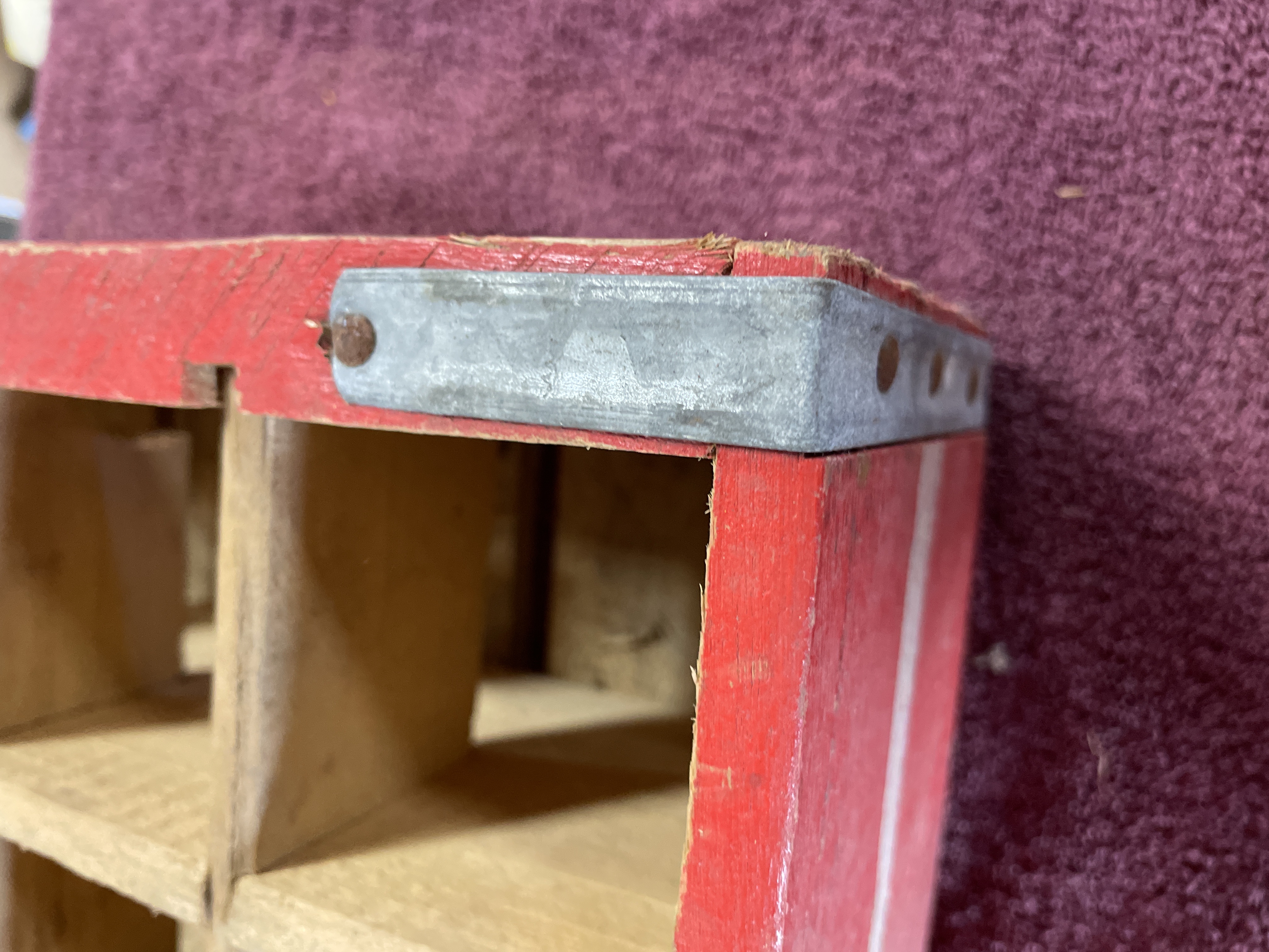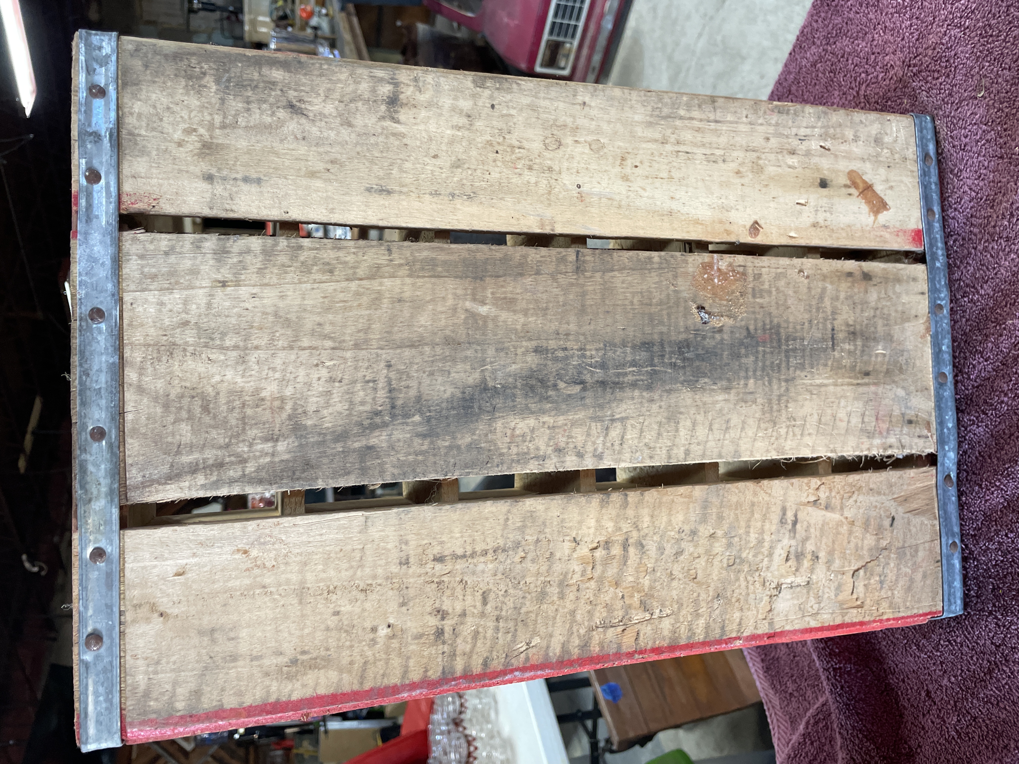 A vintage wooden bottling crate manufactured for the Coca-Cola Company, designed to hold 24 individual bottles in a 4×6 grid configuration. The crate is constructed of wood and painted bright red, featuring white graphic advertising on the long sides. The graphics include the script logo “Enjoy Coca-Cola” and “Trade-mark®” over a white accent stripe. The ends of the crate include cut-out carrying handles and are reinforced with galvanized metal strapping secured by nails. The crate is typical of those used for commercial bottling and distribution.