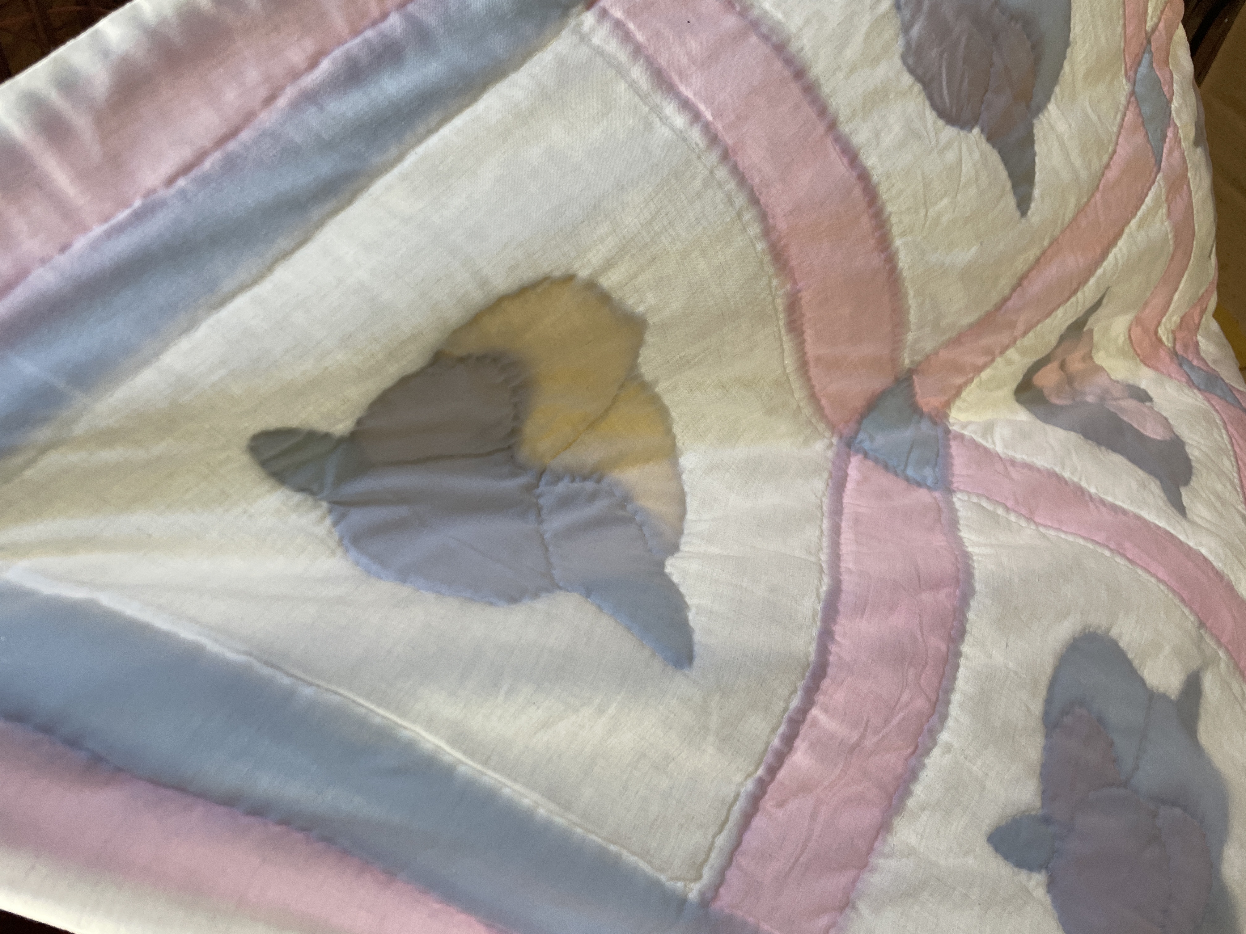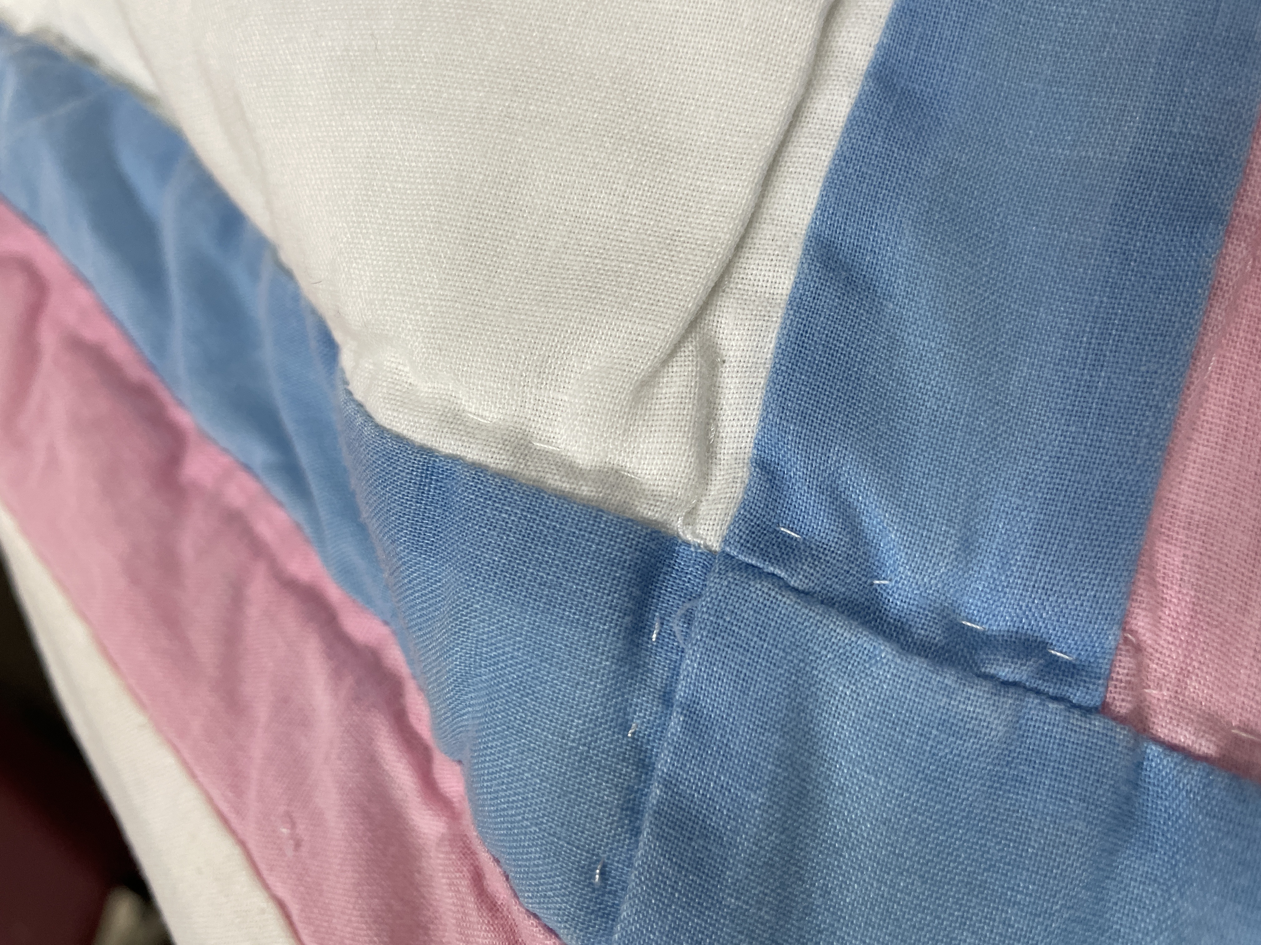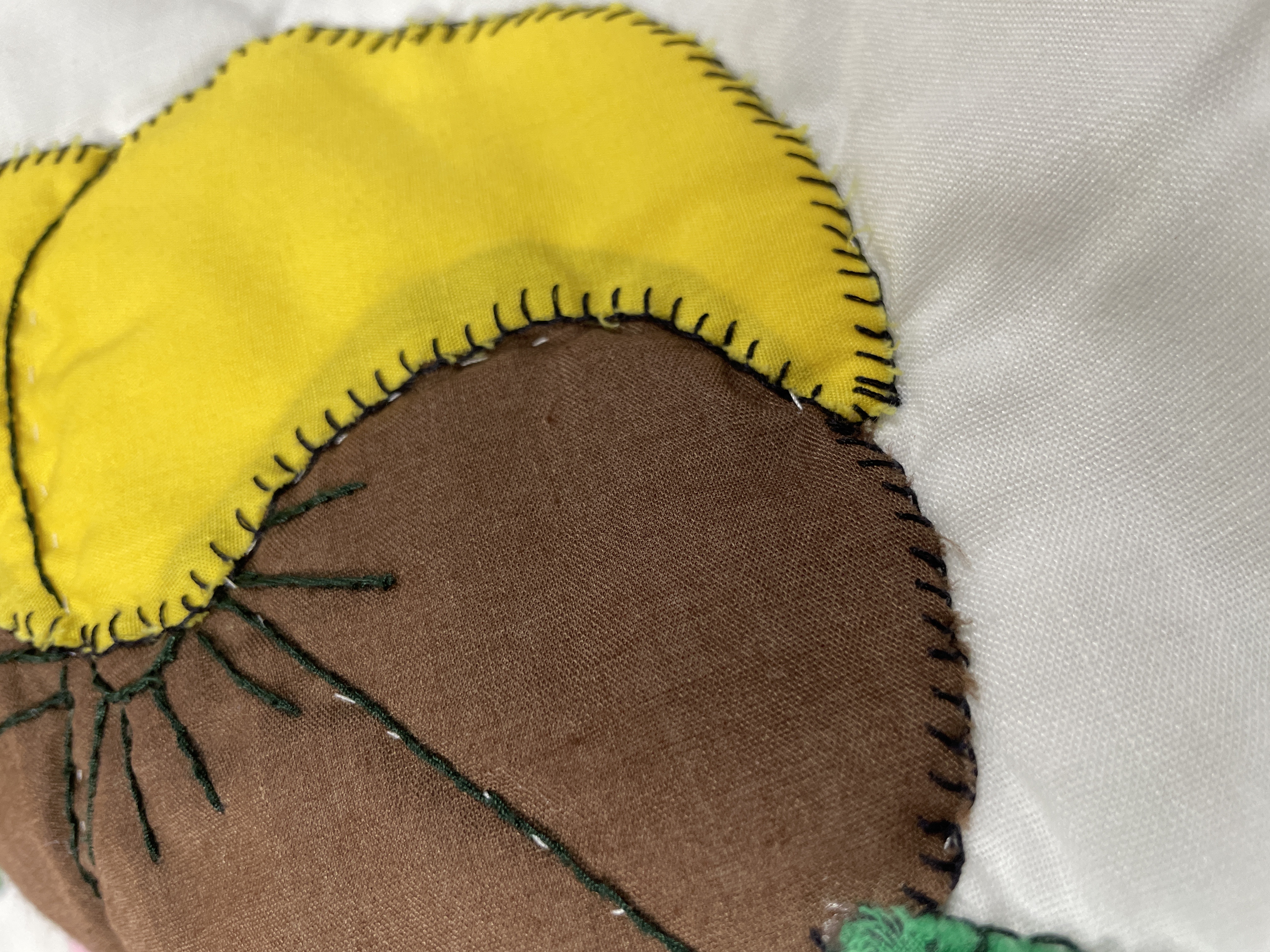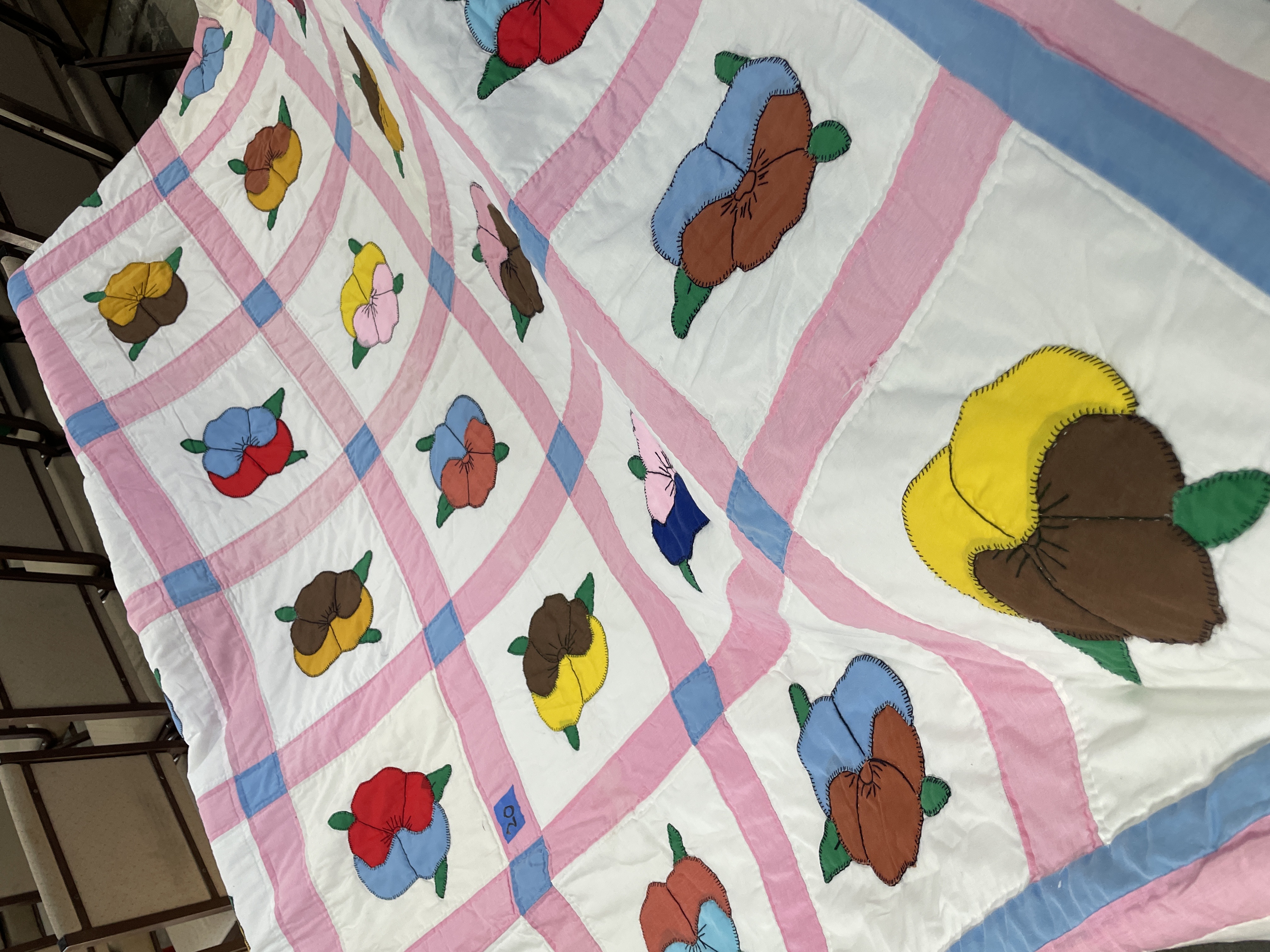 A vintage hand-appliquéd quilt constructed from cotton and/or cotton blend textiles. Best way I could lay out without getting it dirty. I would say its about a full size. The design features a grid of white squares, each containing a multicolored floral motif resembling pansies. The flowers are executed in various colors including bright yellow, brown, blue, red, and green, attached using visible hand-stitching, notably the blanket stitch around the perimeter of the petals. The grid squares are separated by pieced sashing composed of alternating light pink and thin light blue stripes. The textile exhibits evidence of hand quilting and piecing throughout its construction. A small, square piece of blue tape with the handwritten number 20 is visible on one of the white squares near the left edge.