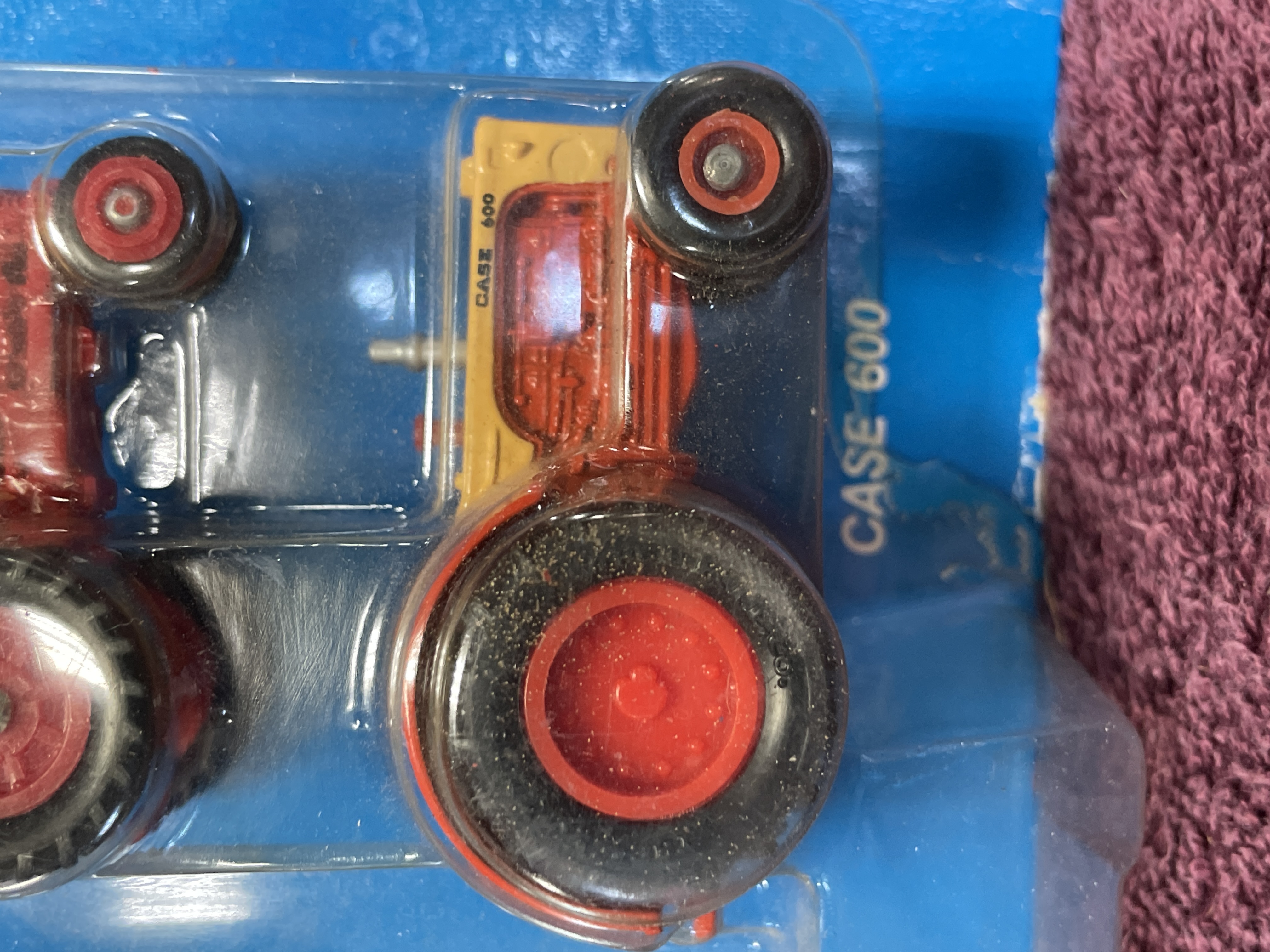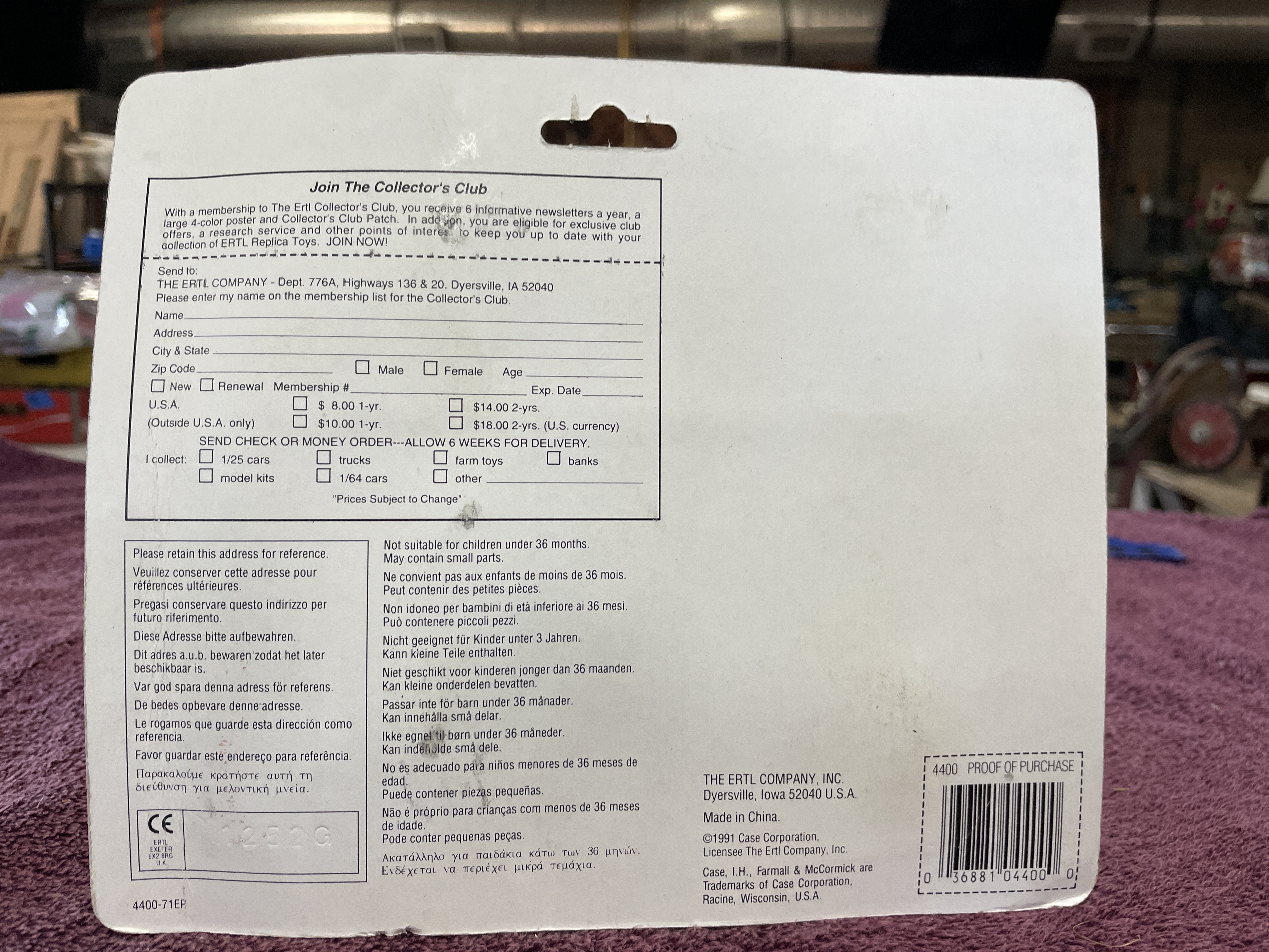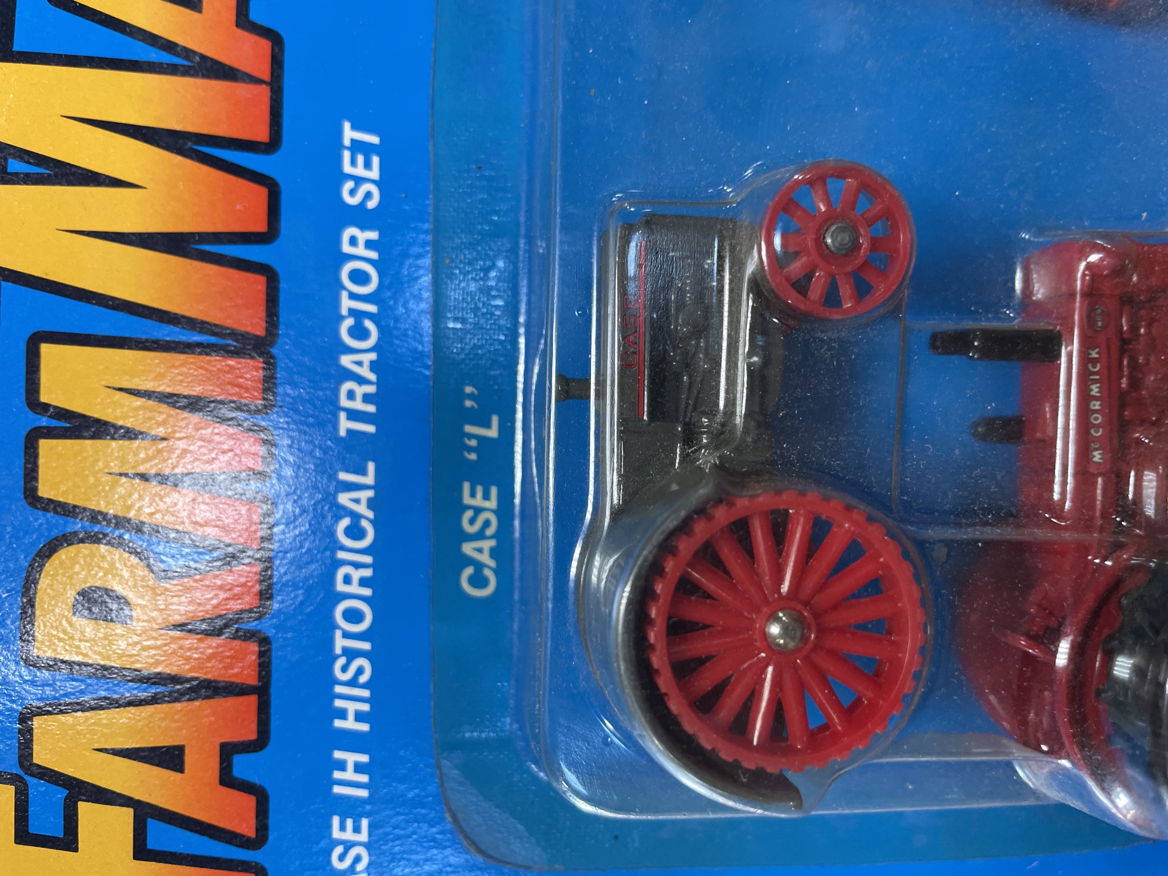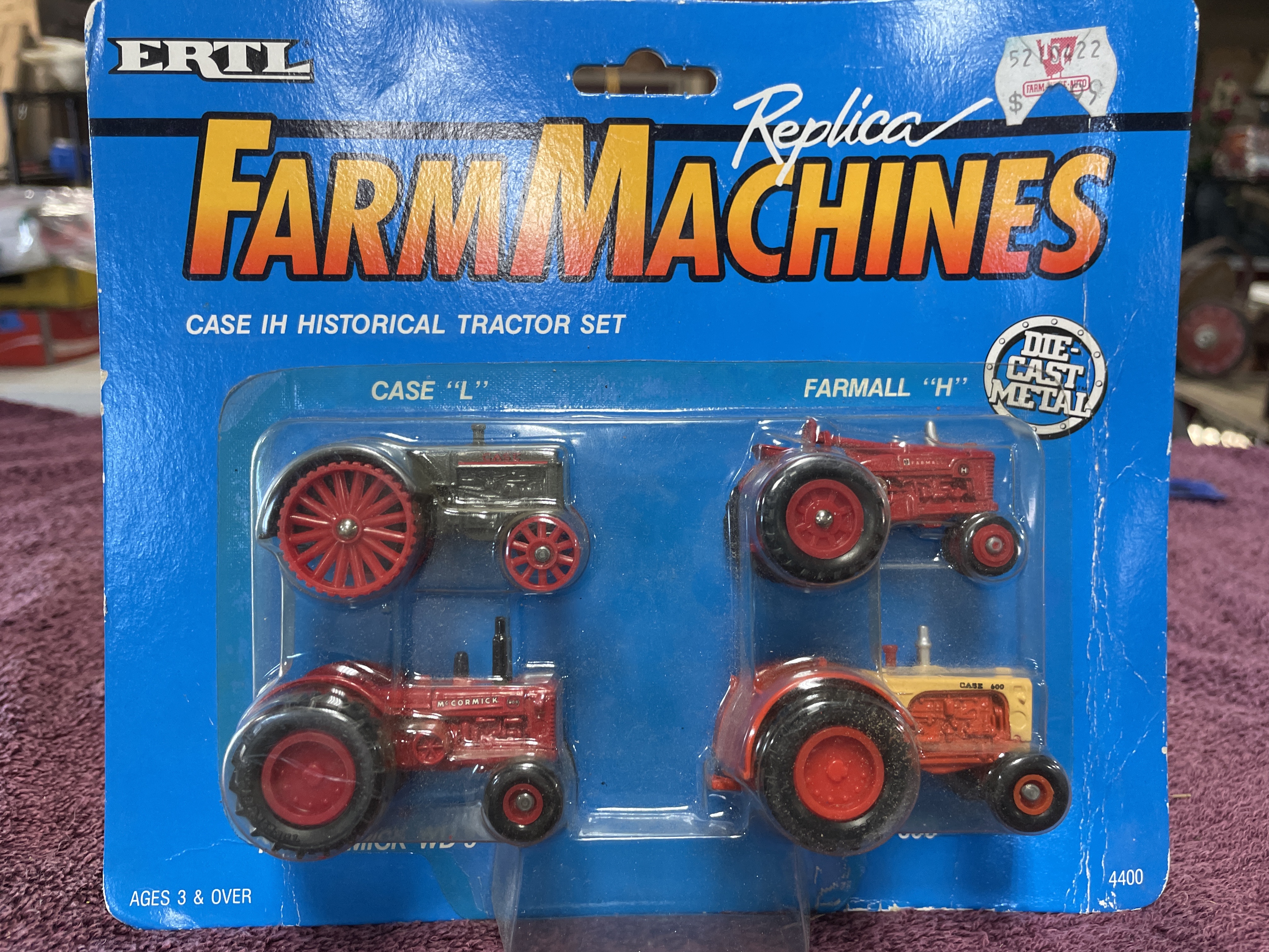 A collection of four die-cast metal replica tractors comprising the ERTL Case IH Historical Tractor Set, product number 4400. The set is manufactured by The Ertl Company, Inc., Dyersville, Iowa, and is copyrighted 1991. The tractors are presented in 1/64 scale and are sealed in their original blister packaging attached to a blue cardboard backing card. The four models included are the Case “L, ” Farmall “H, ” McCormick WD-9, and Case 600. The reverse side confirms the manufacturing origin as Made in China.