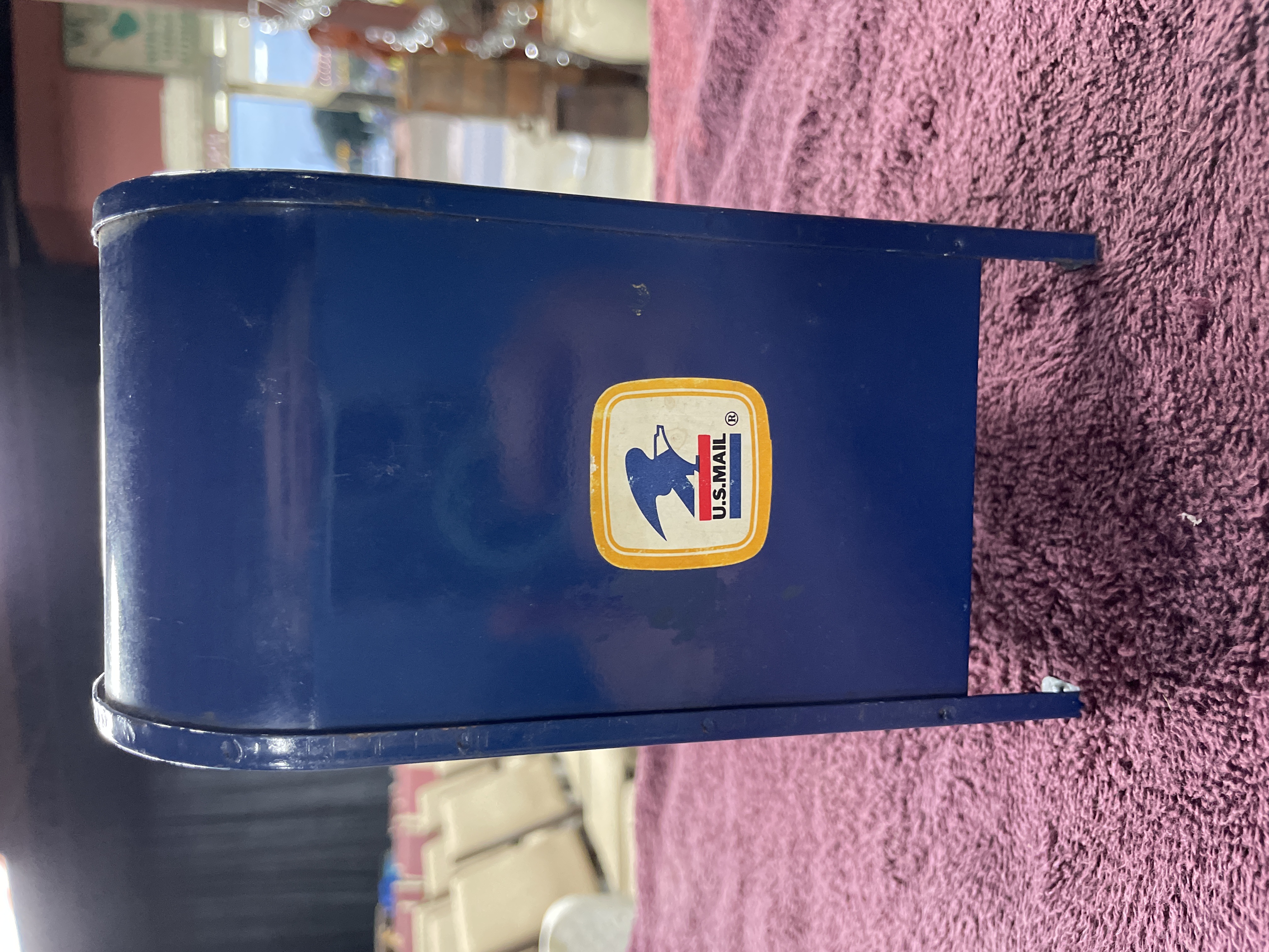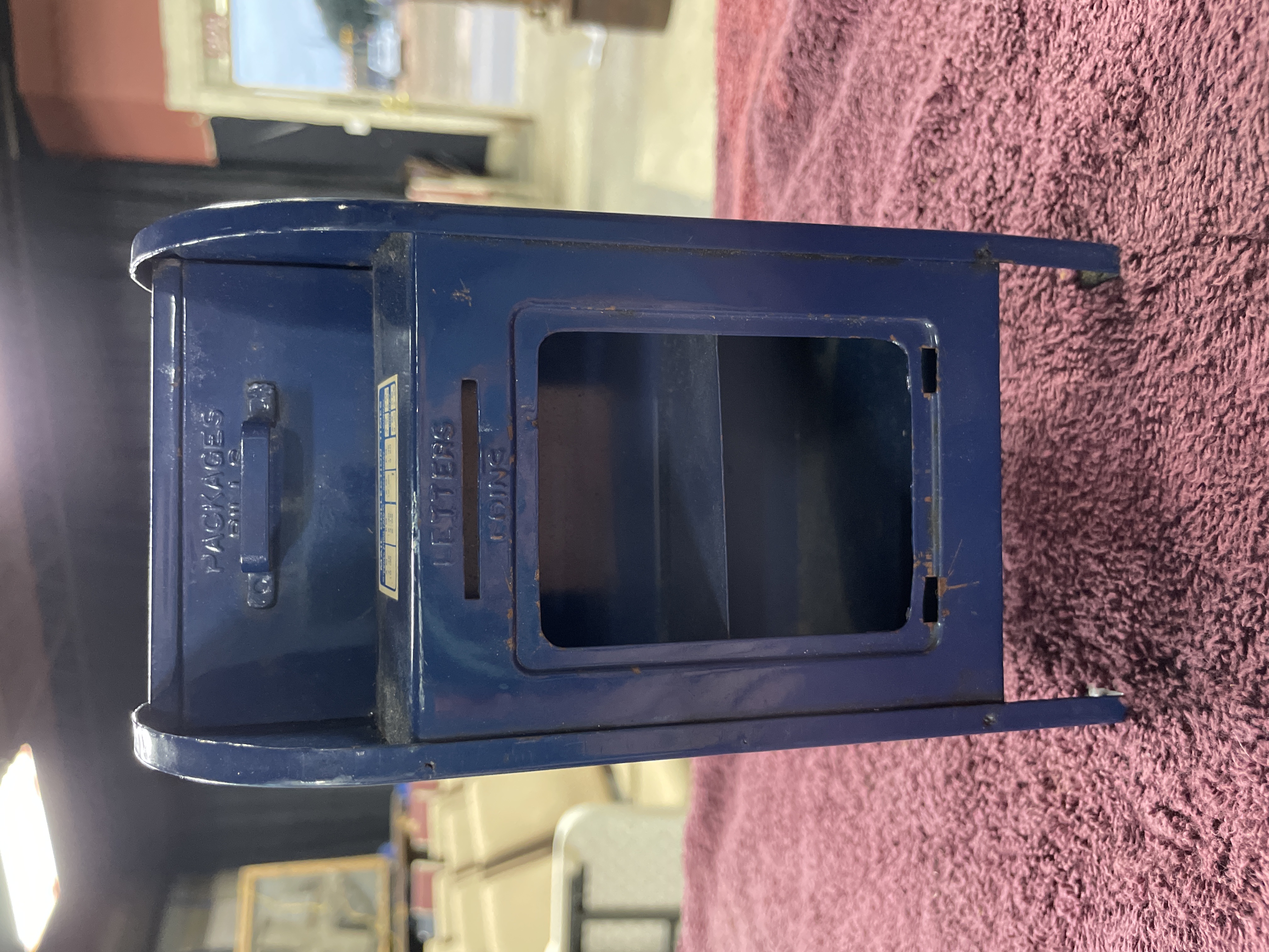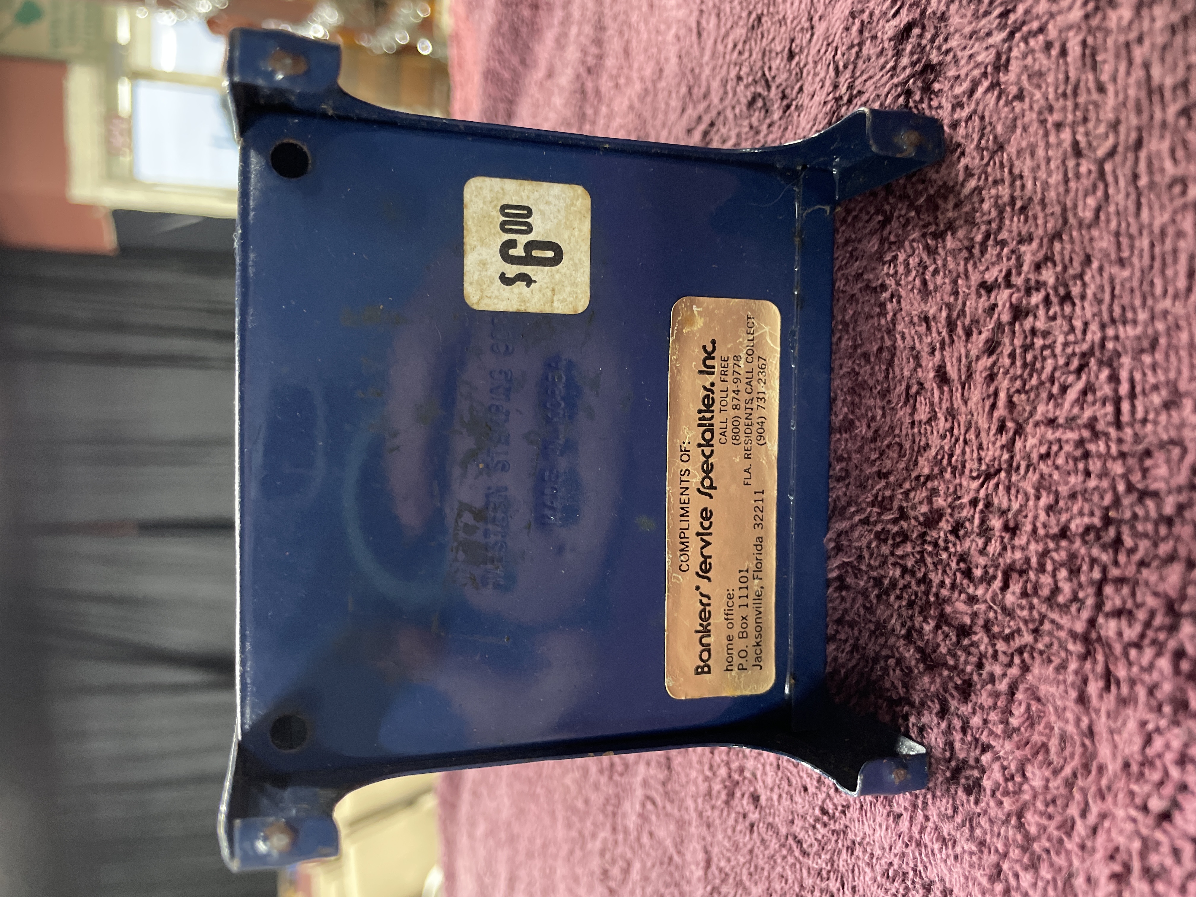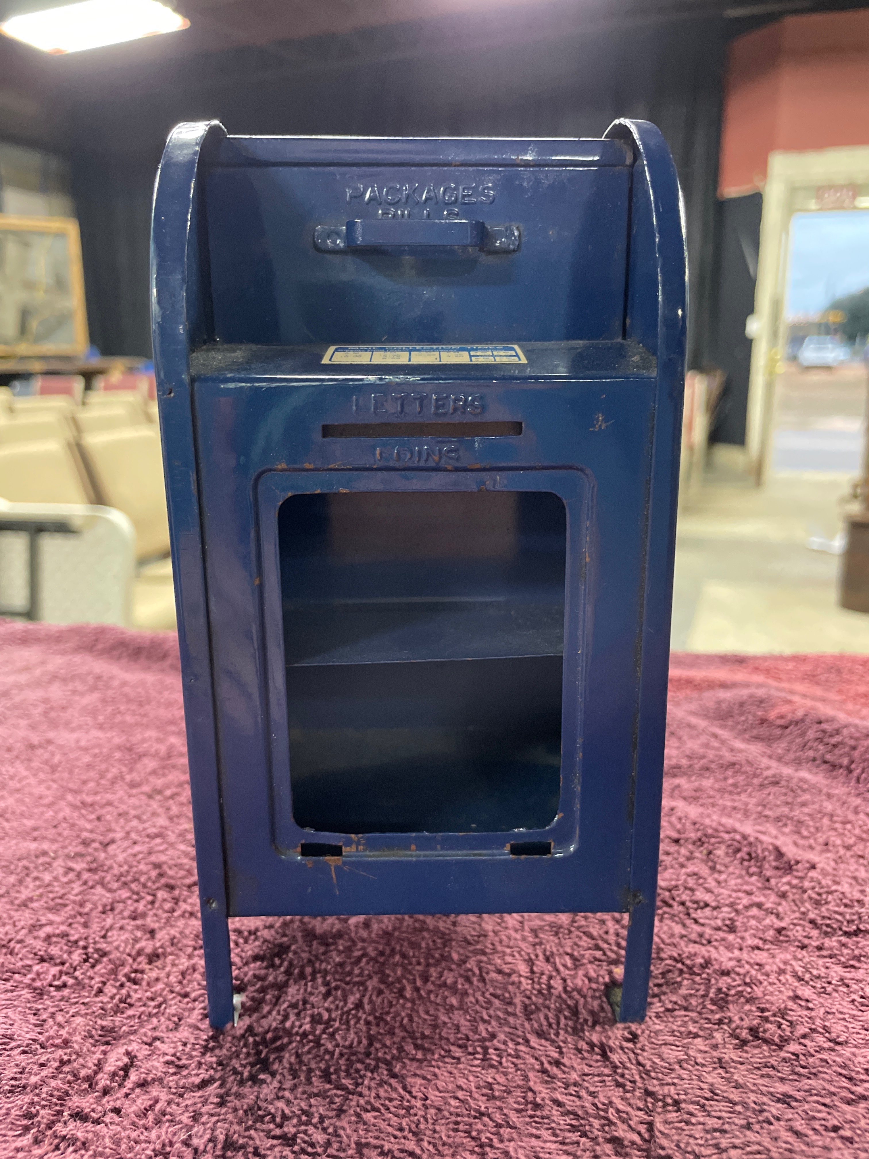 A novelty coin bank, identified through market consensus as the Tom Thumb Mail Box Piggy Bank, manufactured by Western Stamping Corp. The bank is constructed of dark blue painted metal and is designed to resemble a U.S. Postal Service collection box. The front face features labeled slots for "PACKAGES, " "LETTERS, " and "COINS." The reverse side displays the modern U.S. Mail eagle logo decal. The base contains a promotional sticker reading "COMPLIMENTS OF: Bankers’ Service Specialties, Inc. Jacksonville, Florida 32211," along with a $6.00 price sticker. Faint manufacturer markings on the base suggest Western Stamping and ‘Made in Korea.’