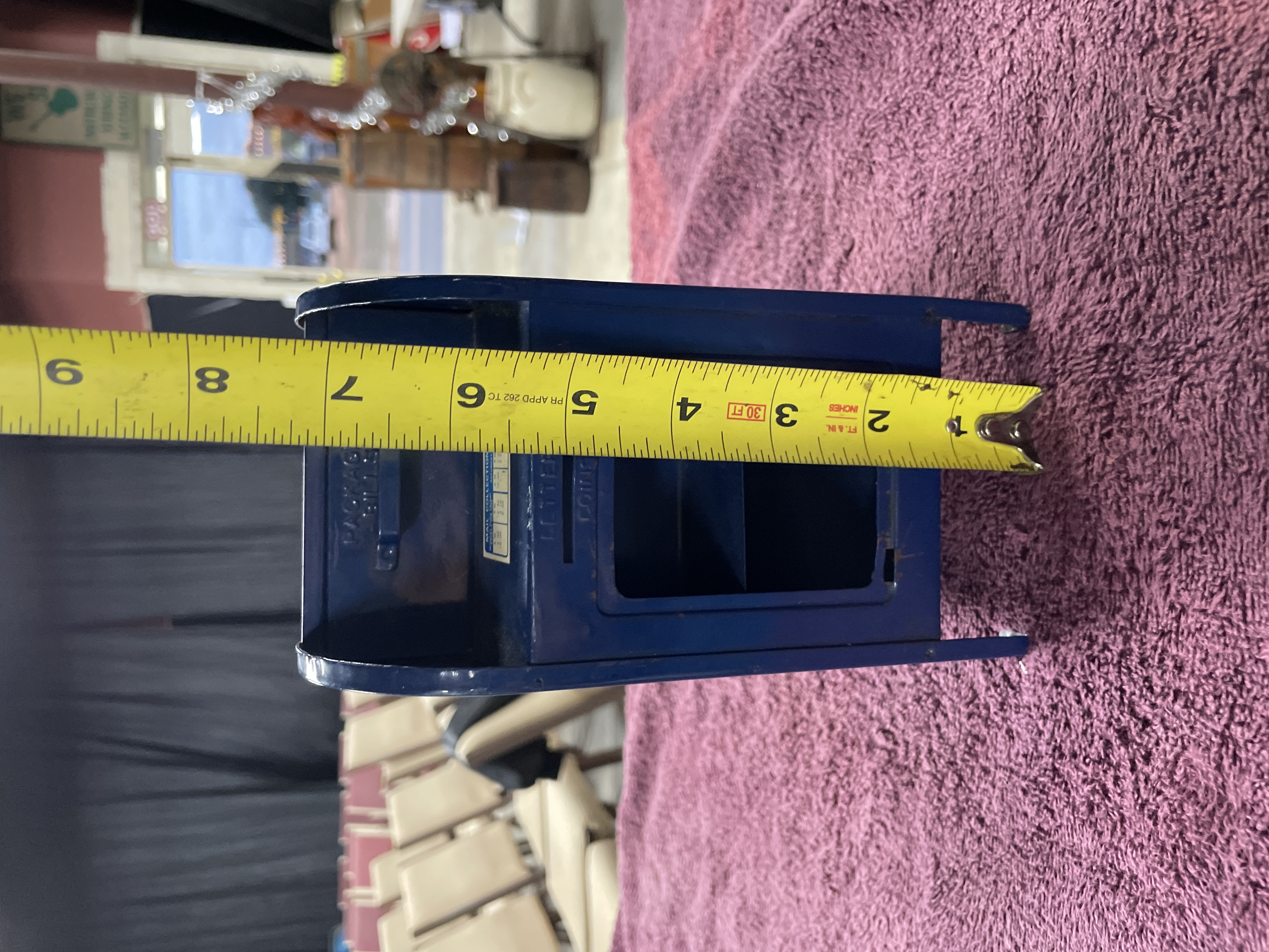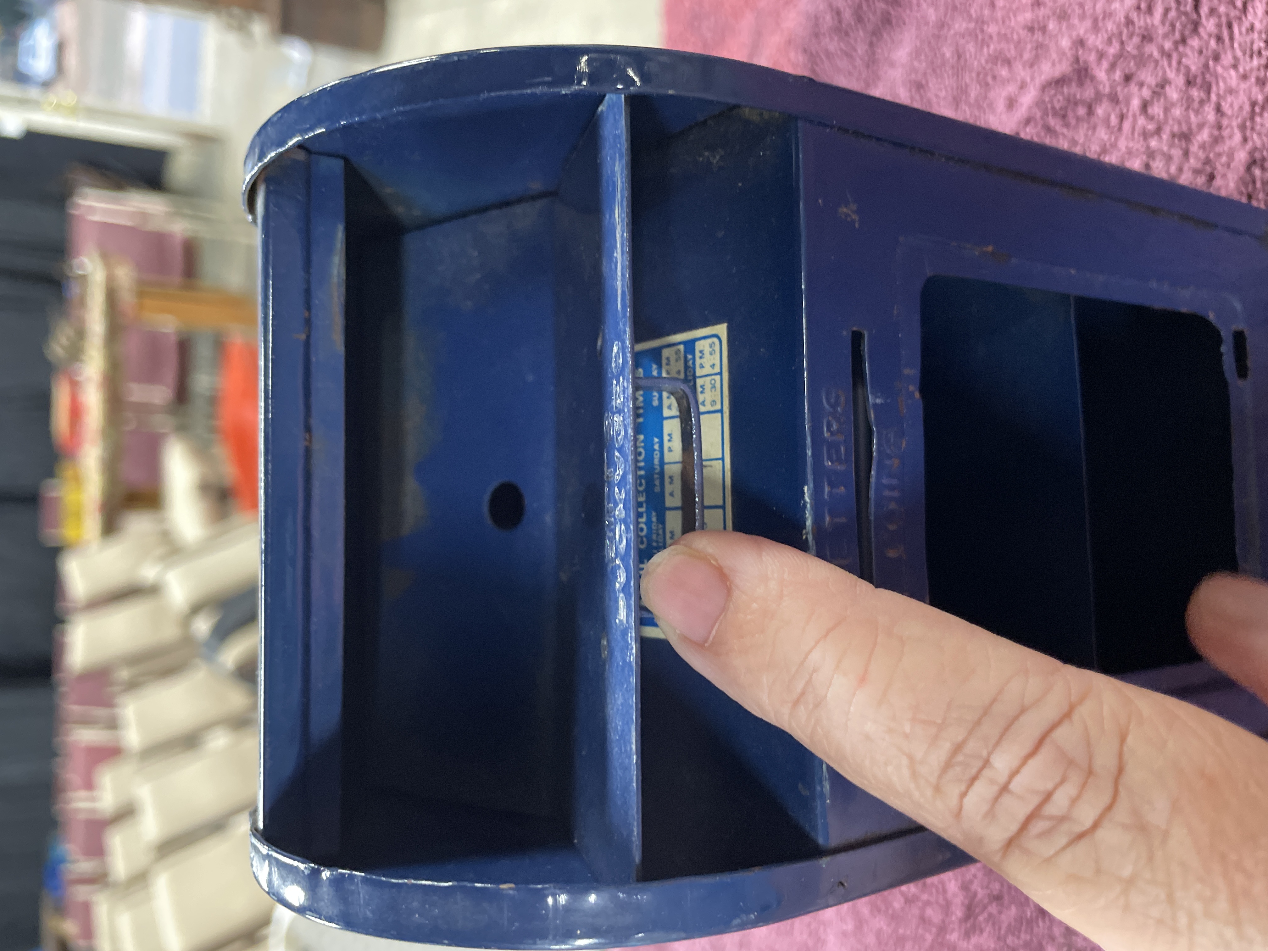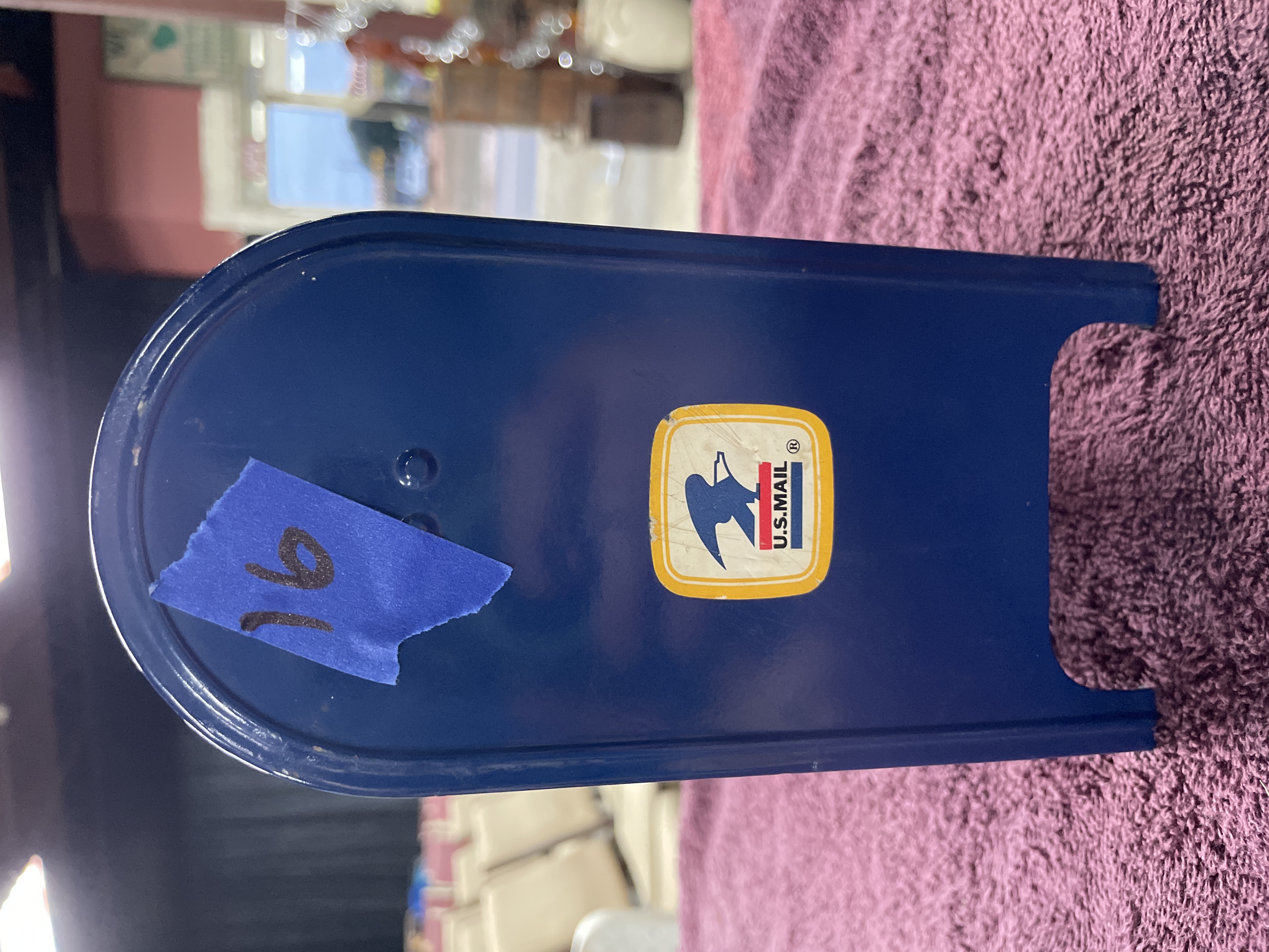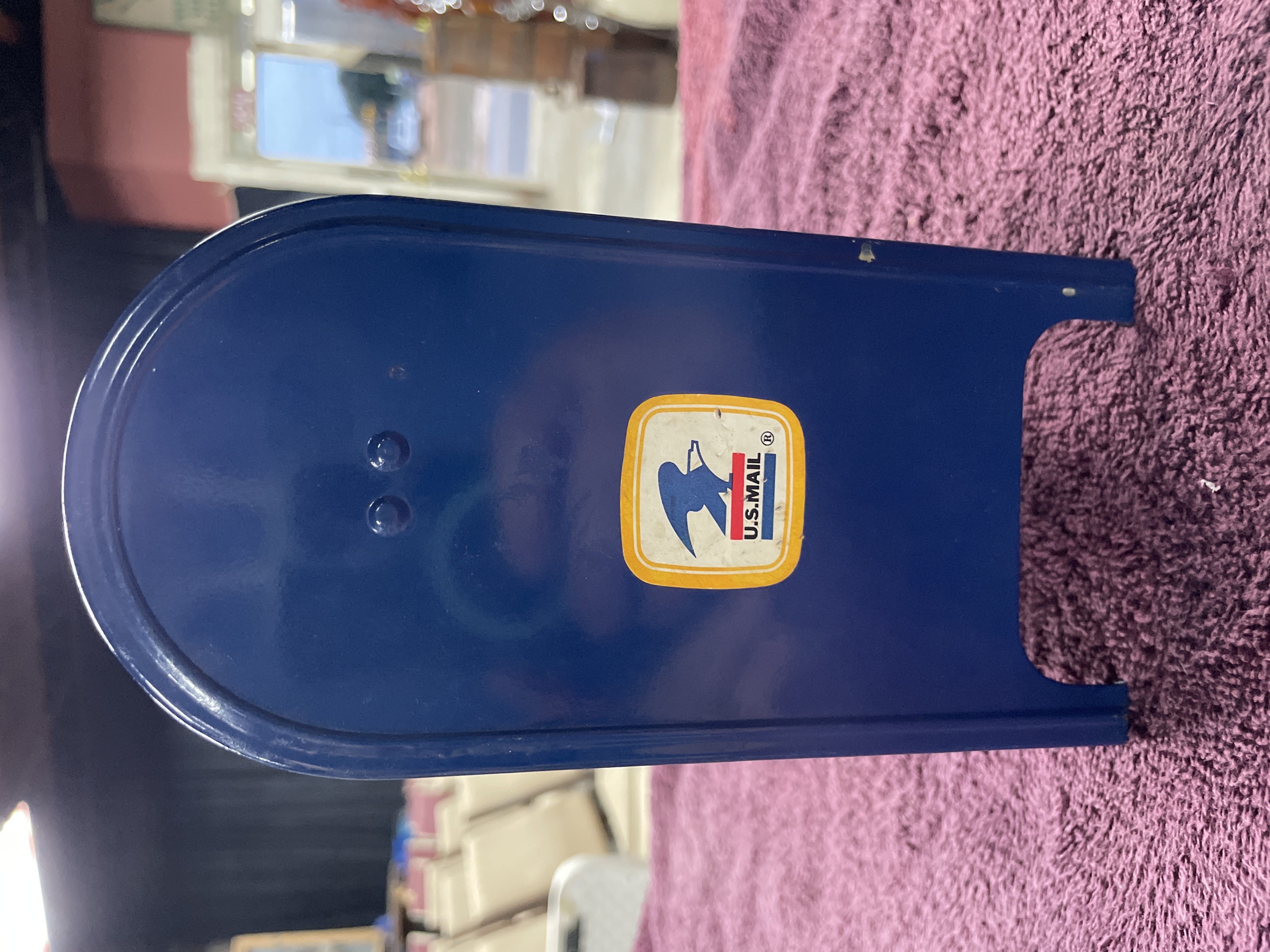 A novelty coin bank, identified through market consensus as the Tom Thumb Mail Box Piggy Bank, manufactured by Western Stamping Corp. The bank is constructed of dark blue painted metal and is designed to resemble a U.S. Postal Service collection box. The front face features labeled slots for "PACKAGES, " "LETTERS, " and "COINS." The reverse side displays the modern U.S. Mail eagle logo decal. The base contains a promotional sticker reading "COMPLIMENTS OF: Bankers’ Service Specialties, Inc. Jacksonville, Florida 32211," along with a $6.00 price sticker. Faint manufacturer markings on the base suggest Western Stamping and ‘Made in Korea.’