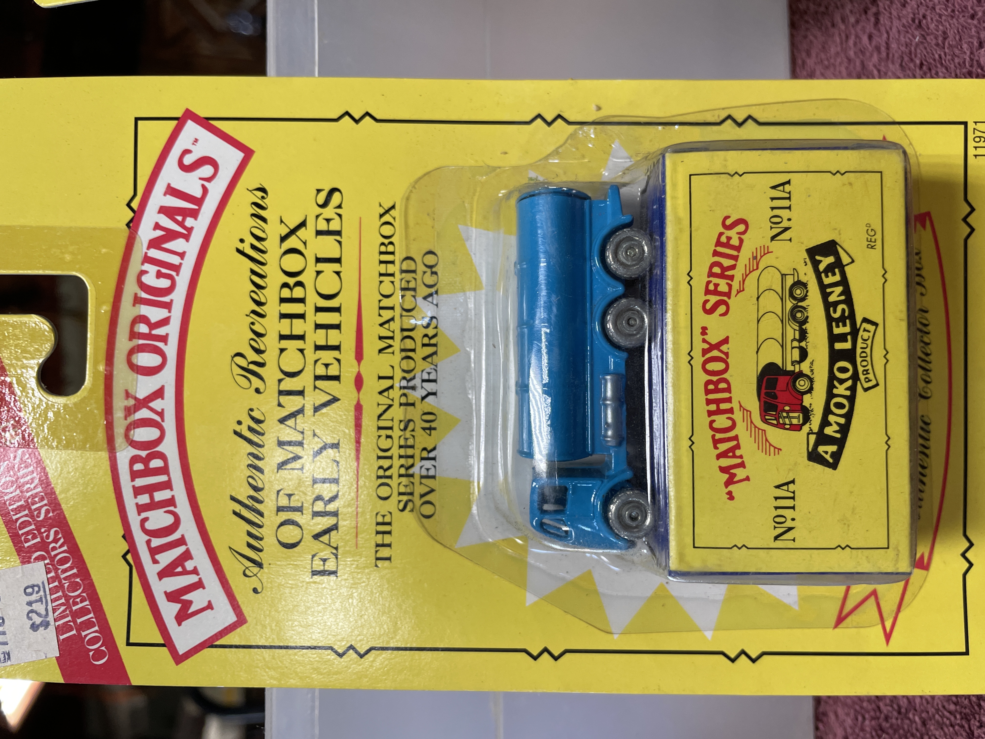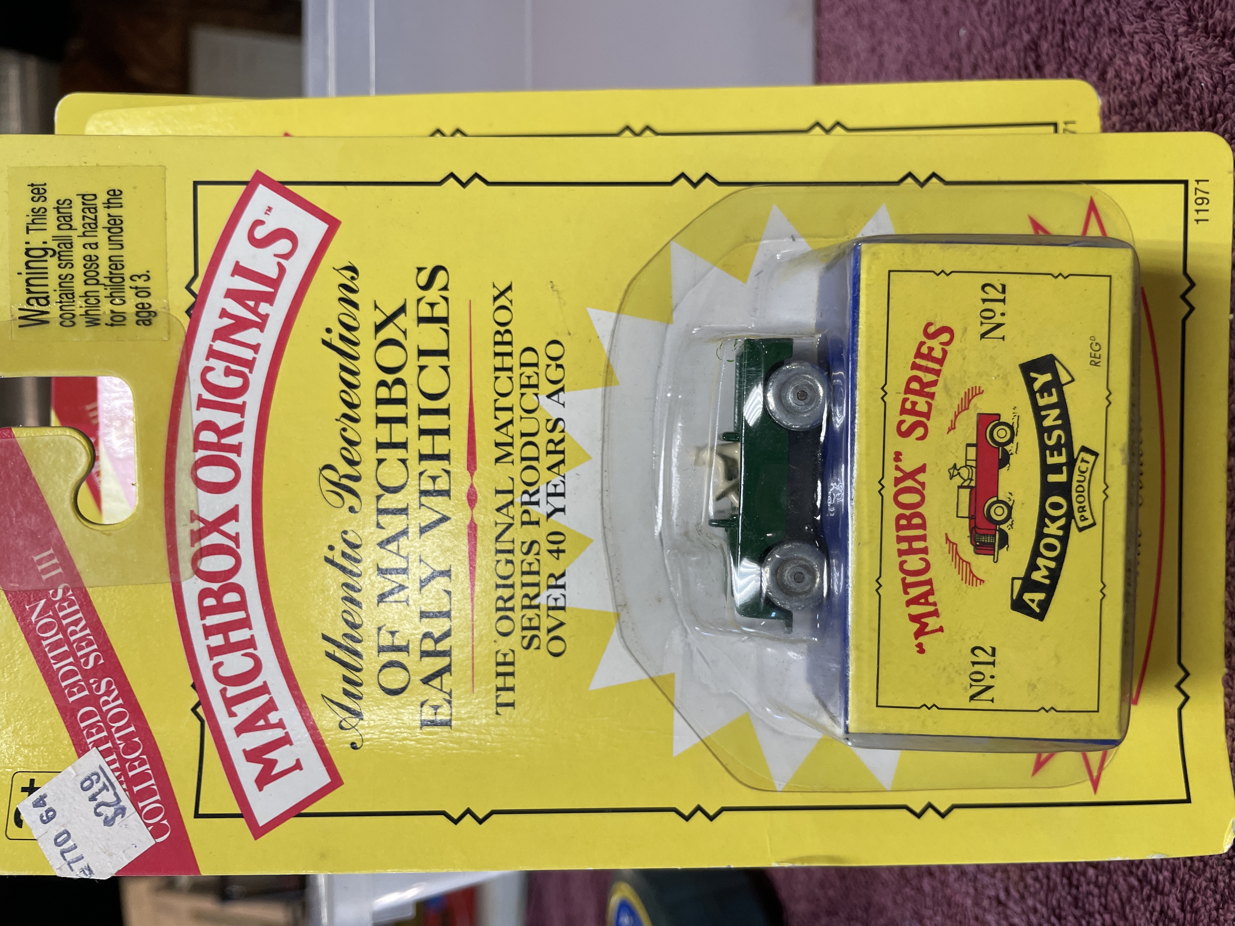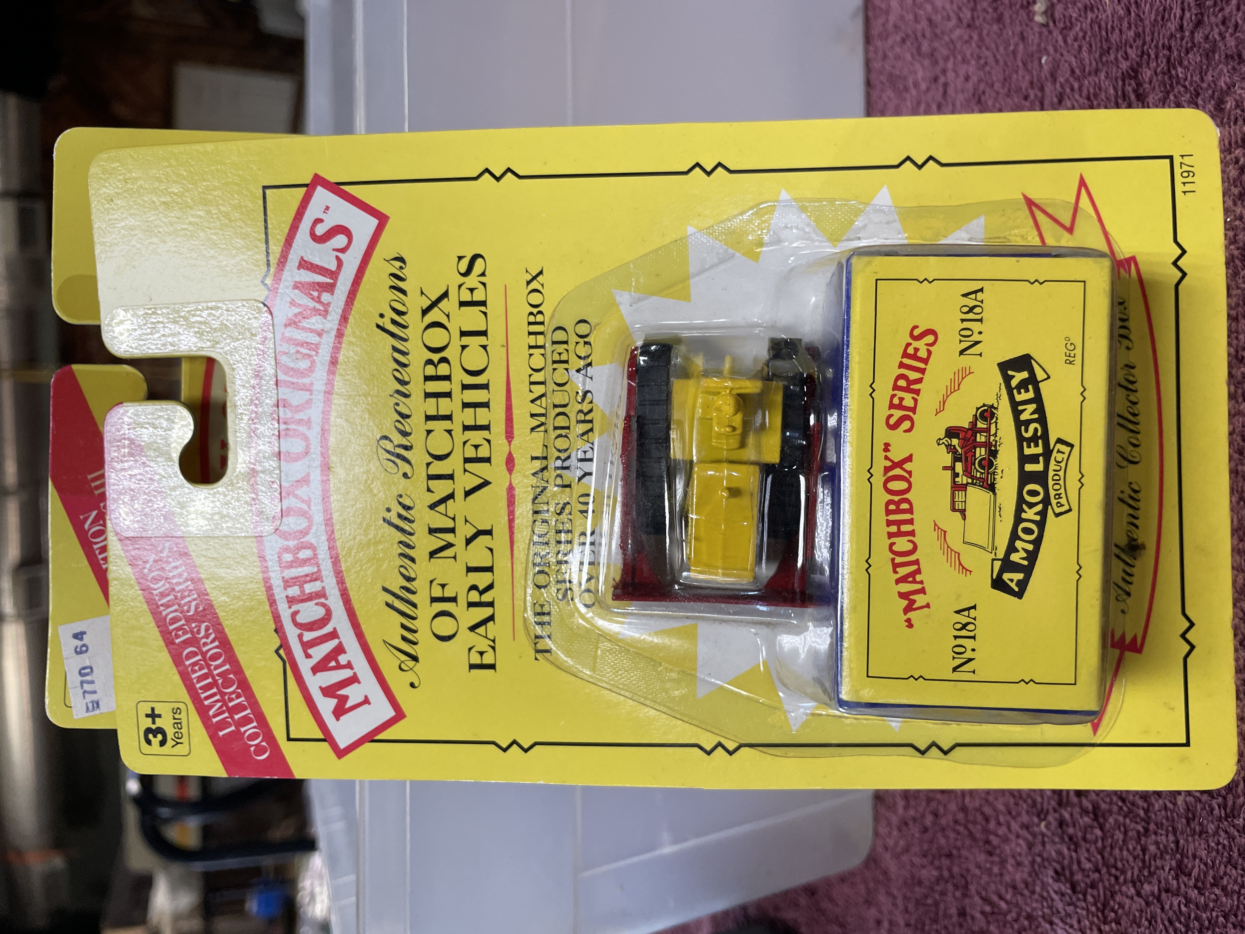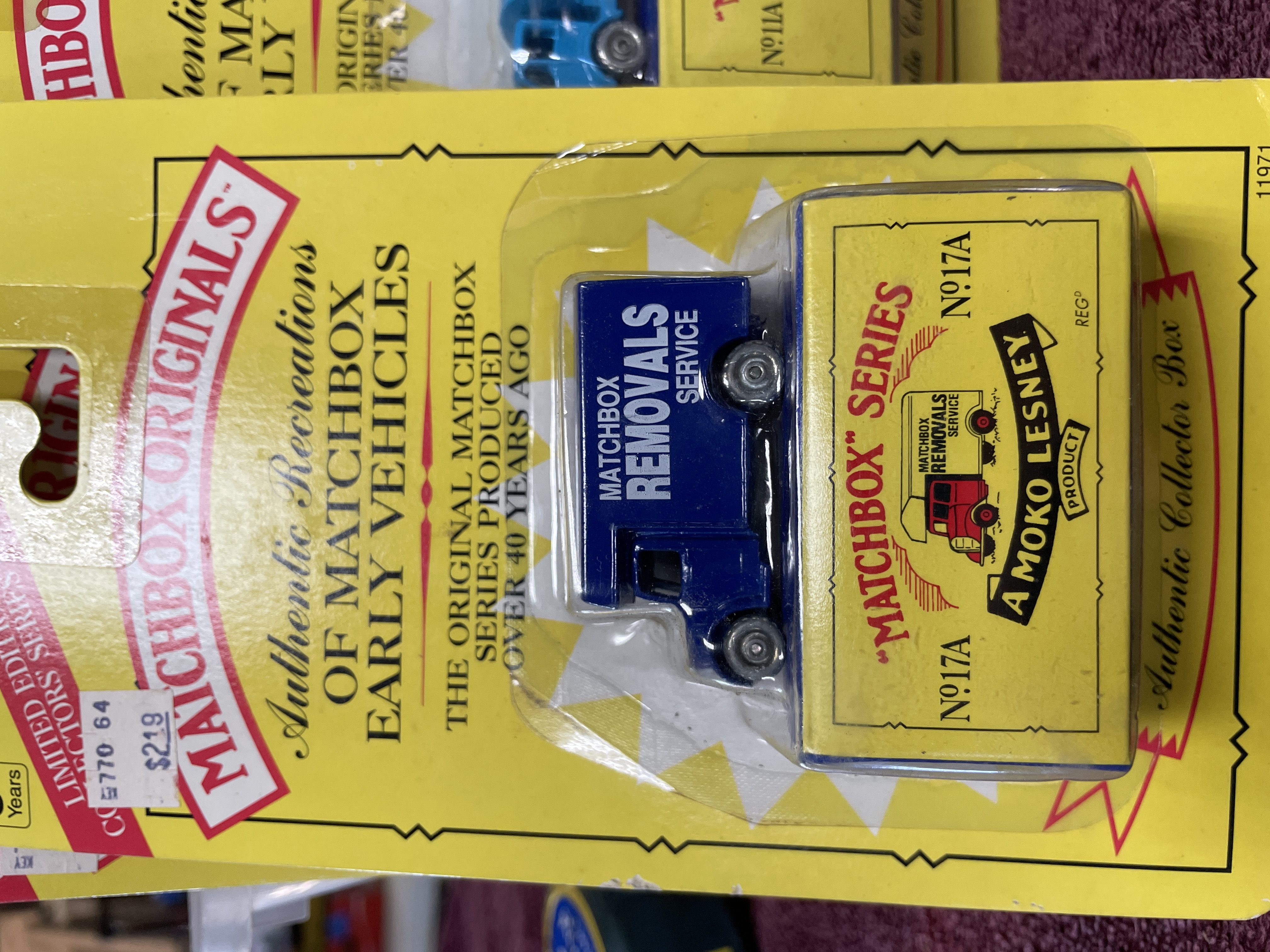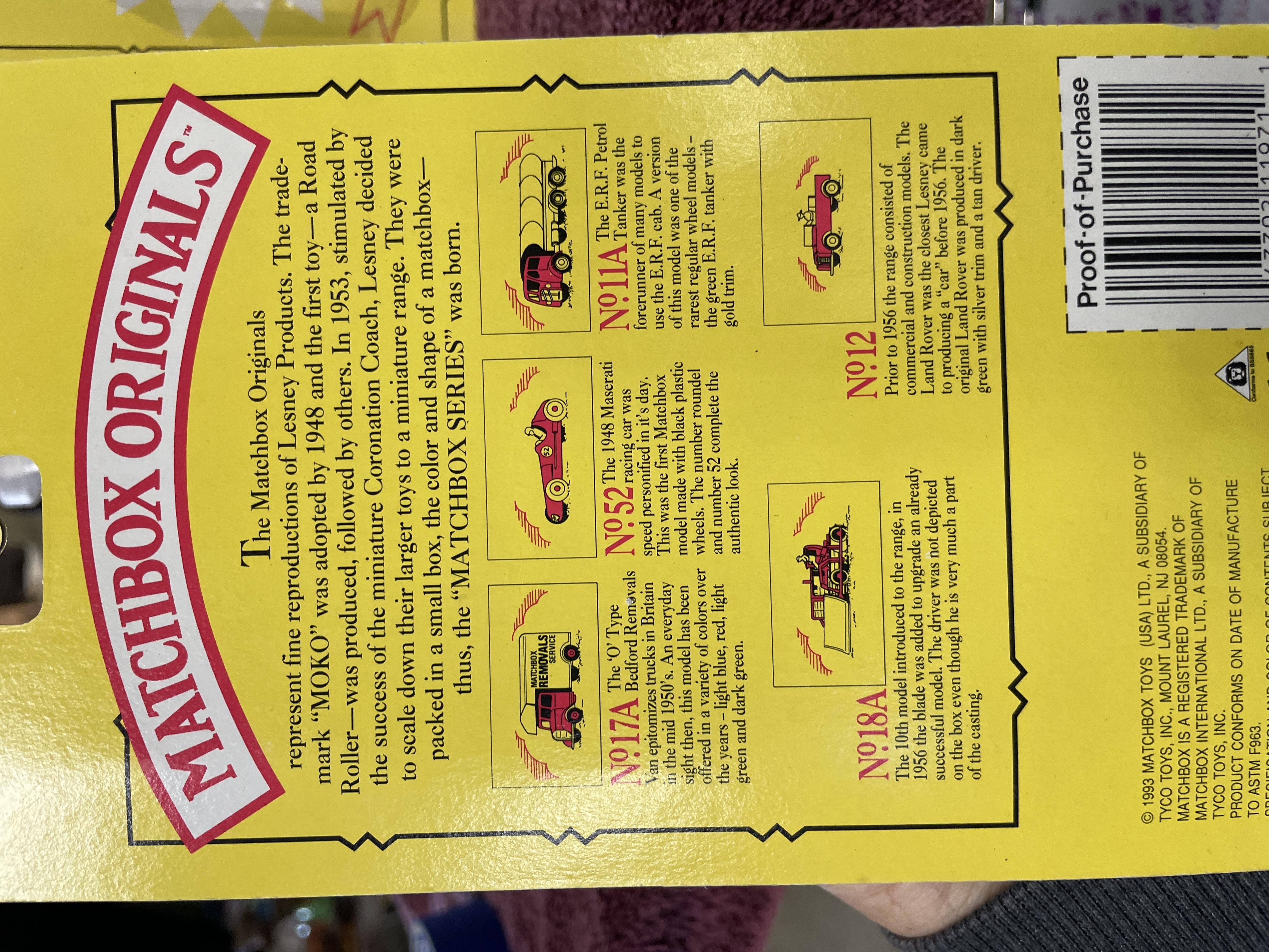 A collection of five sealed die-cast toy vehicles from the Matchbox Originals Limited Edition Collectors’ Series III, copyrighted 1993. These items are marketed as Authentic Recreations of Matchbox Early Vehicles, referencing the original Moko Lesney products. Each vehicle is secured in a plastic blister pack over a replicated Matchbox Series box, mounted on a yellow card backing. The card backs provide biographical text regarding the history of Lesney Products and the original Matchbox line. The five models included are: No. 17A (Blue Bedford Van, “Matchbox Removals Service”), No. 52 (Red Maserati Race Car), No. 11A (Blue E.R.F. Petrol Tanker), No. 18A (Yellow Dozer/Tractor), and No. 12 (Dark Green Land Rover). Construction is primarily die-cast metal.